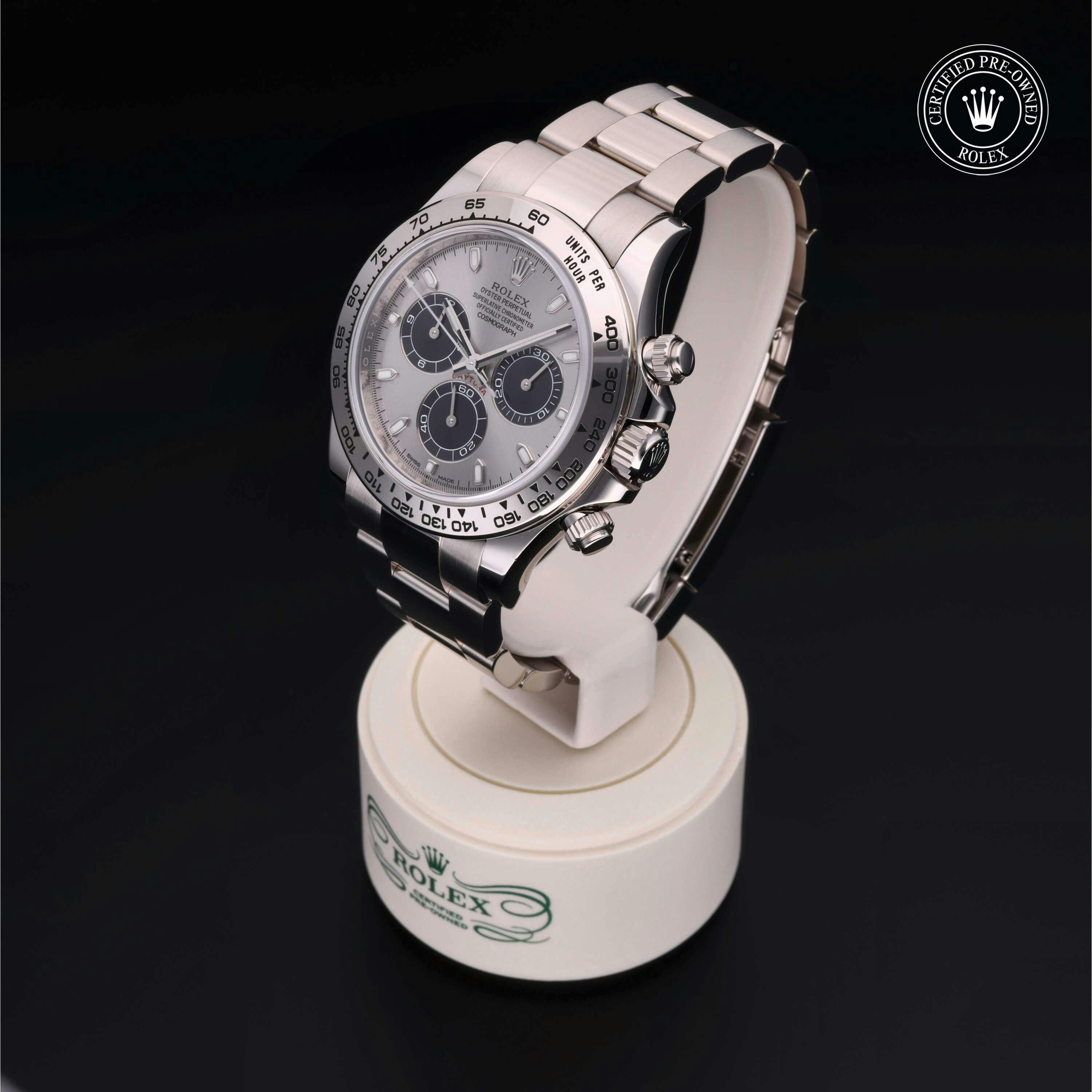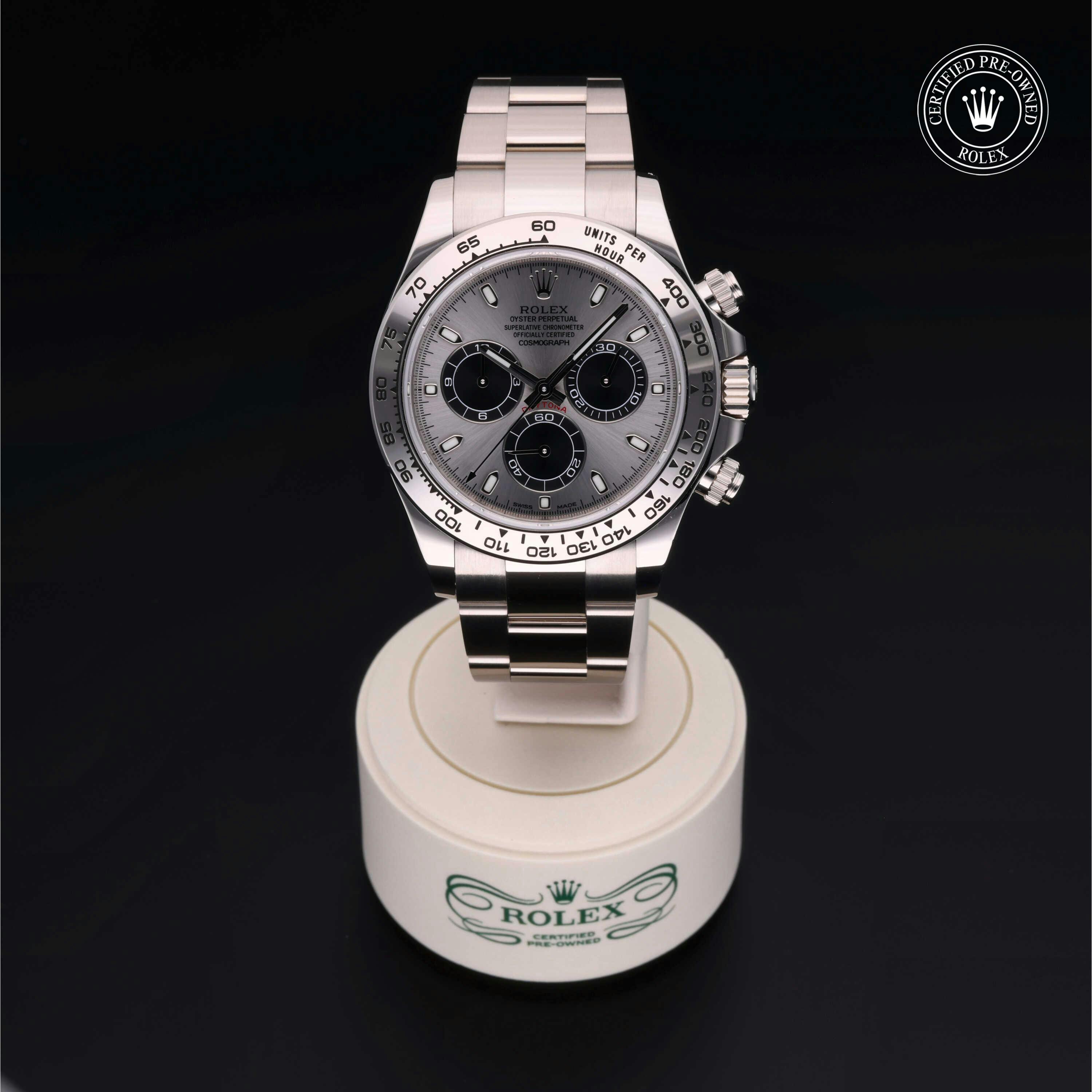 Rolex Certified Pre-Owned Cosmograph Daytona (116509) self - winding automatic watch, features a 40mm 18k white gold case and tachymetric scale bezel surrounding a steel dial on an 18k white gold oyster bracelet. Functions include hours, minutes, seconds and chronograph. This watch has received Rolex-authorized service and certification. It does not come with the original box or papers, but includes a custom Rolex Certified Pre-Owned hang tag, travel pouch and RCPO international warranty card.