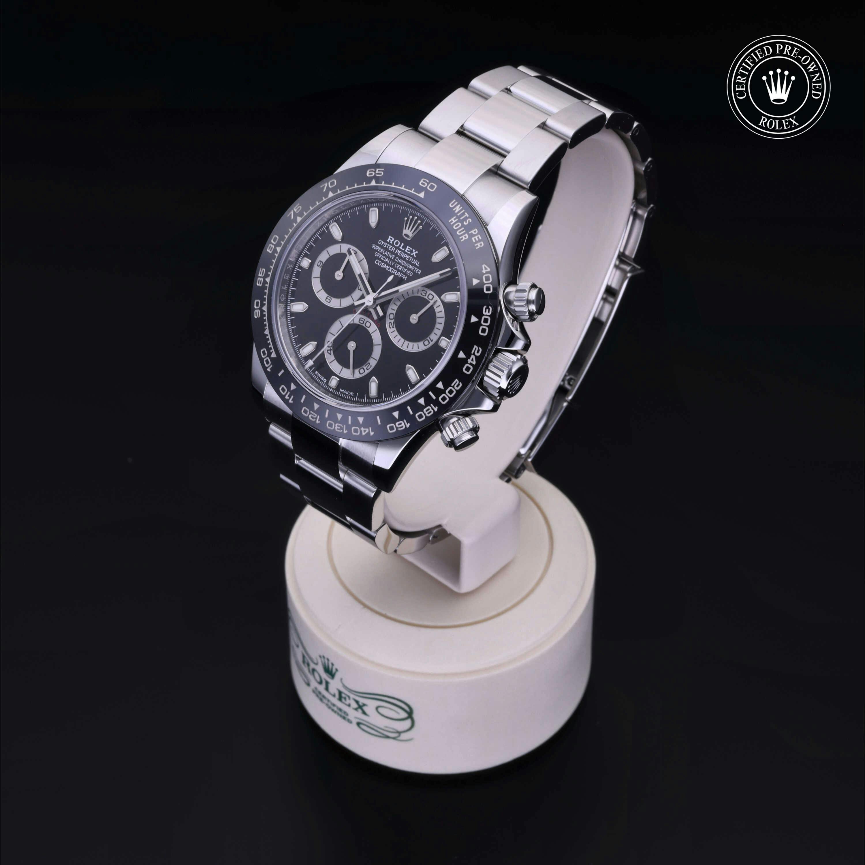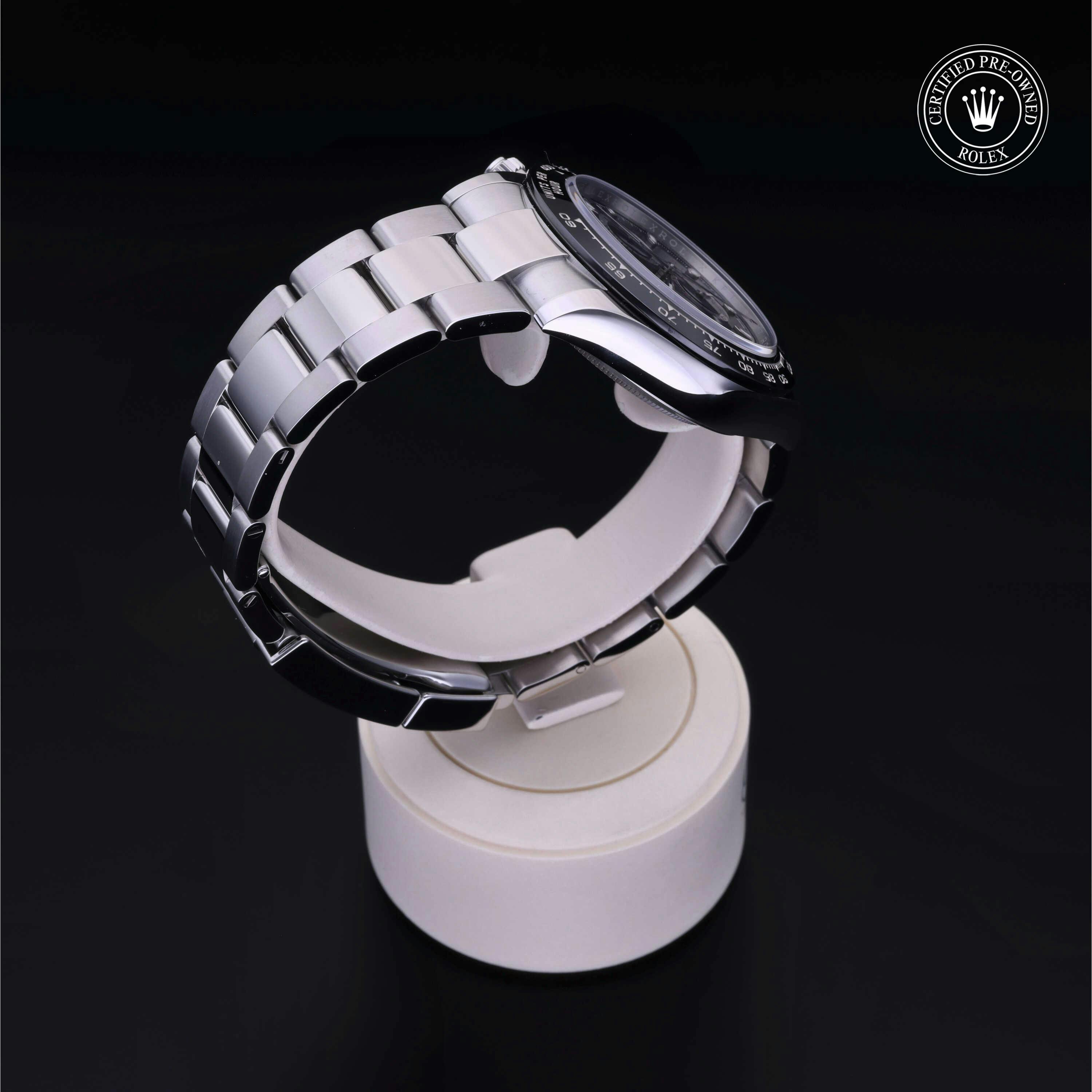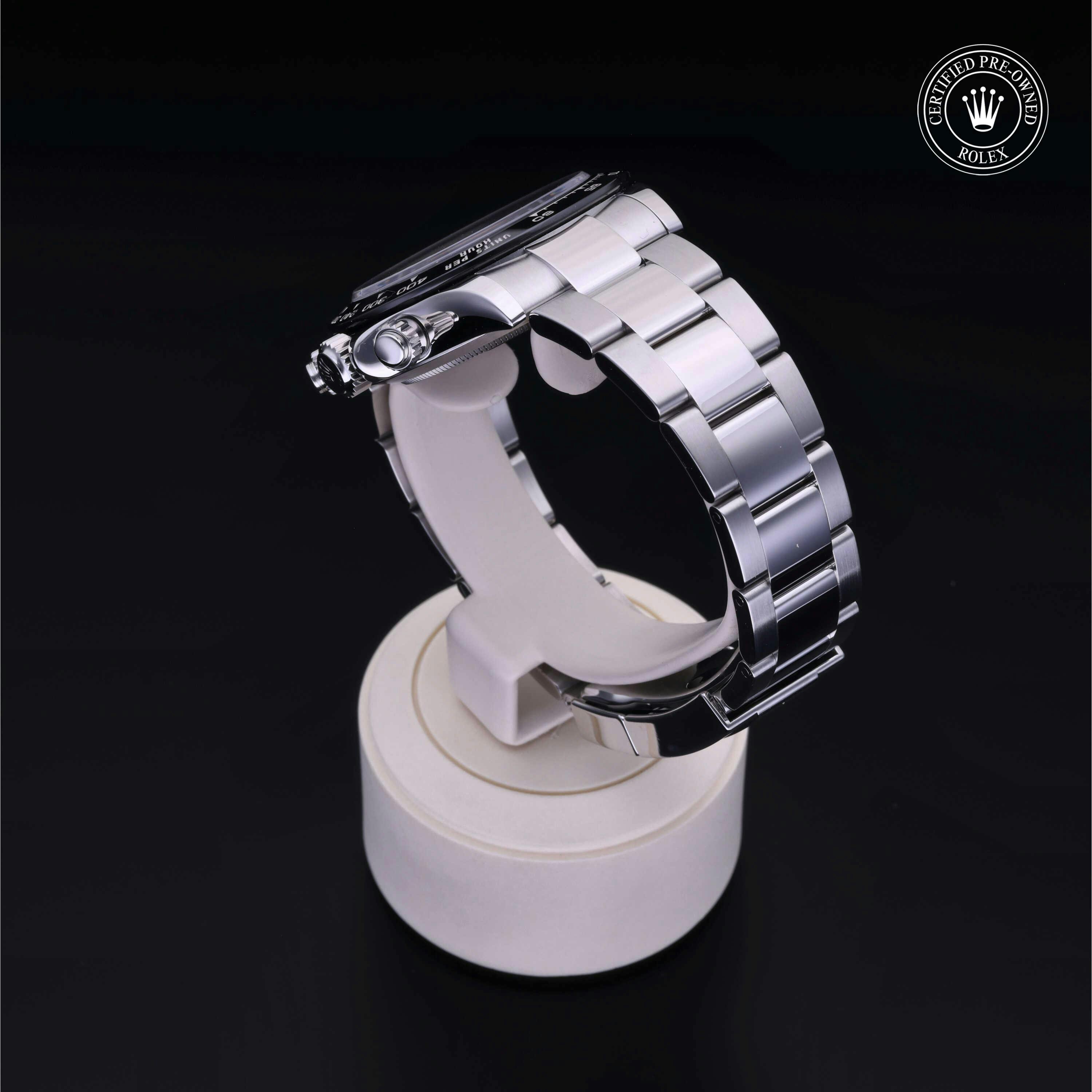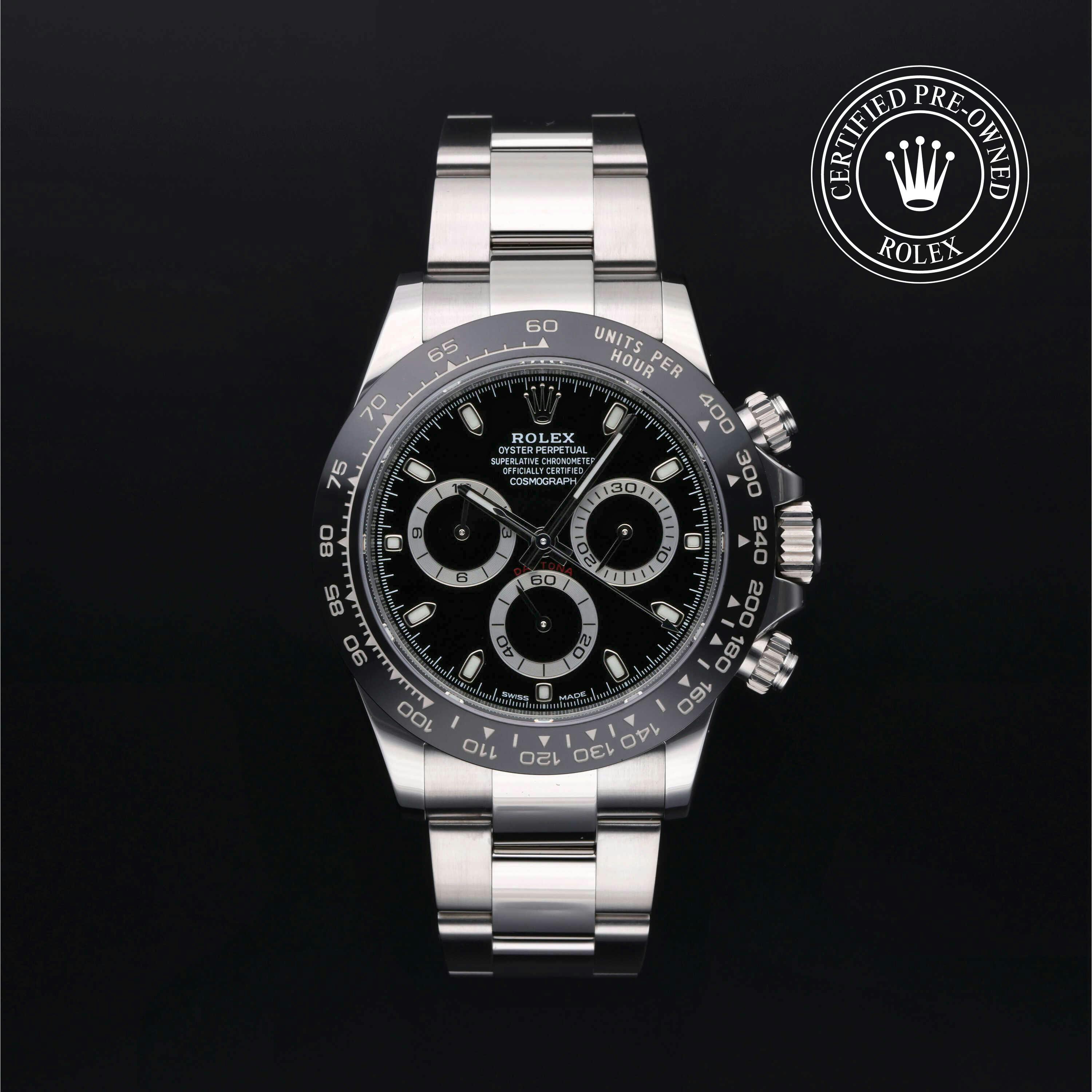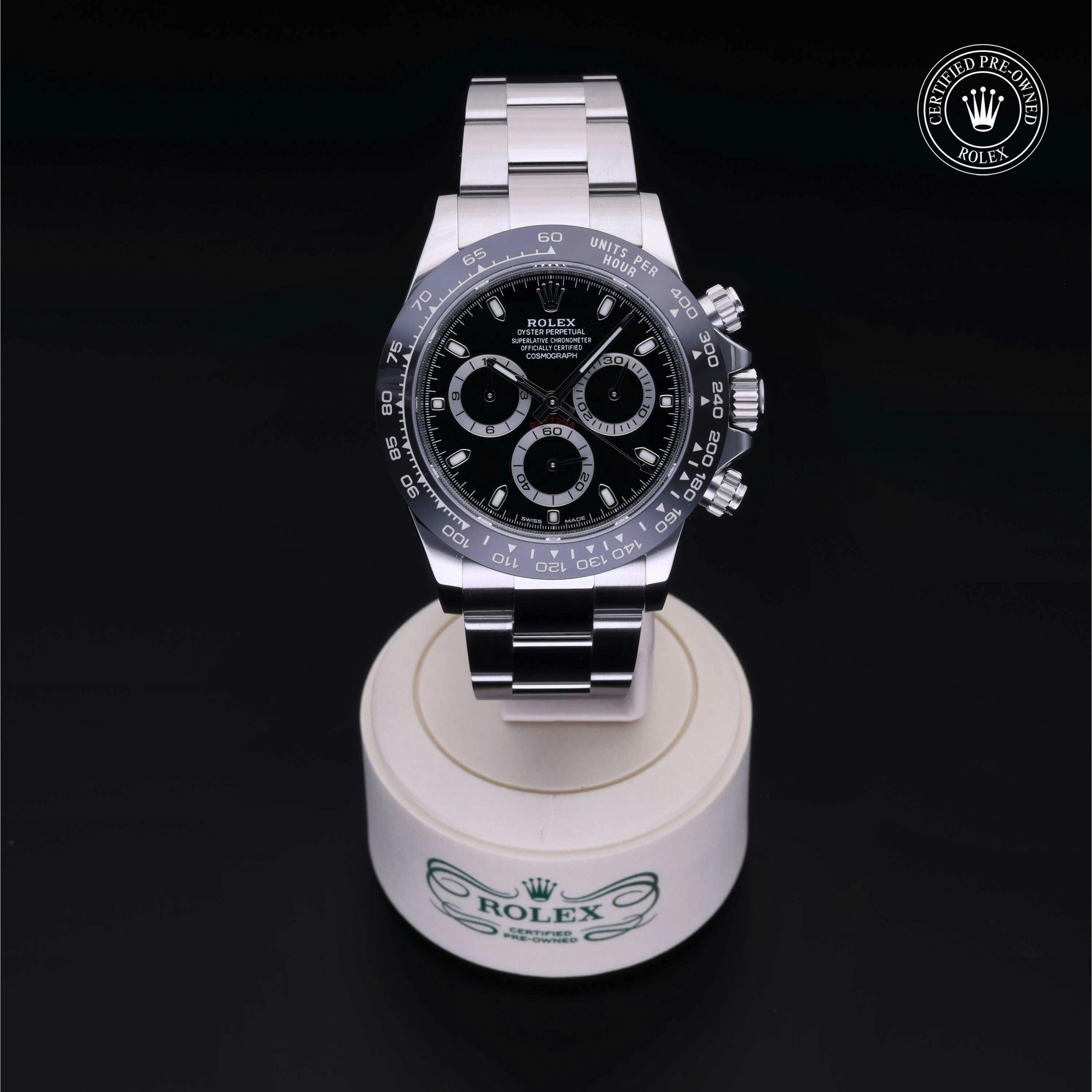Rolex Certified Pre-Owned Cosmograph Daytona (116500LN) self - winding automatic watch, features a 40mm stainless steel case with a black cerachrom tachymetric scale bezel surrounding a black dial on a stainless steel oyster bracelet. Functions include hours, minutes, seconds, chronograph tachymeter. This watch has received Rolex-authorized service and certification. It comes with the original box and papers, and includes a custom Rolex Certified Pre-Owned hang tag, travel pouch and RCPO international warranty card.