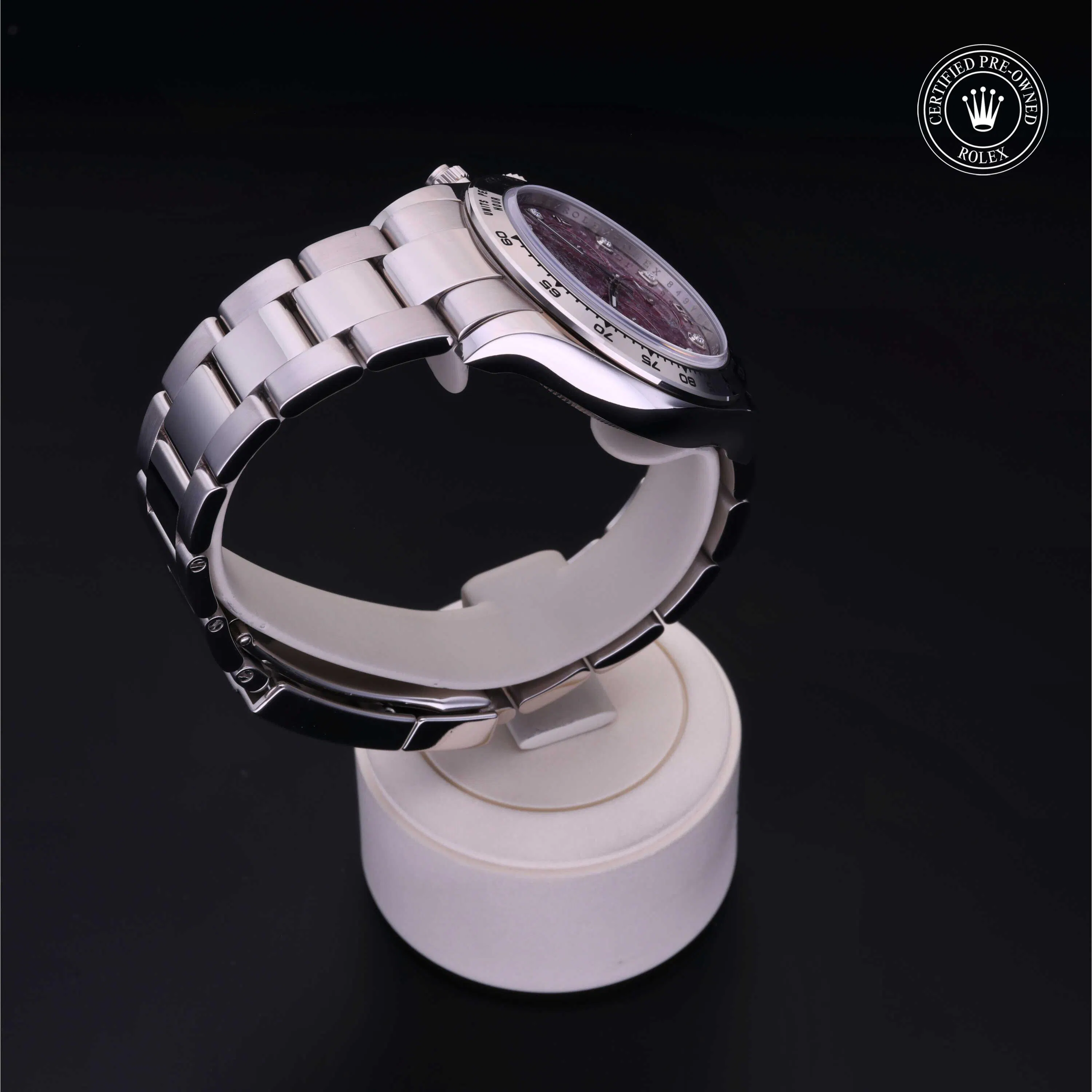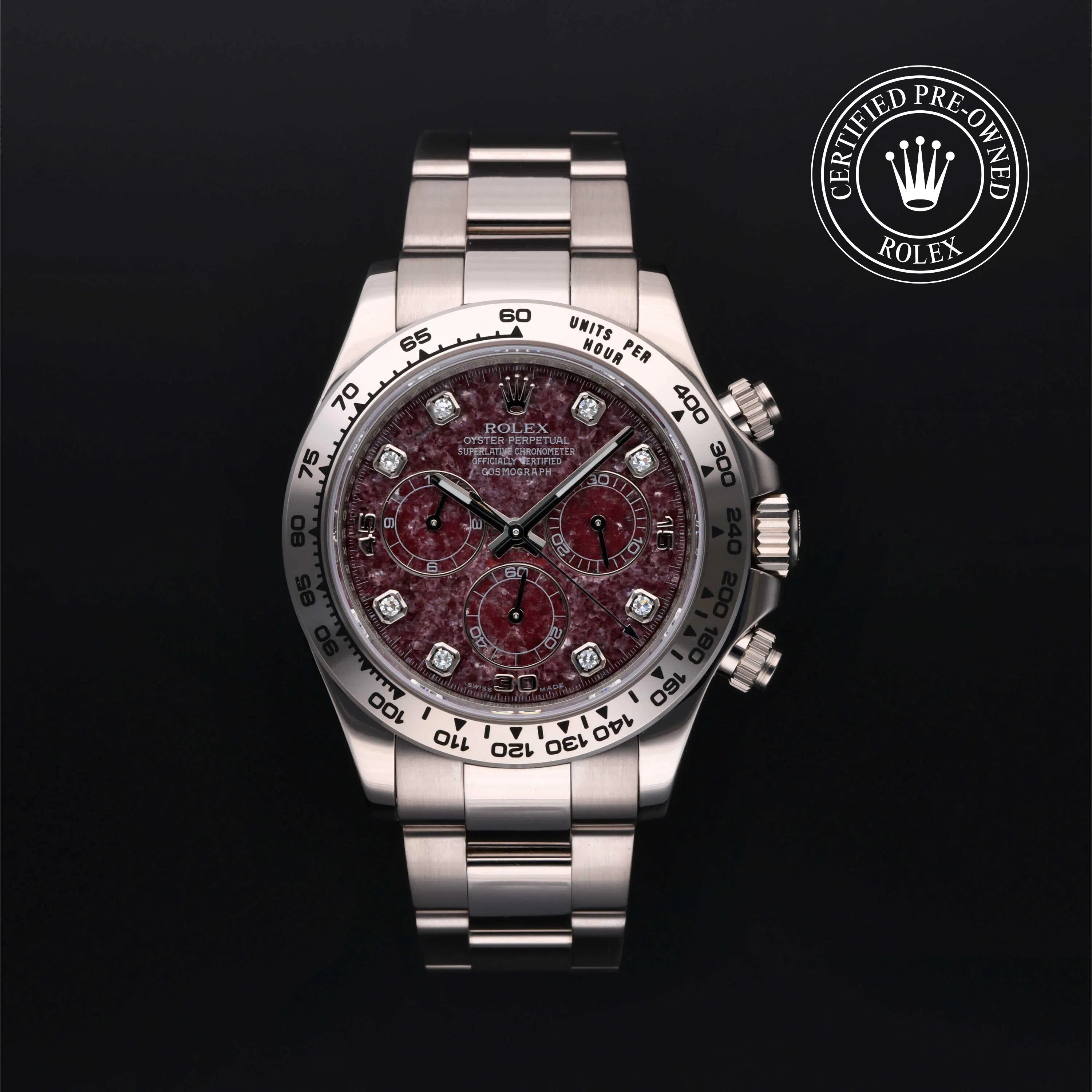 Rolex Certified Pre-Owned Cosmograph Daytona (116509) self - winding automatic watch, features a 40mm 18k white gold case and tachymetric scale bezel surrounding a red grossular diamond set dial on an 18k white gold Oyster bracelet. Functions include hours, minutes, seconds and chronograph. This watch has received Rolex-authorized service and certification. It does not come with the original box or papers, but includes a custom Rolex Certified Pre-Owned hang tag, travel pouch and RCPO international warranty card.