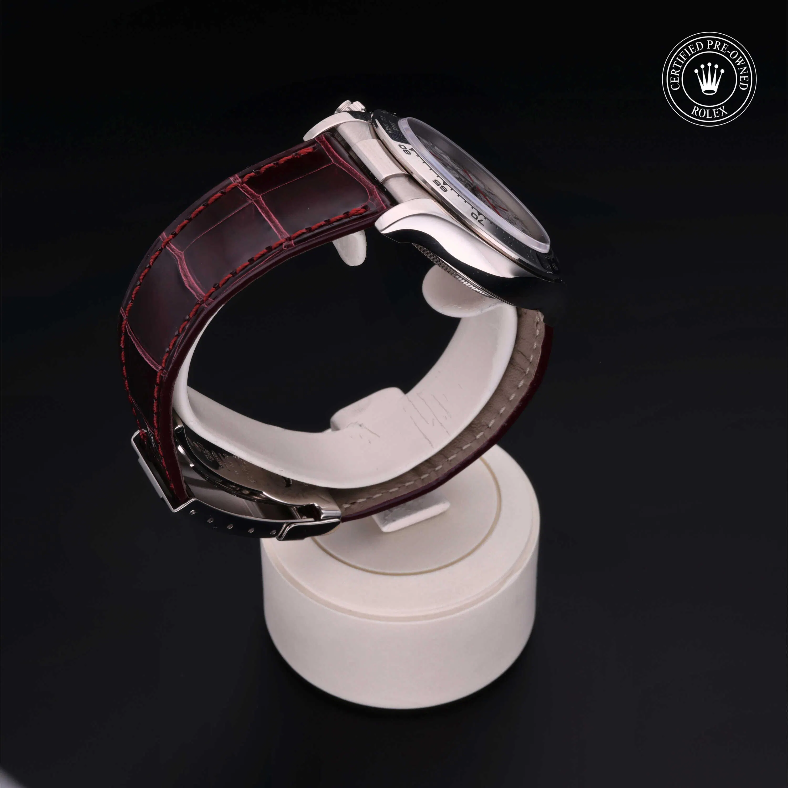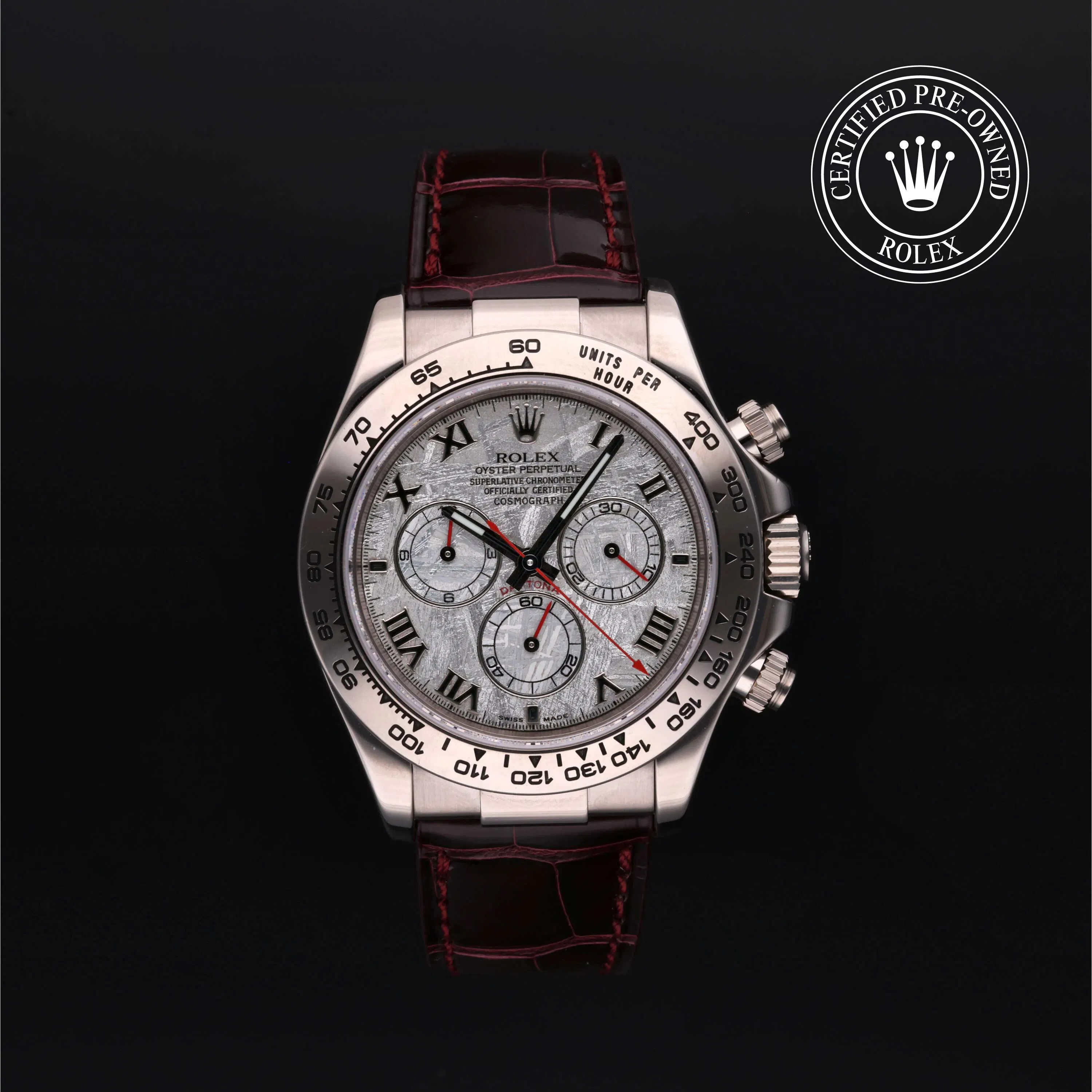 Rolex Certified Pre-Owned Cosmograph Daytona (116519) self - winding automatic watch, features a 40mm 18k white gold case and tachymetric scale bezel surrounding a meteorite dial on a burgundy alligator strap with an 18k white gold deployant buckle. Functions include hours, minutes, seconds and chronograph. This watch has received Rolex-authorized service and certification. It comes with the original box, and includes a custom Rolex Certified Pre-Owned hang tag, travel pouch and RCPO international warranty card.