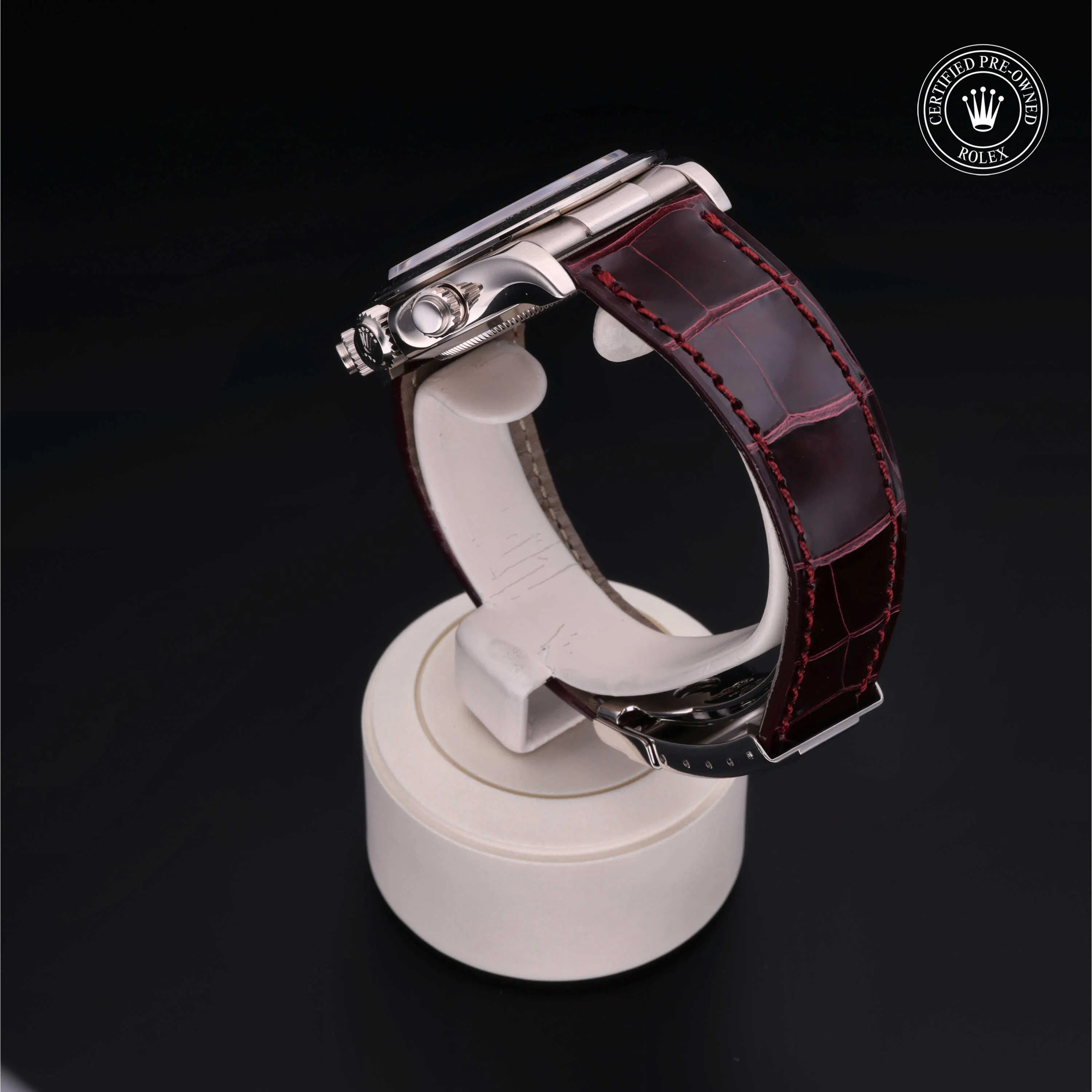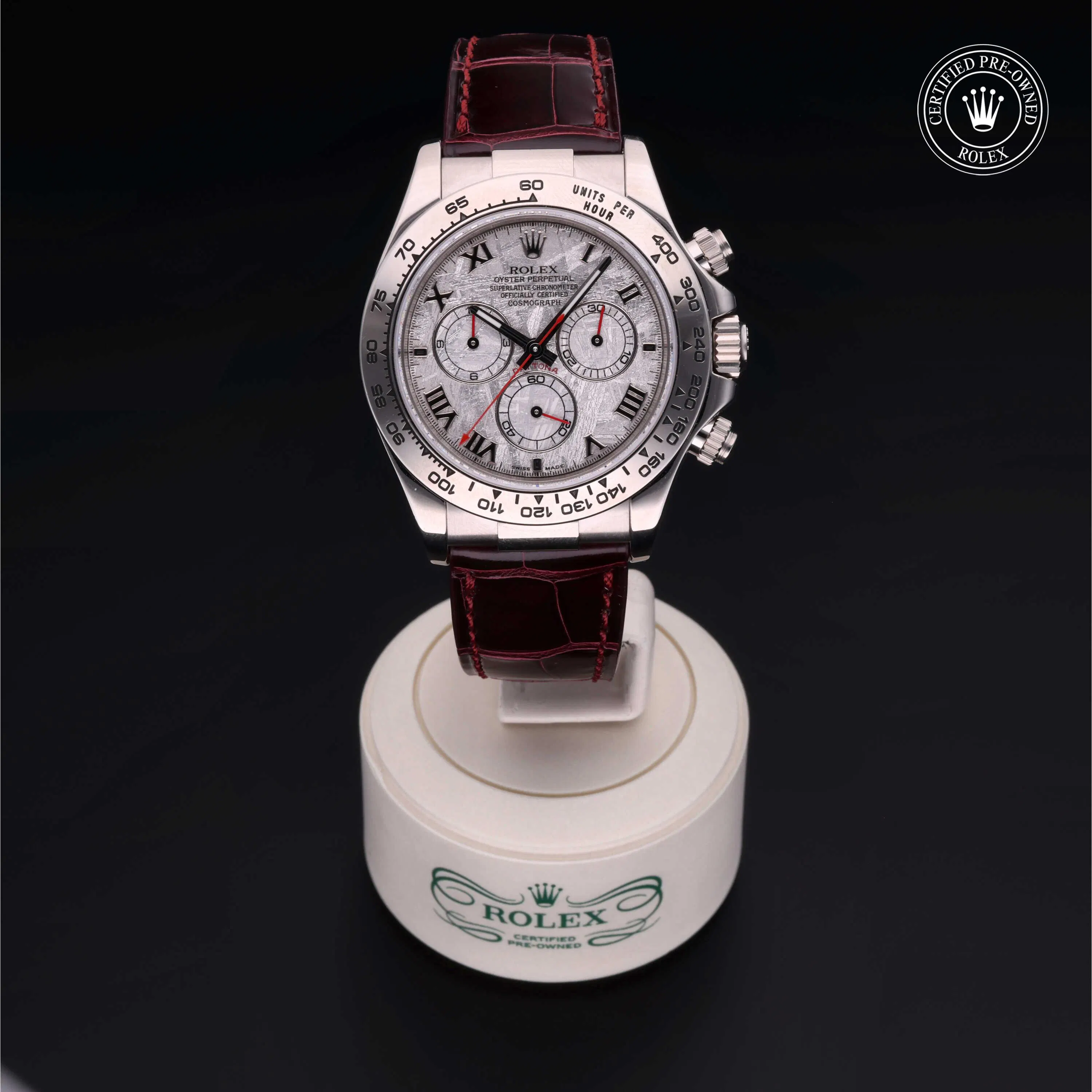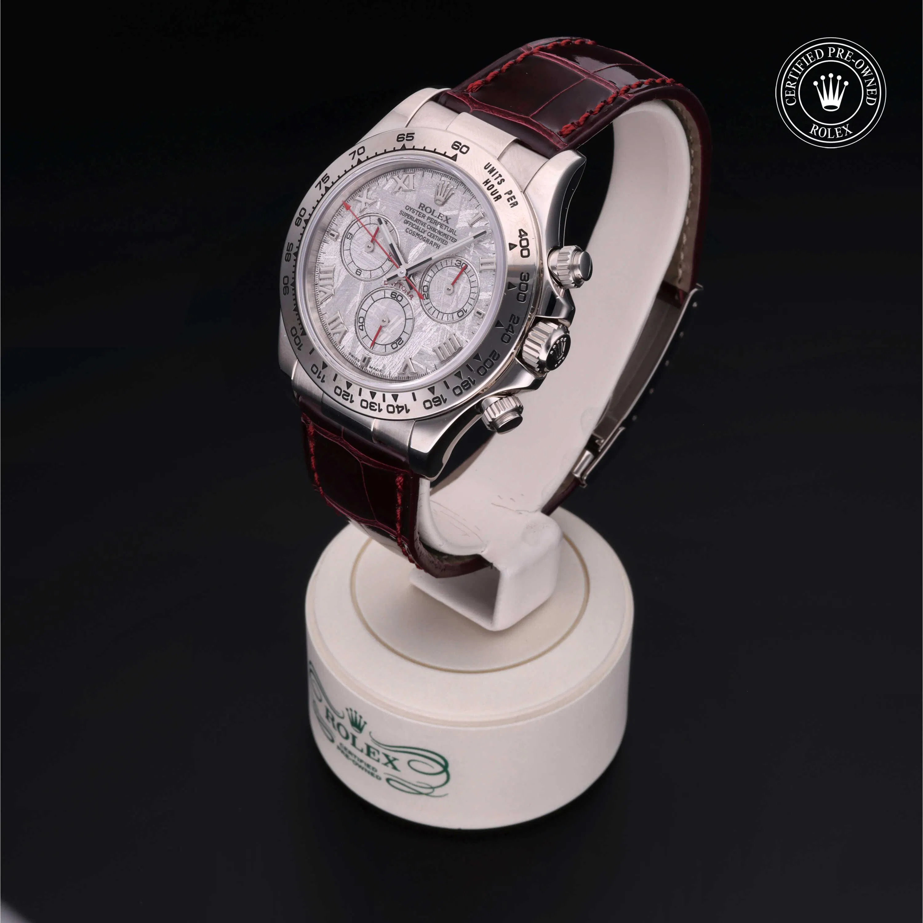 Rolex Certified Pre-Owned Cosmograph Daytona (116519) self - winding automatic watch, features a 40mm 18k white gold case and tachymetric scale bezel surrounding a meteorite dial on a burgundy alligator strap with an 18k white gold deployant buckle. Functions include hours, minutes, seconds and chronograph. This watch has received Rolex-authorized service and certification. It comes with the original box, and includes a custom Rolex Certified Pre-Owned hang tag, travel pouch and RCPO international warranty card.