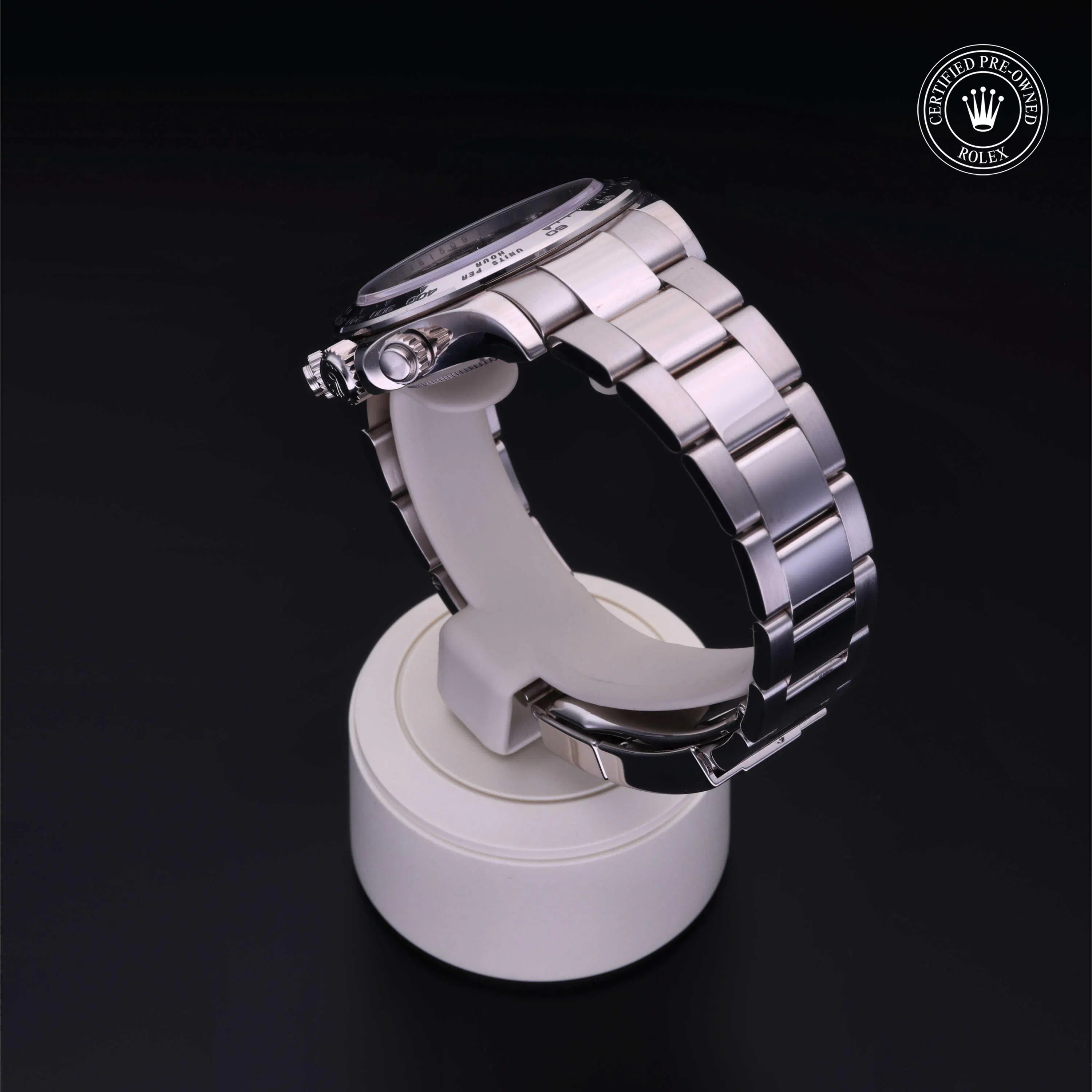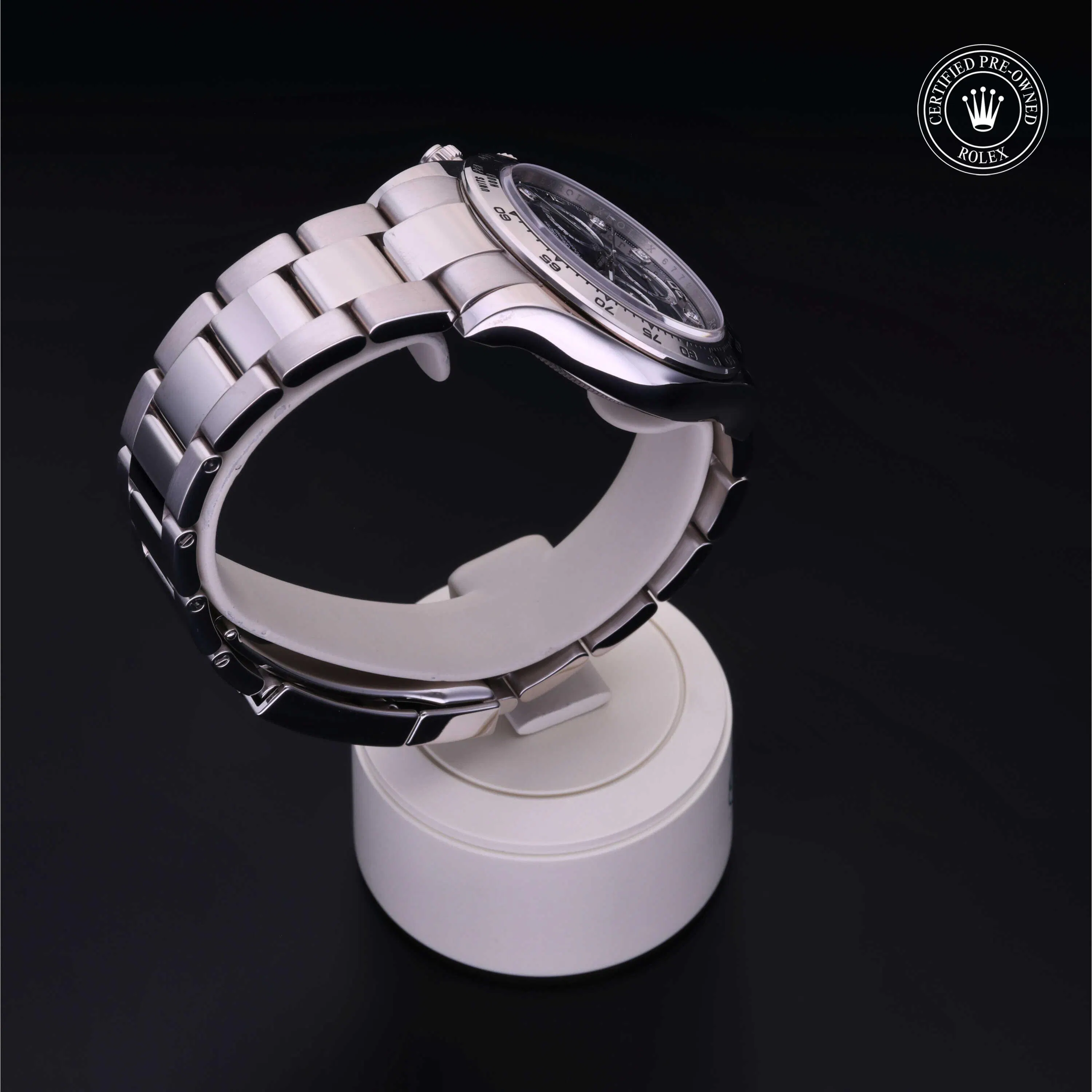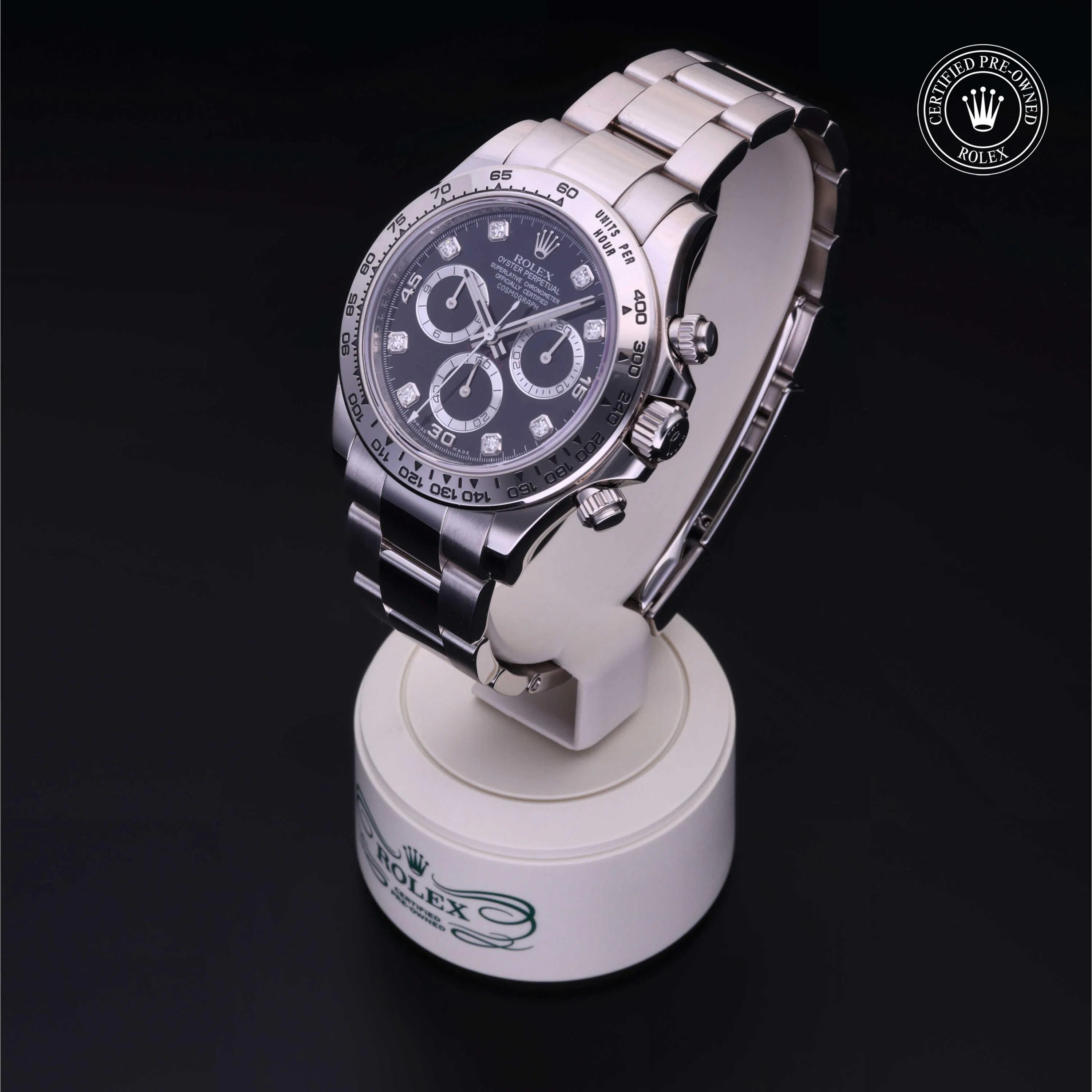 Rolex Certified Pre-Owned Cosmograph Daytona (116509) self - winding automatic watch, features a 40mm 18k white gold case and tachymetric scale bezel surrounding a black diamond set dial on an 18k white gold oyster bracelet. Functions include hours, minutes, seconds, chronograph and tachymeter. This watch has received Rolex-authorized service and certification. It comes with the original box and papers, and includes a custom Rolex Certified Pre-Owned hang tag, travel pouch and RCPO international warranty card.