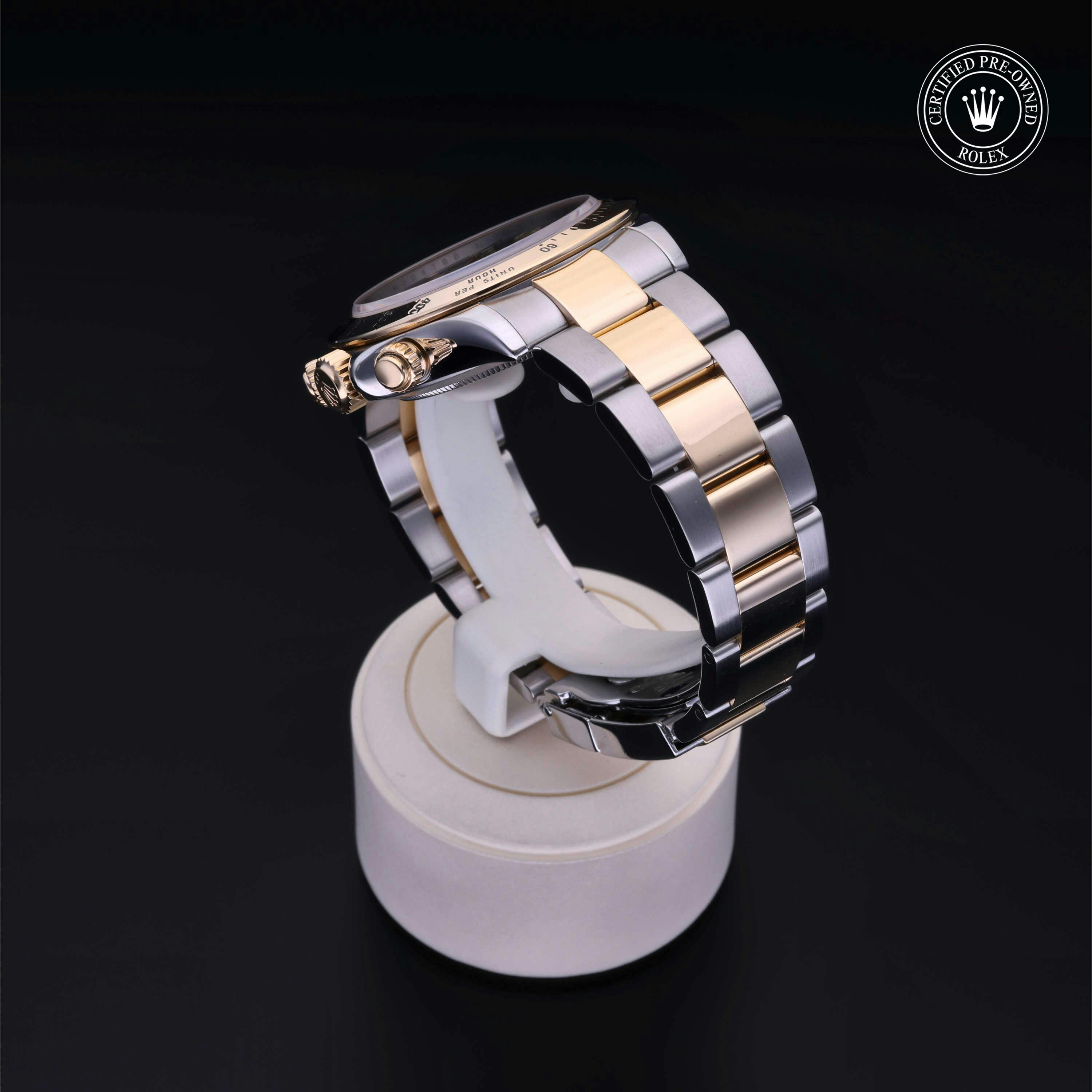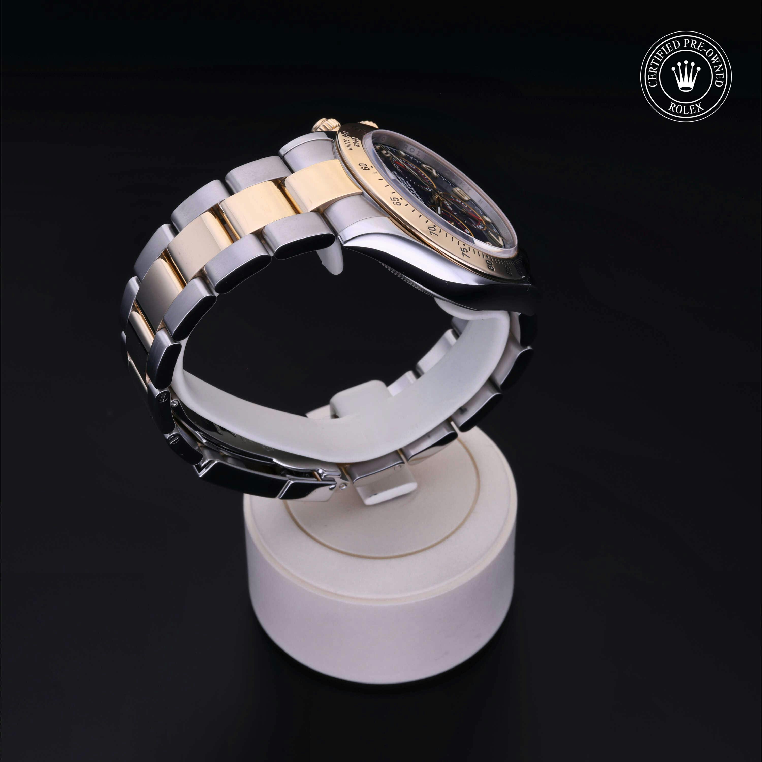 Rolex Certified Pre-Owned Cosmograph Daytona (116523) self - winding automatic watch, features a 40mm stainless steel case with an 18k yellow gold tachymetric scale bezel surrounding a blue dial on a stainless steel and 18k yellow gold oyster bracelet. Functions include hours, minutes, seconds and chronograph. This watch has received Rolex-authorized service and certification. It comes with the original box and papers, and includes a custom Rolex Certified Pre-Owned hang tag, travel pouch and RCPO international warranty card.