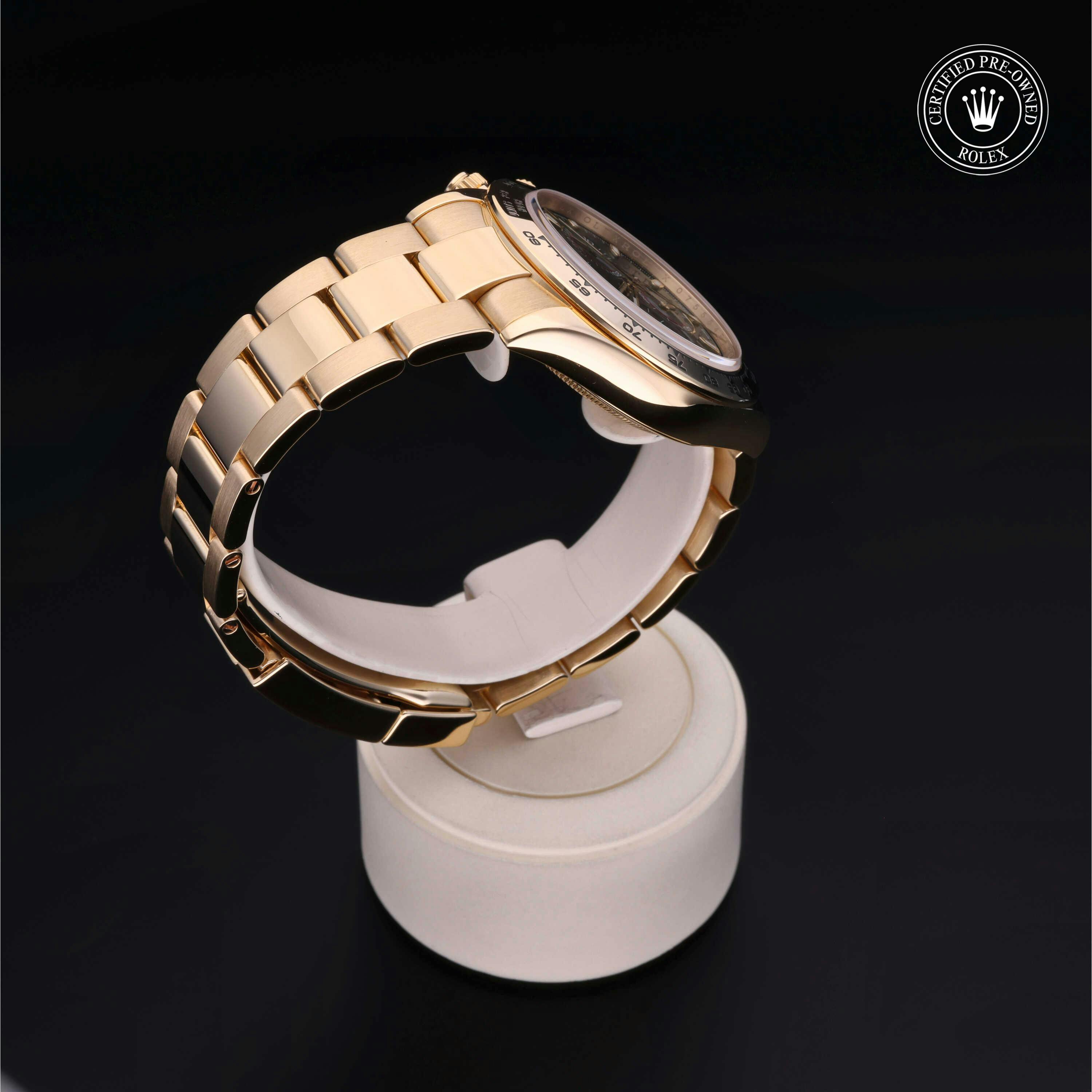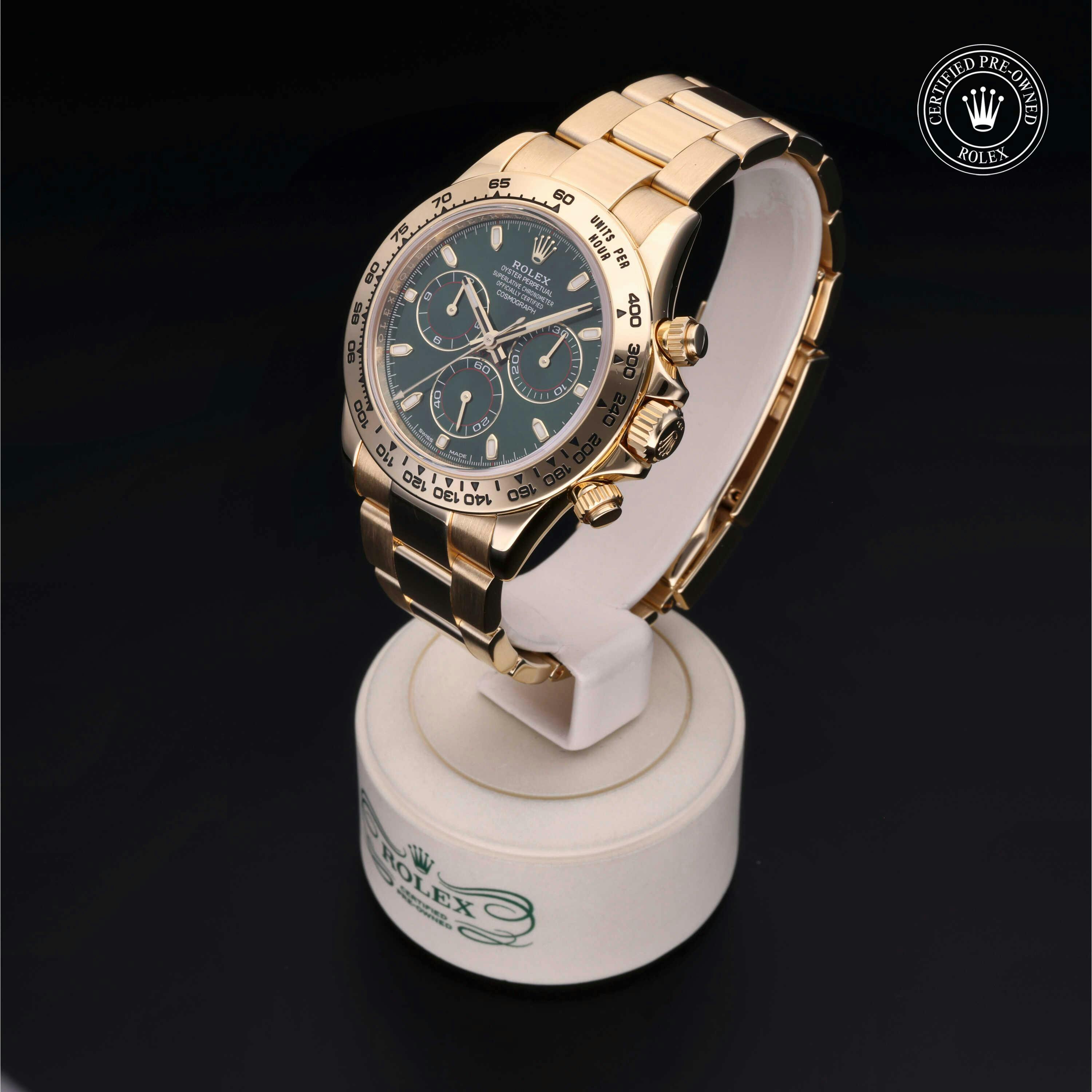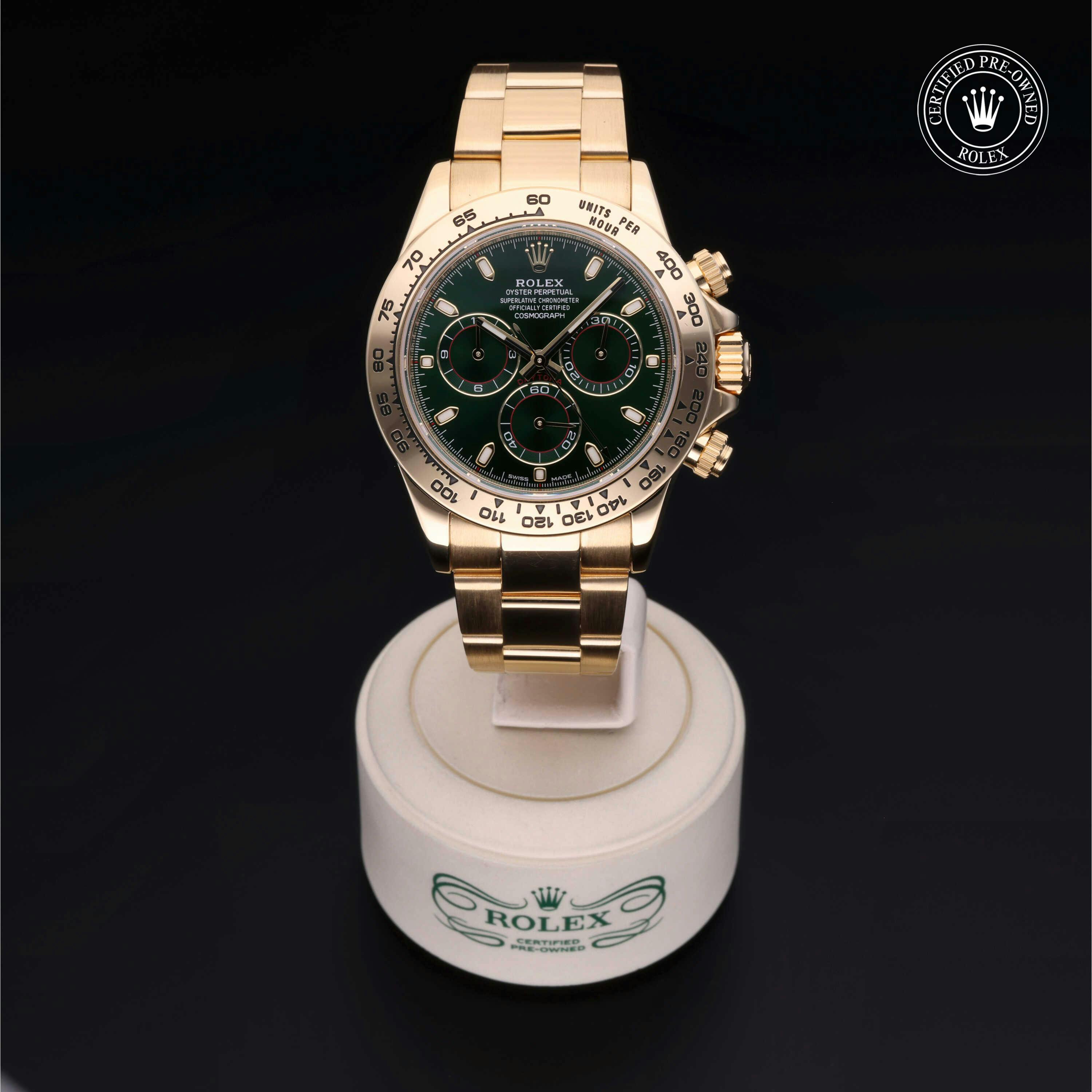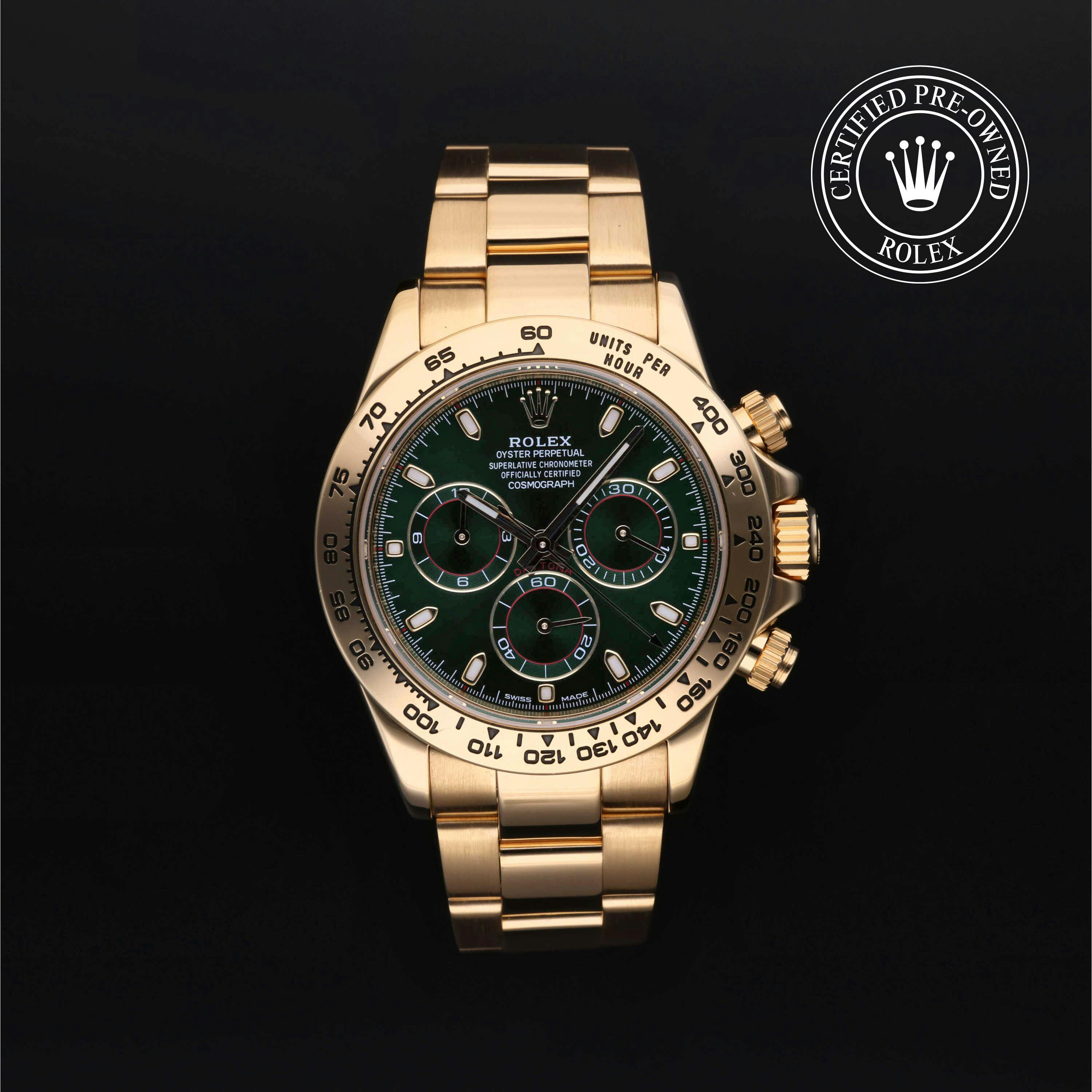 Rolex Certified Pre-Owned Cosmograph Daytona (116508) self - winding automatic watch, features a 40mm 18k yellow gold case and tachymetric scale bezel surrounding a green dial on an 18k yellow gold oyster bracelet. Functions include hours, minutes, seconds, chronograph and tachymeter. This watch has received Rolex-authorized service and certification. It comes with the original box and papers, and includes a custom Rolex Certified Pre-Owned hang tag, travel pouch and RCPO international warranty card.