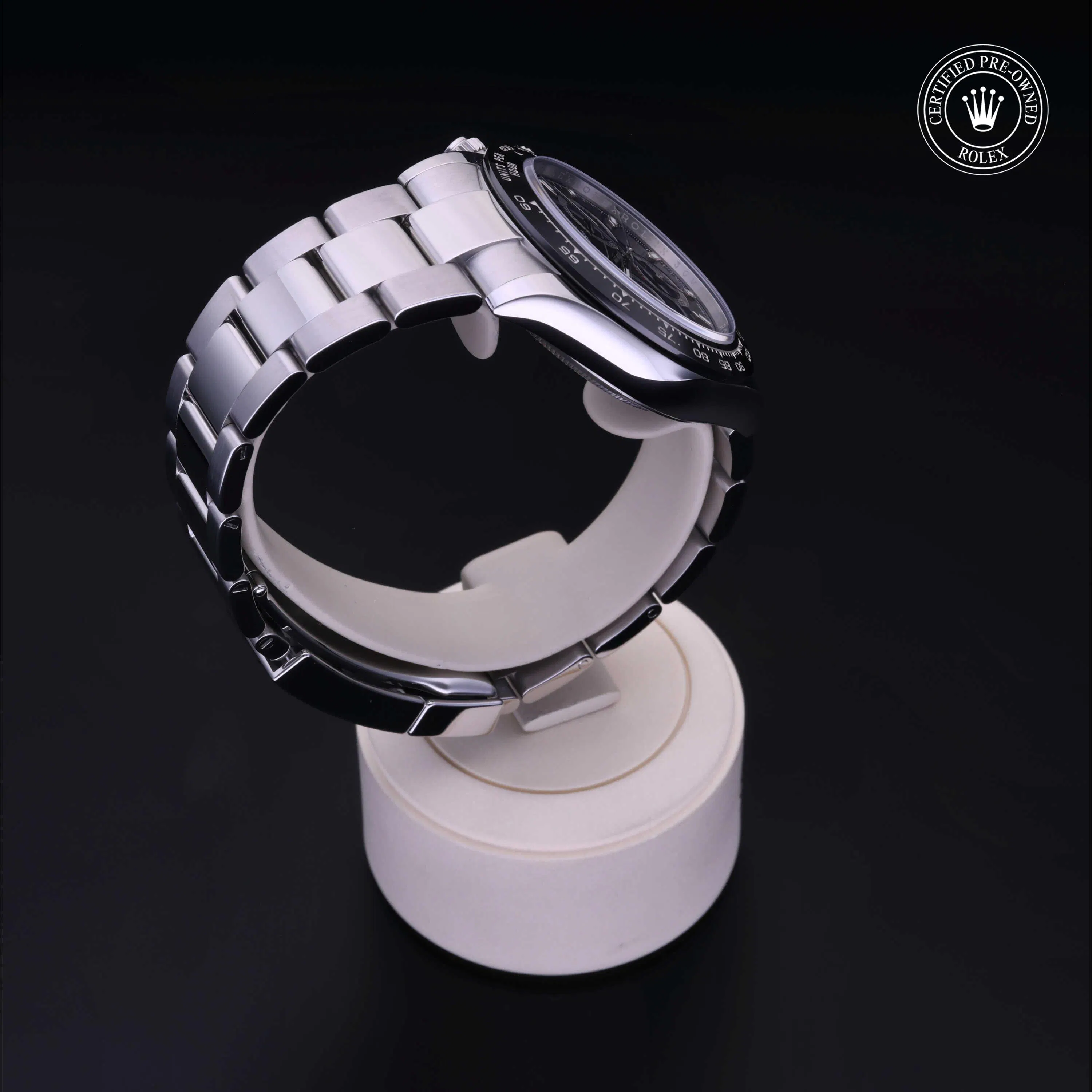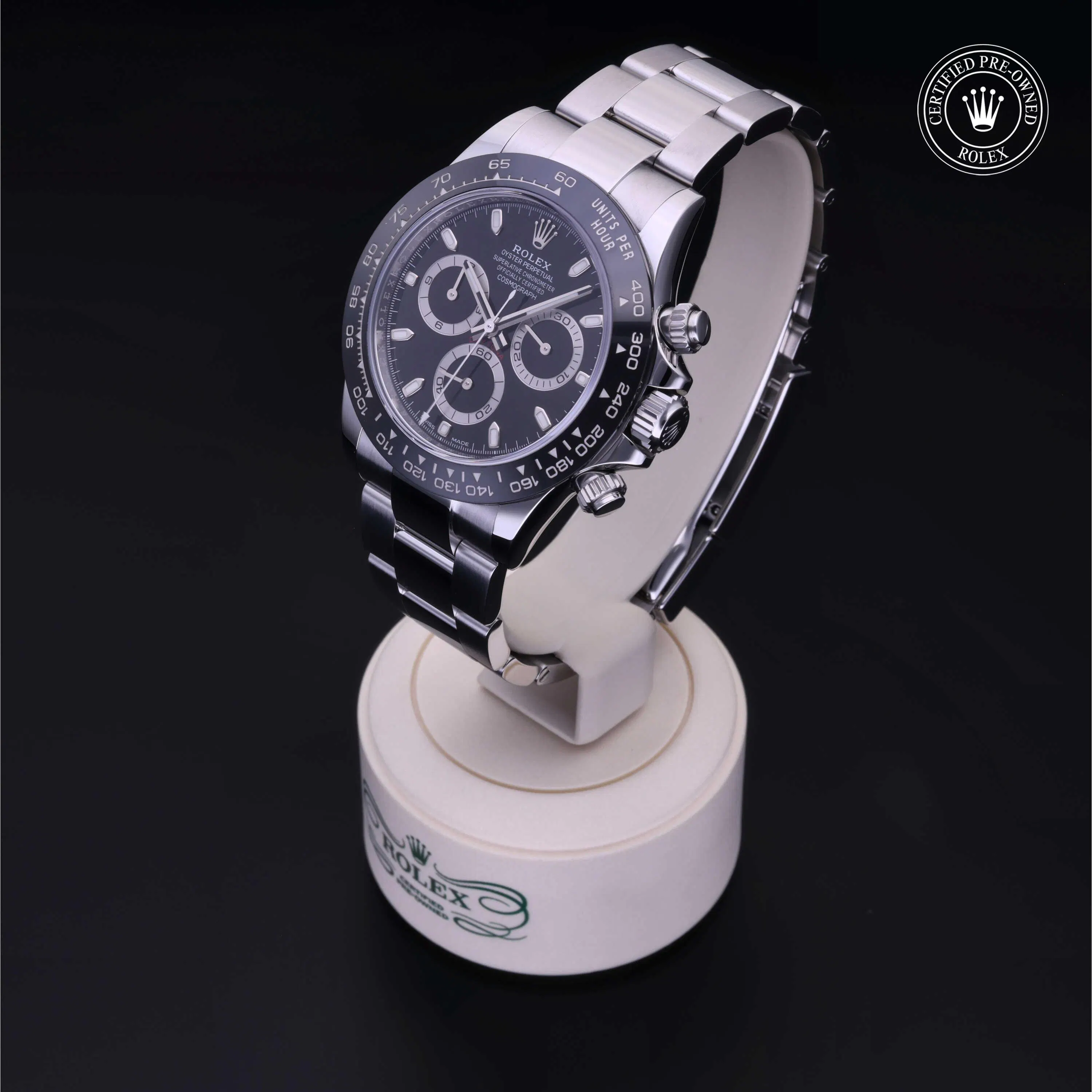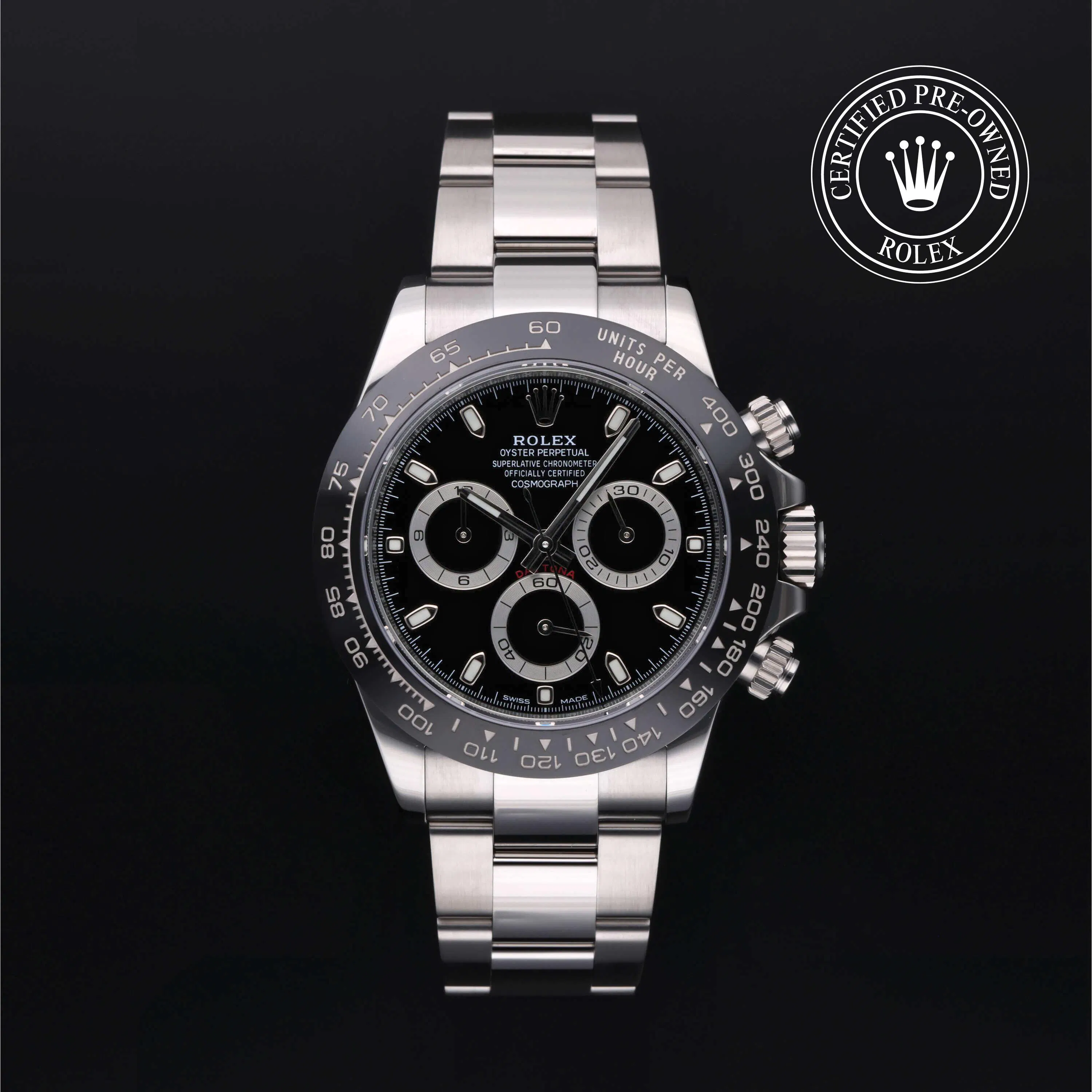 Rolex Certified Pre-Owned Cosmograph Daytona (116500LN) self - winding automatic watch, features a 40mm stainless steel case with a black cerachrom tachymetric scale bezel surrounding a black dial on a stainless steel Oyster bracelet. Functions include hours, minutes, seconds, chronograph and tachymeter. This watch has received Rolex-authorized service and certification. It comes with the original box and papers, and includes a custom Rolex Certified Pre-Owned hang tag, travel pouch and RCPO international warranty card.