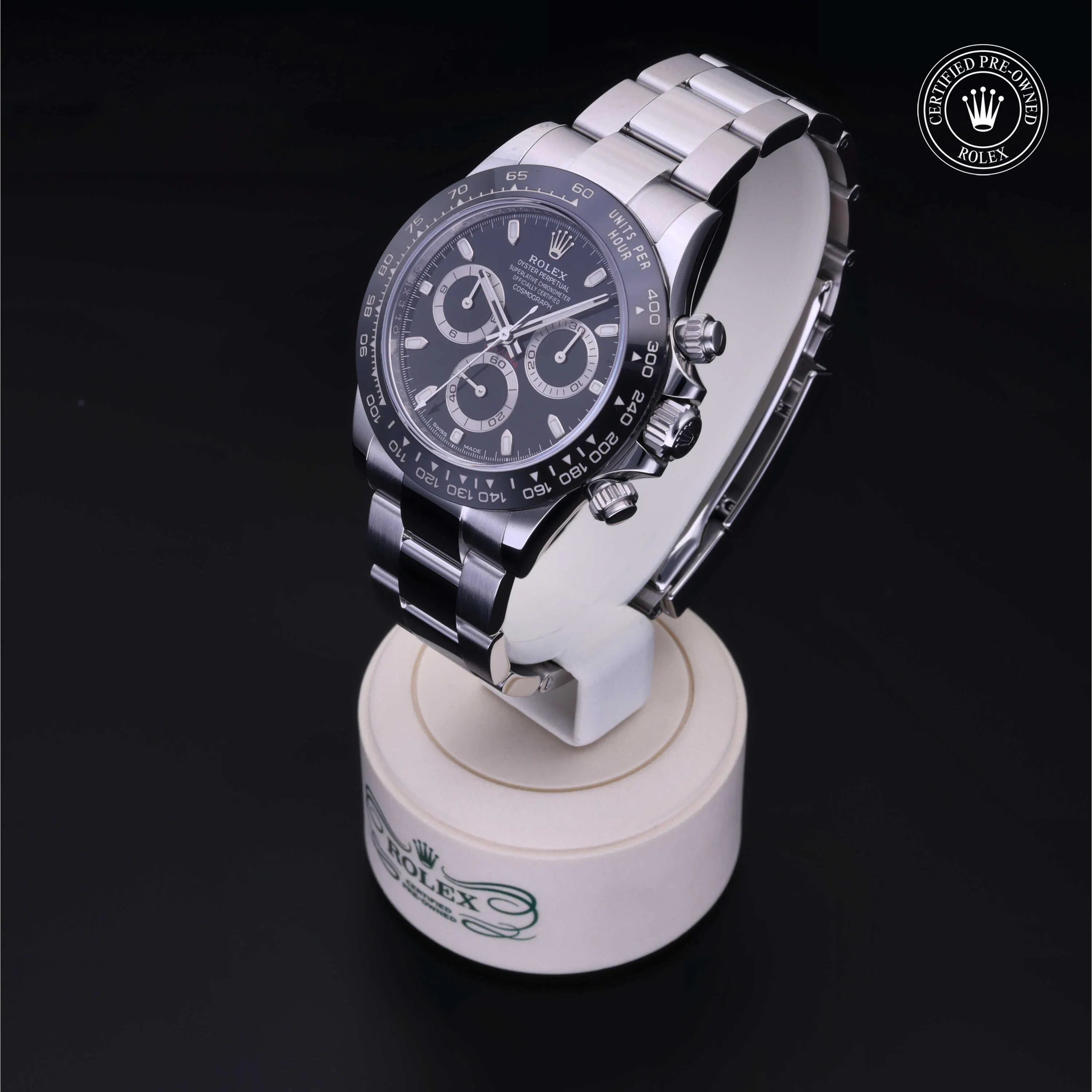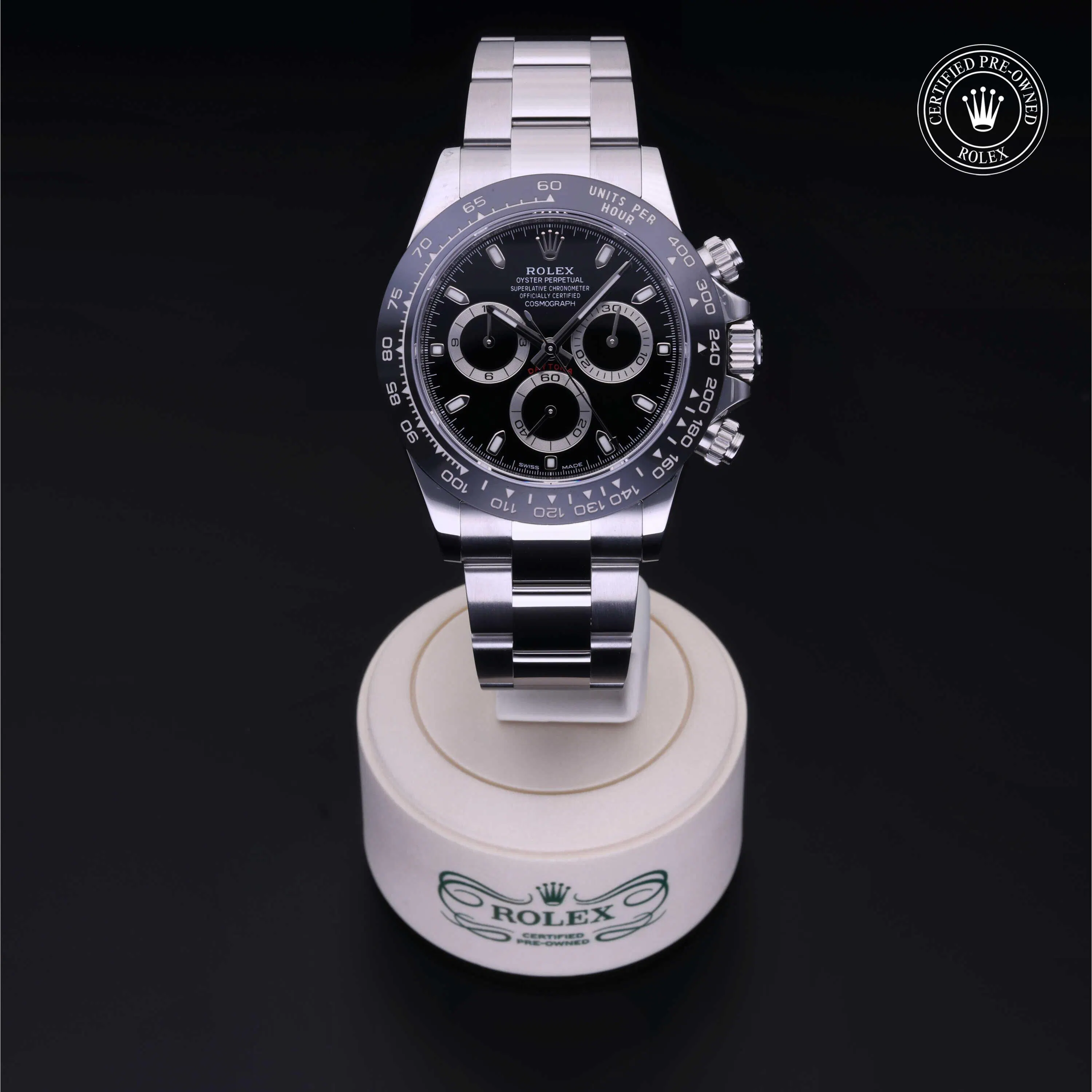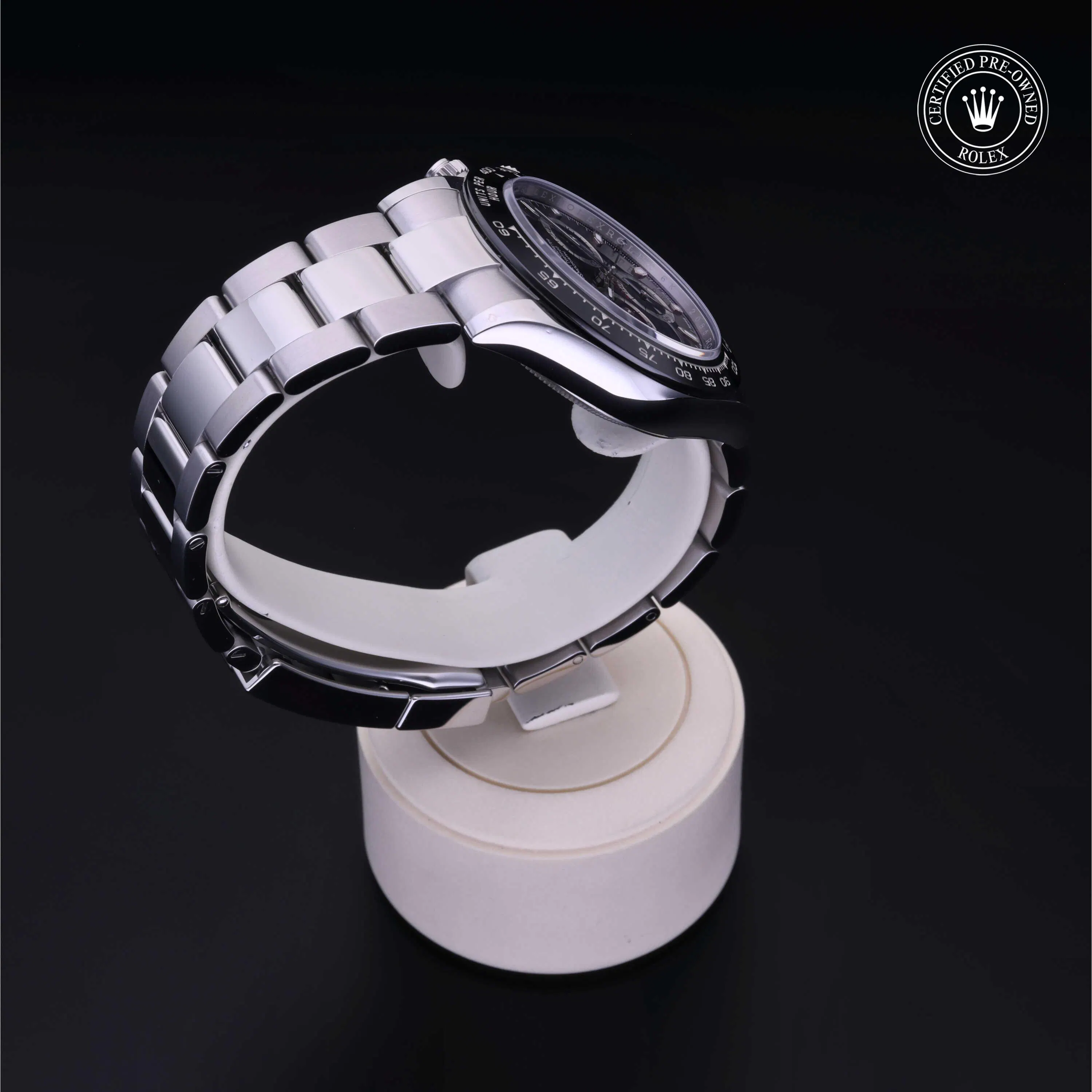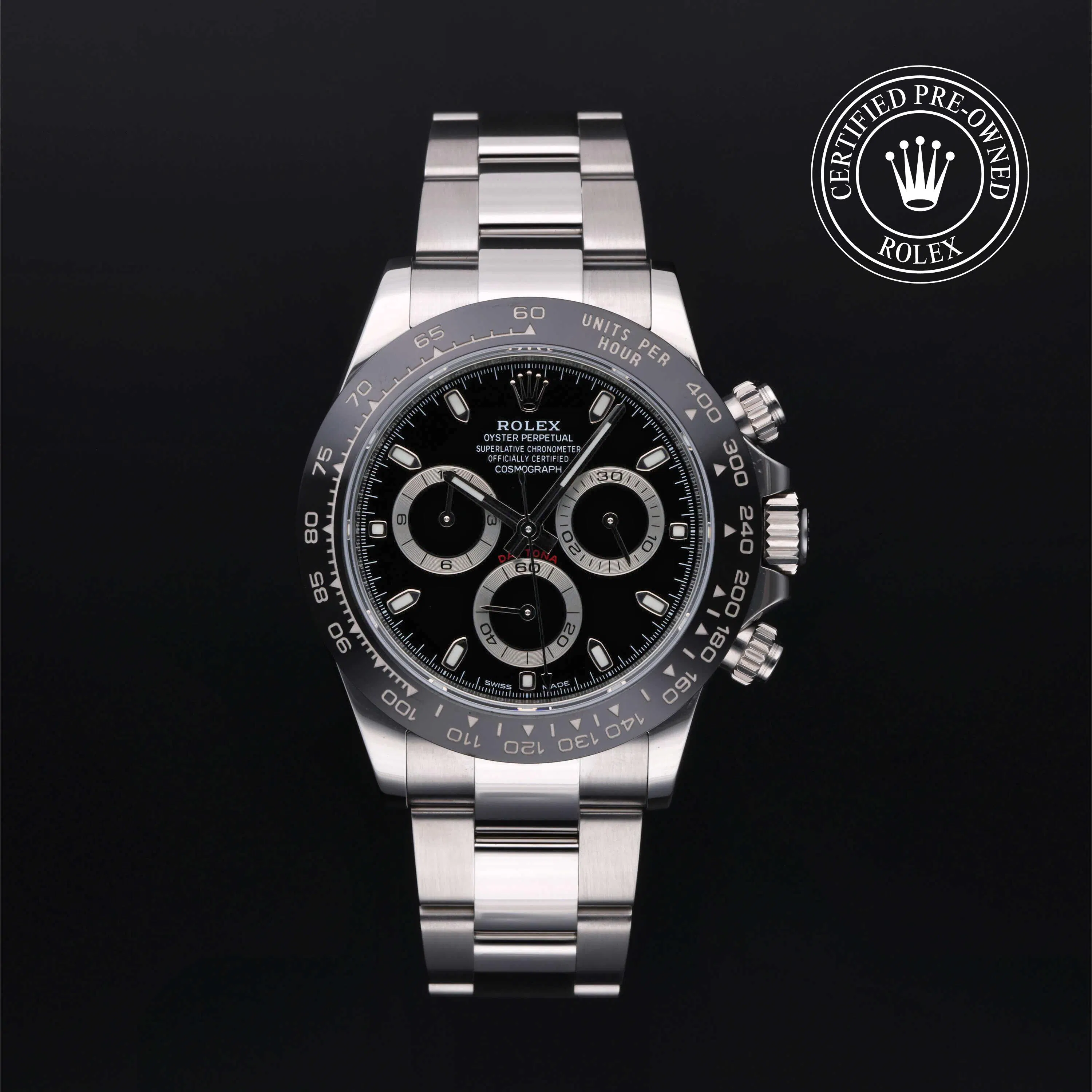 Rolex Certified Pre-Owned Cosmograph Daytona (116500LN) self - winding automatic watch, features a 40mm stainless steel case with a black cerachrom tachymetric scale bezel surrounding a black dial on a stainless steel oyster bracelet. Functions include hours, minutes, seconds, chronograph and tachymeter. This watch has received Rolex-authorized service and certification. It comes with the original box and papers, and includes a custom Rolex Certified Pre-Owned hang tag, travel pouch and RCPO international warranty card.