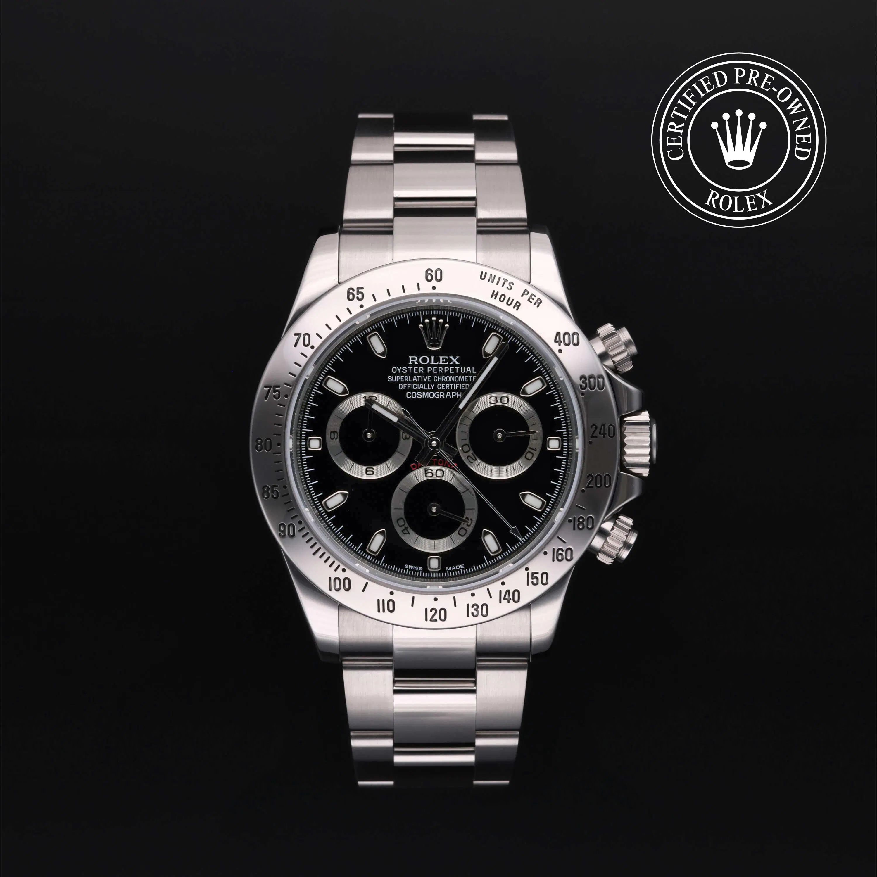 Rolex Certified Pre-Owned Cosmograph Daytona (116520) self - winding automatic watch, features a 40mm stainless steel case and tachymetric scale bezel surrounding a black dial. The watch is secured on a stainless steel Oyster bracelet complete with a folding buckle. Functions include hours, minutes, seconds, chronograph and tachymeter. This watch has received Rolex-authorized service and certification. It comes with the original box and papers, and includes a custom Rolex Certified Pre-Owned hang tag, travel pouch and RCPO international warranty card.