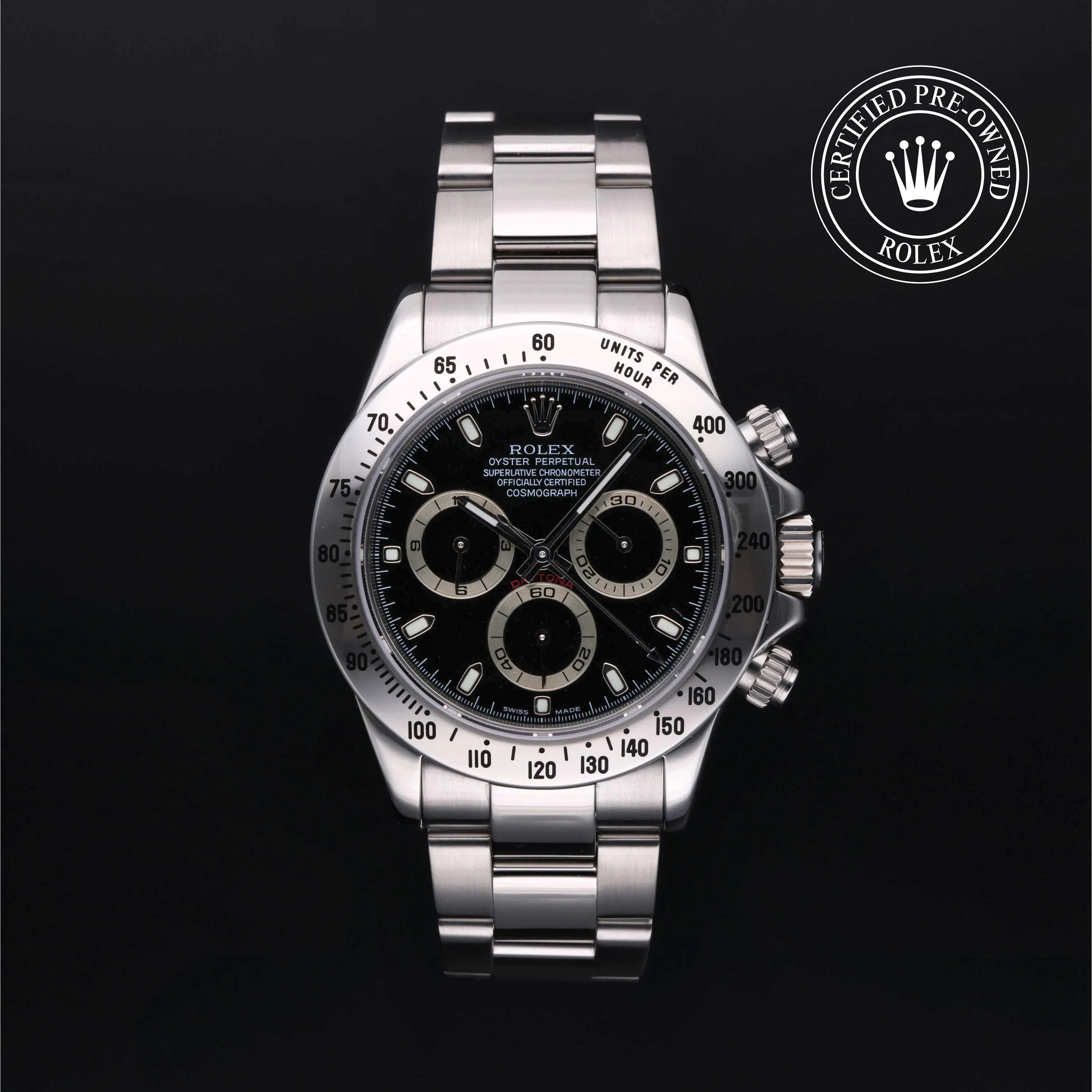 Rolex Certified Pre-Owned Cosmograph Daytona (116520) self - winding automatic watch, features a 40mm stainless steel case and tachymetric scale bezel surrounding a black dial. The watch is secured on a stainless steel Oyster bracelet complete with a folding buckle. Functions include hours, minutes, seconds, chronograph and tachymeter. This watch has received Rolex-authorized service and certification. It does not come with the original box or papers, but includes a custom Rolex Certified Pre-Owned hang tag, travel pouch and RCPO international warranty card.