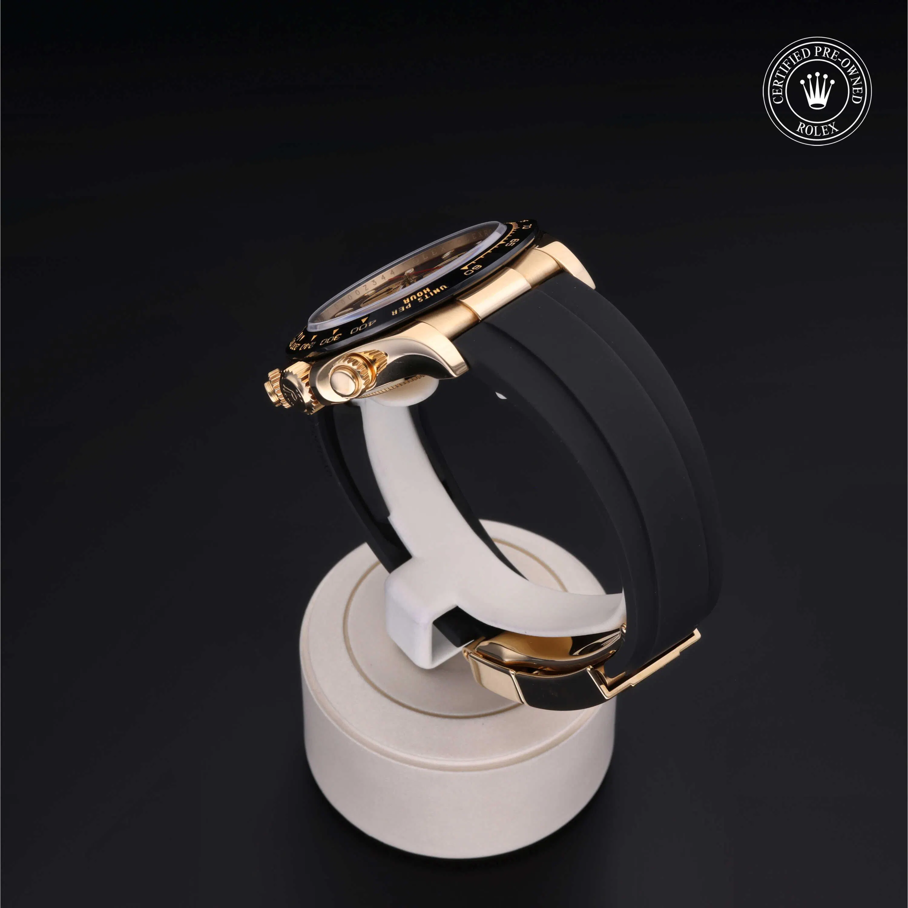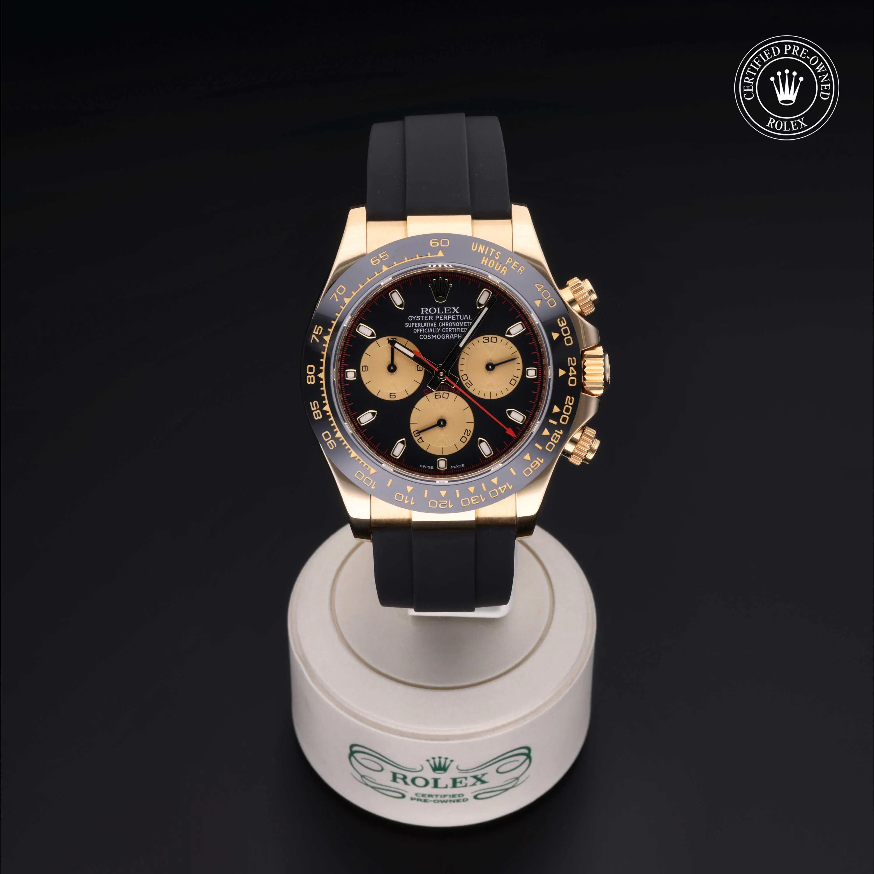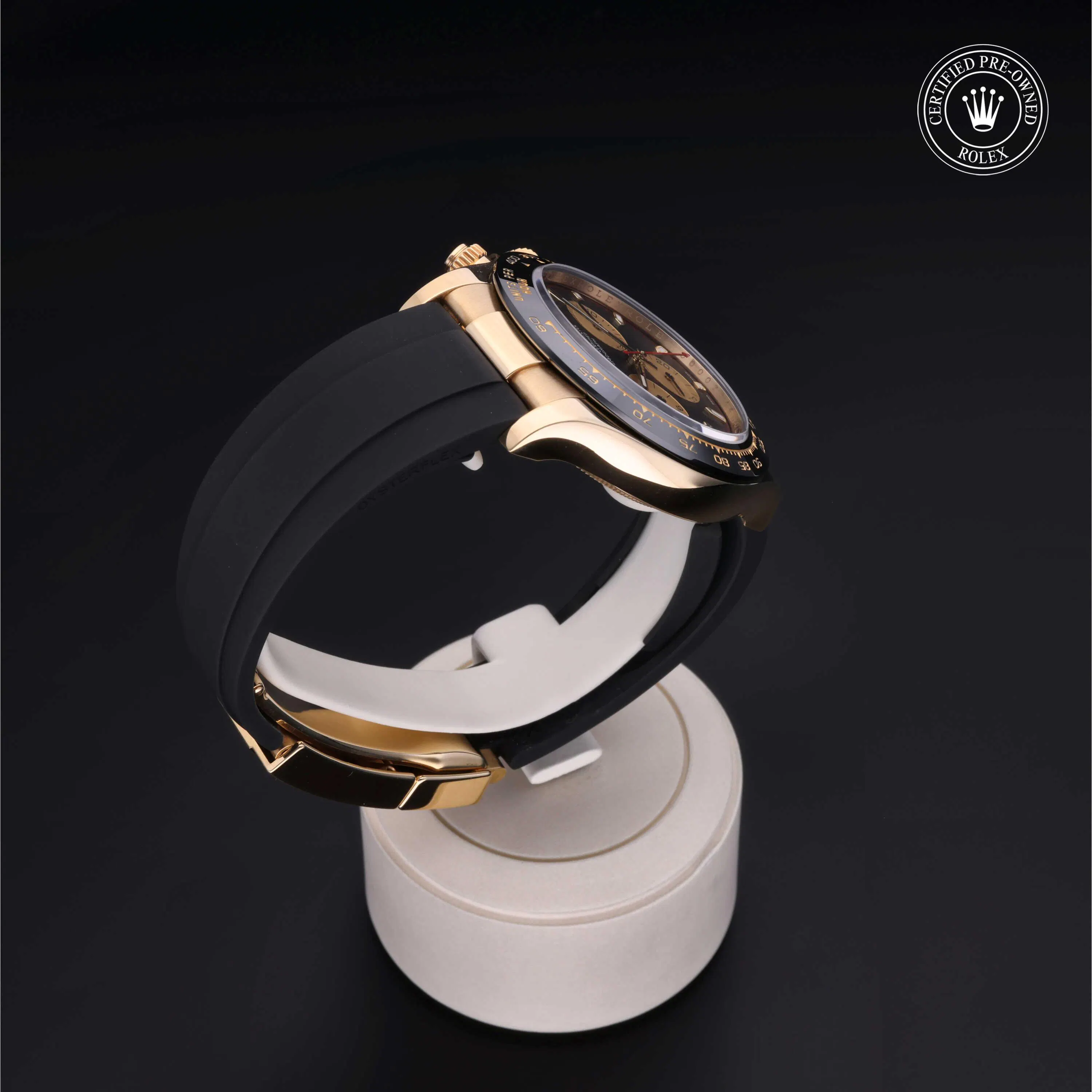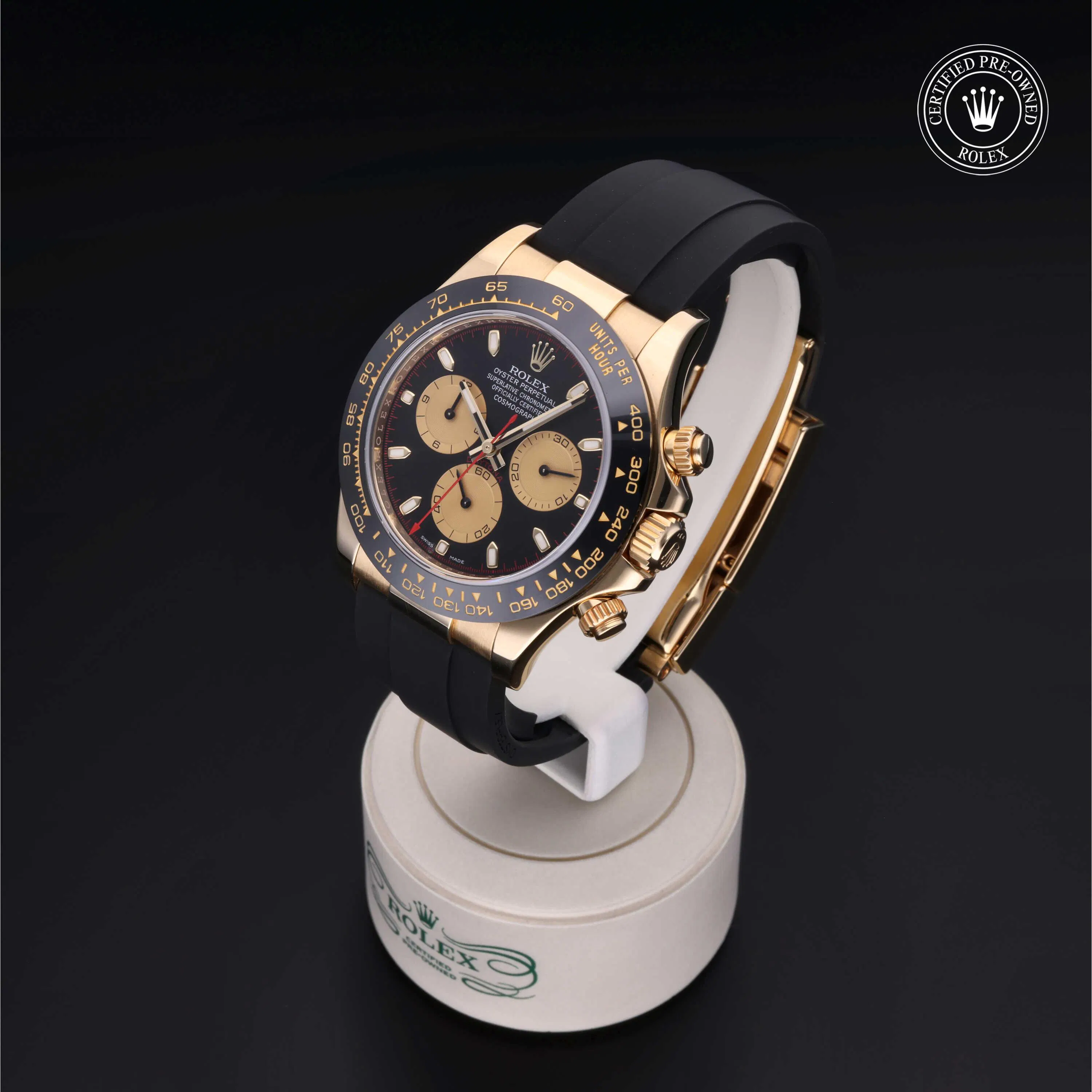 Rolex Certified Pre-Owned Cosmograph Daytona (116518LN) self - winding automatic watch, features a 40mm 18k yellow gold case with a black cerachrom tachymetric scale bezel surrounding a black dial on a black oysterflex strap with an 18k yellow gold deployant buckle. Functions include hours, minutes, seconds and chronograph. This watch has received Rolex-authorized service and certification. It comes with the original box and papers, and includes a custom Rolex Certified Pre-Owned hang tag, travel pouch and RCPO international warranty card.