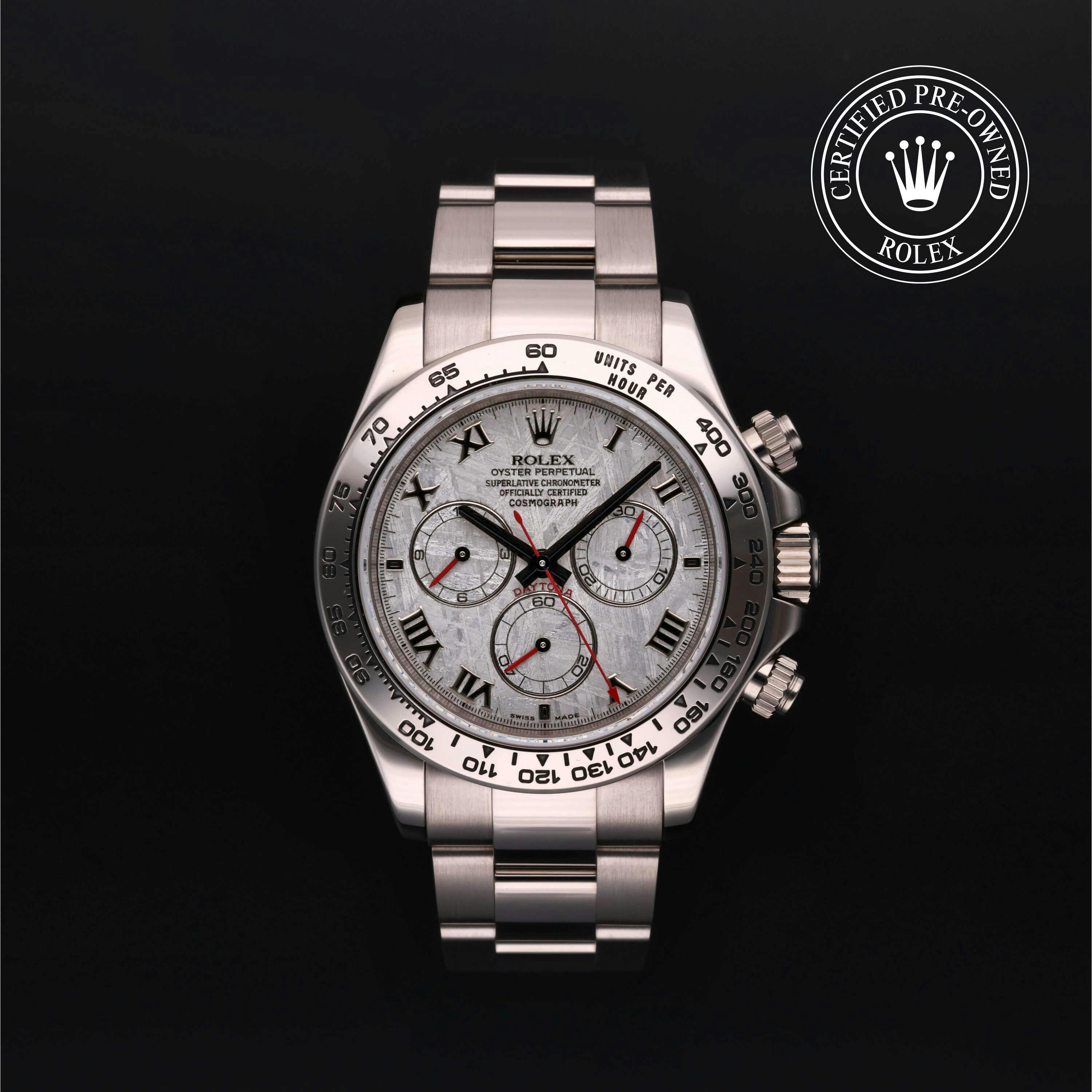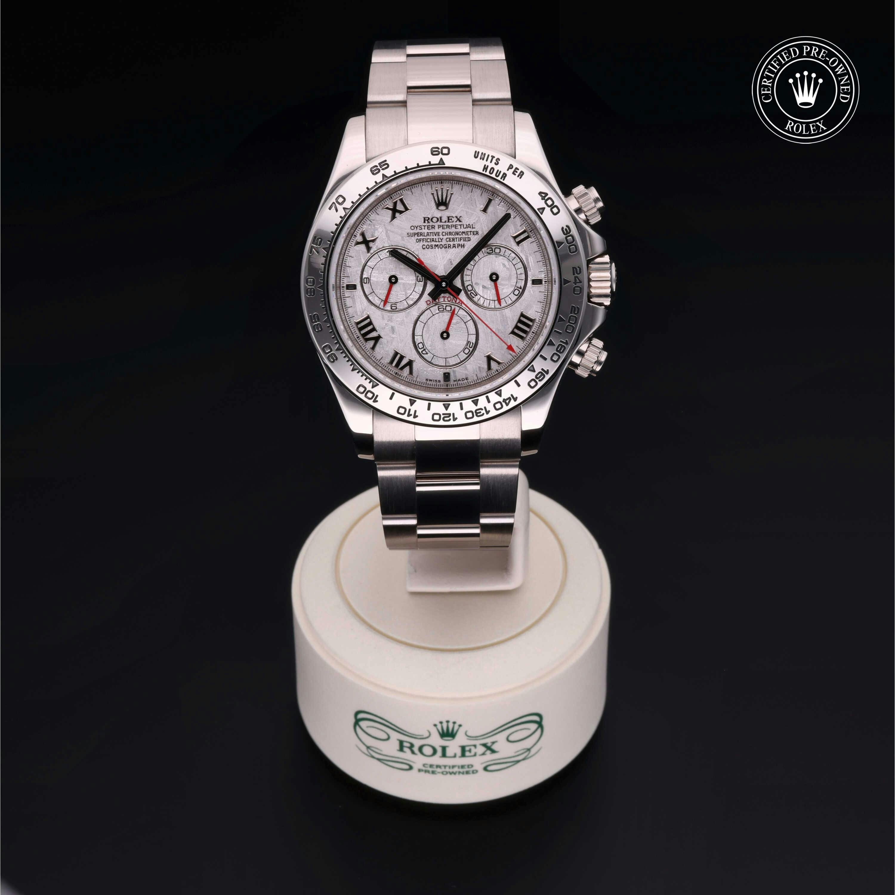 Rolex Certified Pre-Owned Cosmograph (116509) self - winding automatic watch, features a 40mm 18k white gold case and tachymetric scale bezel surrounding a meteorite dial on an 18k white gold oyster bracelet. Functions include hours, minutes, seconds and chronograph. This watch has received Rolex-authorized service and certification. It comes with the original papers, and includes a custom Rolex Certified Pre-Owned hang tag, travel pouch and RCPO international warranty card.