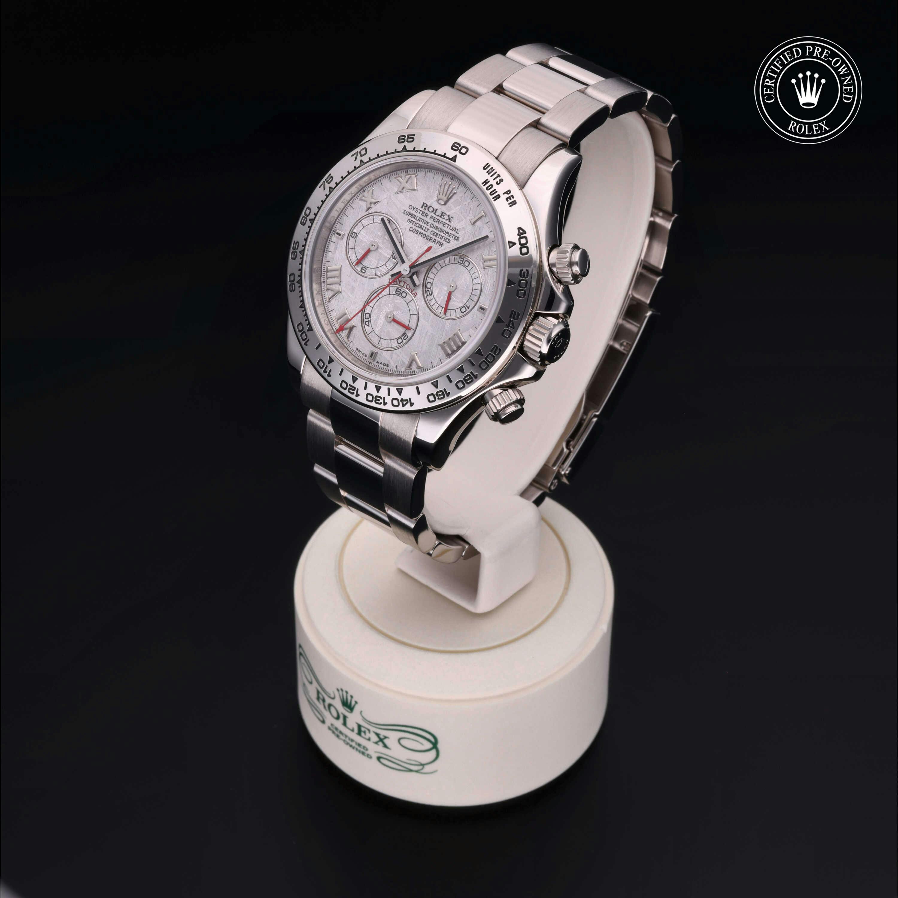 Rolex Certified Pre-Owned Cosmograph (116509) self - winding automatic watch, features a 40mm 18k white gold case and tachymetric scale bezel surrounding a meteorite dial on an 18k white gold oyster bracelet. Functions include hours, minutes, seconds and chronograph. This watch has received Rolex-authorized service and certification. It comes with the original papers, and includes a custom Rolex Certified Pre-Owned hang tag, travel pouch and RCPO international warranty card.