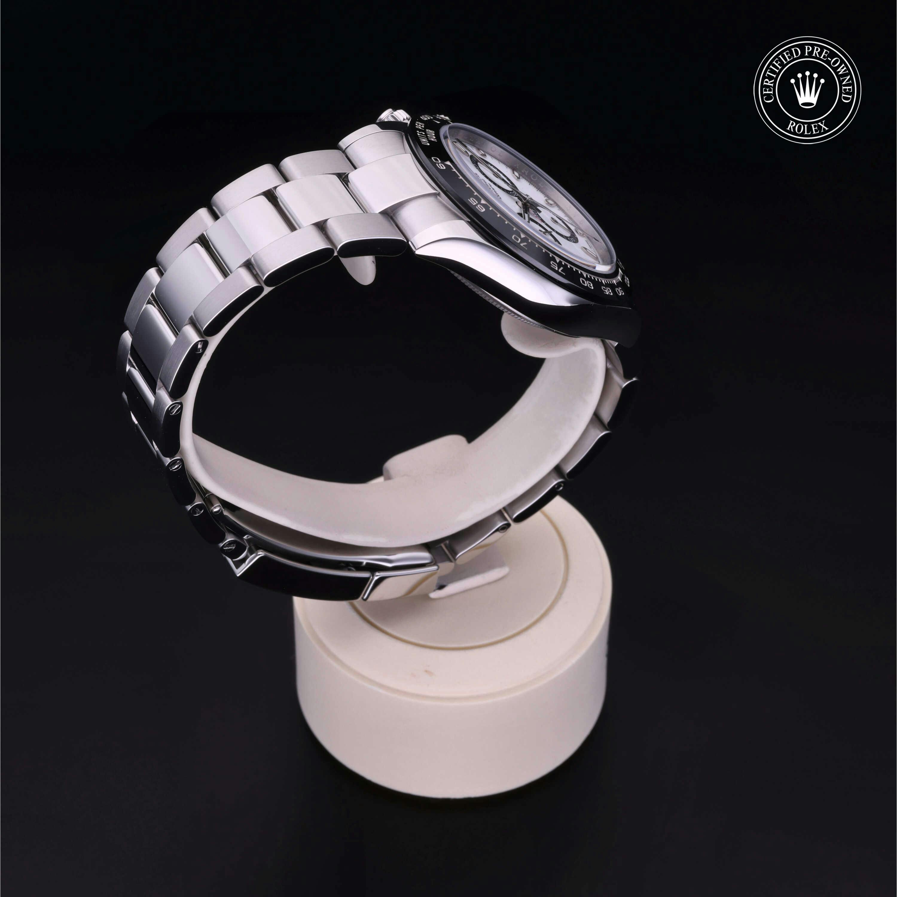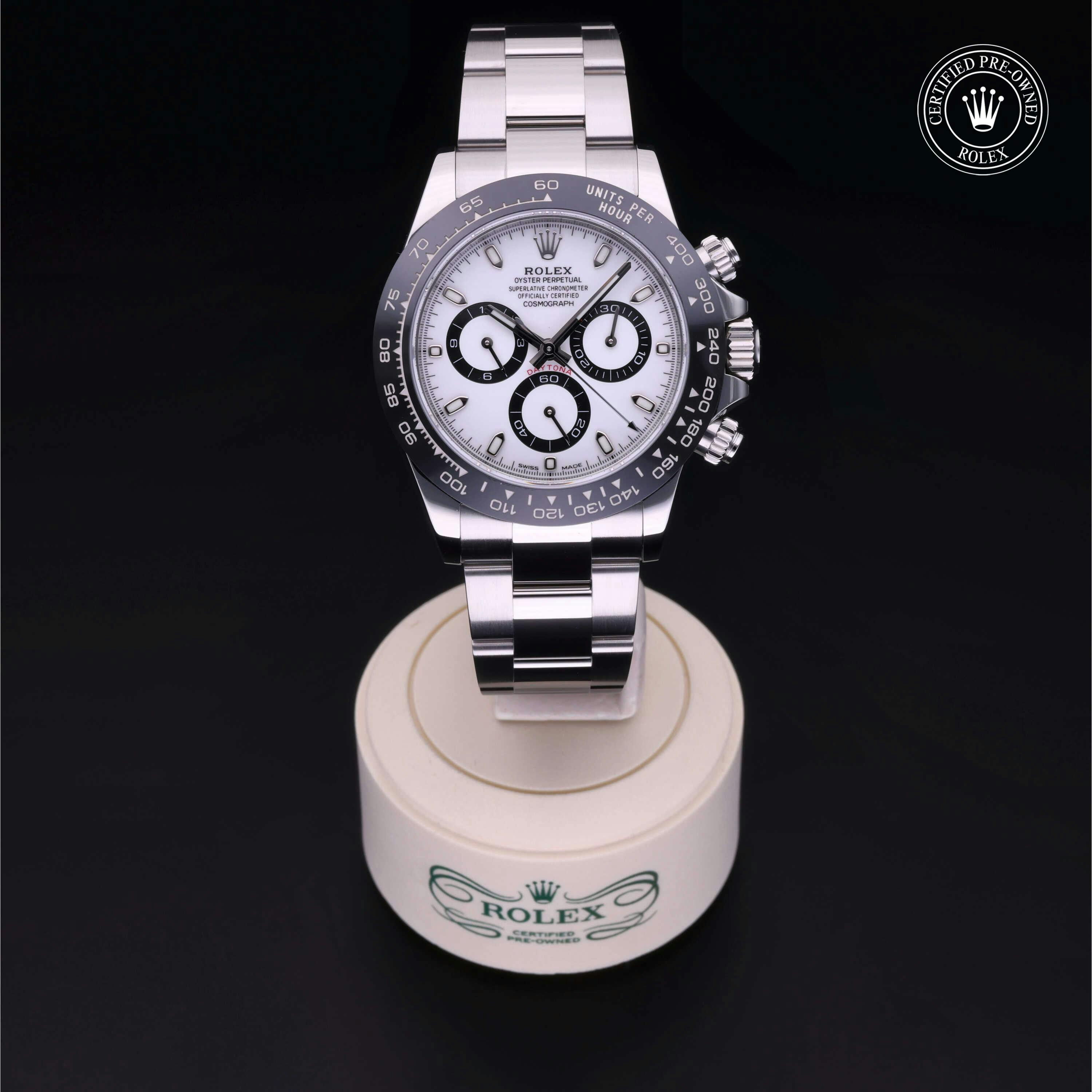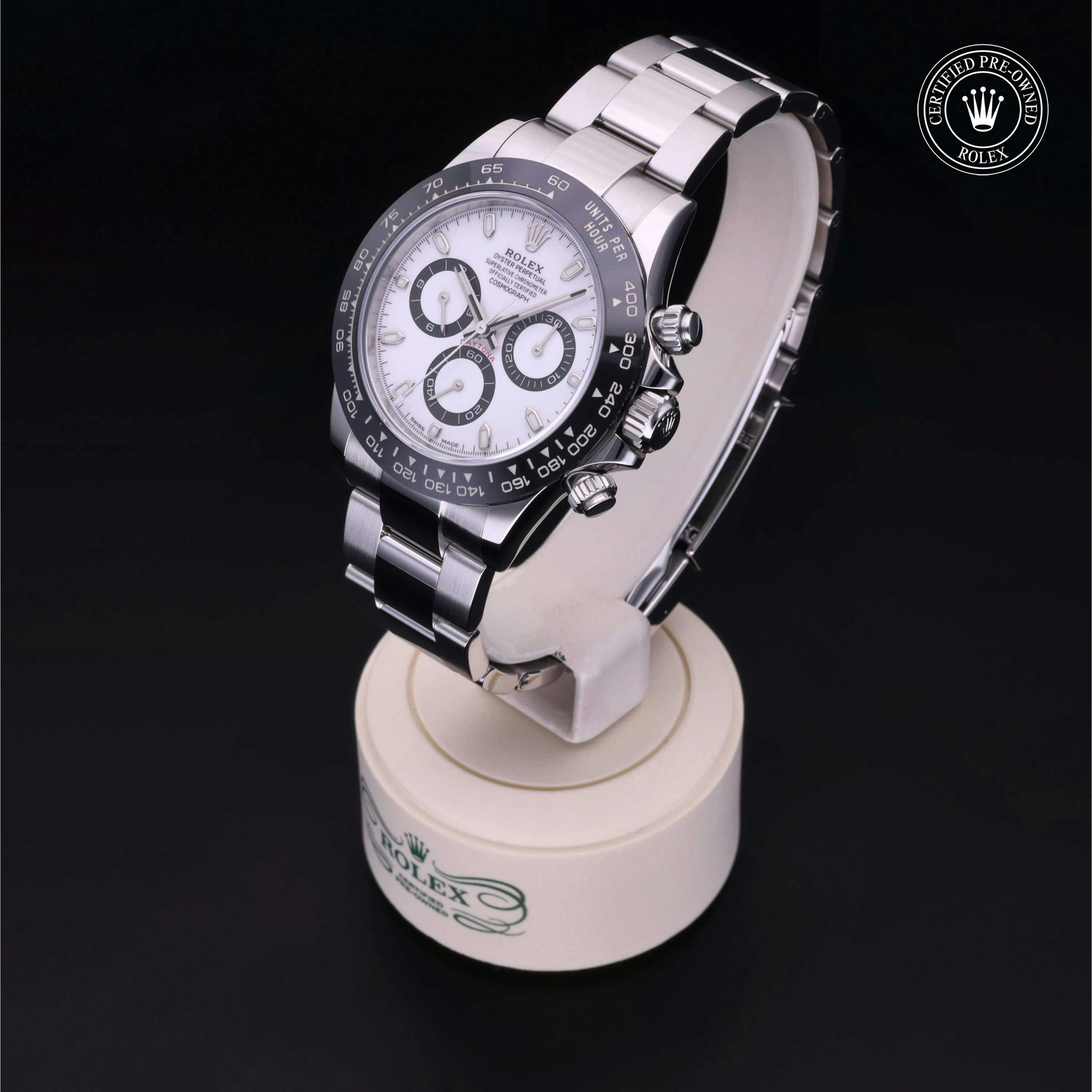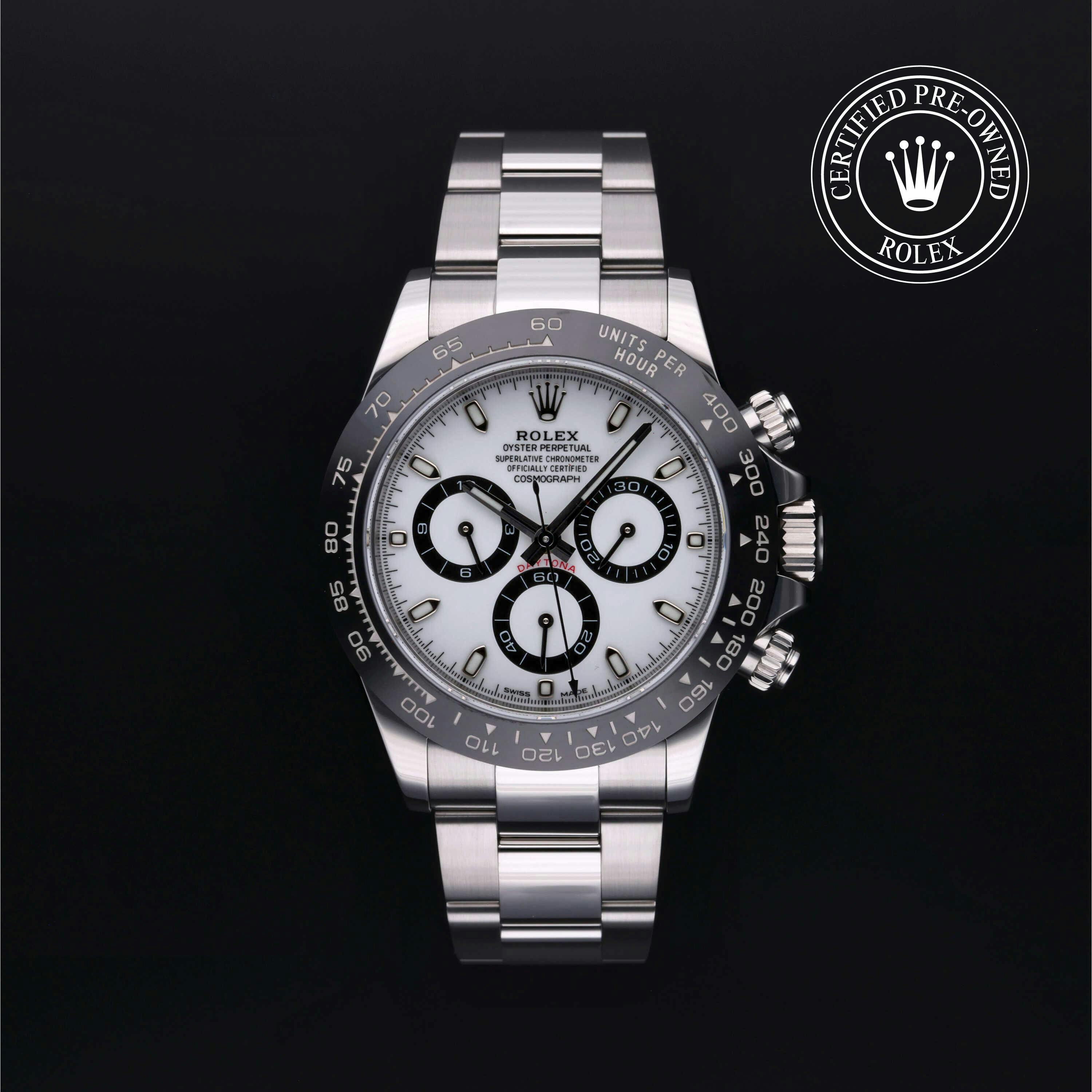 Rolex Certified Pre-Owned Cosmograph Daytona (116500LN) self - winding automatic watch, features a 40mm stainless steel case with a black cerachrom tachymetric scale bezel surrounding a white dial on a stainless steel oyster bracelet. Functions include hours, minutes, seconds and chronograph. This watch has received Rolex-authorized service and certification. It comes with the original box and papers, and includes a custom Rolex Certified Pre-Owned hang tag, travel pouch and RCPO international warranty card.