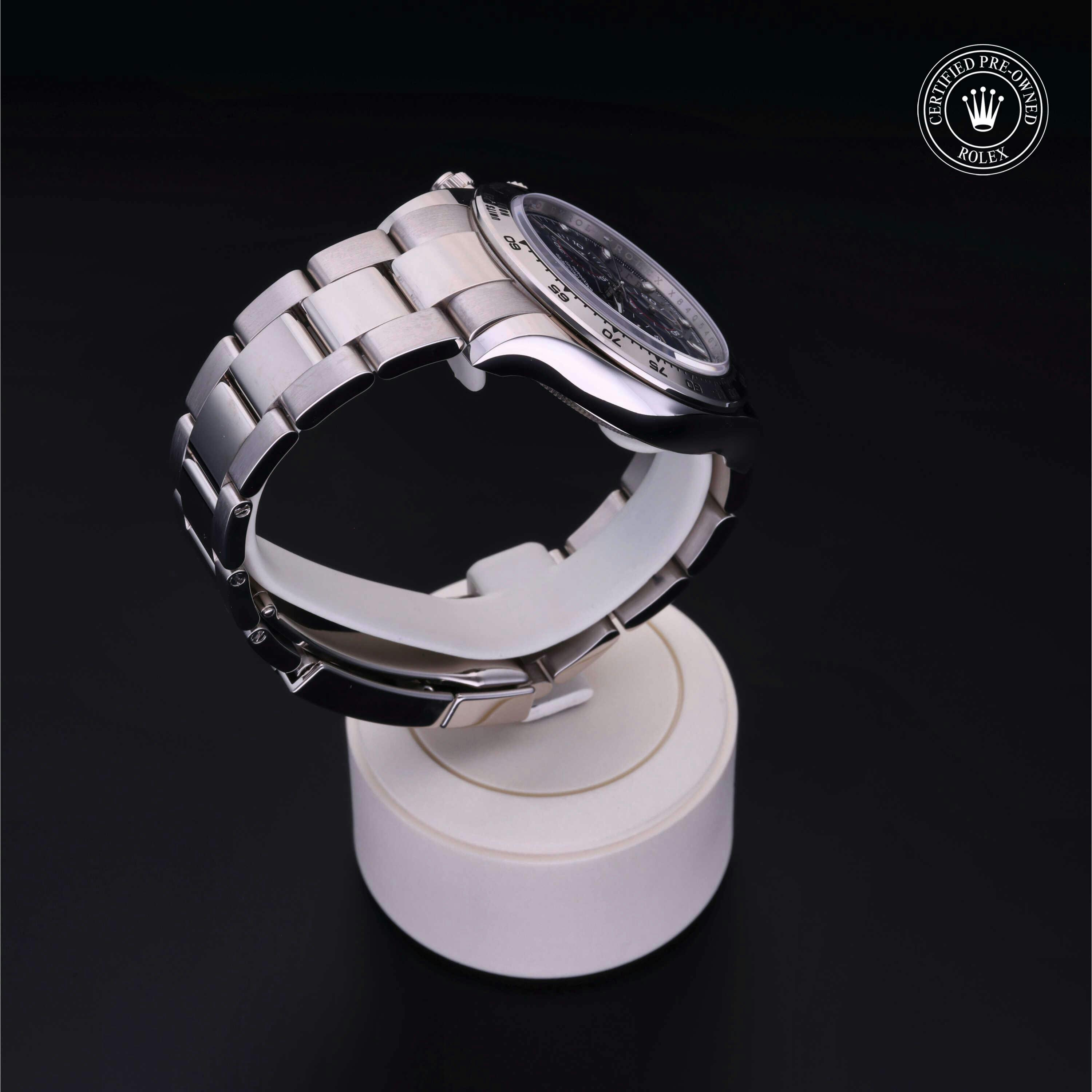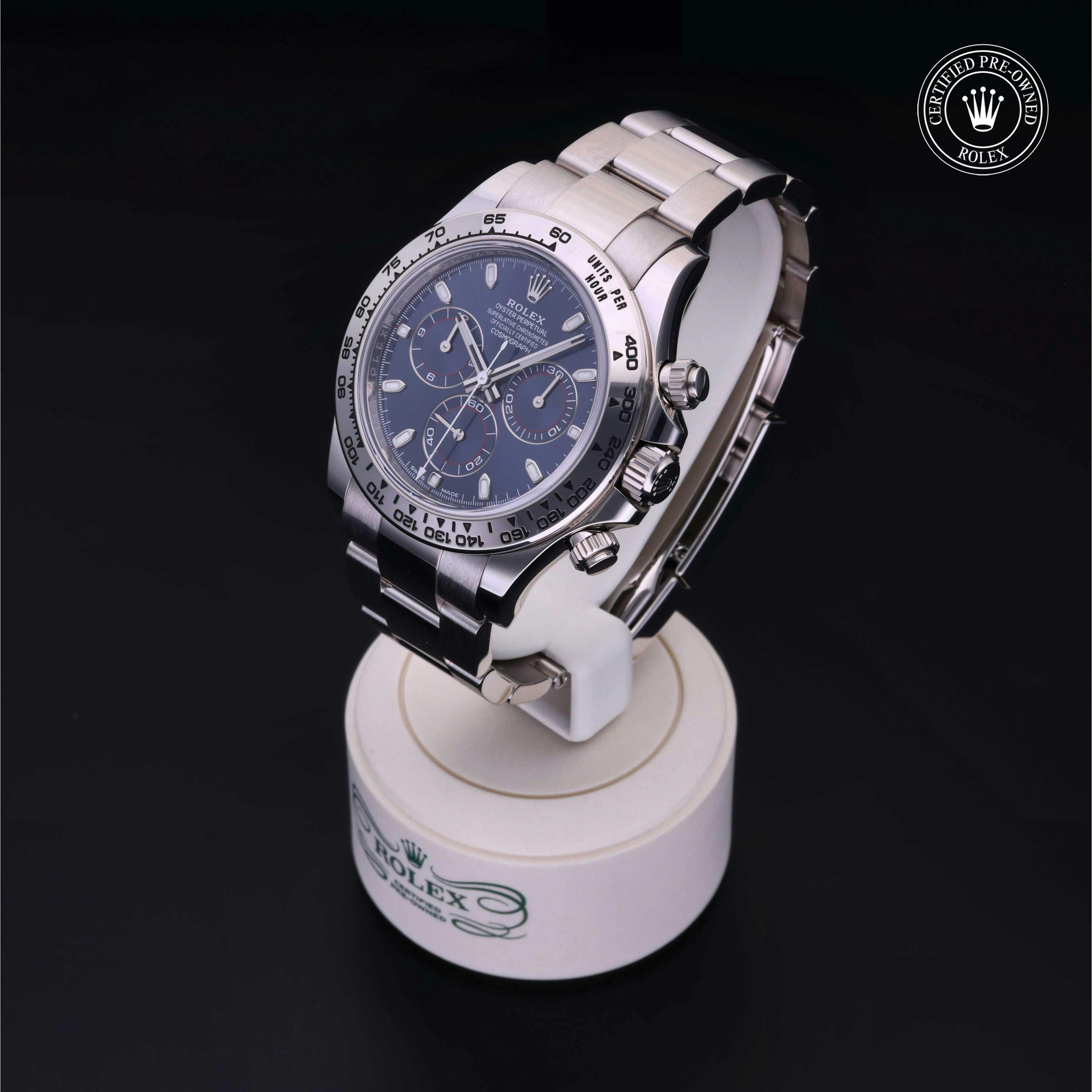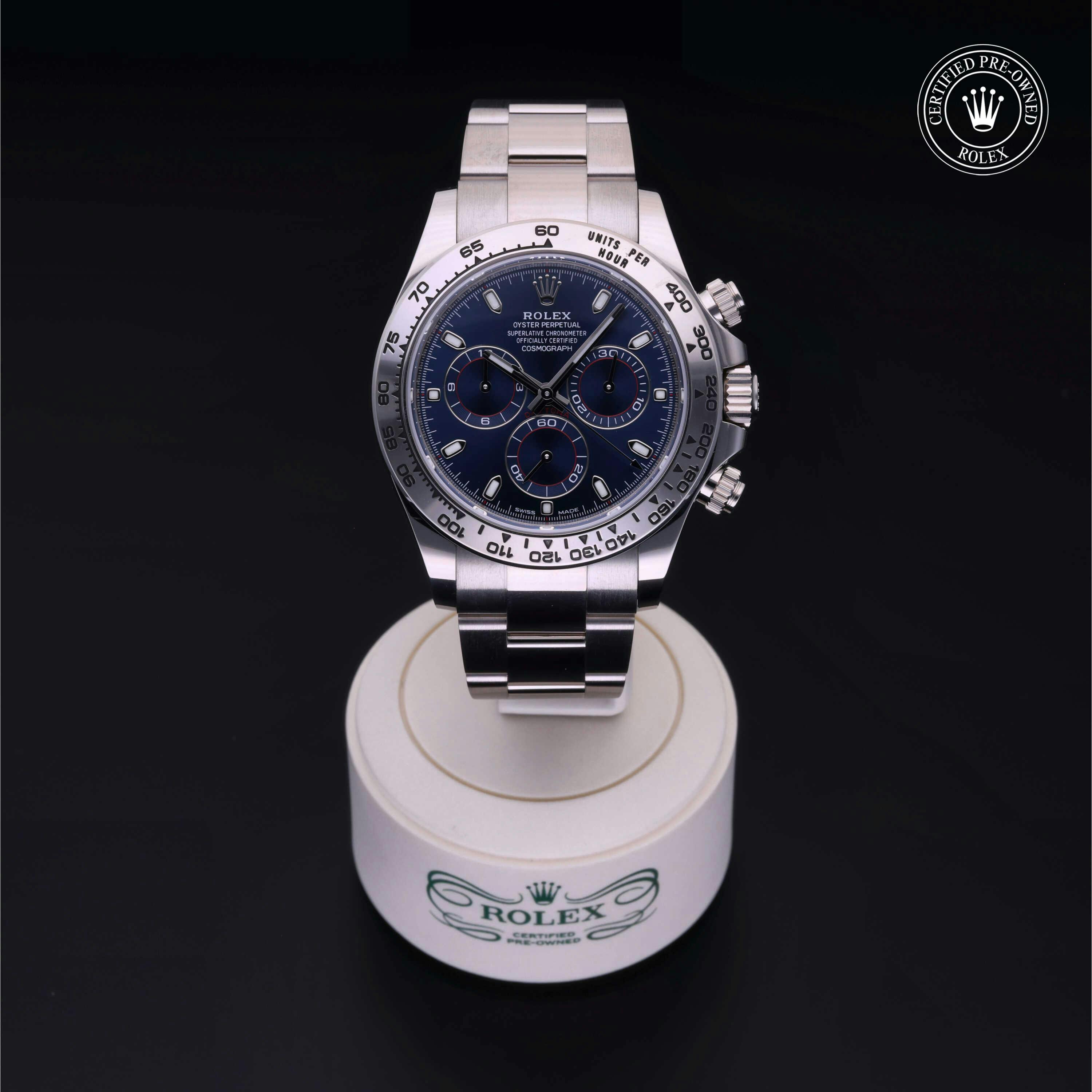Rolex Certified Pre-Owned Cosmograph Daytona (116509) self - winding automatic watch, features a 40mm 18k white gold case and tachymetric scale bezel surrounding a blue dial on an 18k white gold oyster bracelet. Functions include hours, minutes, seconds, chronograph and tachymeter. This watch has received Rolex-authorized service and certification. It comes with the original box and papers and includes a custom Rolex Certified Pre-Owned hang tag, travel pouch and RCPO international warranty card.