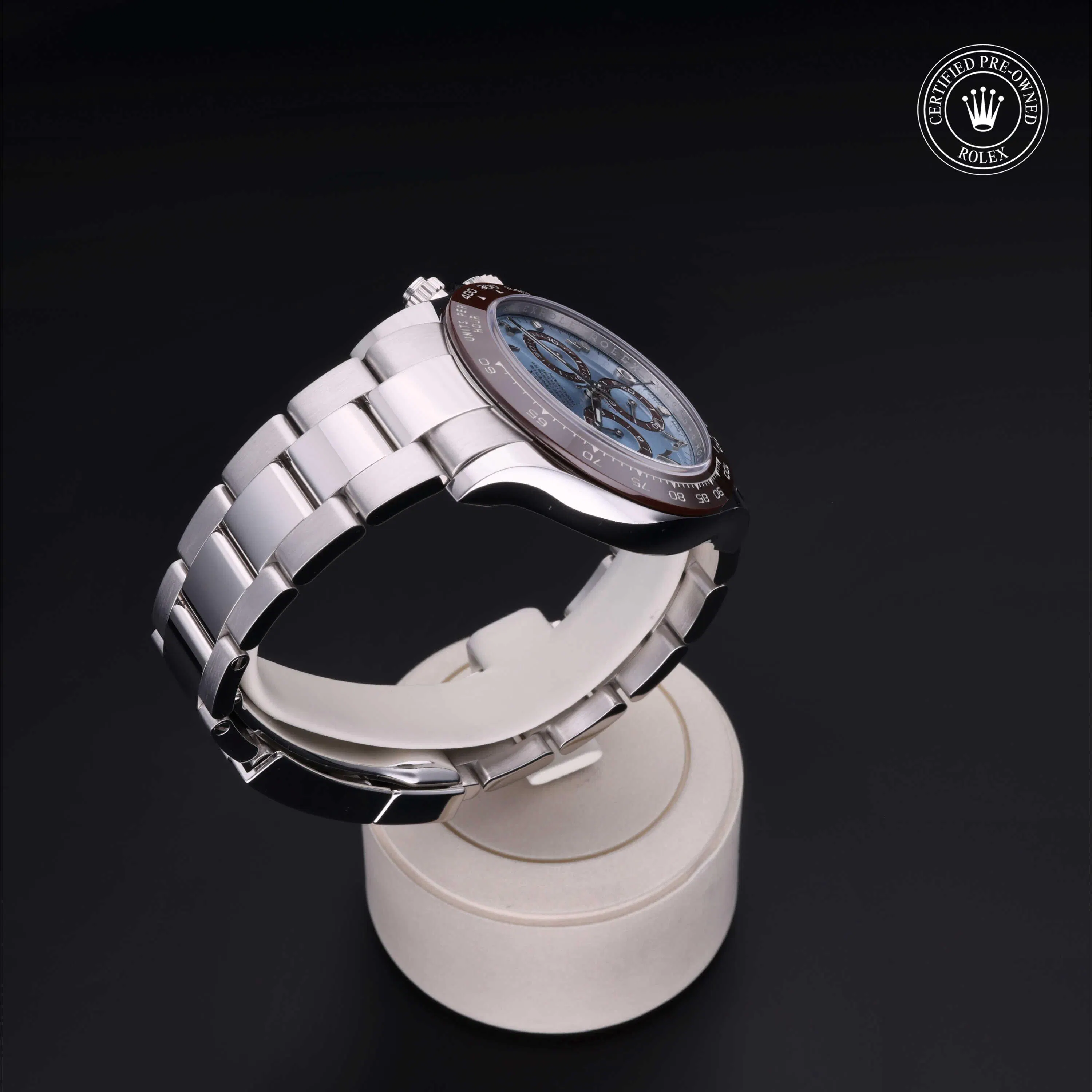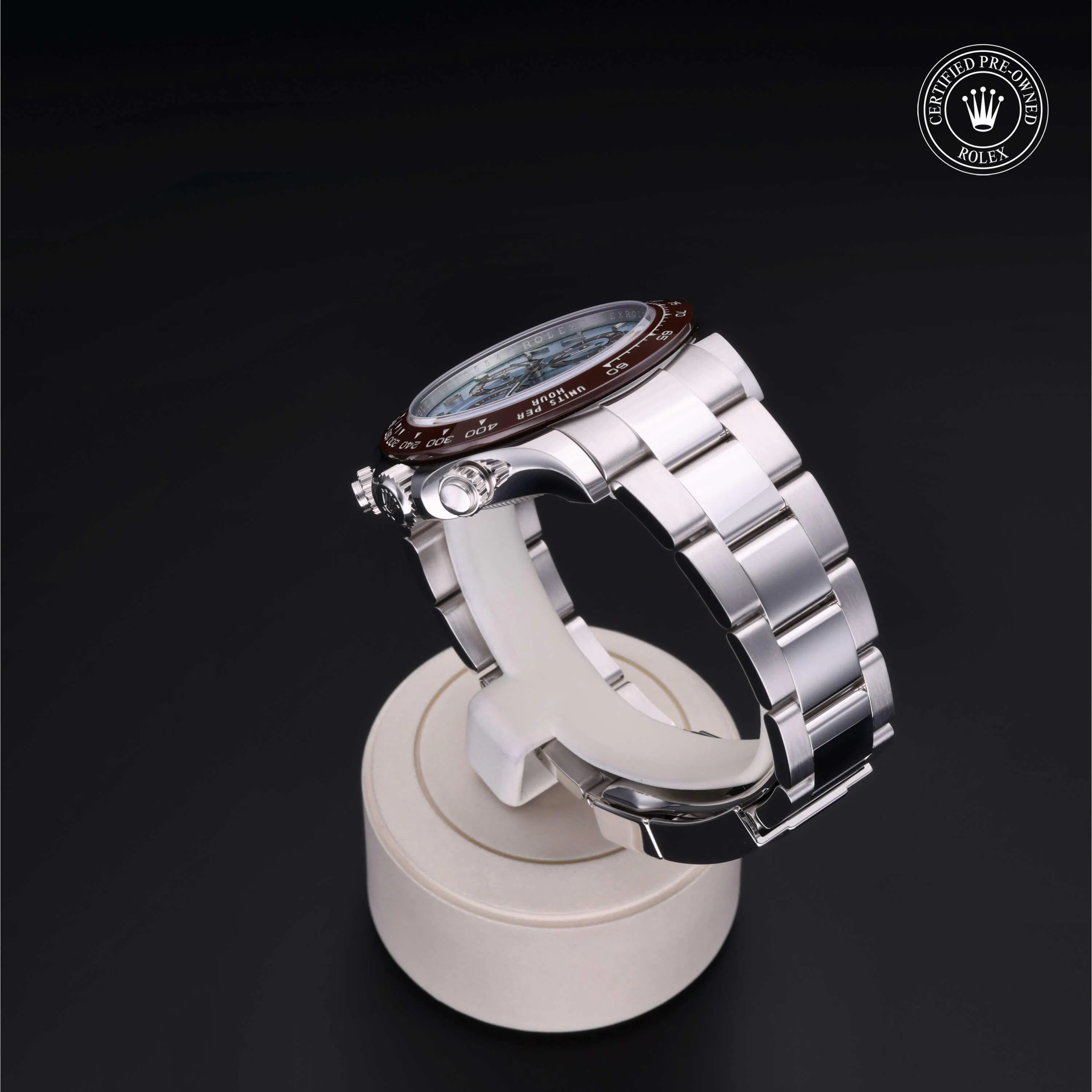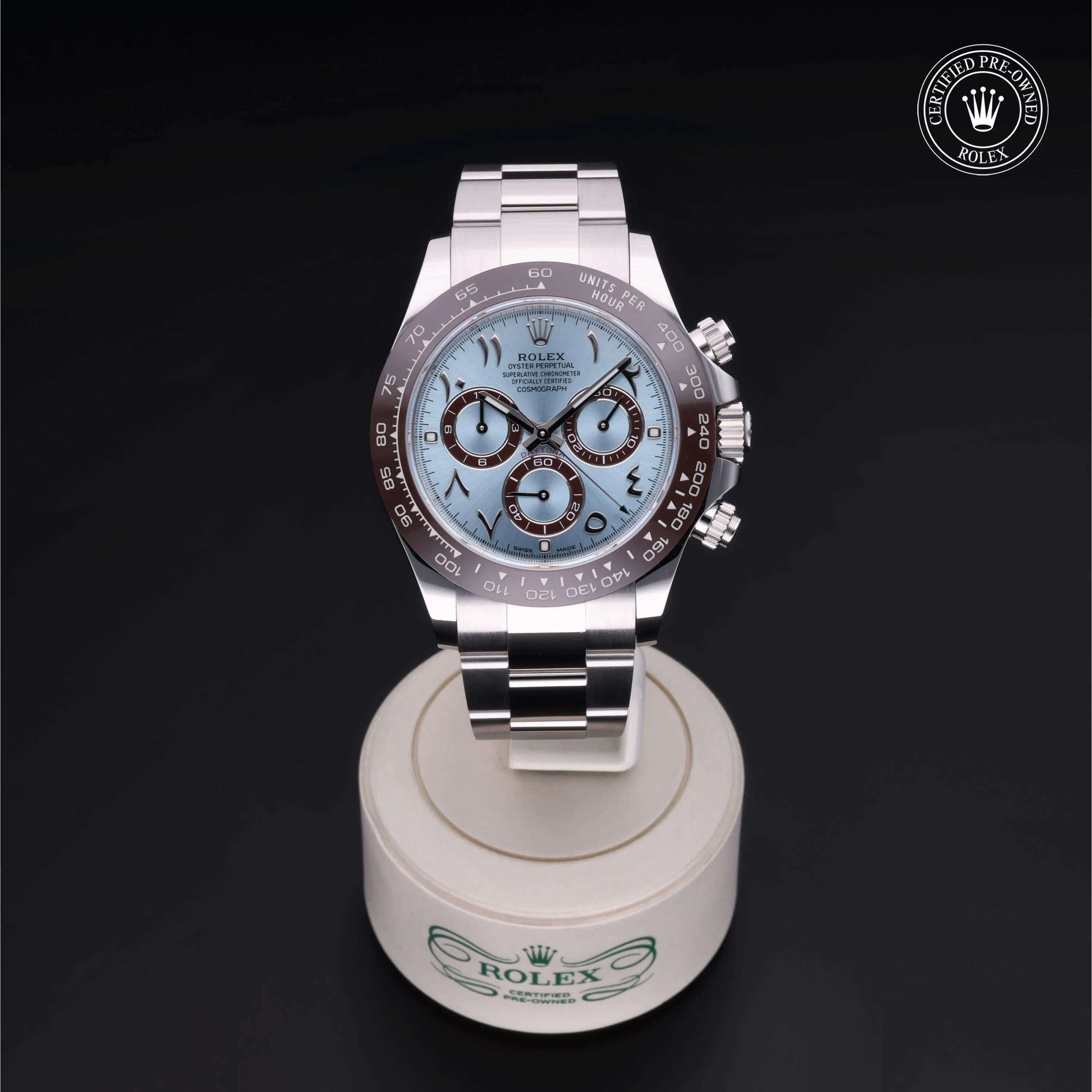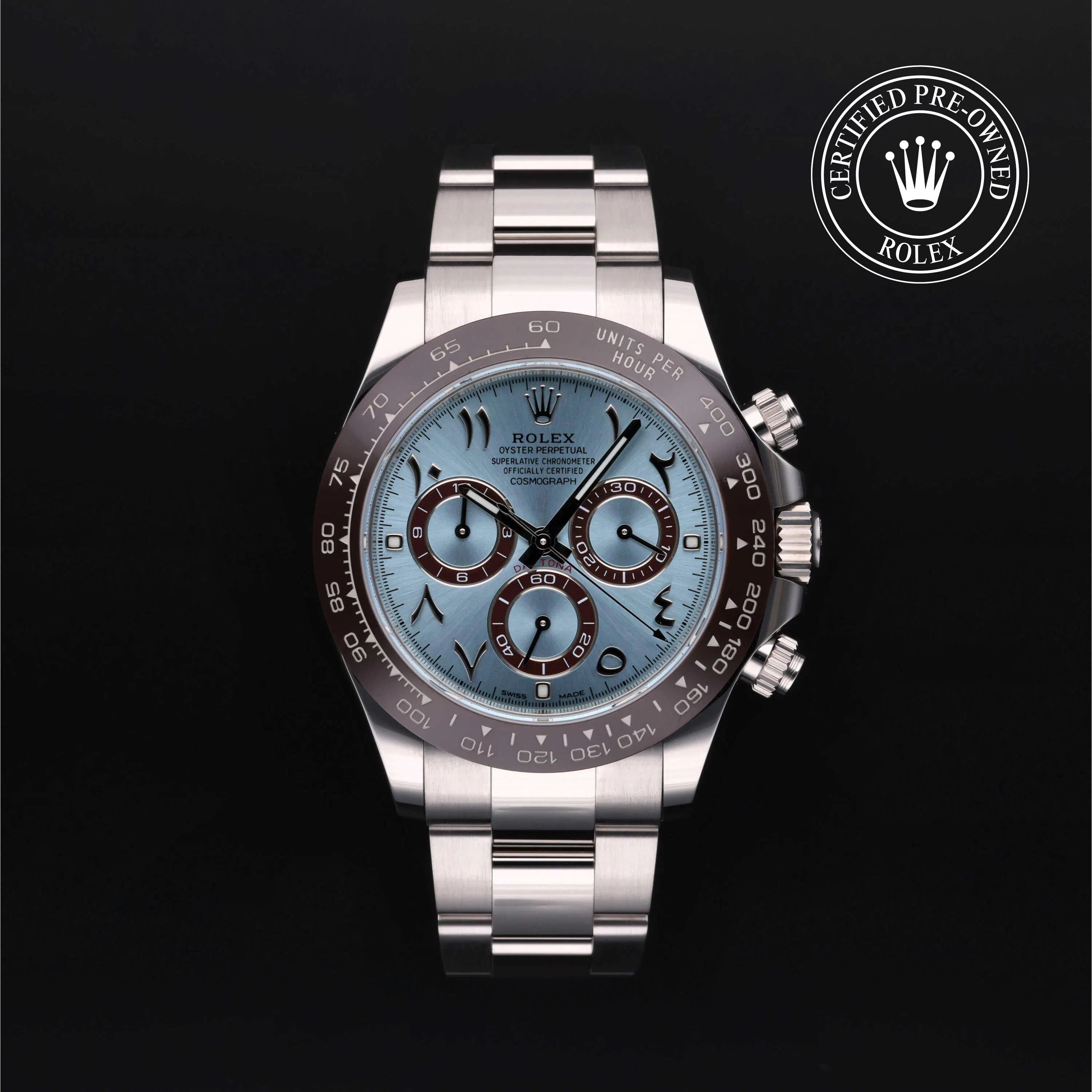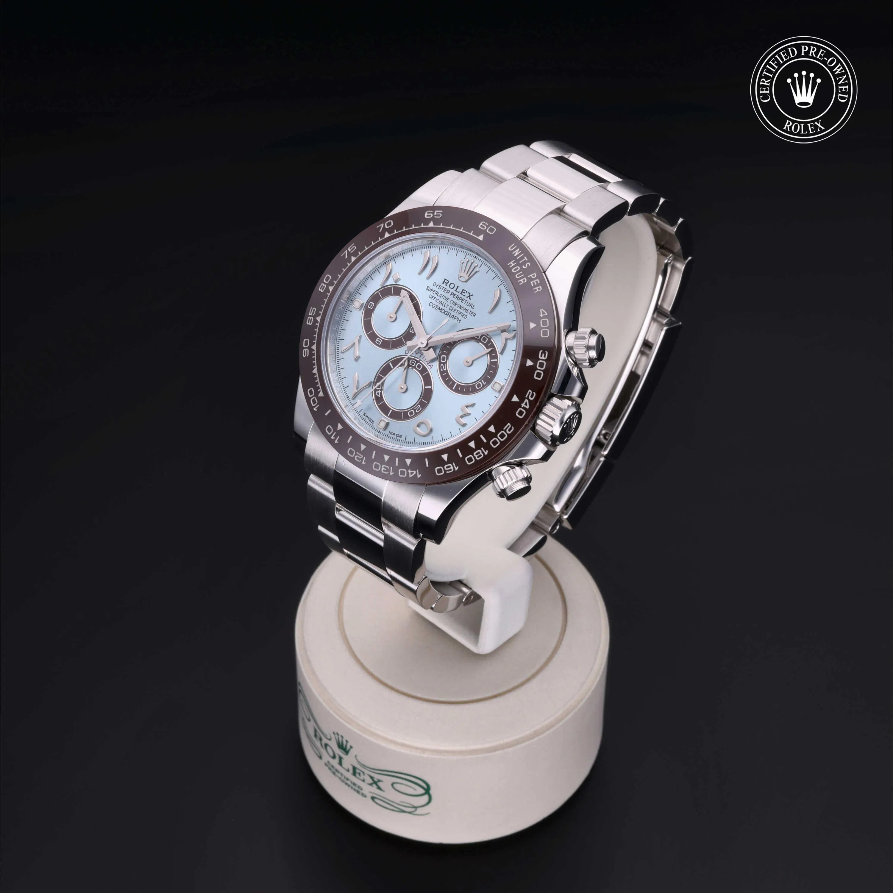 Rolex Certified Pre-Owned Cosmograph Daytona (116506) self - winding automatic watch, features a 40mm platinum case with a brown cerachrom tachymetric scale bezel surrounding an ice blue dial with eastern Arabic numerals on a platinum oyster bracelet. Functions include hours, minutes, seconds, chronograph and tachymeter. This watch has received Rolex-authorized service and certification. It comes with the original papers, and includes a custom Rolex Certified Pre-Owned hang tag, travel pouch and RCPO international warranty card.