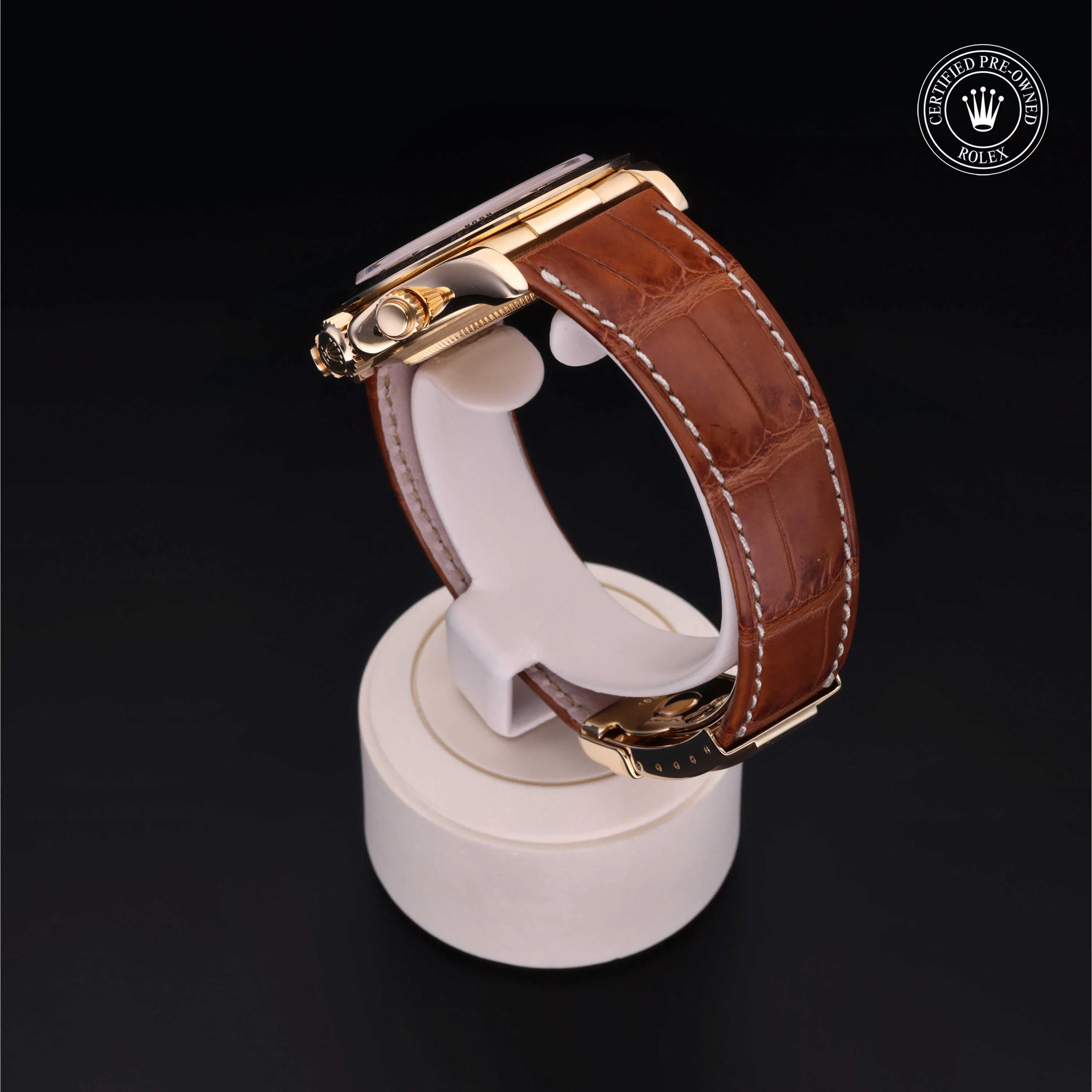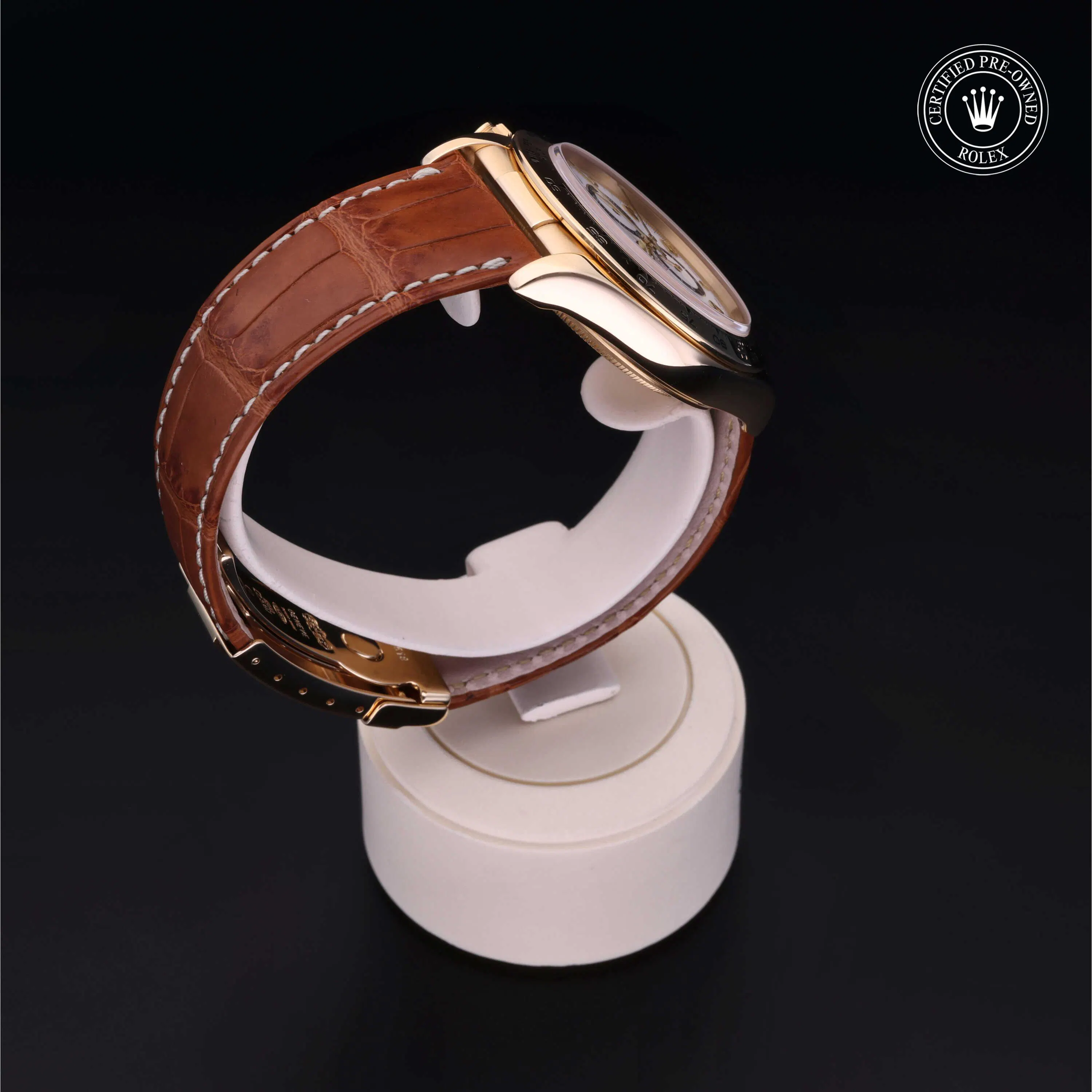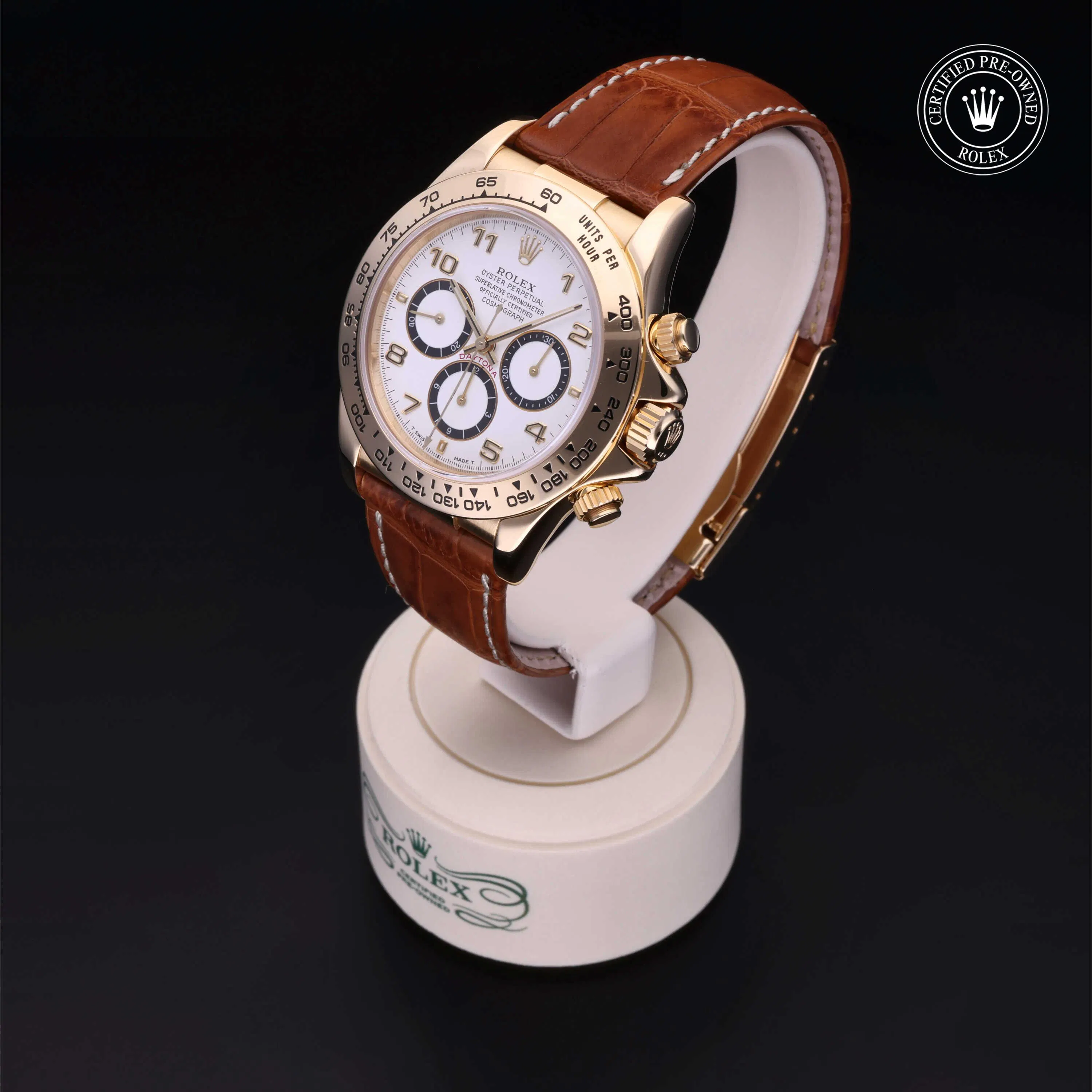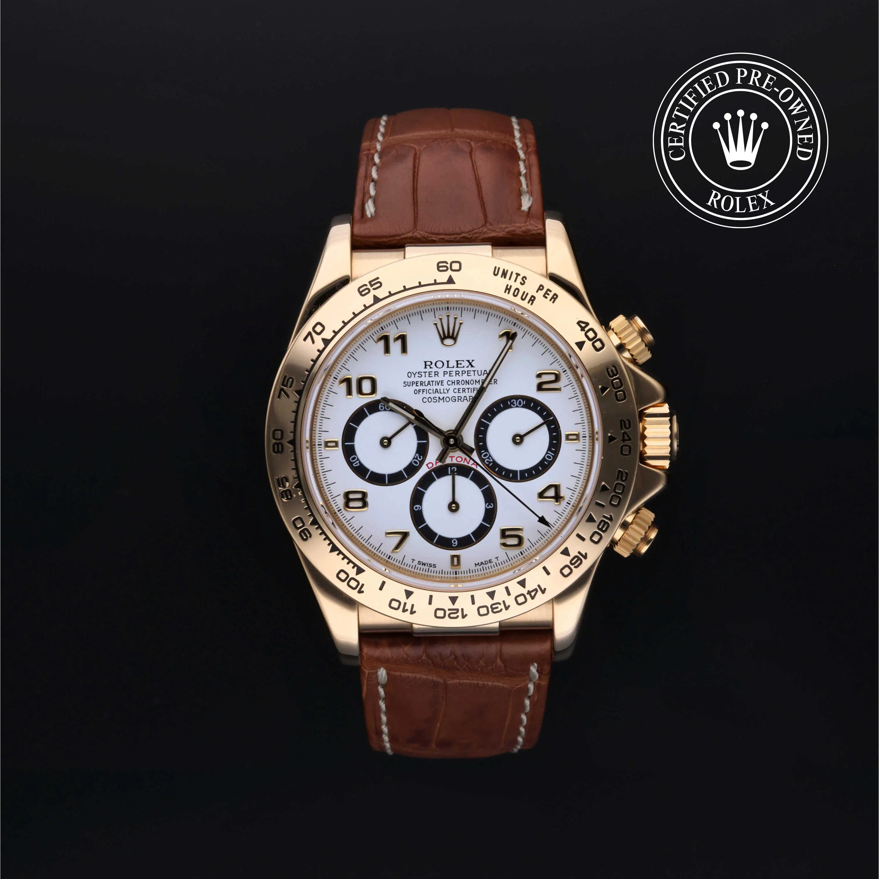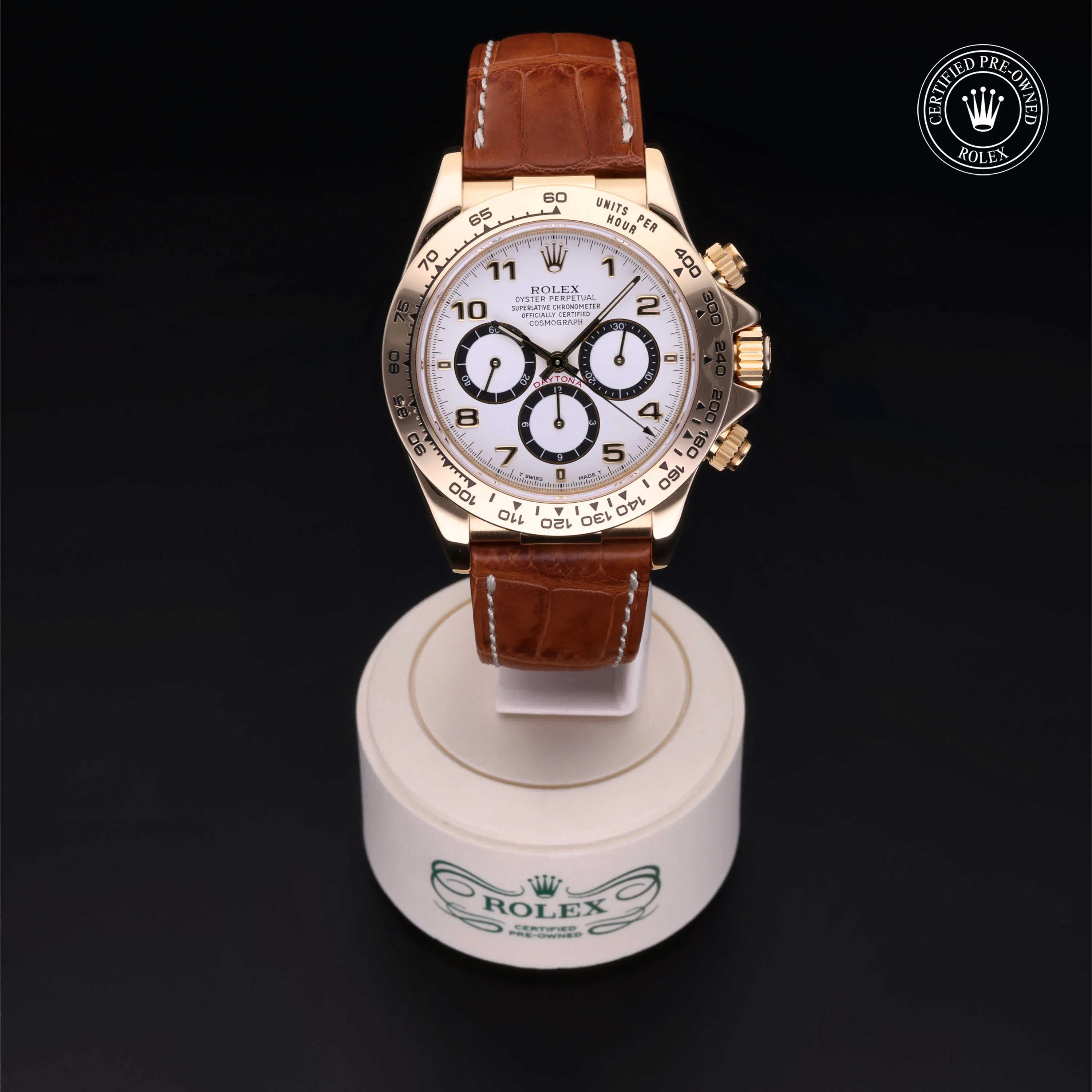 Rolex Certified Pre-Owned Cosmograph Daytona (16518) self - winding automatic watch, features a 40mm 18k yellow gold case and tachymetric scale bezel surrounding a white dial on a brown alligator strap with an 18k yellow gold deployant buckle. Functions include hours, minutes, seconds and chronograph. This watch has received Rolex-authorized service and certification. It does not come with the original box or papers, but includes a custom Rolex Certified Pre-Owned hang tag, travel pouch and RCPO international warranty card.