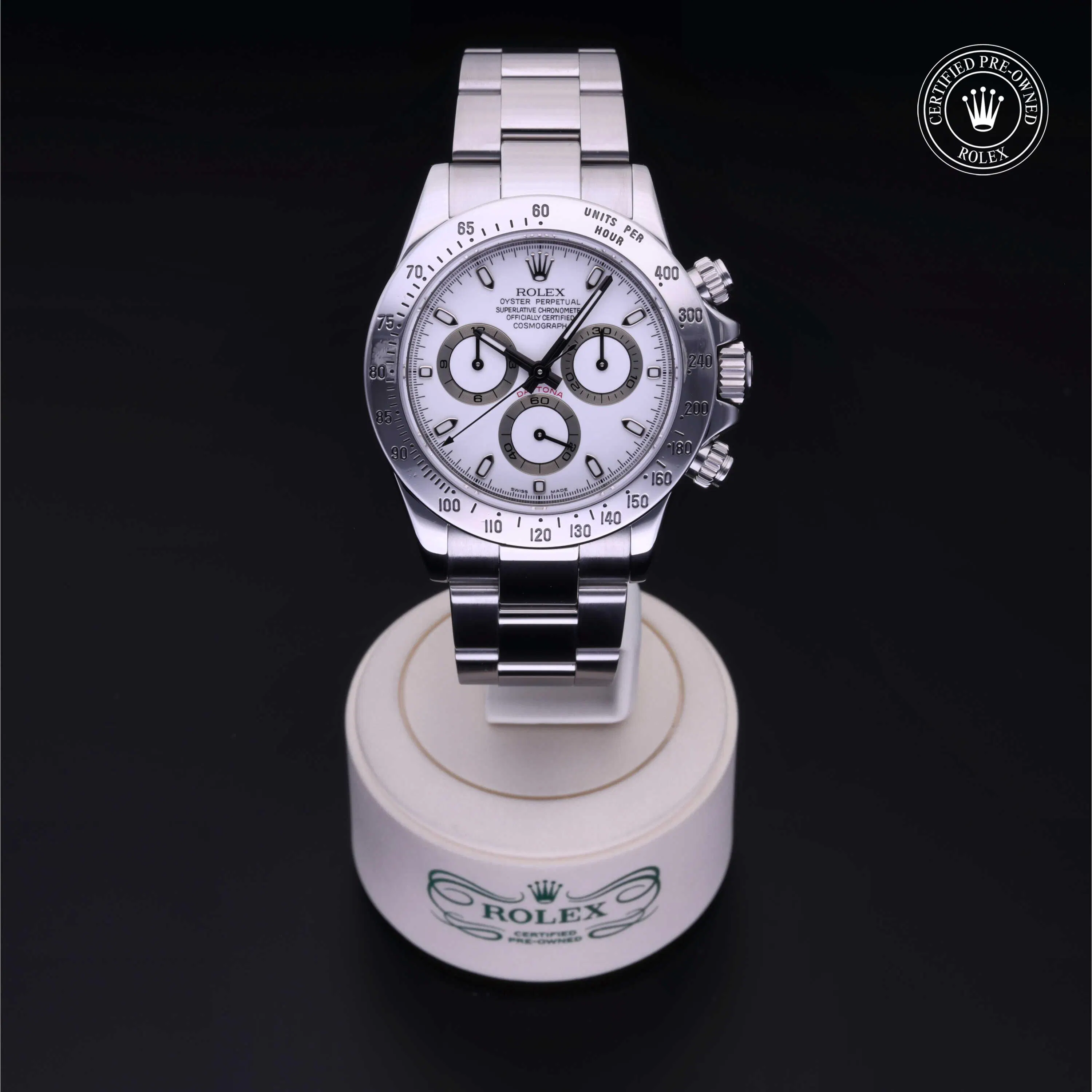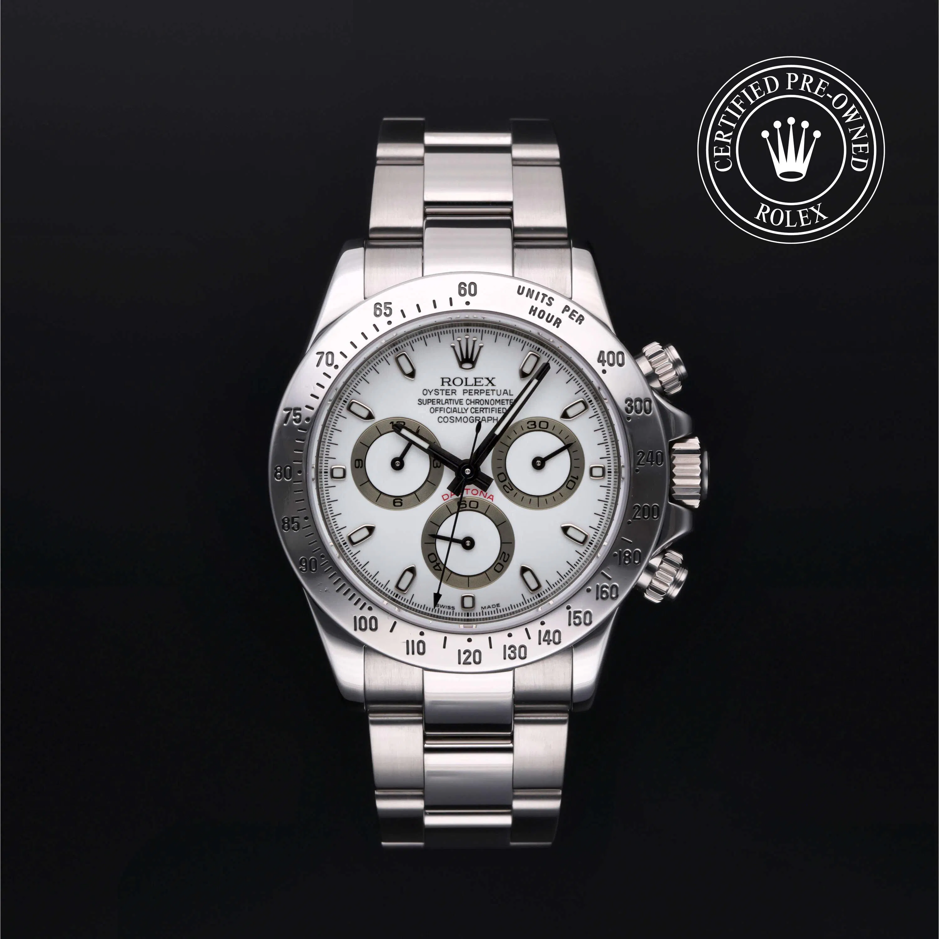 Rolex Certified Pre-Owned Cosmograph Daytona (116520) self - winding automatic watch, features a 40mm stainless steel case and tachymetric scale bezel surrounding a white dial on a stainless steel oyster bracelet. Functions include hours, minutes, seconds and chronograph. This watch has received Rolex-authorized service and certification. It comes with the original box and papers, and includes a custom Rolex Certified Pre-Owned hang tag, travel pouch and RCPO international warranty card.
