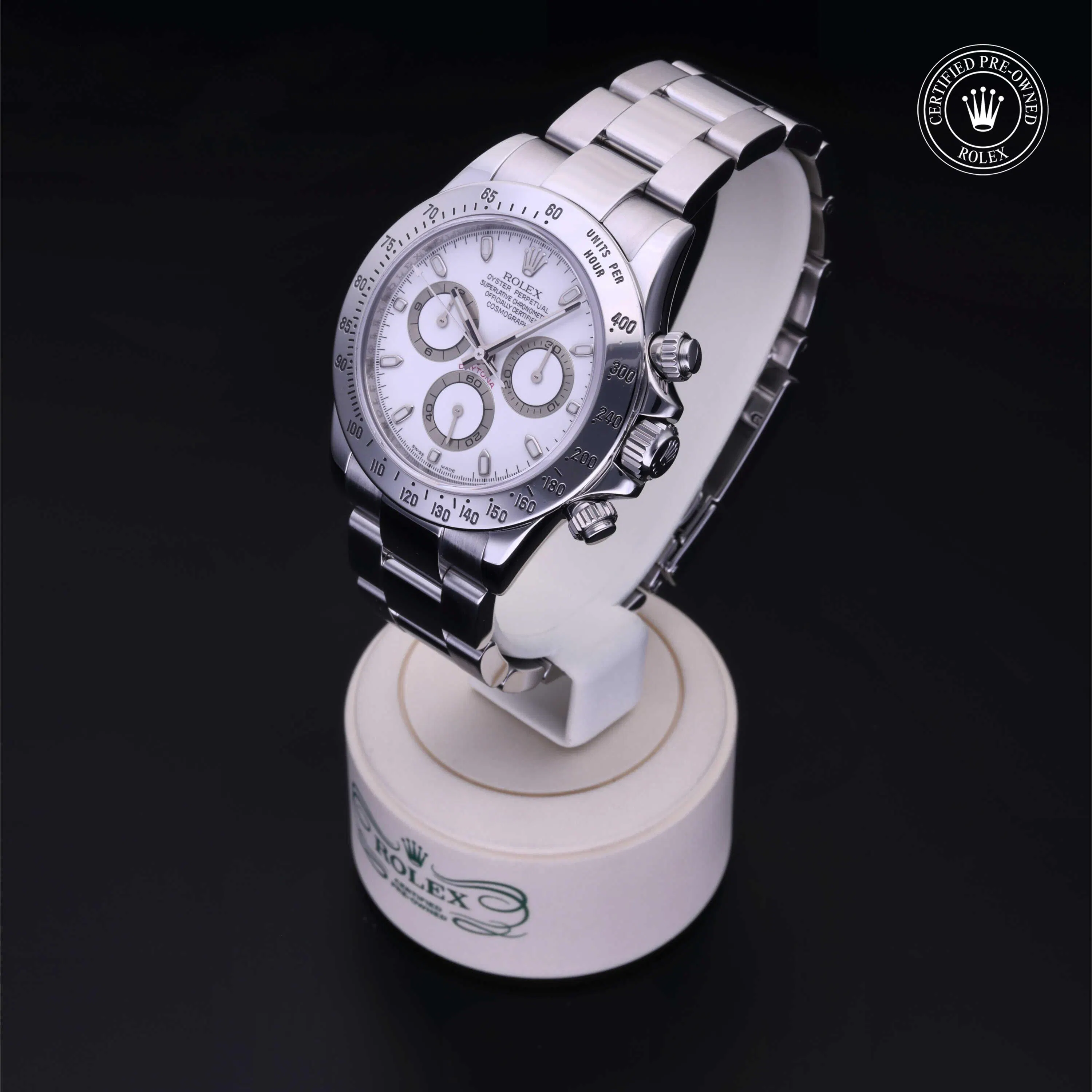 Rolex Certified Pre-Owned Cosmograph Daytona (116520) self - winding automatic watch, features a 40mm stainless steel case and tachymetric scale bezel surrounding a white dial on a stainless steel oyster bracelet. Functions include hours, minutes, seconds and chronograph. This watch has received Rolex-authorized service and certification. It comes with the original box and papers, and includes a custom Rolex Certified Pre-Owned hang tag, travel pouch and RCPO international warranty card.