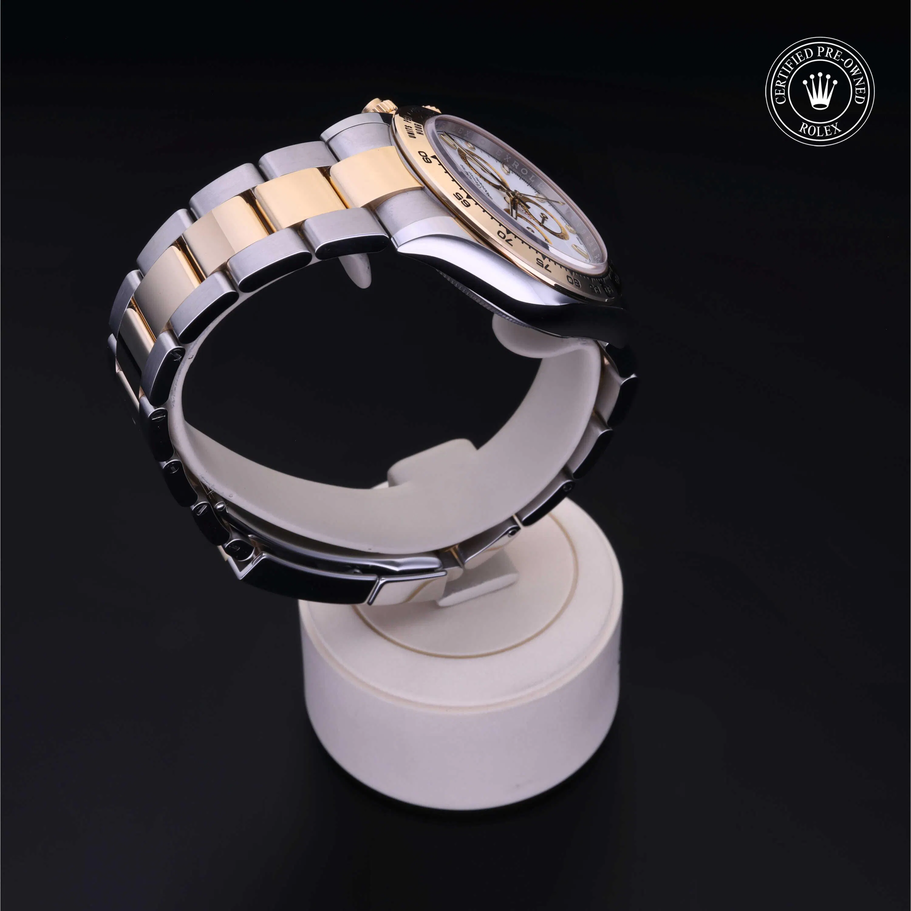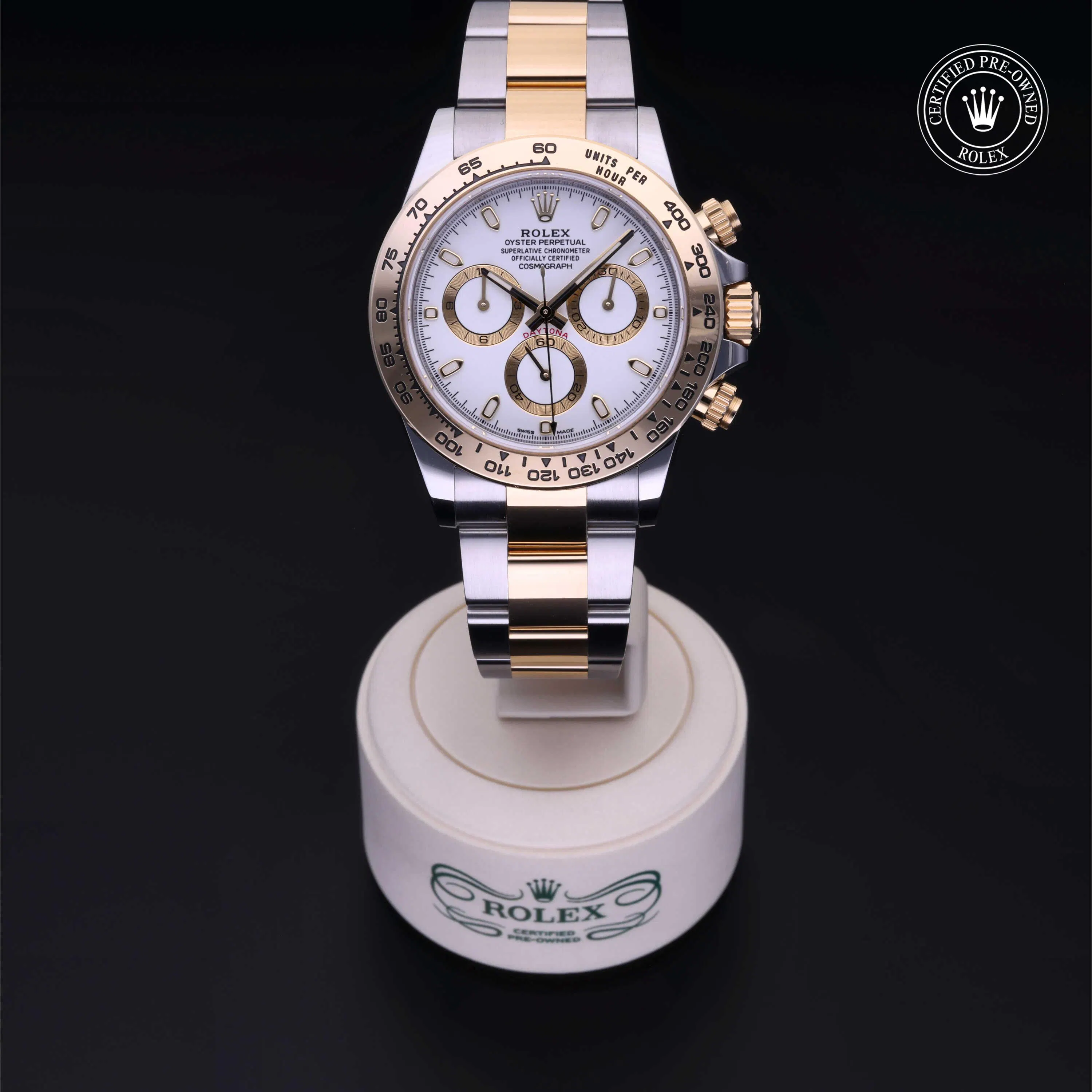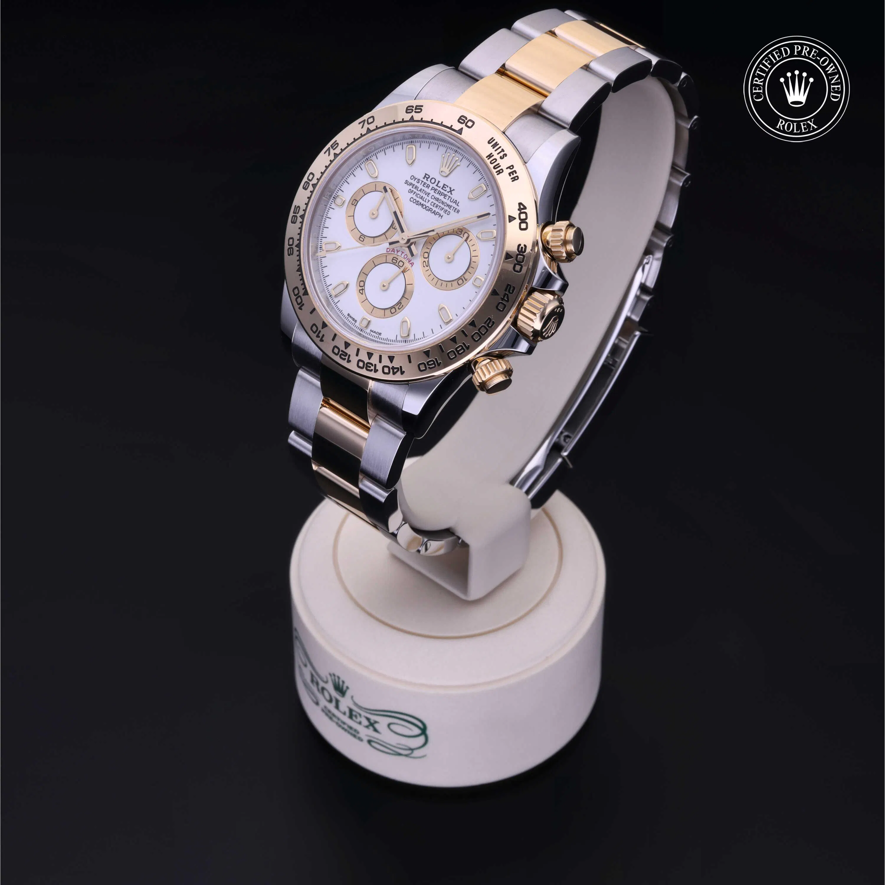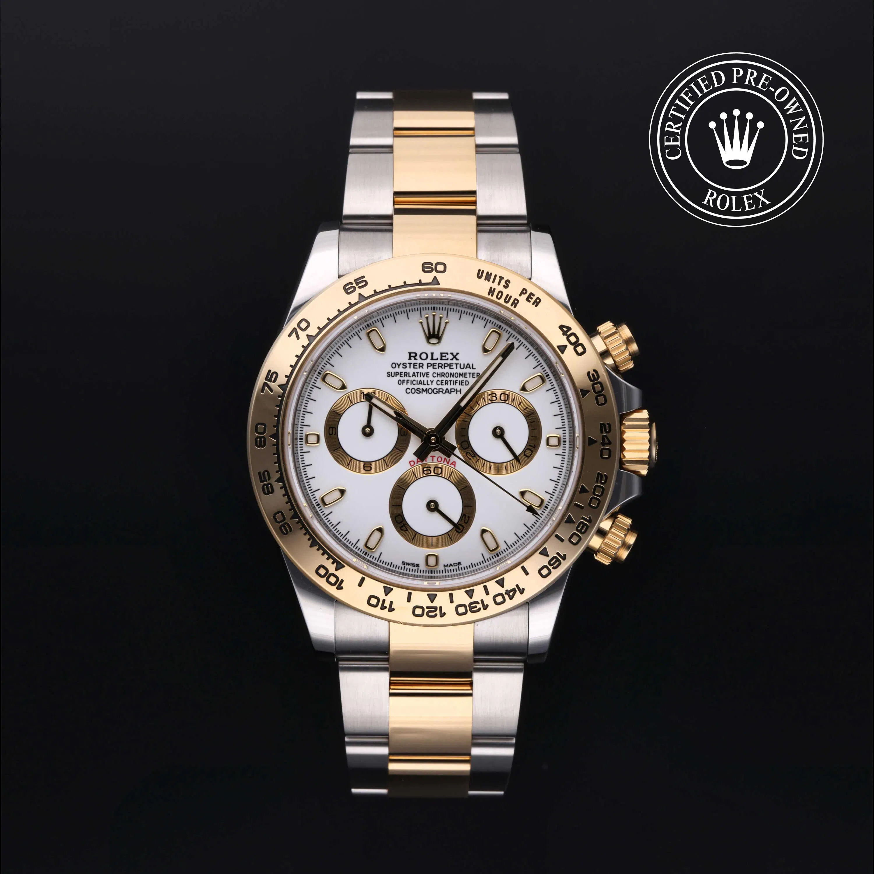 Rolex Certified Pre-Owned Cosmograph Daytona (116503) self - winding automatic watch, features a 40mm stainless steel case with an 18k yellow gold tachymetric scale bezel surrounding a white dial on a stainless steel and 18k yellow gold Oyster bracelet. Functions include hours, minutes, seconds, chronograph and tachymeter. This watch has received Rolex-authorized service and certification. It comes with the original box and papers, and includes a custom Rolex Certified Pre-Owned hang tag, travel pouch and RCPO international warranty card.
