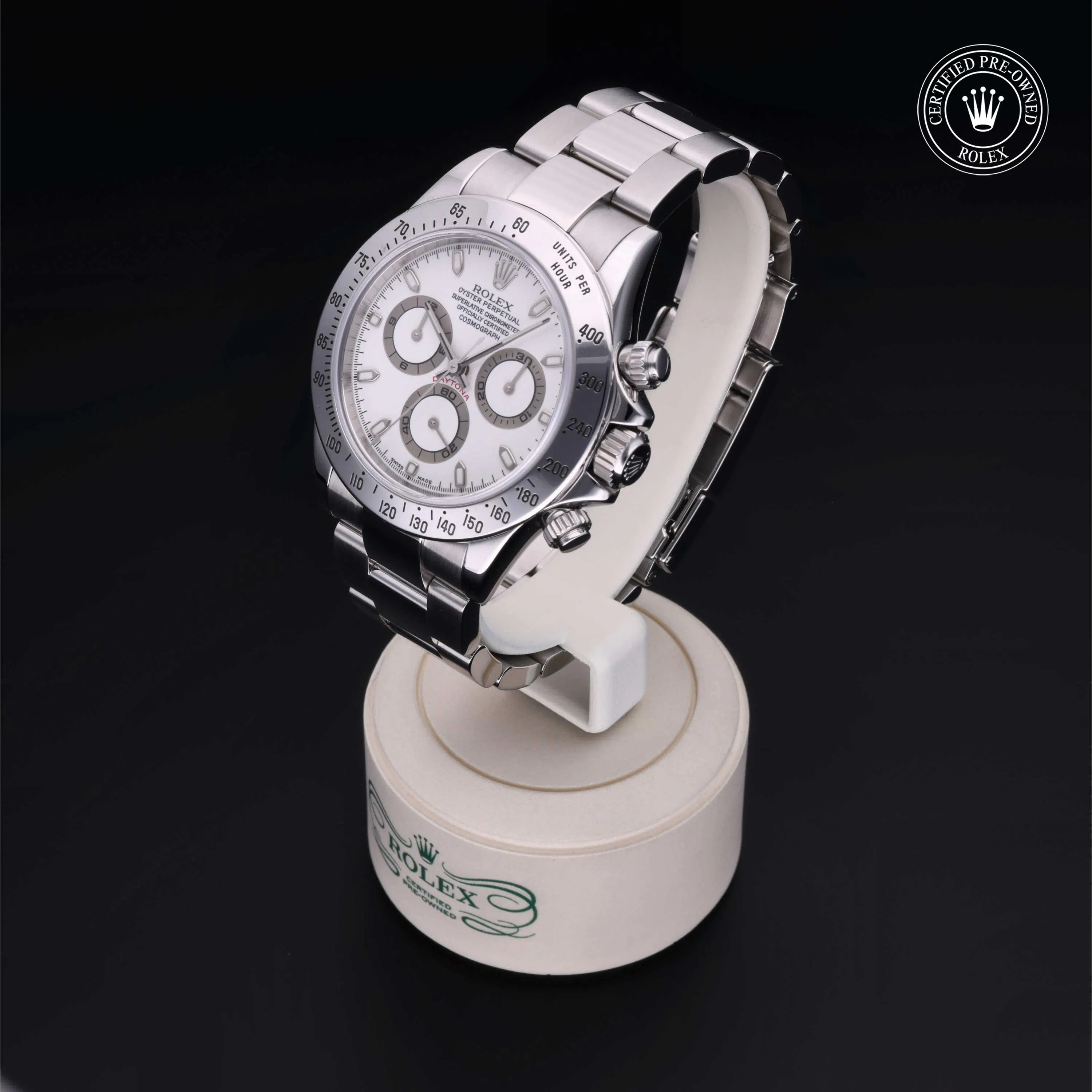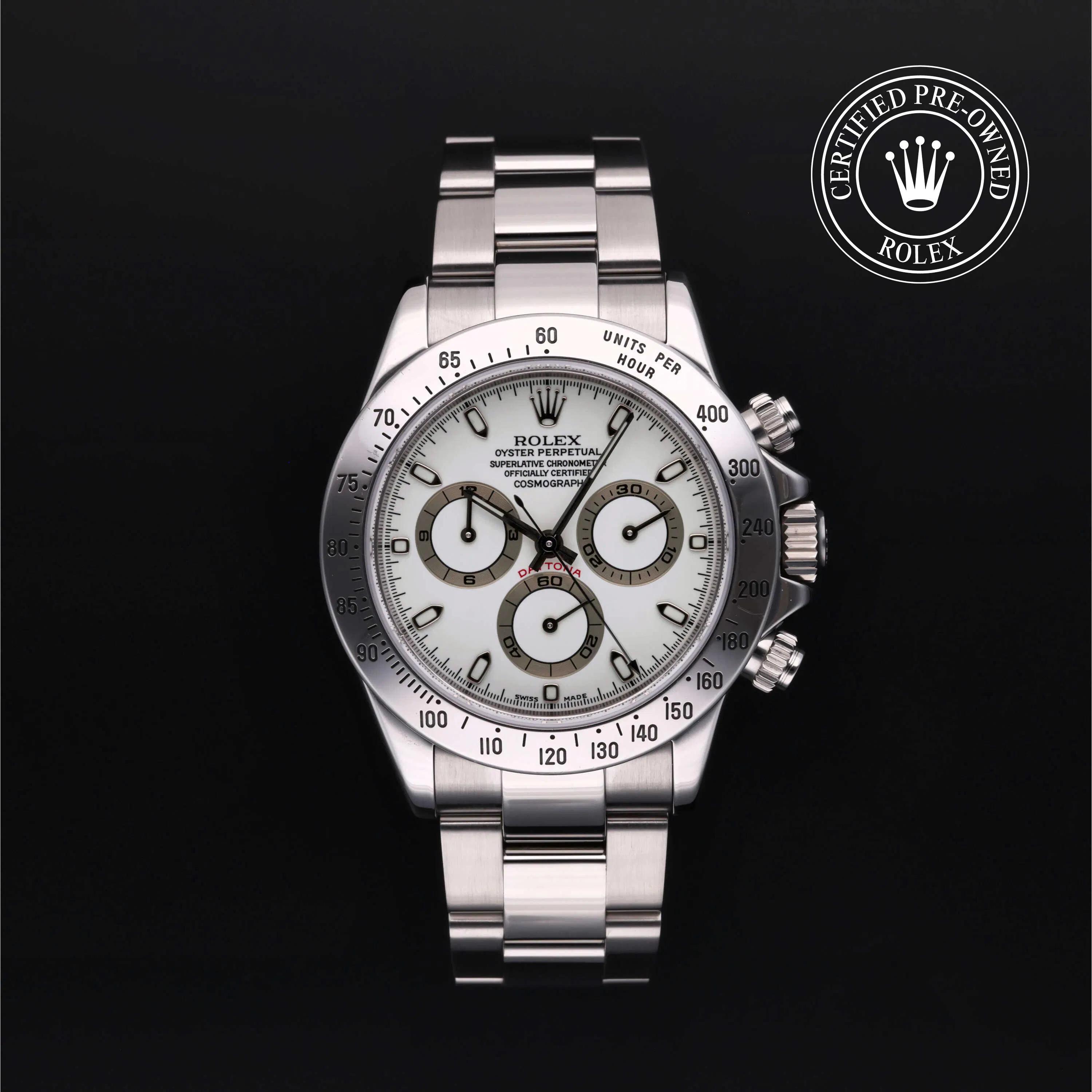 Rolex Certified Pre-Owned Cosmograph Daytona (116520) self - winding automatic watch, features a 40mm stainless steel case and tachymetric scale bezel surrounding a white dial on a stainless steel oyster bracelet. Functions include hours, minutes, seconds and chronograph. This watch has received Rolex-authorized service and certification. It comes with the original box and papers, and includes a custom Rolex Certified Pre-Owned hang tag, travel pouch and RCPO international warranty card.