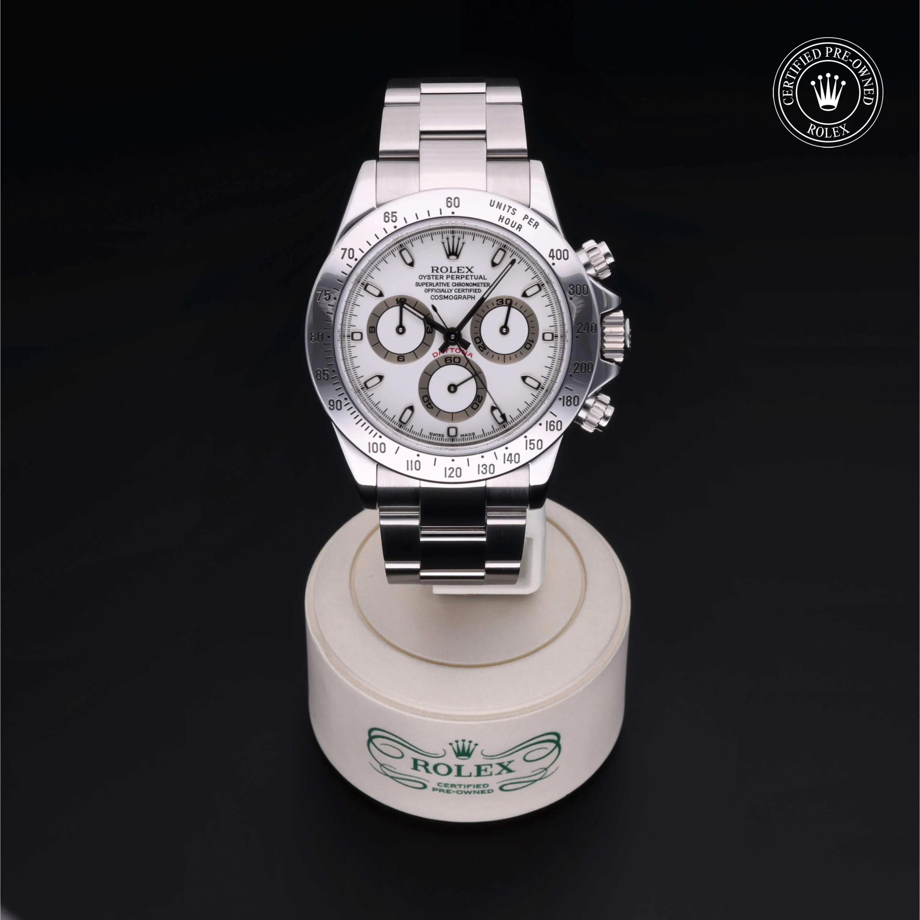 Rolex Certified Pre-Owned Cosmograph Daytona (116520) self - winding automatic watch, features a 40mm stainless steel case and tachymetric scale bezel surrounding a white dial on a stainless steel oyster bracelet. Functions include hours, minutes, seconds and chronograph. This watch has received Rolex-authorized service and certification. It comes with the original box and papers, and includes a custom Rolex Certified Pre-Owned hang tag, travel pouch and RCPO international warranty card.