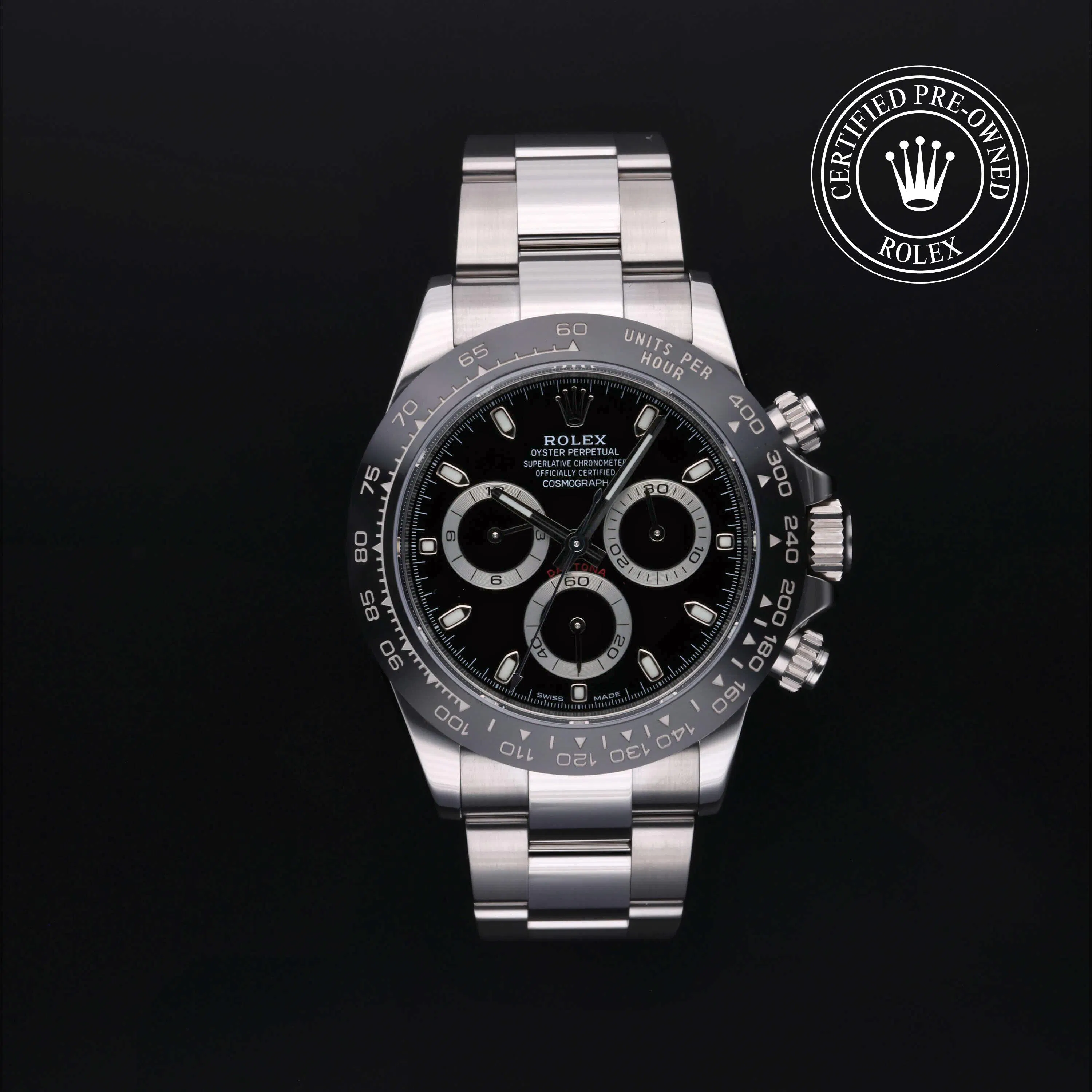 Rolex Certified Pre-Owned Cosmograph Daytona (116500LN) self - winding automatic watch, features a 40mm stainless steel case with a black cerachrom tachymetric scale bezel surrounding a black dial on a stainless steel Oyster bracelet. Functions include hours, minutes, seconds, chronograph and tachymeter. This watch has received Rolex-authorized service and certification. It comes with the original box and papers, and includes a custom Rolex Certified Pre-Owned hang tag, travel pouch and RCPO international warranty card.