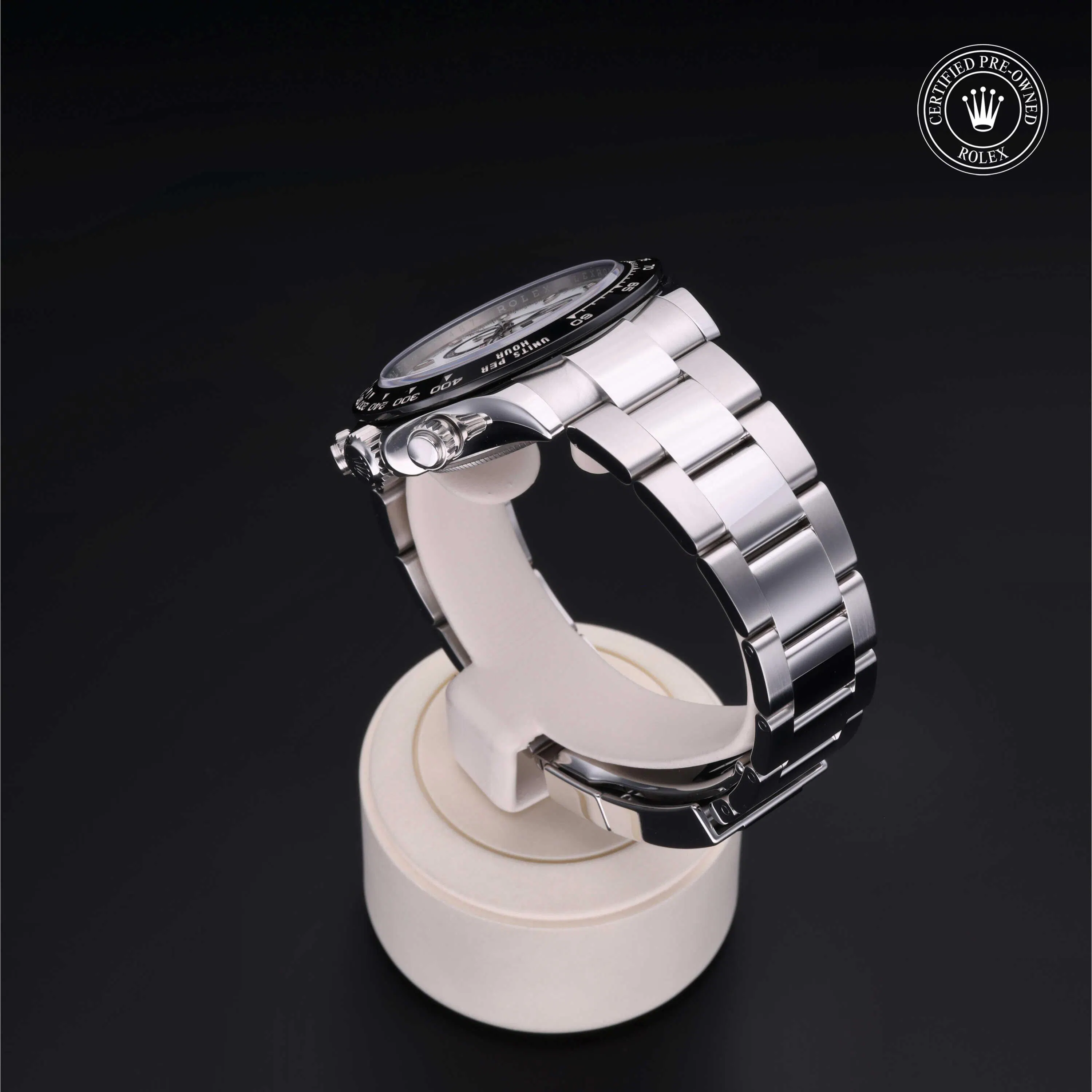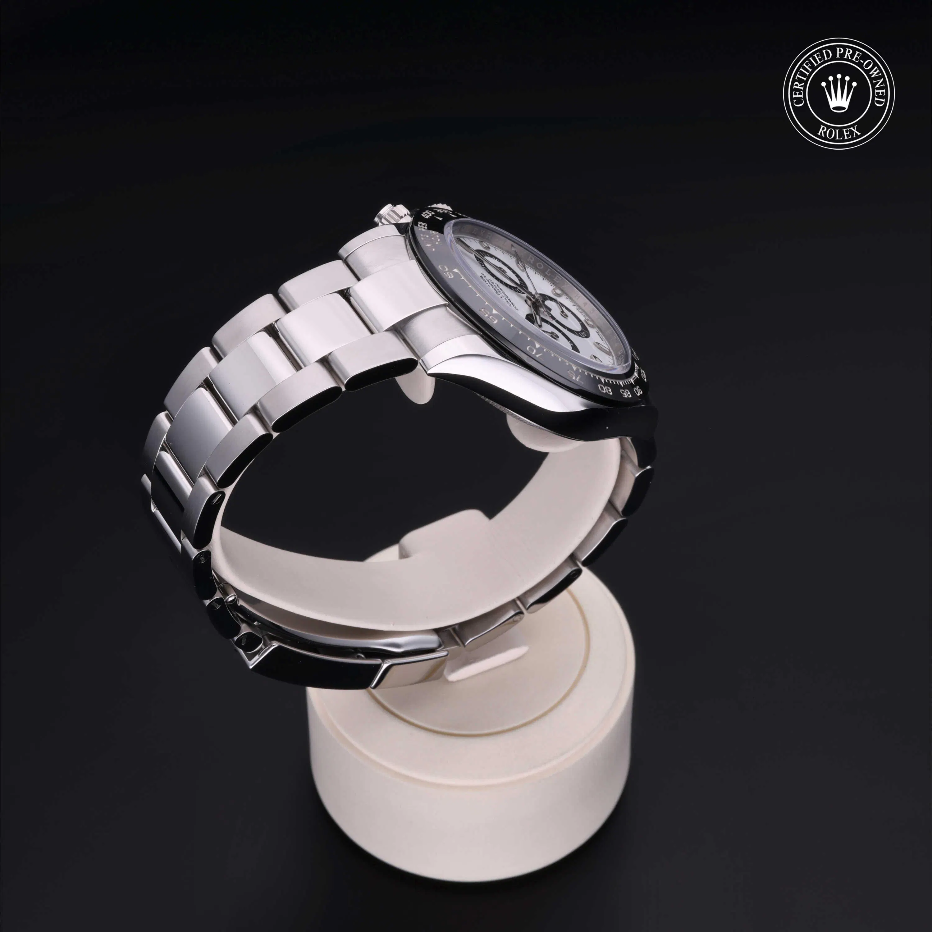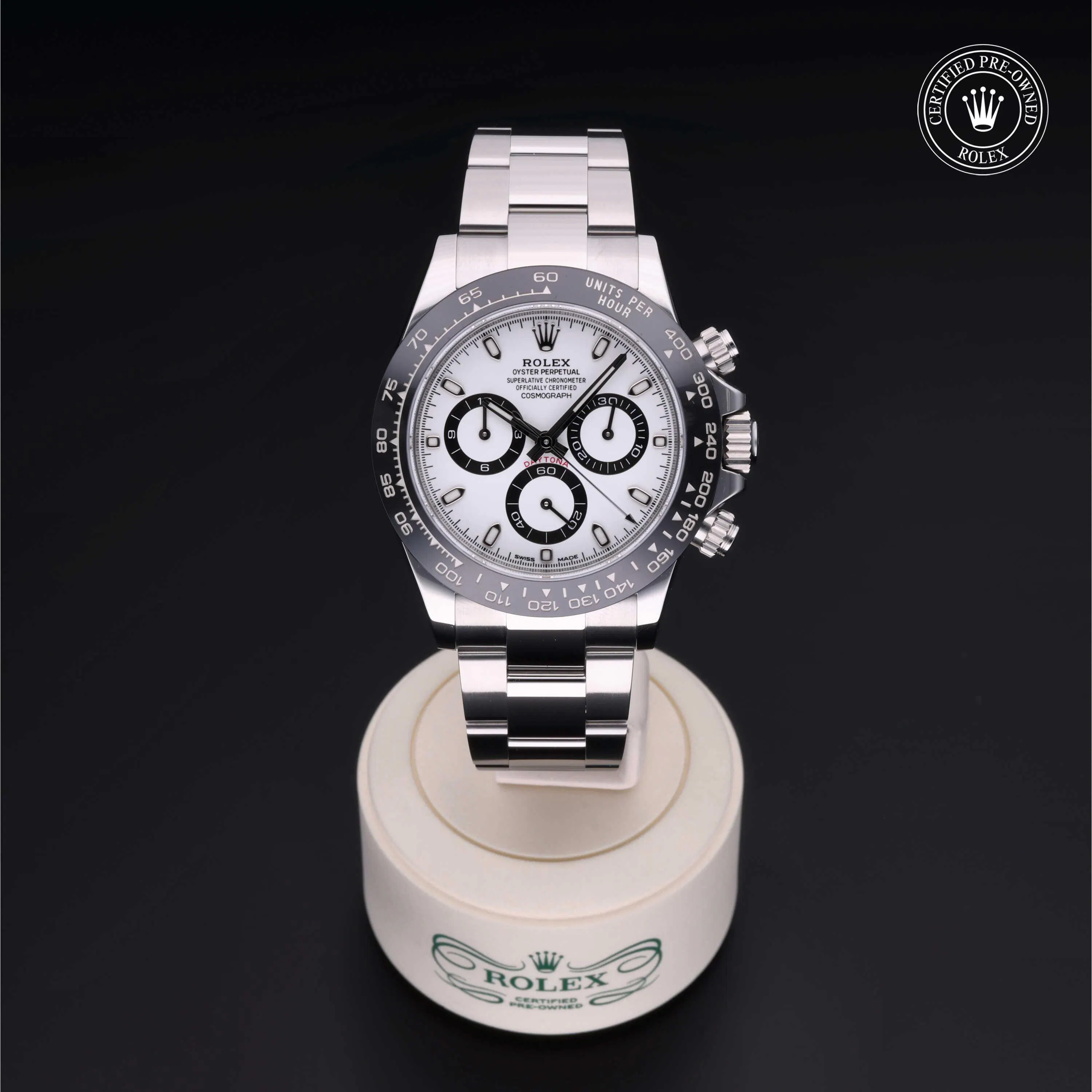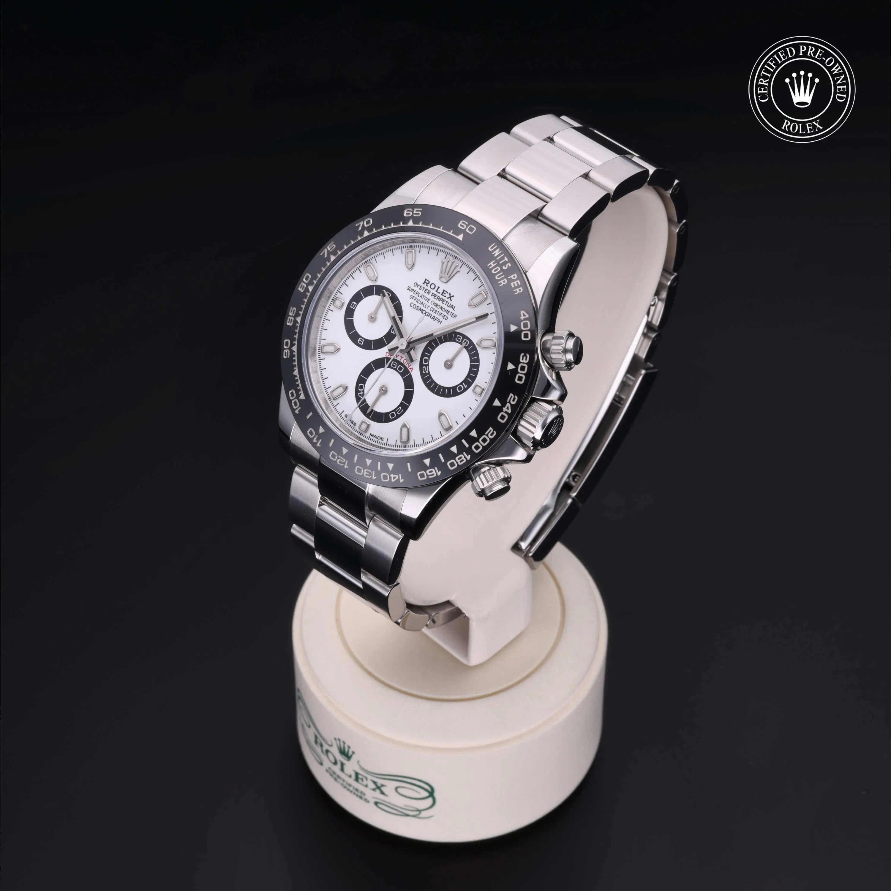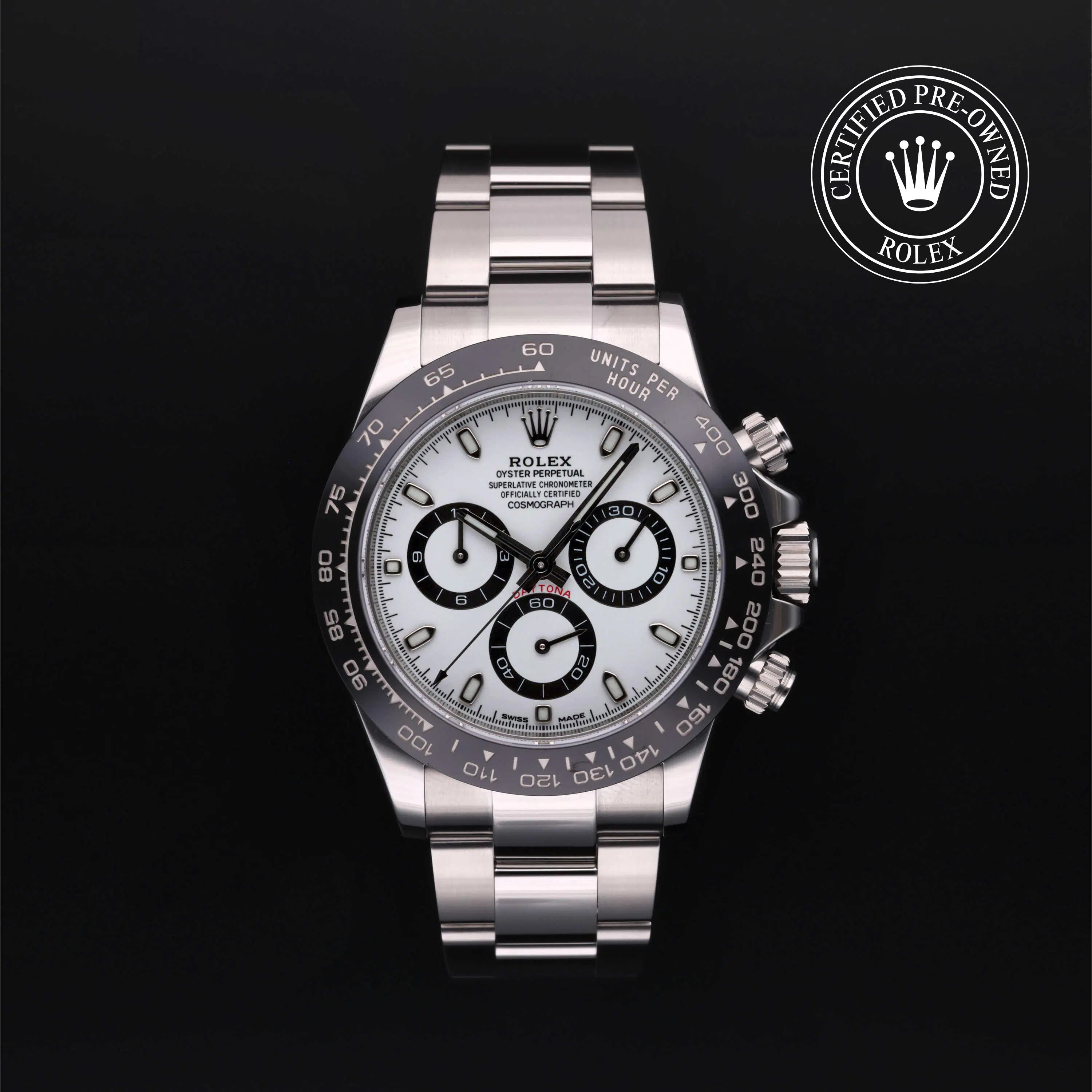 Rolex Certified Pre-Owned Cosmograph Daytona (116500LN) self - winding automatic watch, features a 40mm stainless steel case with a black cerachrom tachymetric scale bezel surrounding a white dial on a stainless steel oyster bracelet. Functions include hours, minutes, seconds and chronograph. This watch has received Rolex-authorized service and certification. It comes with the original papers, and includes a custom Rolex Certified Pre-Owned hang tag, travel pouch and RCPO international warranty card.