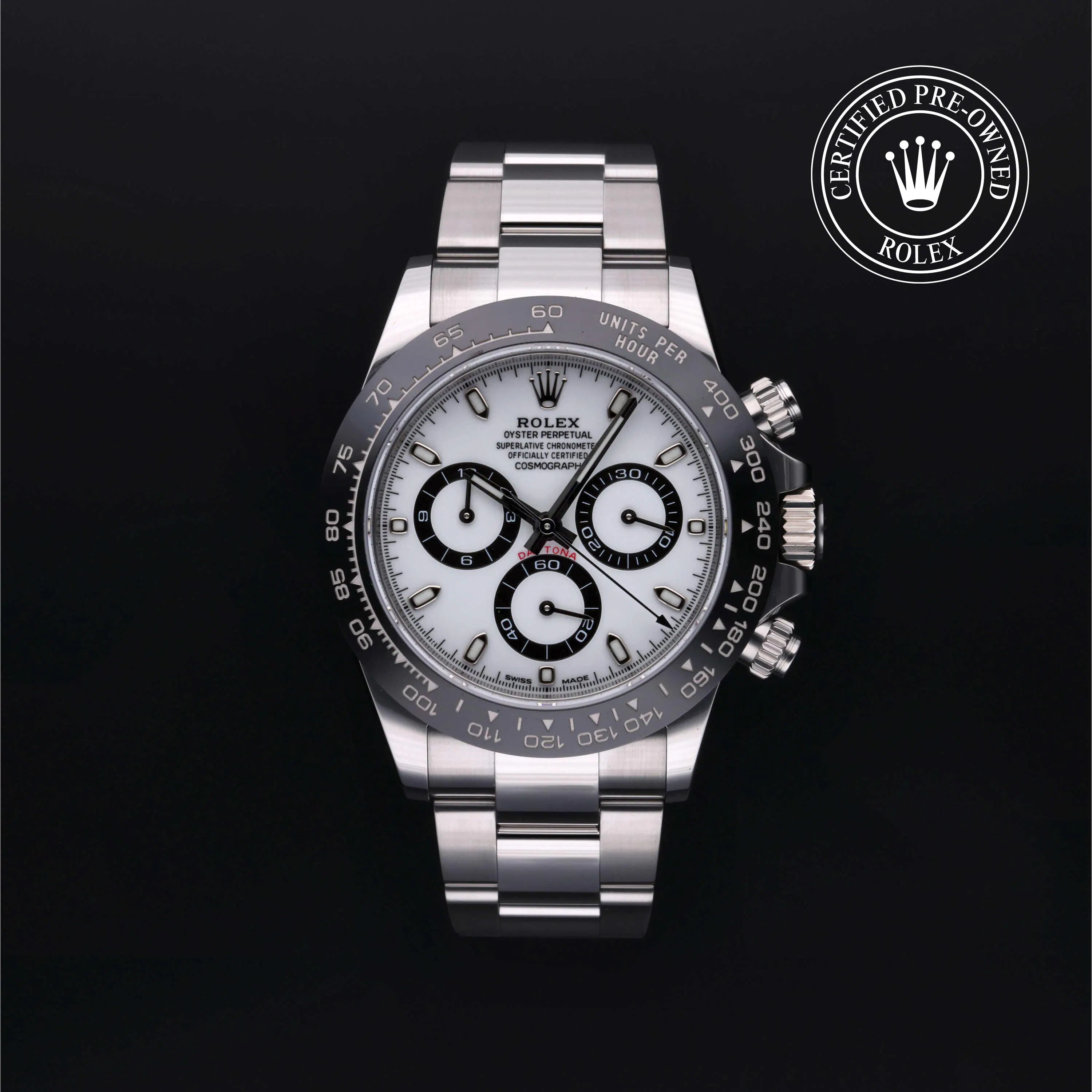 Rolex Certified Pre-Owned Cosmograph Daytona (116500LN) self - winding automatic watch, features a 40mm stainless steel case with a black cerachrom tachymetric scale bezel surrounding a white dial. The watch is secured on a stainless steel Oyster bracelet. Functions include hours, minutes, seconds and chronograph. This watch has received Rolex-authorized service and certification. It comes with the original papers, and includes a custom Rolex Certified Pre-Owned hang tag, travel pouch and RCPO international warranty card.