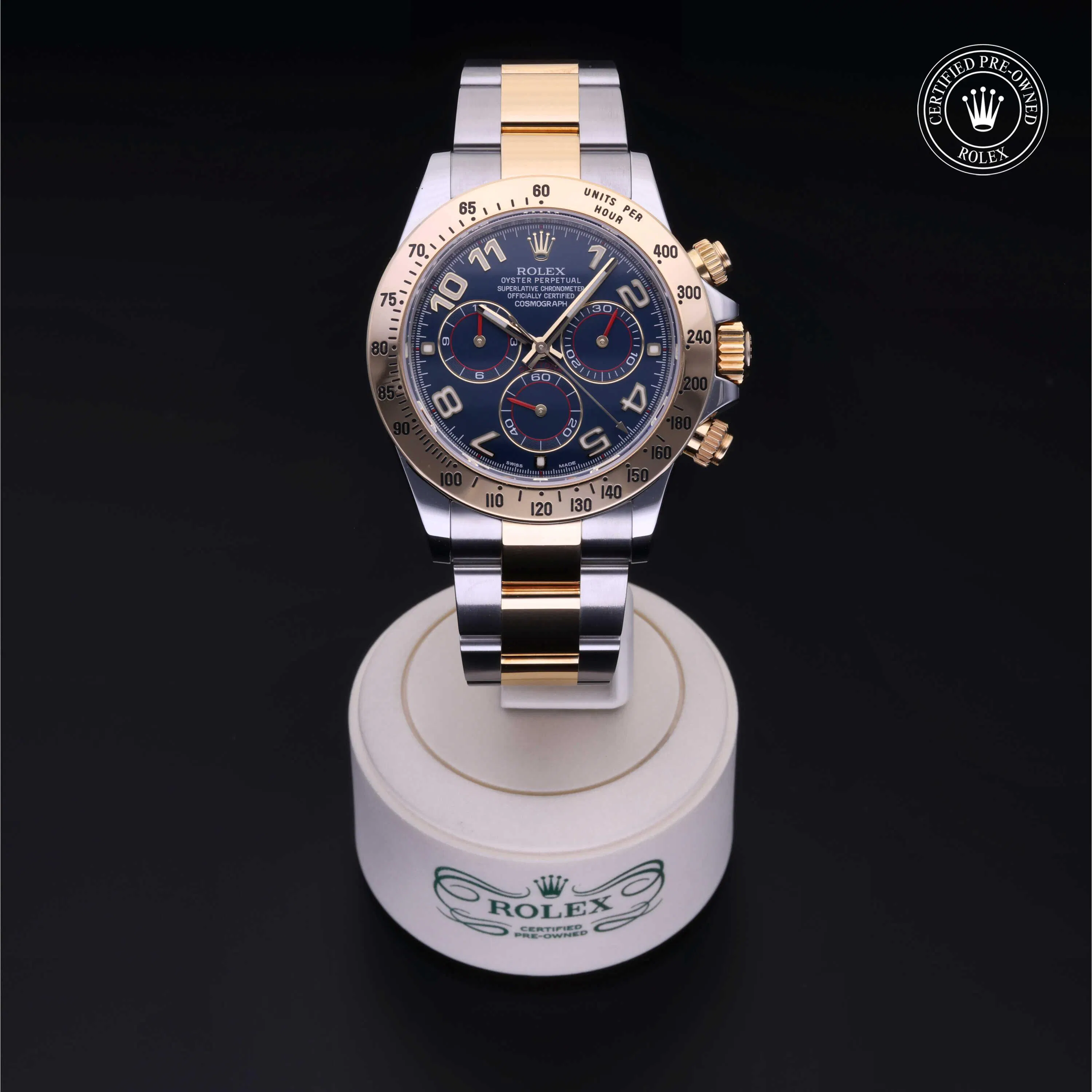 Rolex Certified Pre-Owned Cosmograph Daytona (116523) self - winding automatic watch, features a 40mm stainless steel case with an 18k yellow gold tachymetric scale bezel surrounding a blue dial on a stainless steel and 18k yellow gold oyster bracelet. Functions include hours, minutes, seconds and chronograph. This watch has received Rolex-authorized service and certification. It does not come with the original box or papers, but includes a custom Rolex Certified Pre-Owned hang tag, travel pouch and RCPO international warranty card.