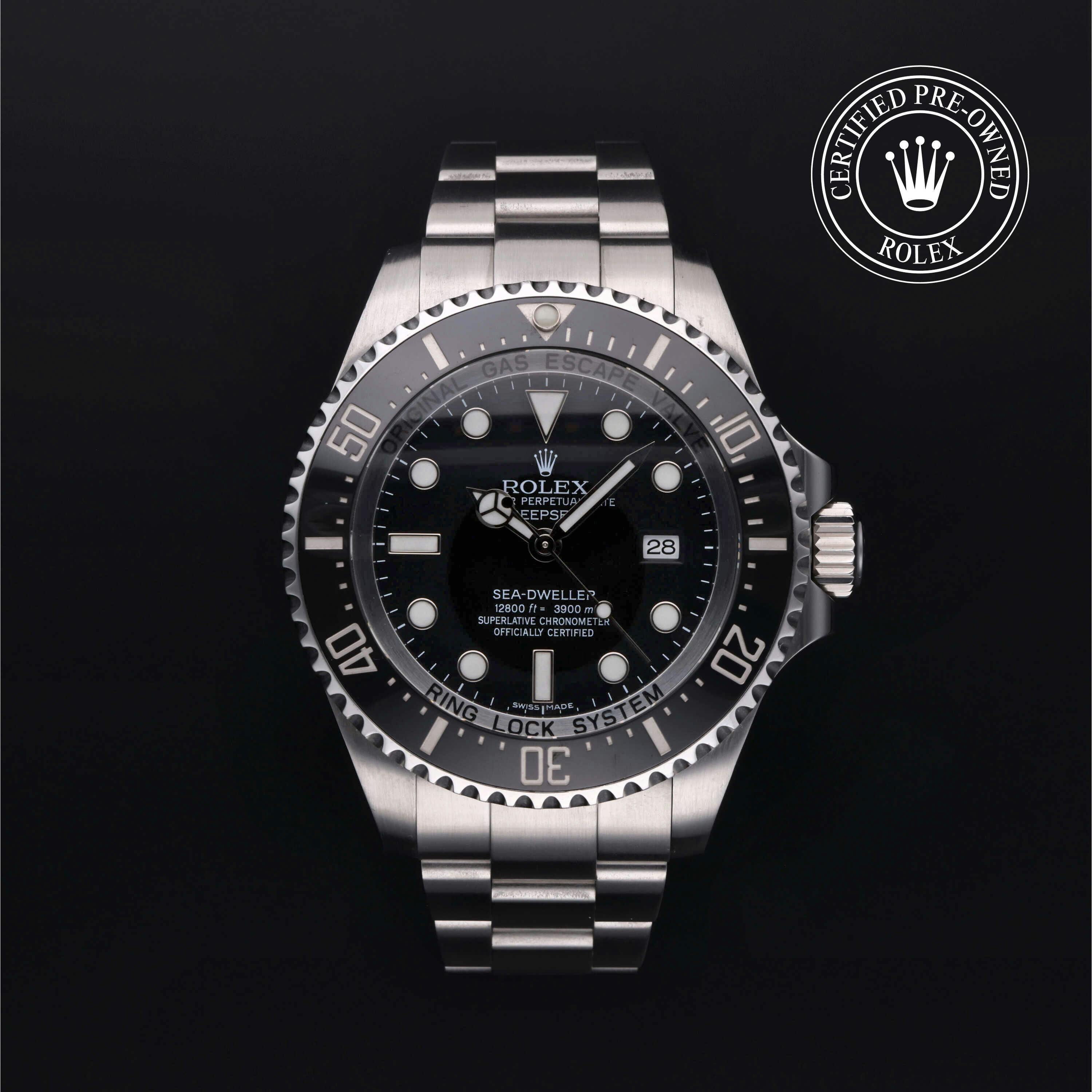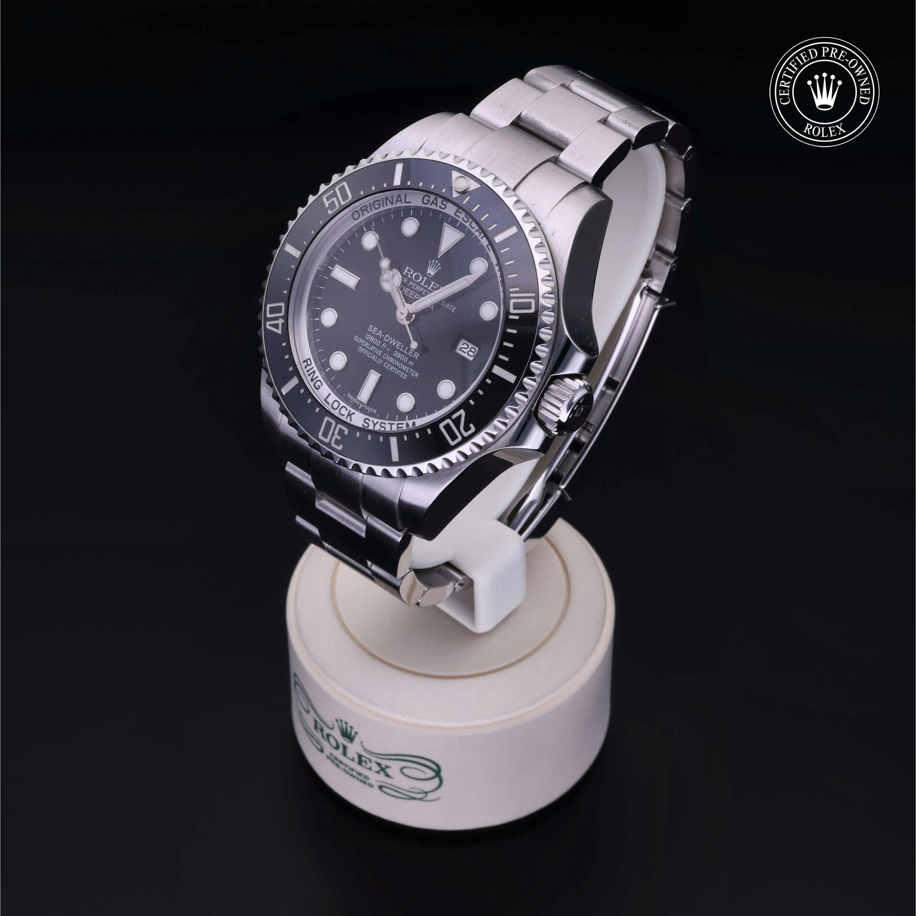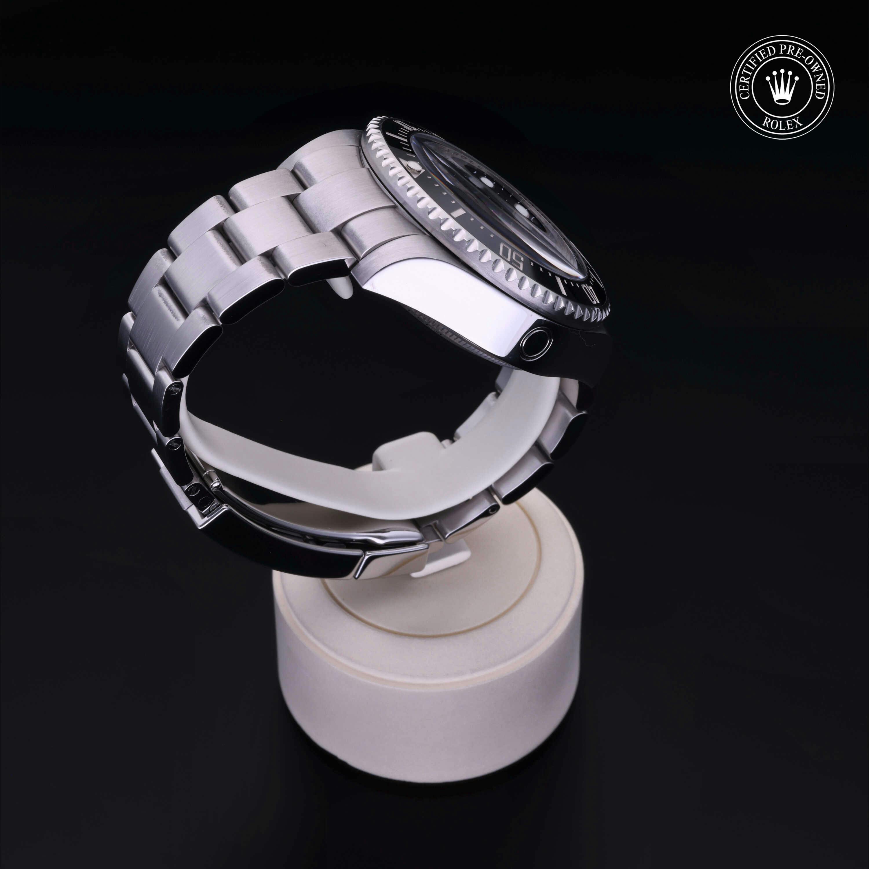 Rolex Certified Pre-Owned Sea-Dweller Deepsea (116660) self - winding automatic watch, features a 44mm stainless steel case with a black cerachrom bezel surrounding a black dial on a stainless steel oyster bracelet. Functions include hours, minutes, seconds, date and helium release valve. This watch has received Rolex-authorized service and certification. It does not come with the original box or papers, but includes a custom Rolex Certified Pre-Owned hang tag, travel pouch and RCPO international warranty card.