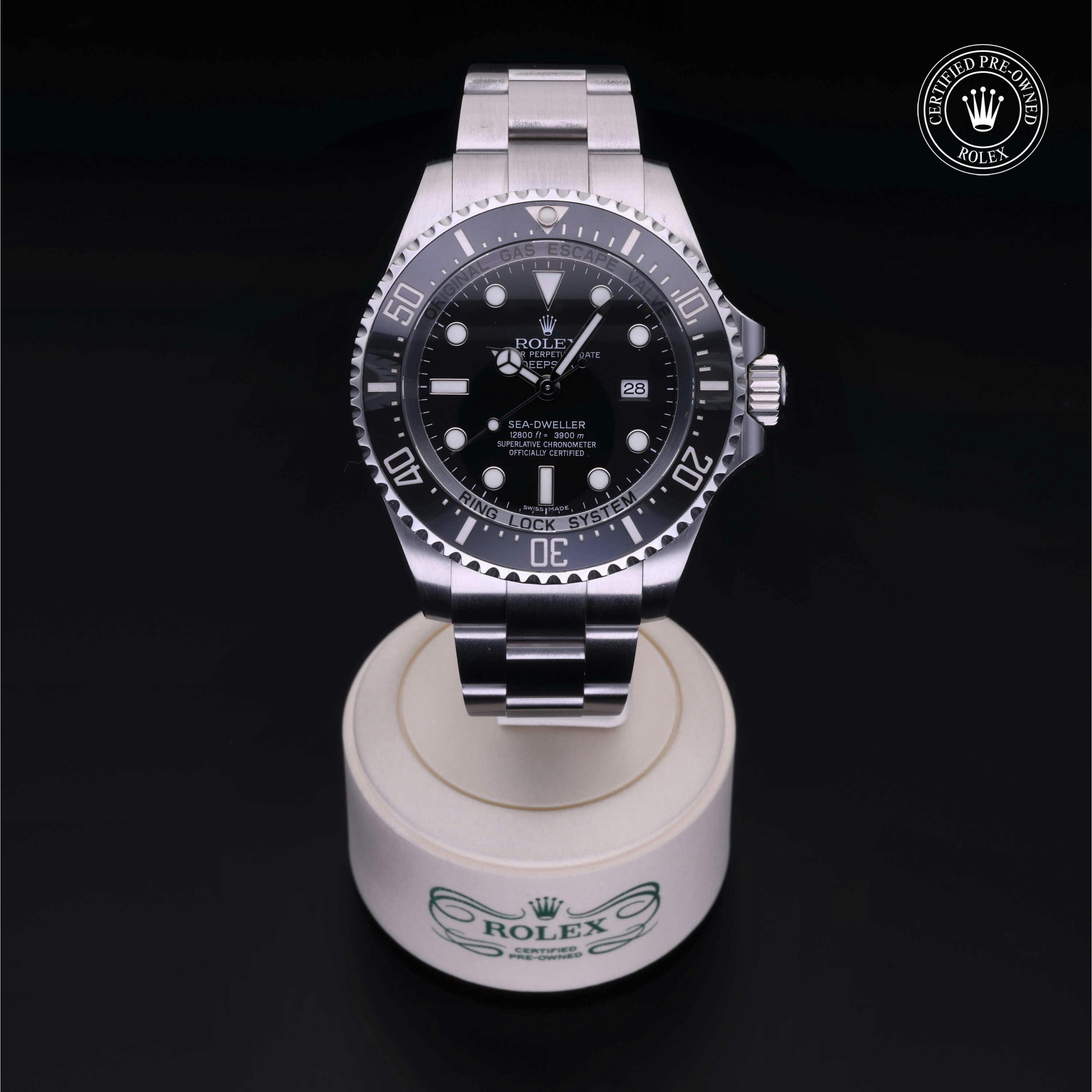 Rolex Certified Pre-Owned Sea-Dweller Deepsea (116660) self - winding automatic watch, features a 44mm stainless steel case with a black cerachrom bezel surrounding a black dial on a stainless steel oyster bracelet. Functions include hours, minutes, seconds, date and helium release valve. This watch has received Rolex-authorized service and certification. It does not come with the original box or papers, but includes a custom Rolex Certified Pre-Owned hang tag, travel pouch and RCPO international warranty card.