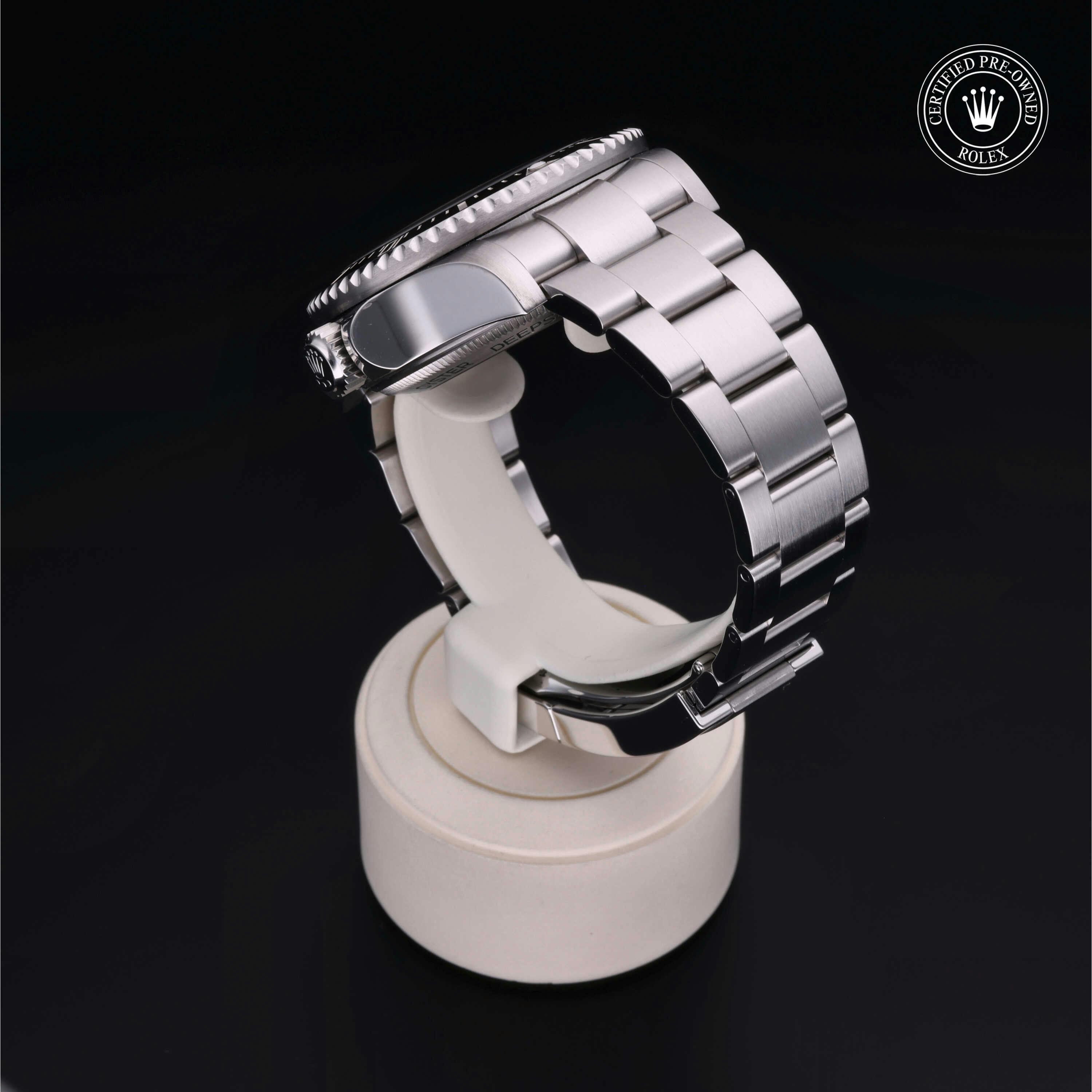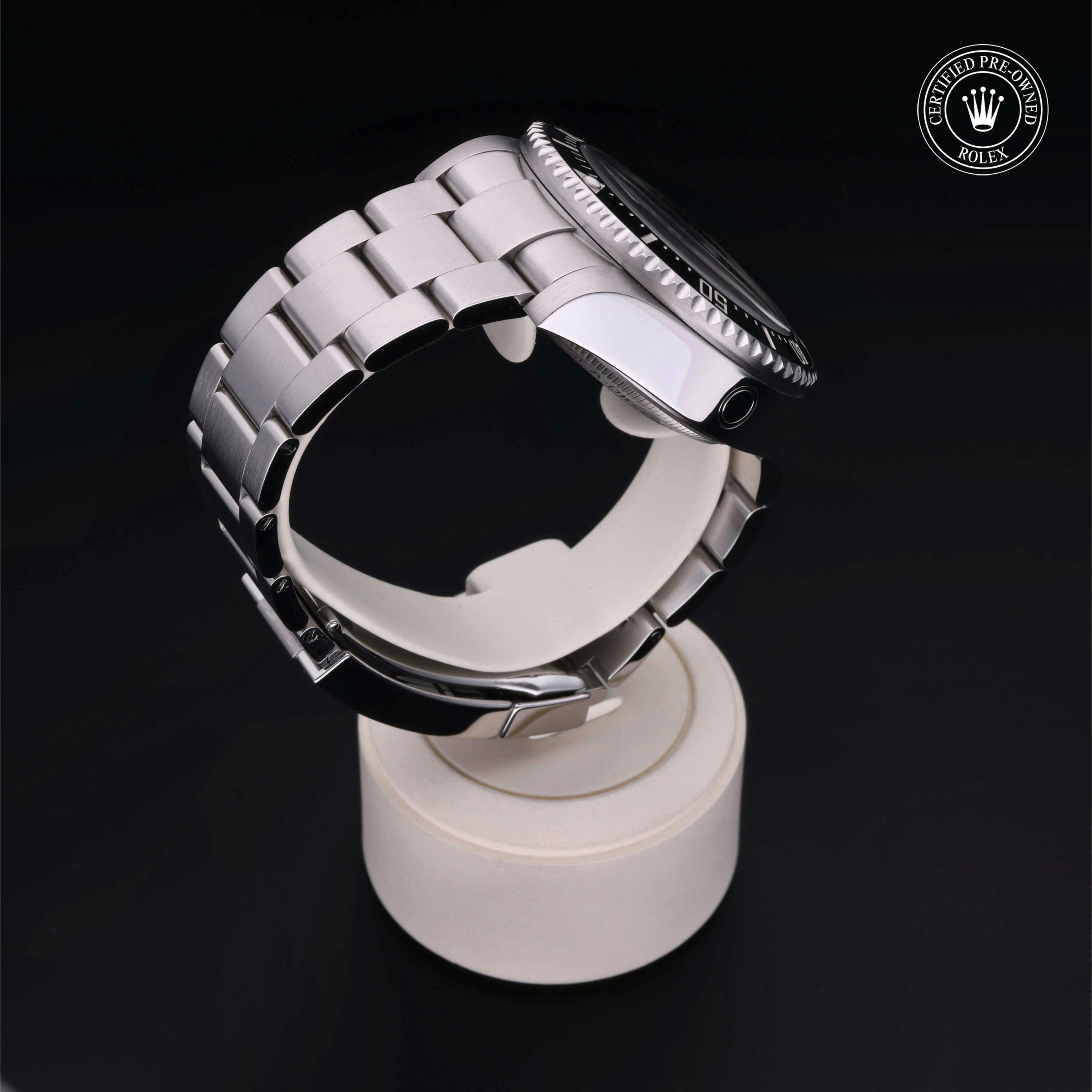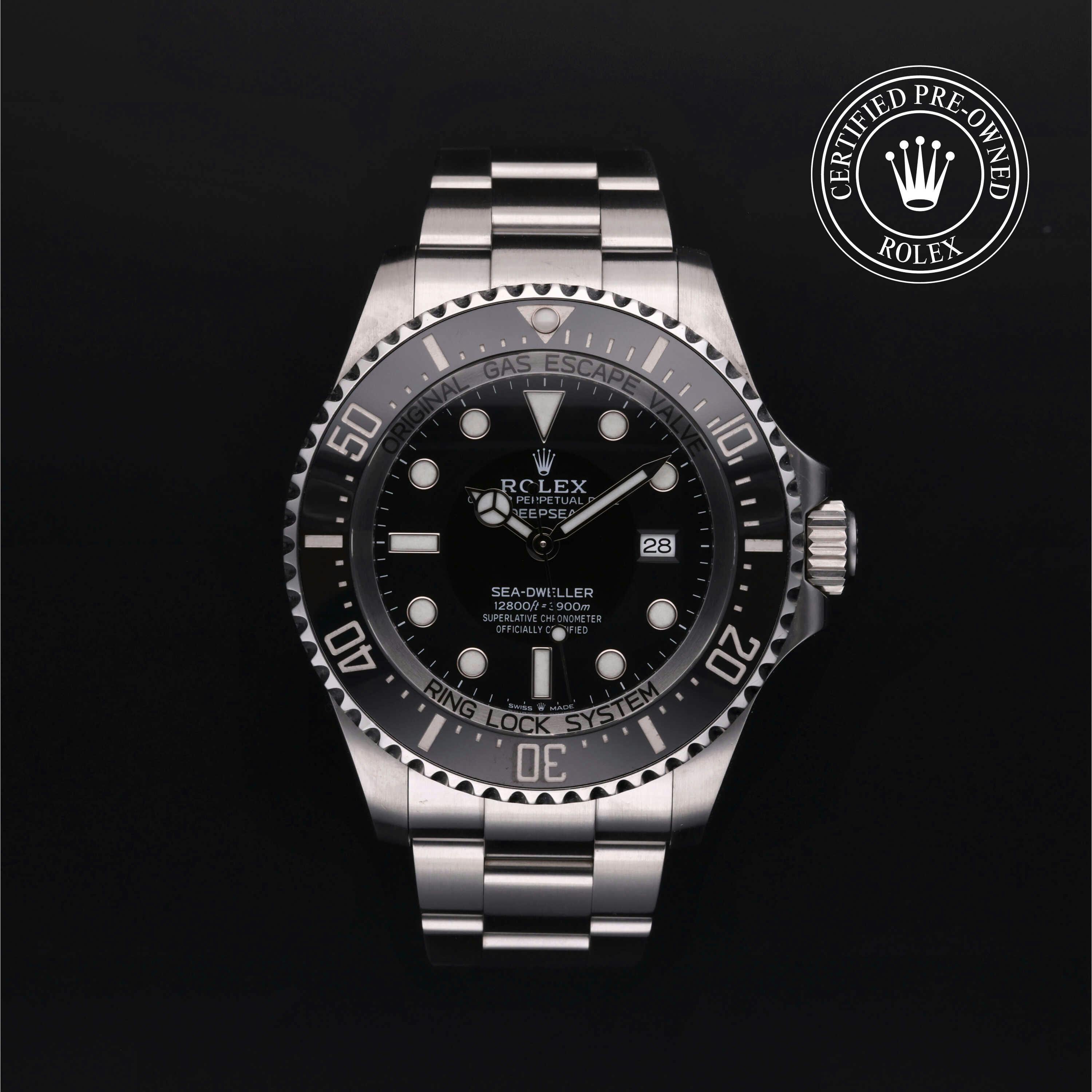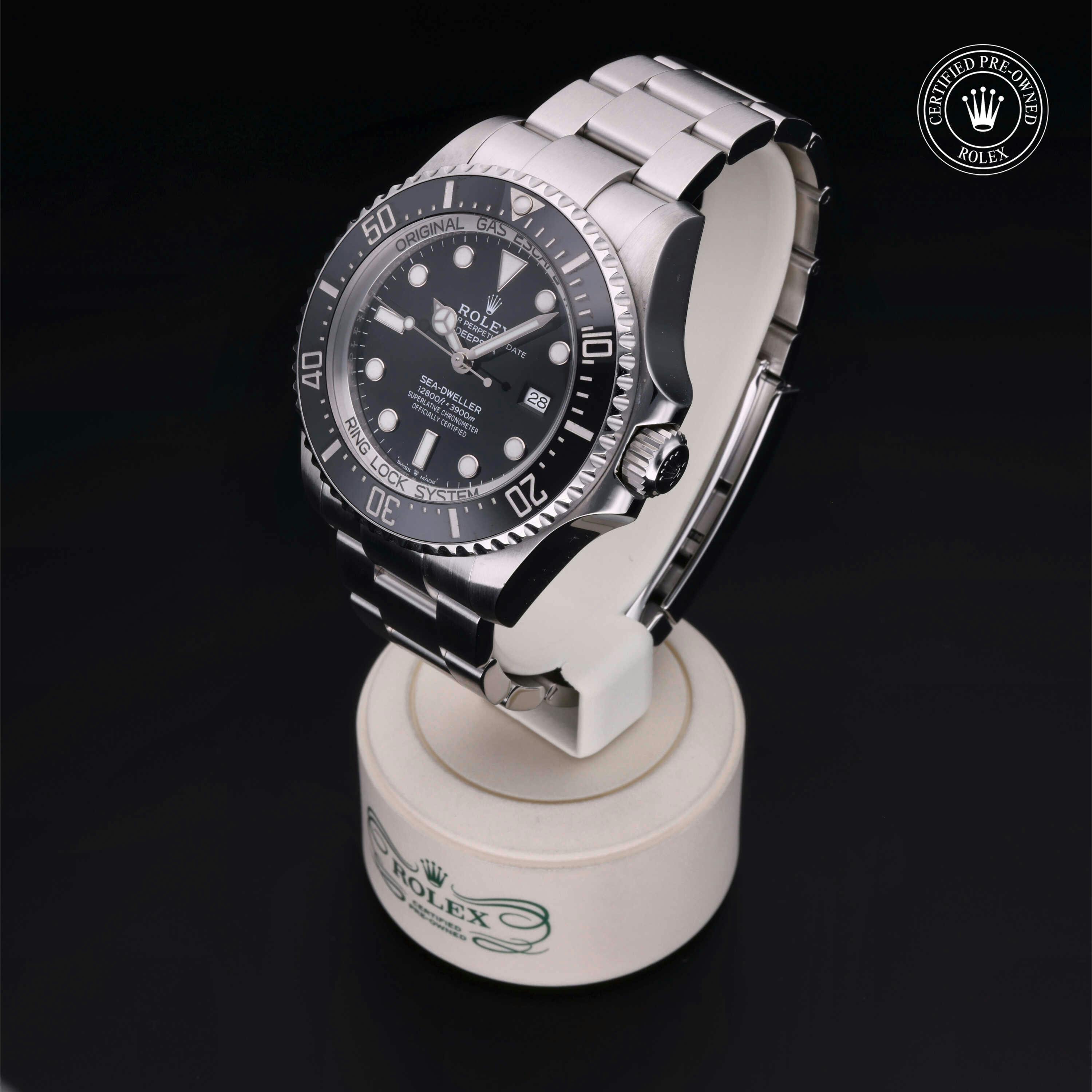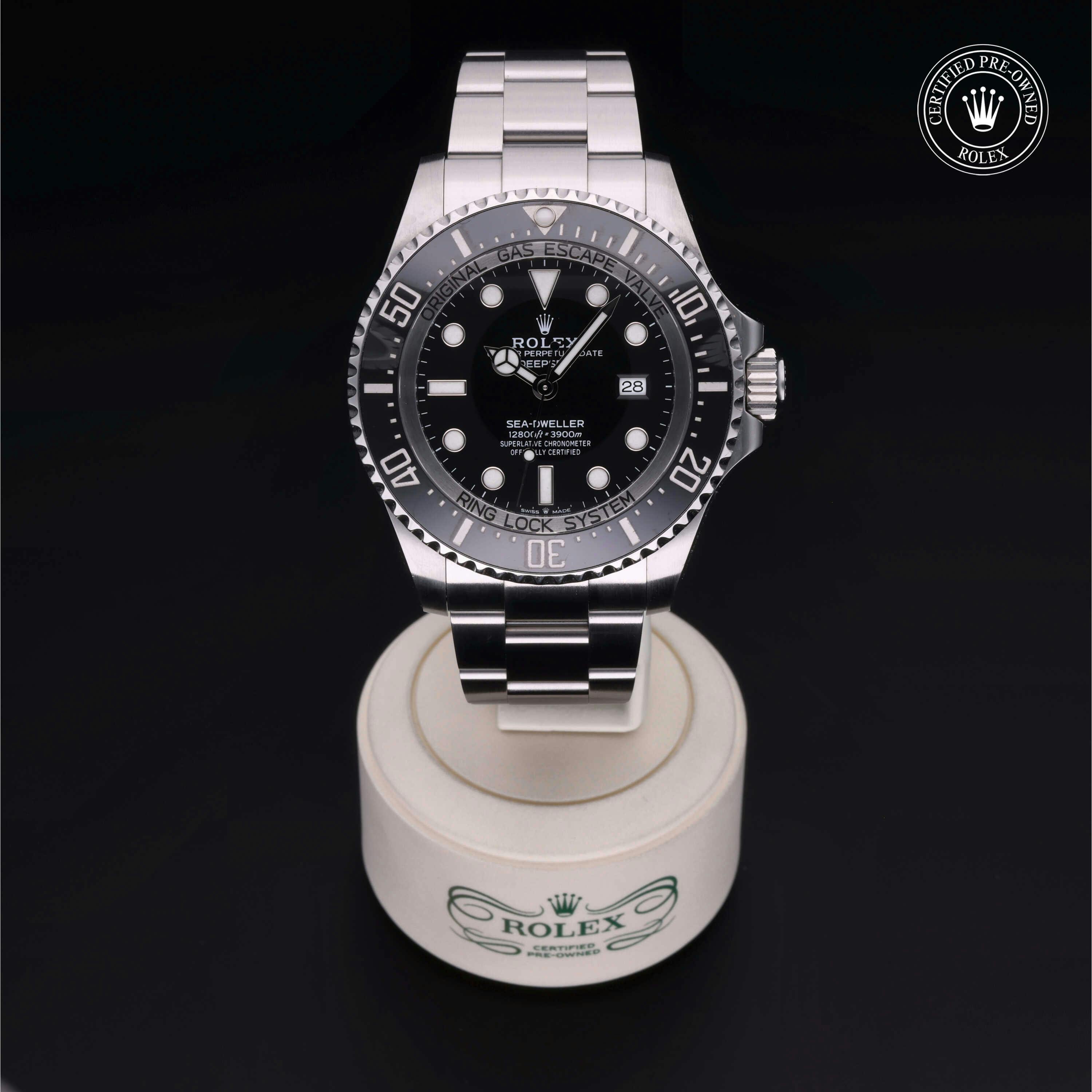 Rolex Certified Pre-Owned Sea-Dweller Deepsea (126660) self - winding automatic watch, features a 44mm stainless steel case with a black cerachrom bezel surrounding a black dial on a stainless steel oyster bracelet. Functions include hours, minutes, seconds, date and helium release valve. This watch has received Rolex-authorized service and certification. It comes with the original box and papers, and includes a custom Rolex Certified Pre-Owned hang tag, travel pouch and RCPO international warranty card.