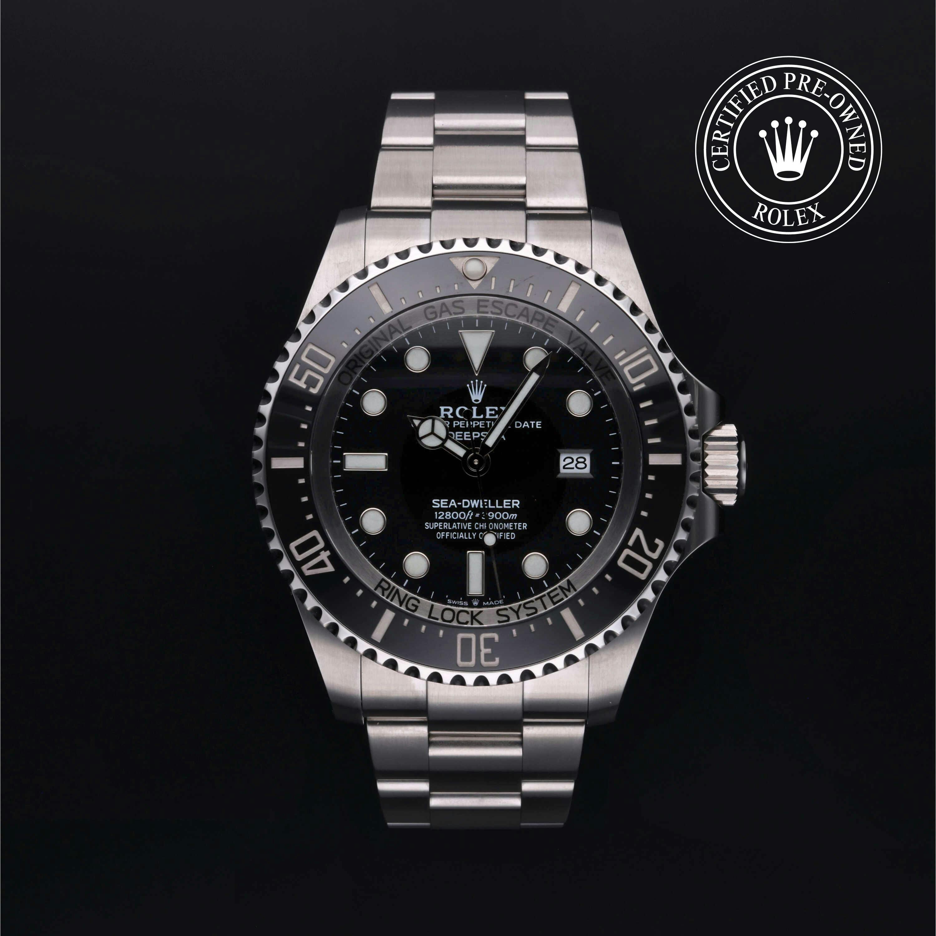 Rolex Certified Pre-Owned Sea-Dweller Deepsea (126660) self - winding automatic watch, features a 44mm stainless steel case with a black cerachrom bezel insert surrounding a black dial on a stainless steel oyster bracelet. Functions include hours, minutes, seconds, date and helium release valve. This watch has received Rolex-authorized service and certification. It does not come with the original box or papers, but includes a custom Rolex Certified Pre-Owned hang tag, travel pouch and RCPO international warranty card.