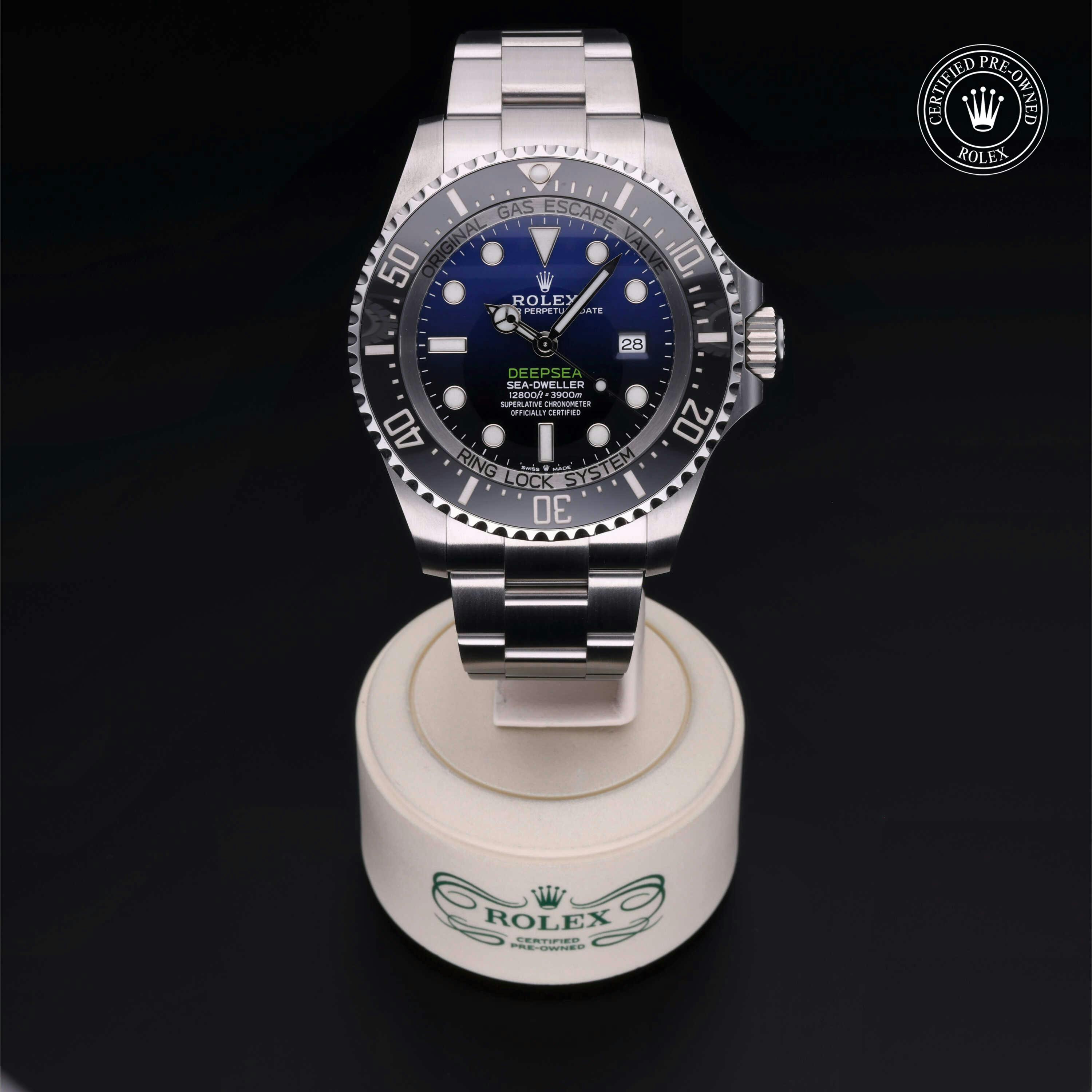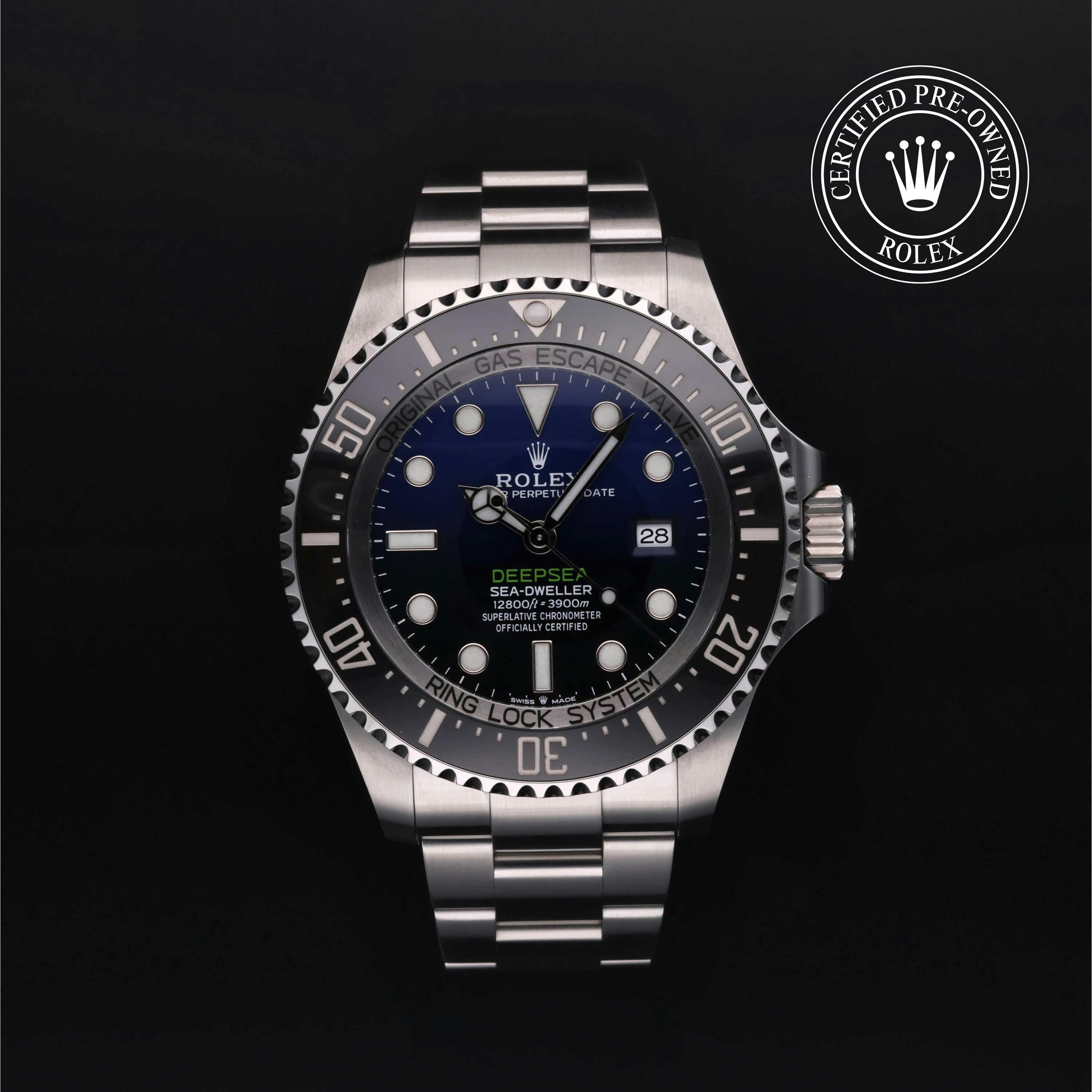 Rolex Certified Pre-Owned Sea-Dweller Deepsea "Deep Blue" (126660) self - winding automatic watch, features a 44mm stainless steel case with a black cerachrom bezel insert surrounding a blue to black gradient dial on a stainless steel oyster bracelet. Functions include hours, minutes, seconds, date and helium release valve. This watch has received Rolex-authorized service and certification. It comes with the original papers, and includes a custom Rolex Certified Pre-Owned hang tag, travel pouch and RCPO international warranty card.
