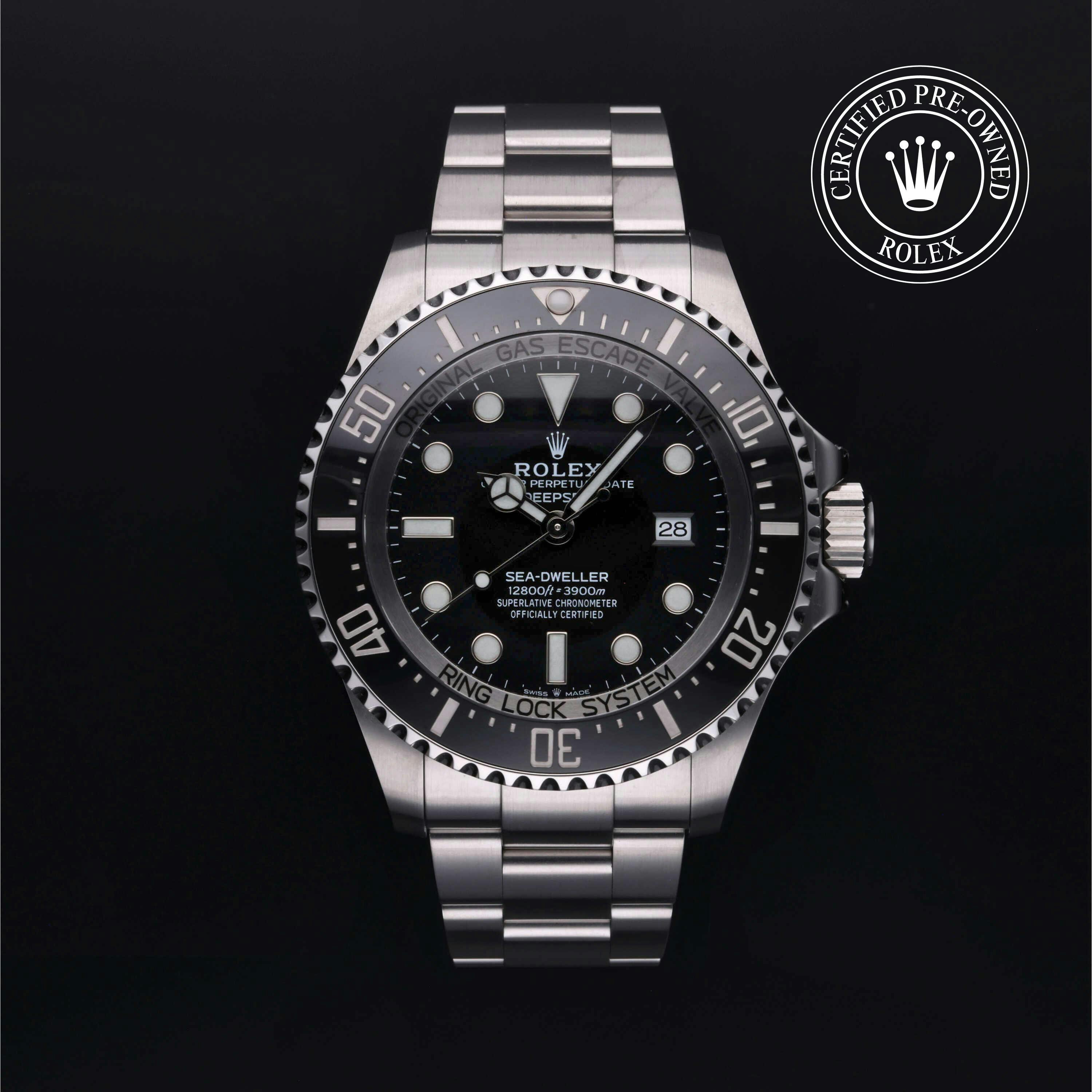Rolex Certified Pre-Owned Sea-Dweller Deepsea (126660) self - winding automatic watch, features a 44mm stainless steel case with a black cerachrom bezel insert surrounding a black dial on a stainless steel oyster bracelet. Functions include hours, minutes, seconds, date and helium release valve. This watch has received Rolex-authorized service and certification. It comes with the original box and papers, and includes a custom Rolex Certified Pre-Owned hang tag, travel pouch and RCPO international warranty card.