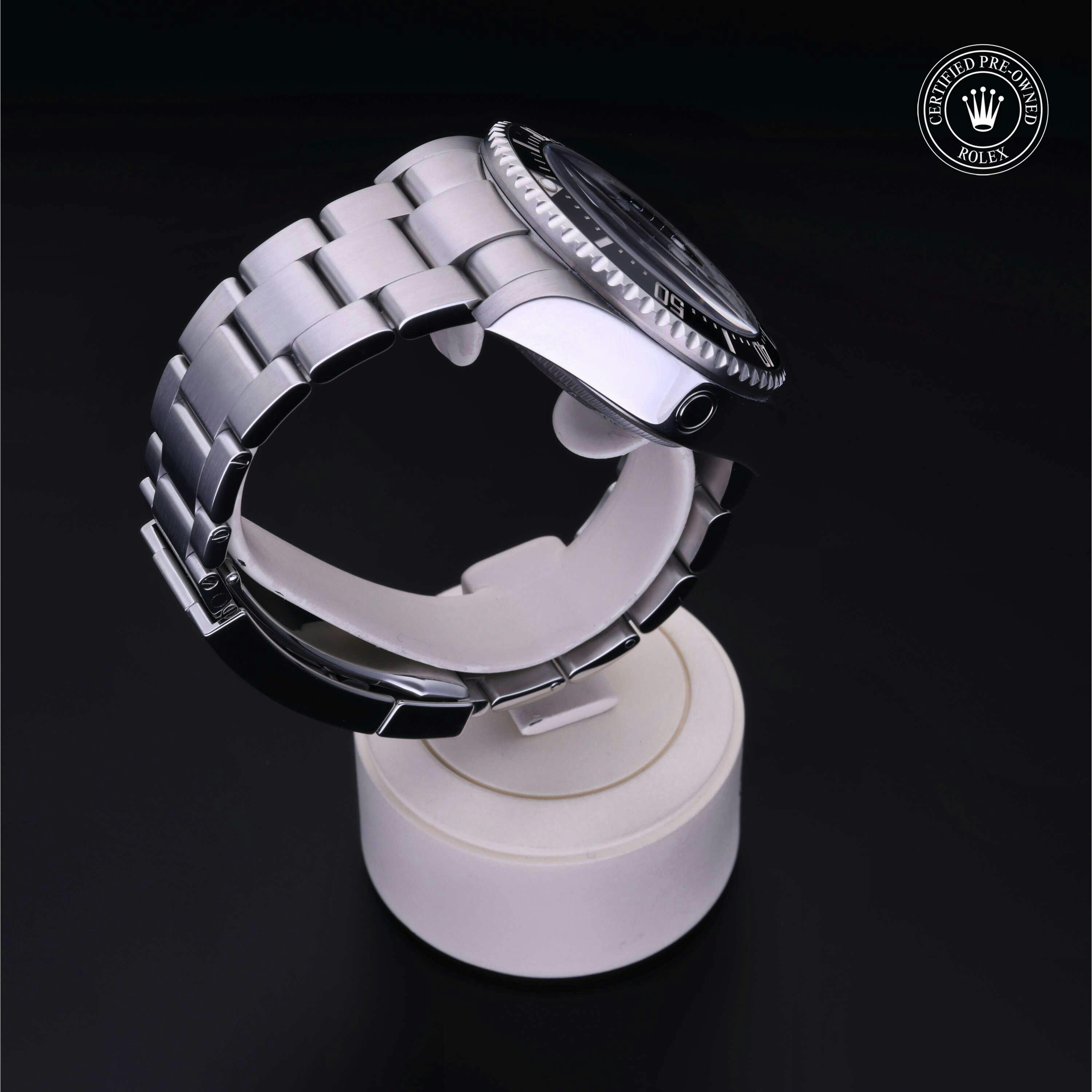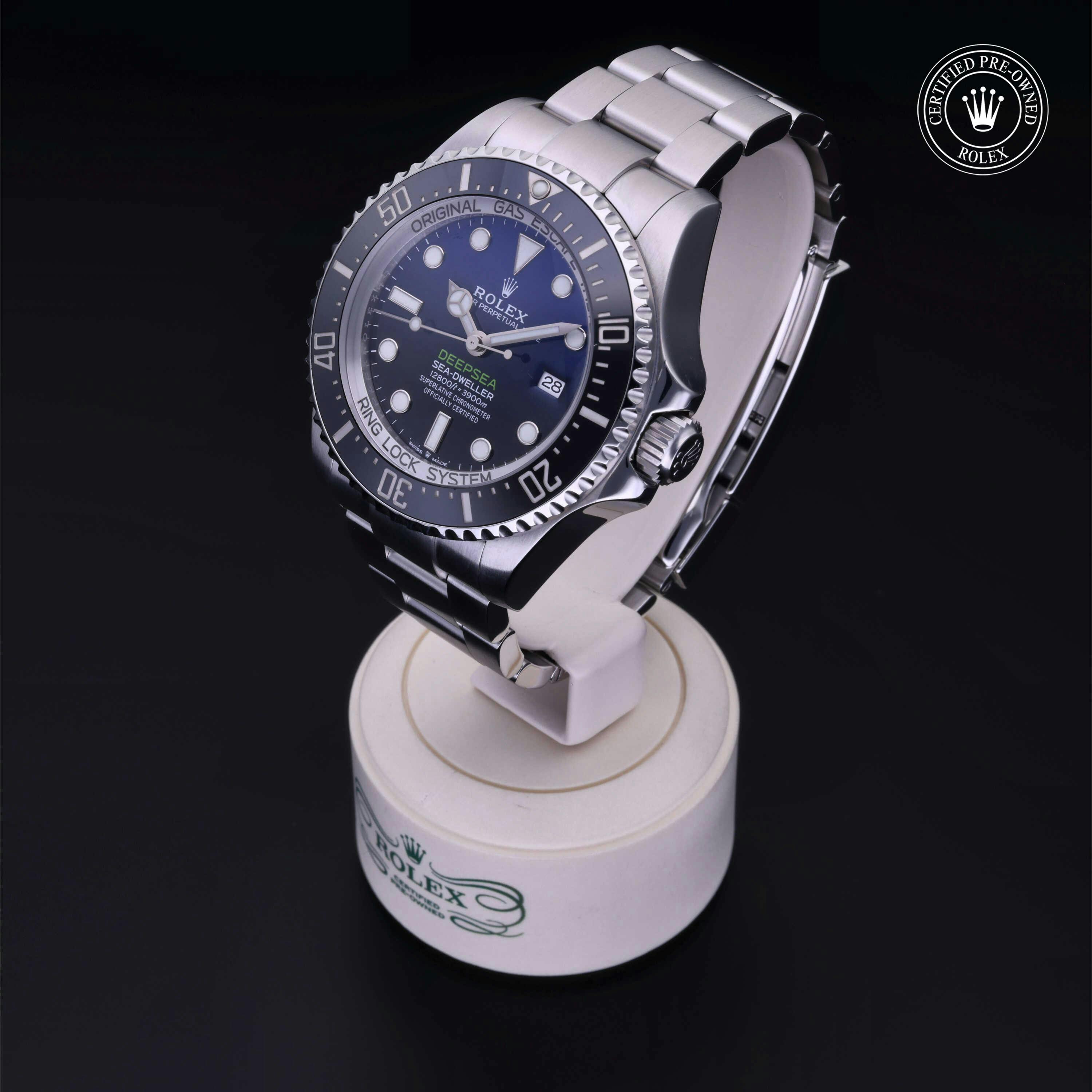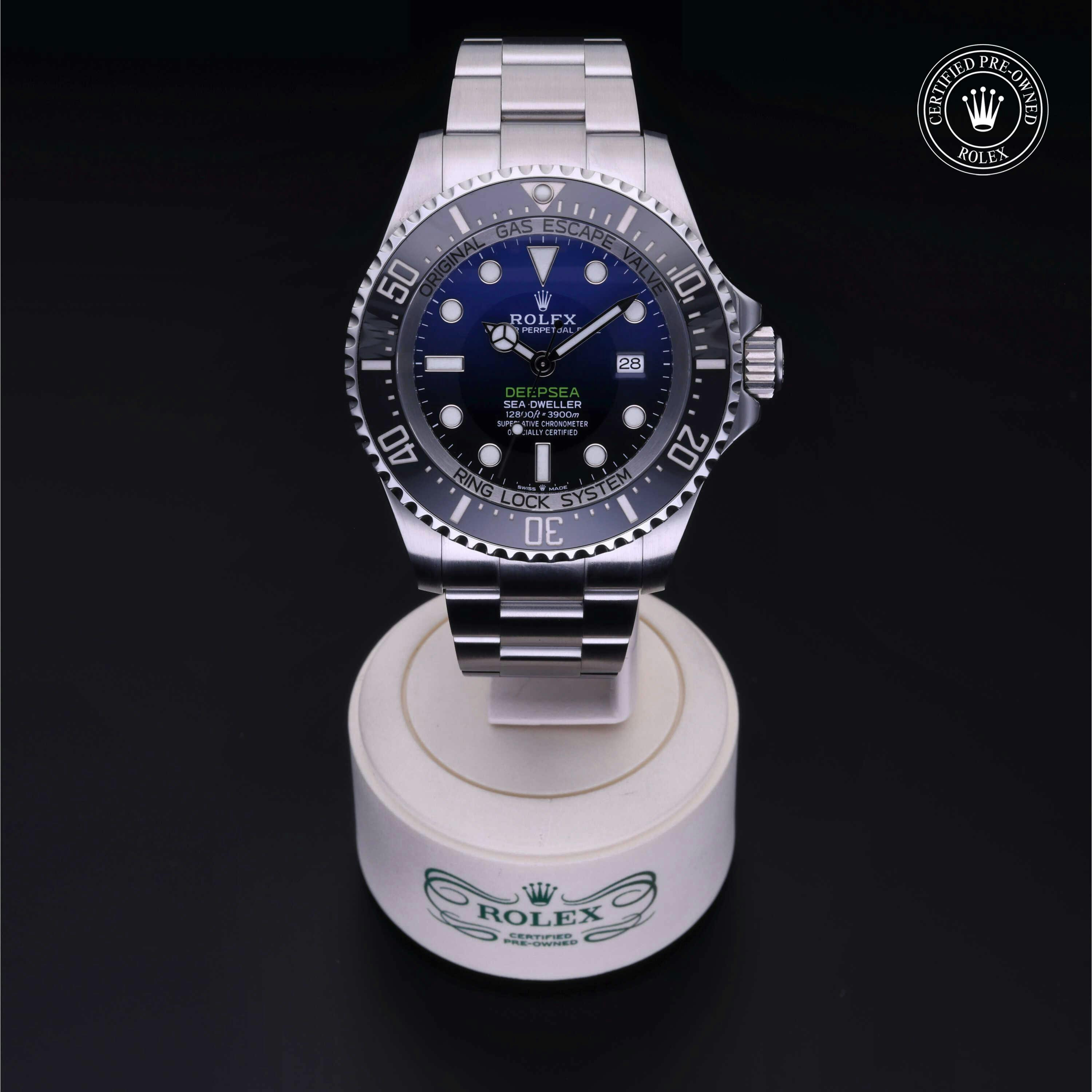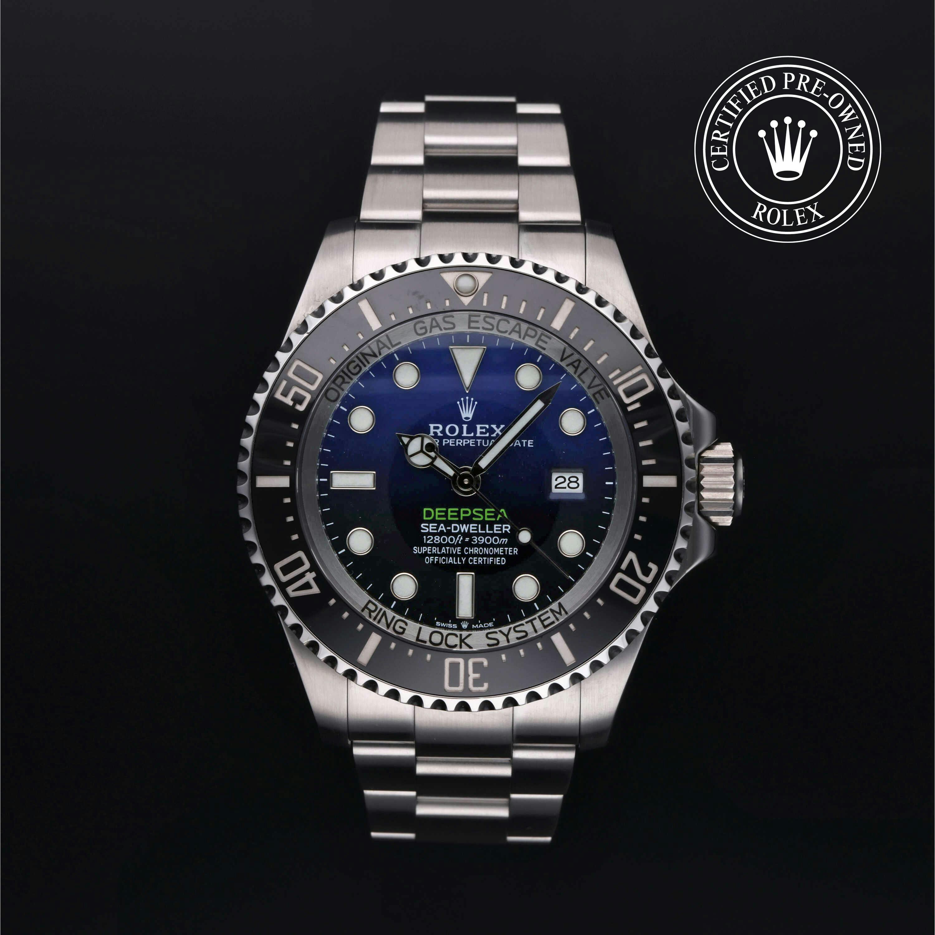 Rolex Certified Pre-Owned Sea-Dweller Deepsea (126660) self - winding automatic watch, features a 44mm stainless steel case with a stainless steel unidirectional bezel featuring a black cerachrom 60-minute scale insert. The bezel is surrounding a "Deep Blue" dial showcasing a blue to black gradient motif. The watch is secured on a stainless steel Oyster bracelet complete with a folding buckle. Functions include hours, minutes, seconds, date and helium release valve. This watch has been serviced by an authorized service center and certified by Rolex. It does not come with the original box or papers, but includes a custom Rolex Certified Pre-Owned hang tag, travel pouch and international warranty card.
