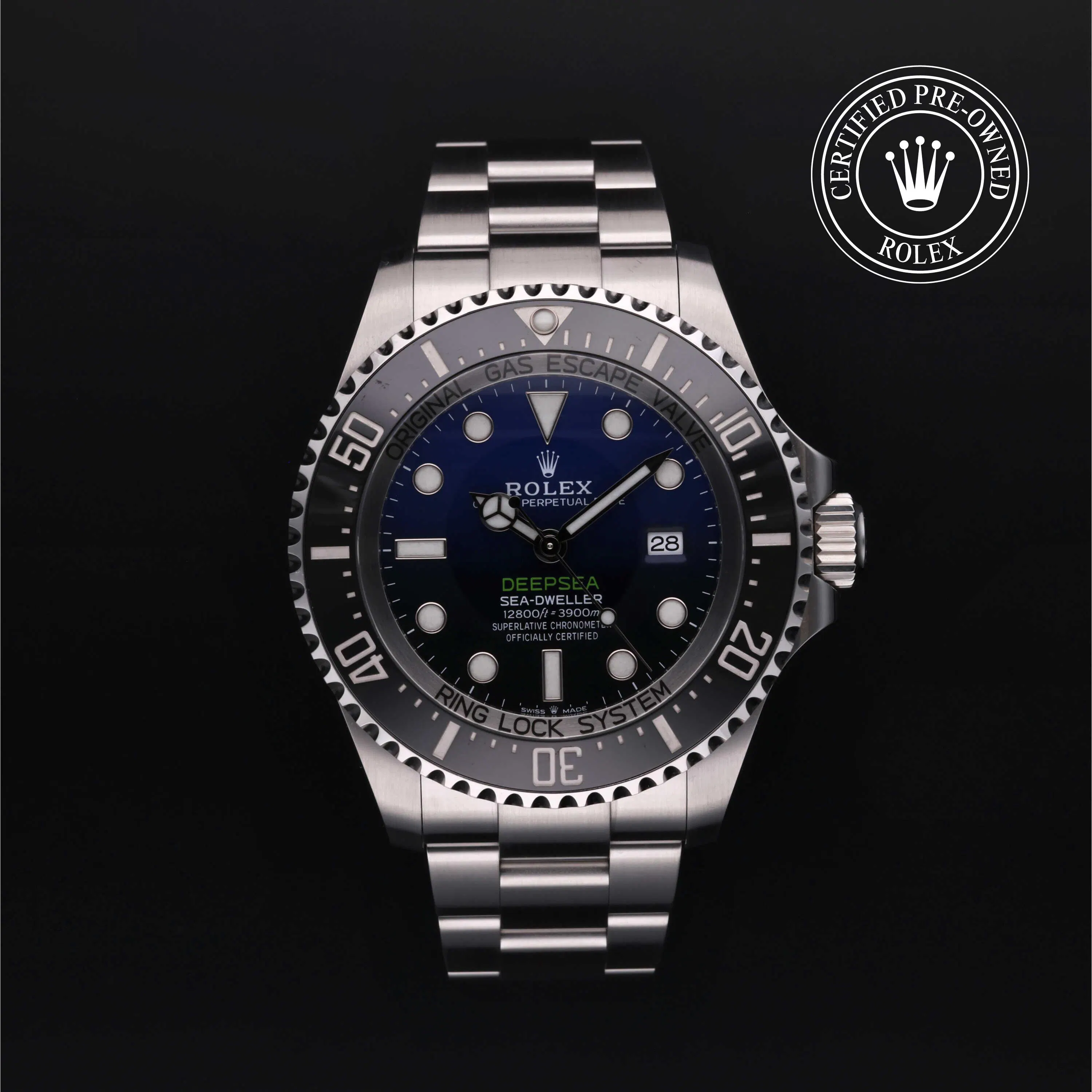 Rolex Certified Pre-Owned Sea-Dweller Deepsea "Deep Blue" (126660) self - winding automatic watch, features a 44mm stainless steel case and unidirectional rotating bezel with a black cerachrom insert surrounding a blue to black gradient dial on a stainless steel Oyster bracelet. Functions include hours, minutes, seconds, date and helium release valve. This watch has received Rolex-authorized service and certification. It comes with the original papers, and includes a custom Rolex Certified Pre-Owned hang tag, travel pouch and RCPO international warranty card.