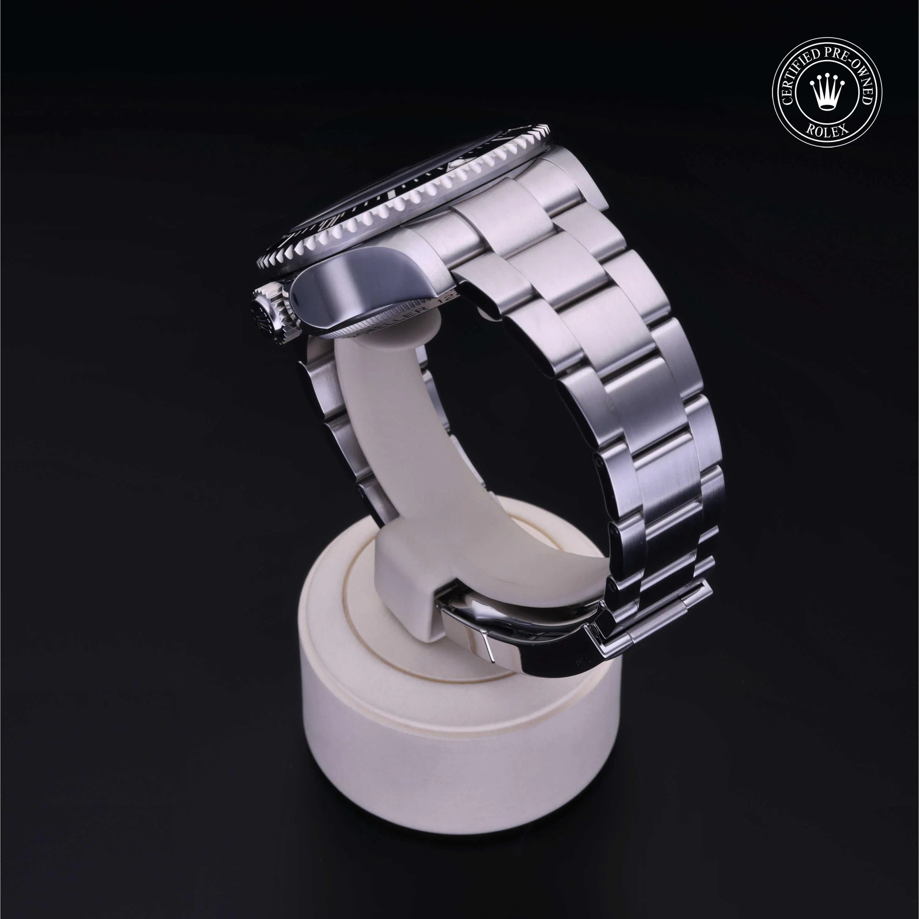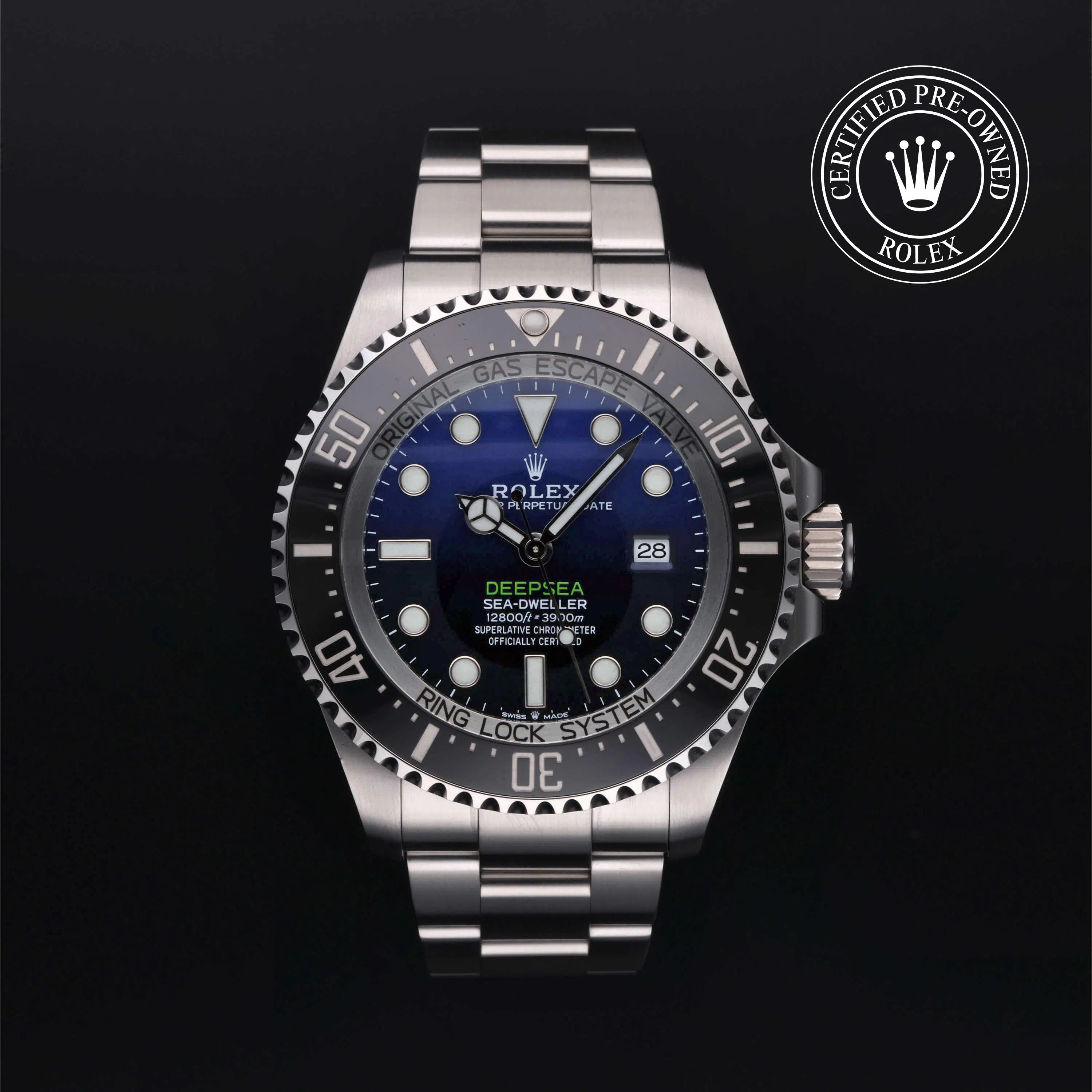 Rolex Certified Pre-Owned Sea-Dweller Deepsea "Deep Blue" (126660) self - winding automatic watch, features a 44mm stainless steel case and unidirectional rotating bezel with a black cerachrom insert surrounding a blue to black gradient dial on a stainless steel Oyster bracelet. Functions include hours, minutes, seconds, date and helium release valve. This watch has received Rolex-authorized service and certification. It comes with the original box and papers, and includes a custom Rolex Certified Pre-Owned hang tag, travel pouch and RCPO international warranty card.
