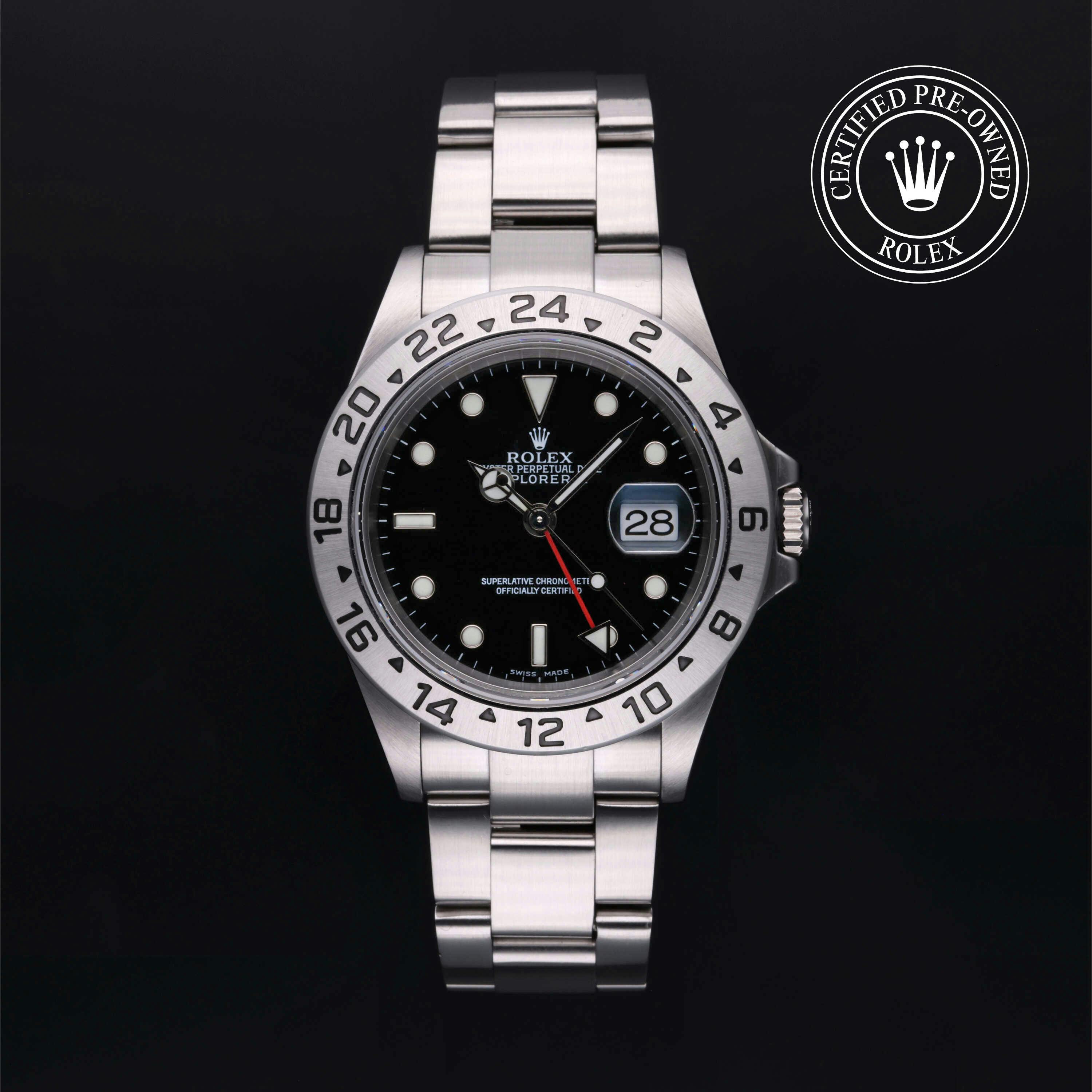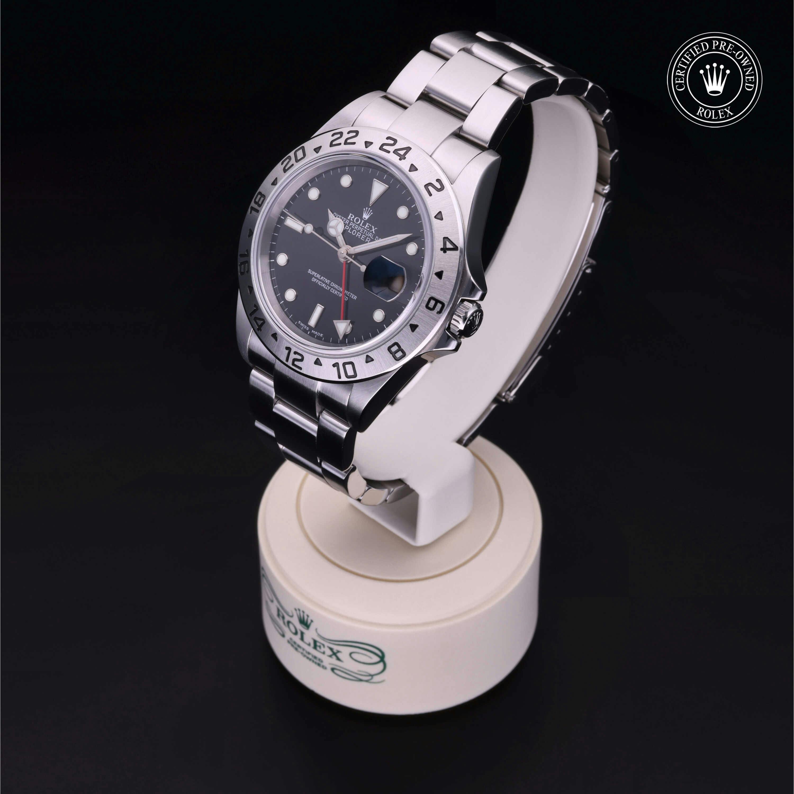 Rolex Certified Pre-Owned Explorer II (16570) self - winding automatic watch, features a 40mm stainless steel case surrounding a black dial on a stainless steel Oyster bracelet. Functions include hours, minutes, seconds, date and gmt. This watch has received Rolex-authorized service and certification. It comes with the original box and papers, and includes a custom Rolex Certified Pre-Owned hang tag, travel pouch and RCPO international warranty card.