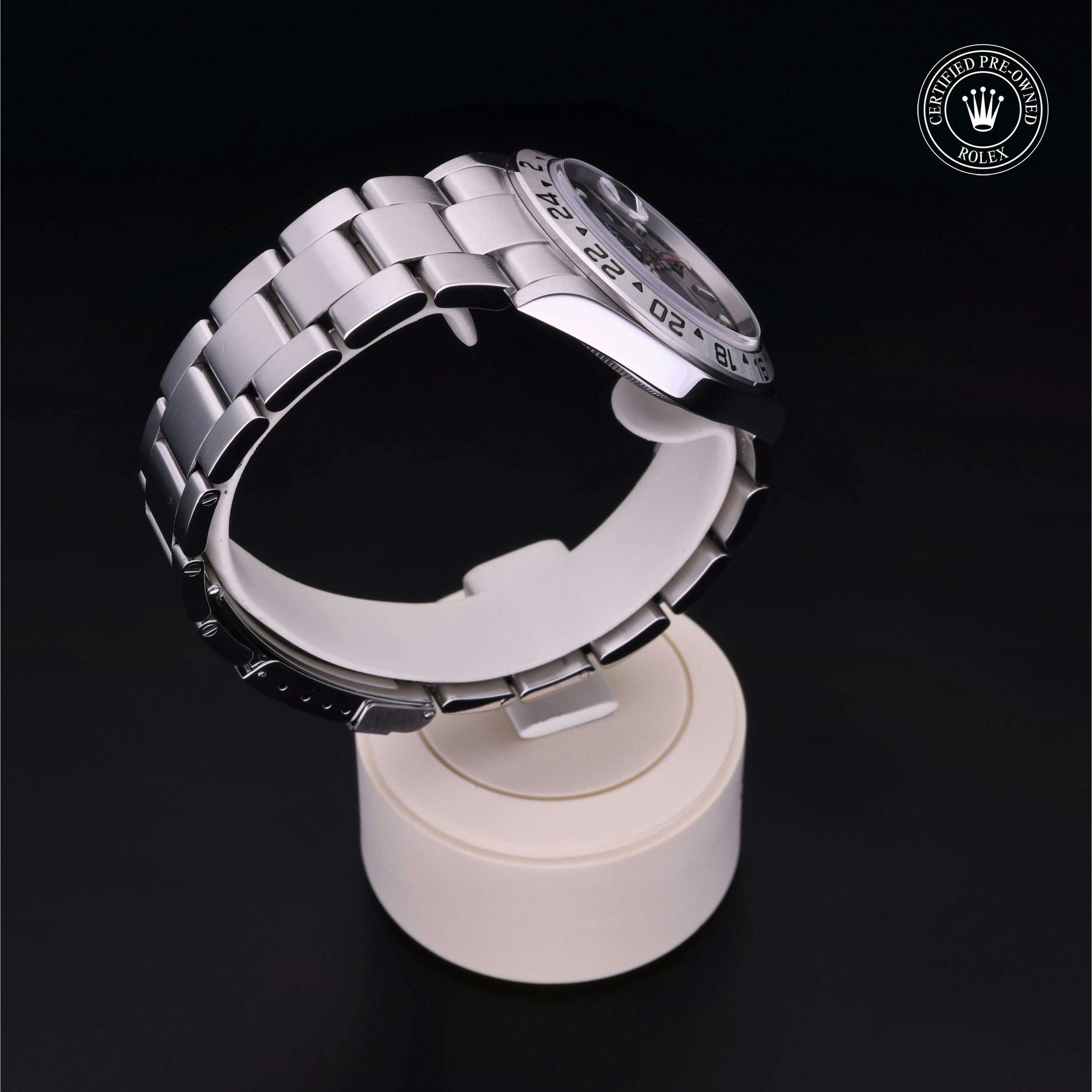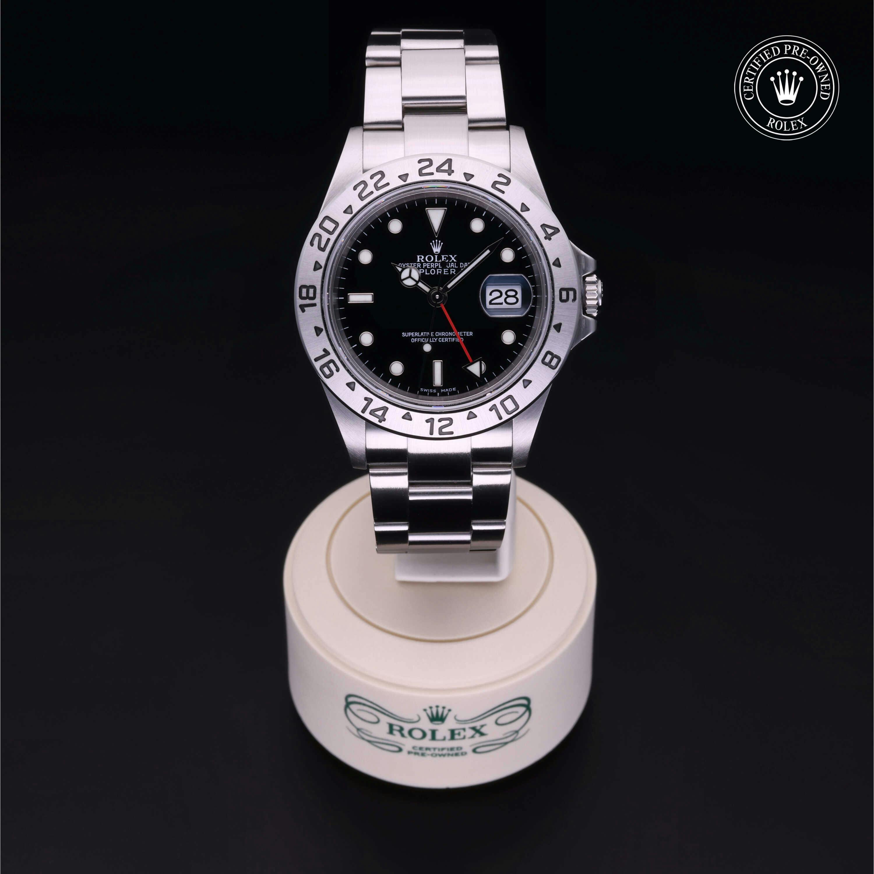 Rolex Certified Pre-Owned Explorer II (16570) self - winding automatic watch, features a 40mm stainless steel case surrounding a black dial on a stainless steel Oyster bracelet. Functions include hours, minutes, seconds, date and gmt. This watch has received Rolex-authorized service and certification. It comes with the original box and papers, and includes a custom Rolex Certified Pre-Owned hang tag, travel pouch and RCPO international warranty card.