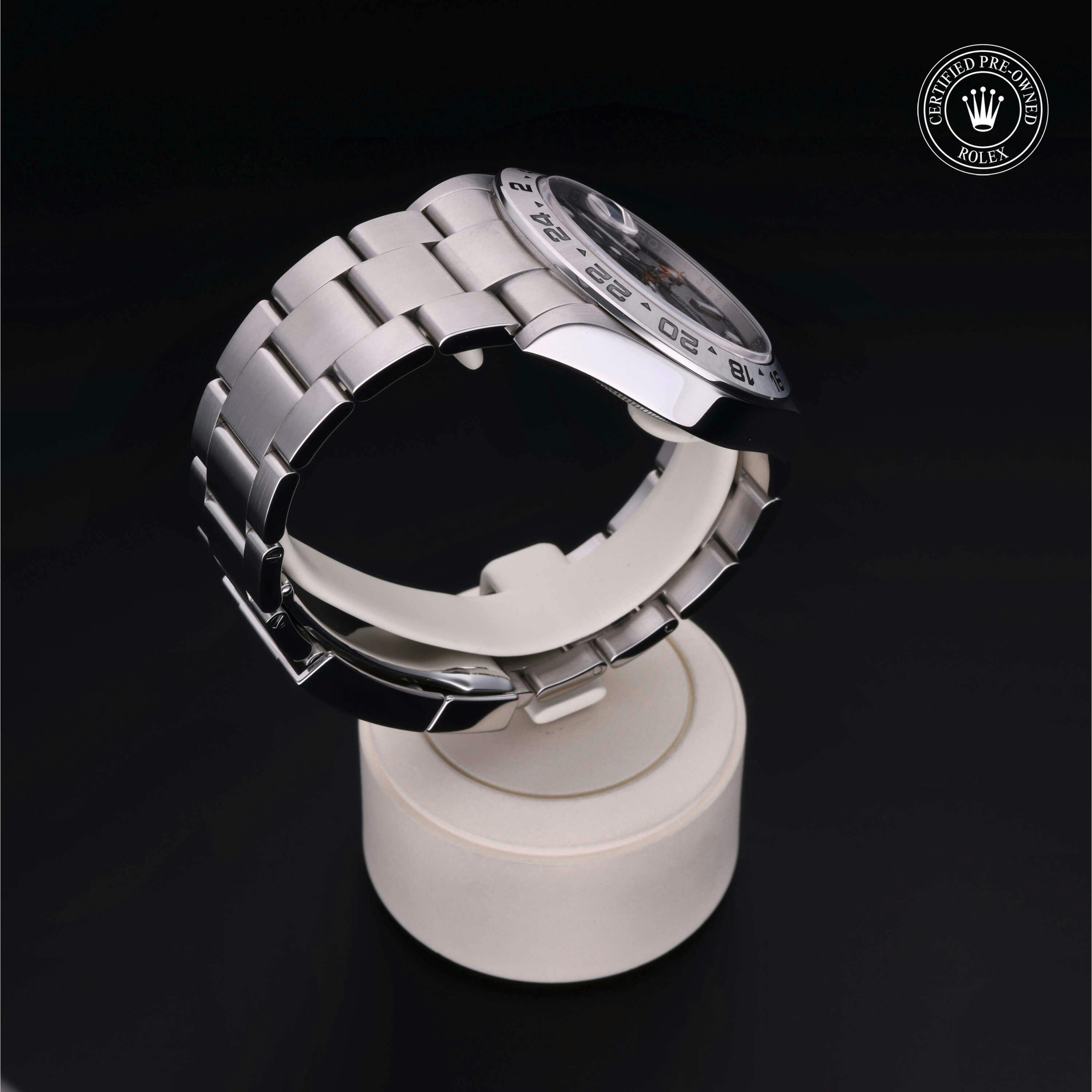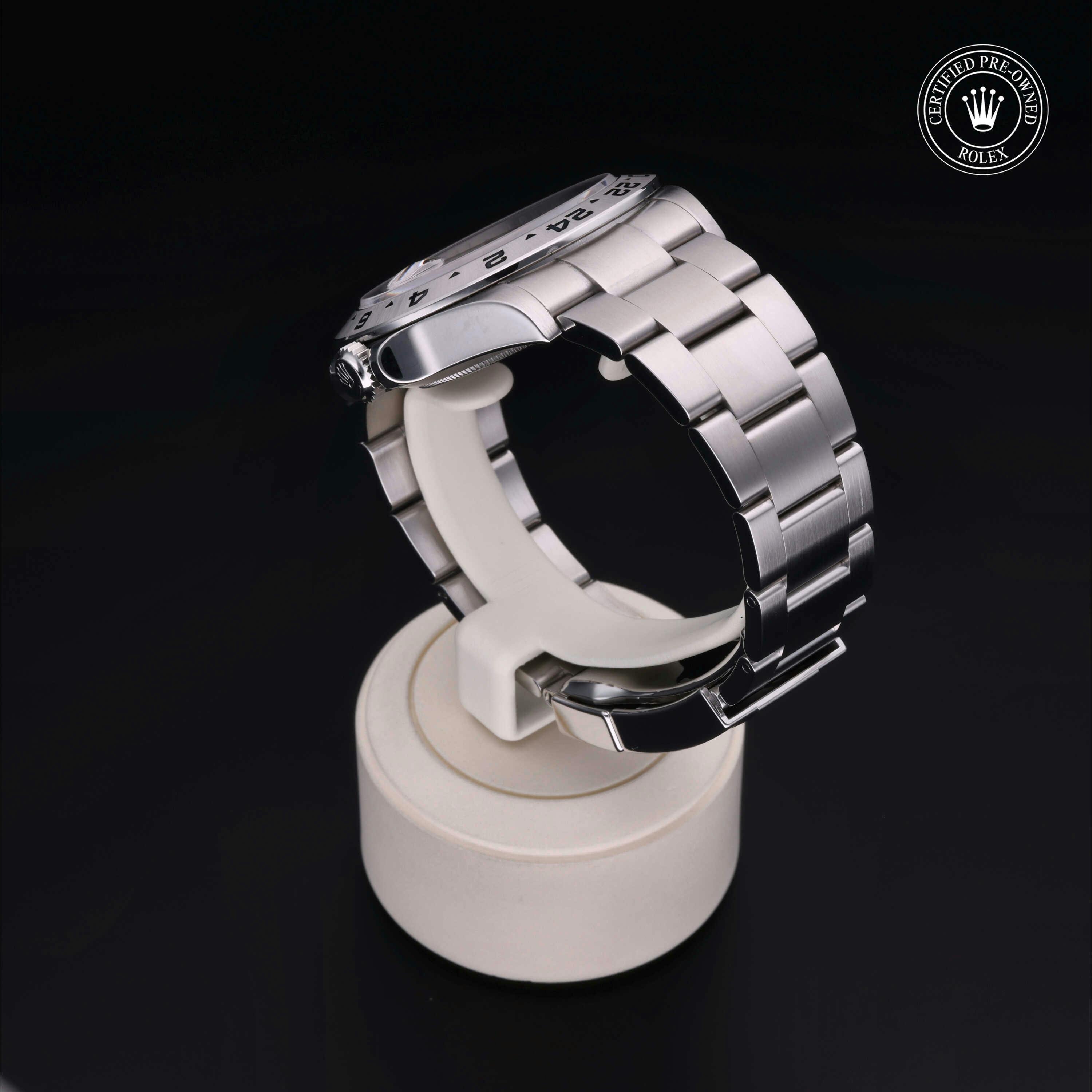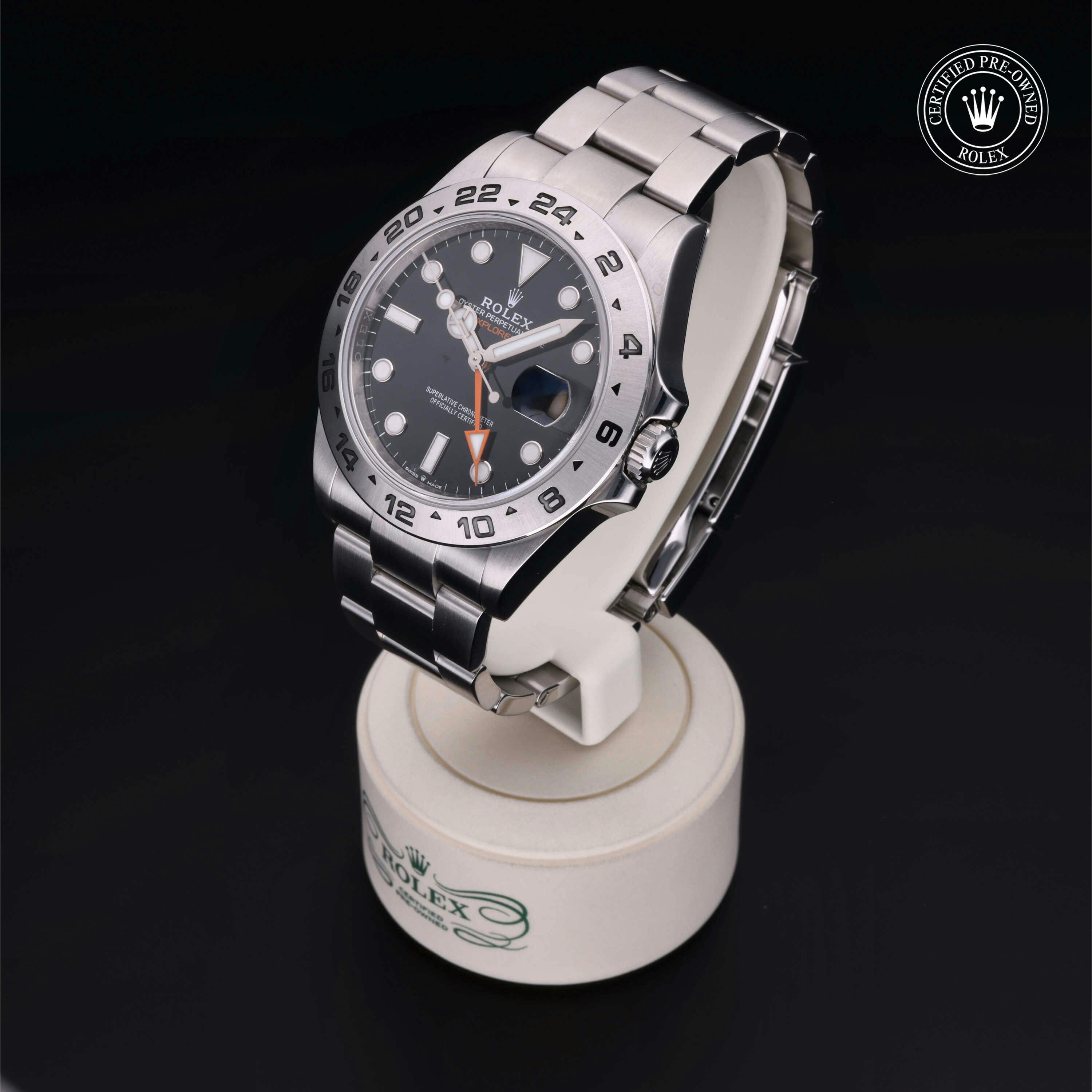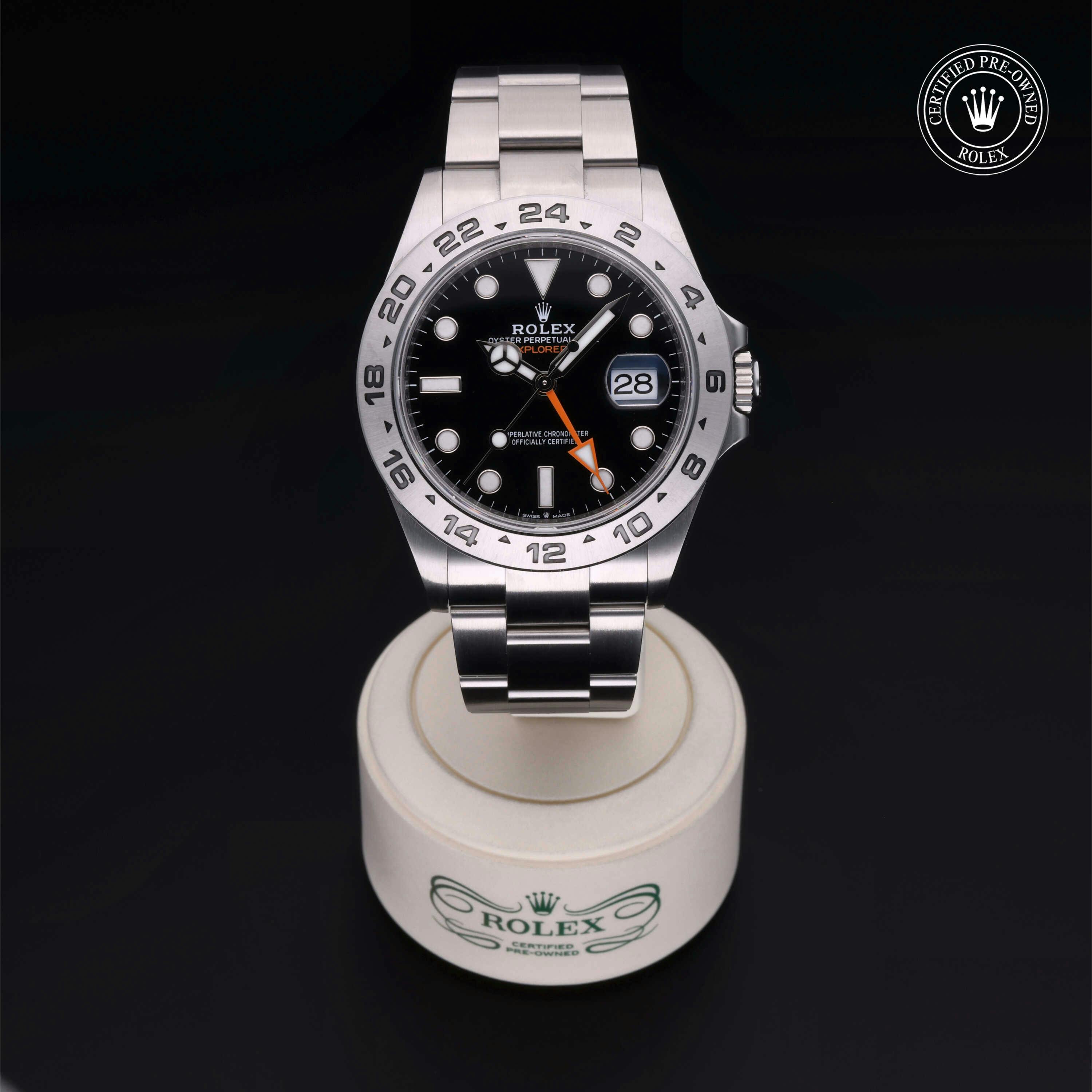 Rolex Certified Pre-Owned Explorer II (226570) self - winding automatic watch, features a 42mm stainless steel case surrounding a black dial on a stainless steel oyster bracelet. Functions include hours, minutes, seconds, date and gmt/world time. This watch has received Rolex-authorized service and certification. It comes with the original box and papers, and includes a custom Rolex Certified Pre-Owned hang tag, travel pouch and RCPO international warranty card.