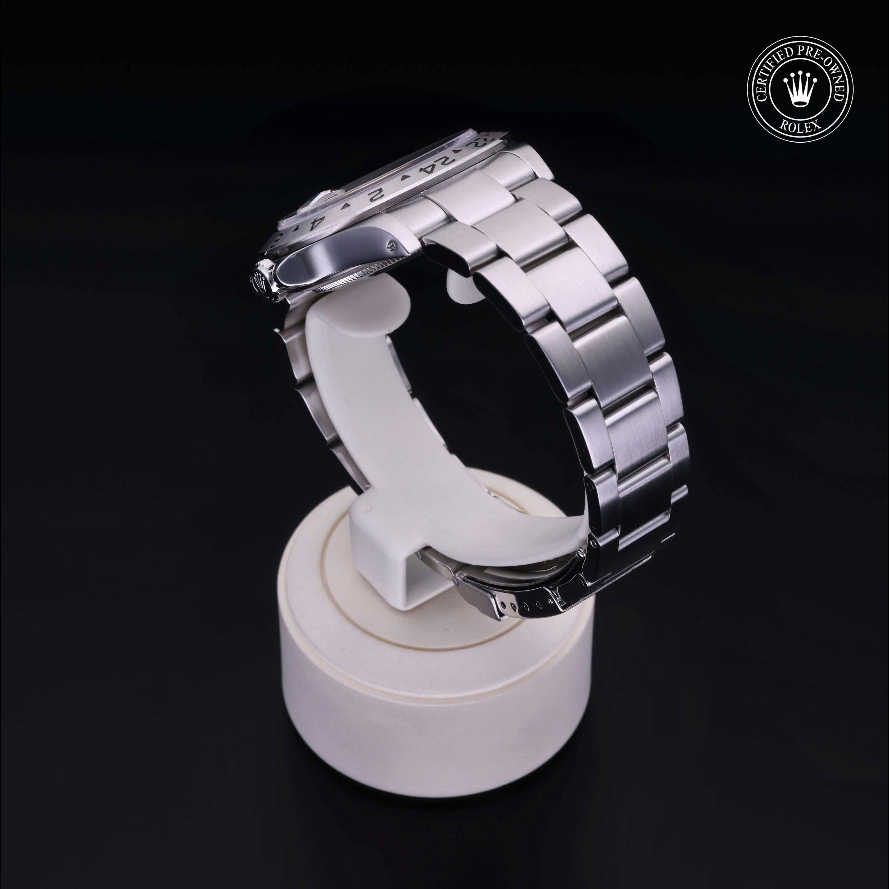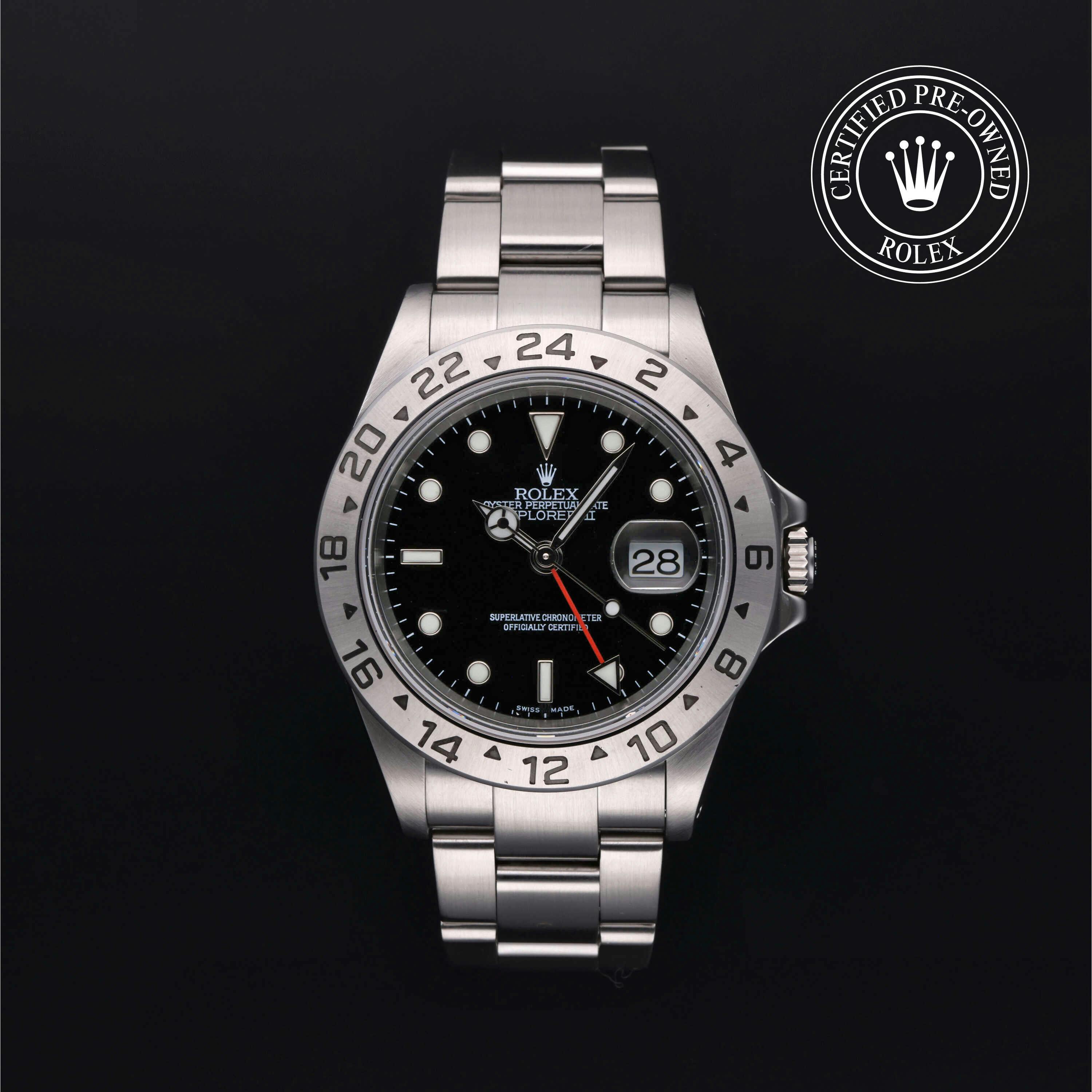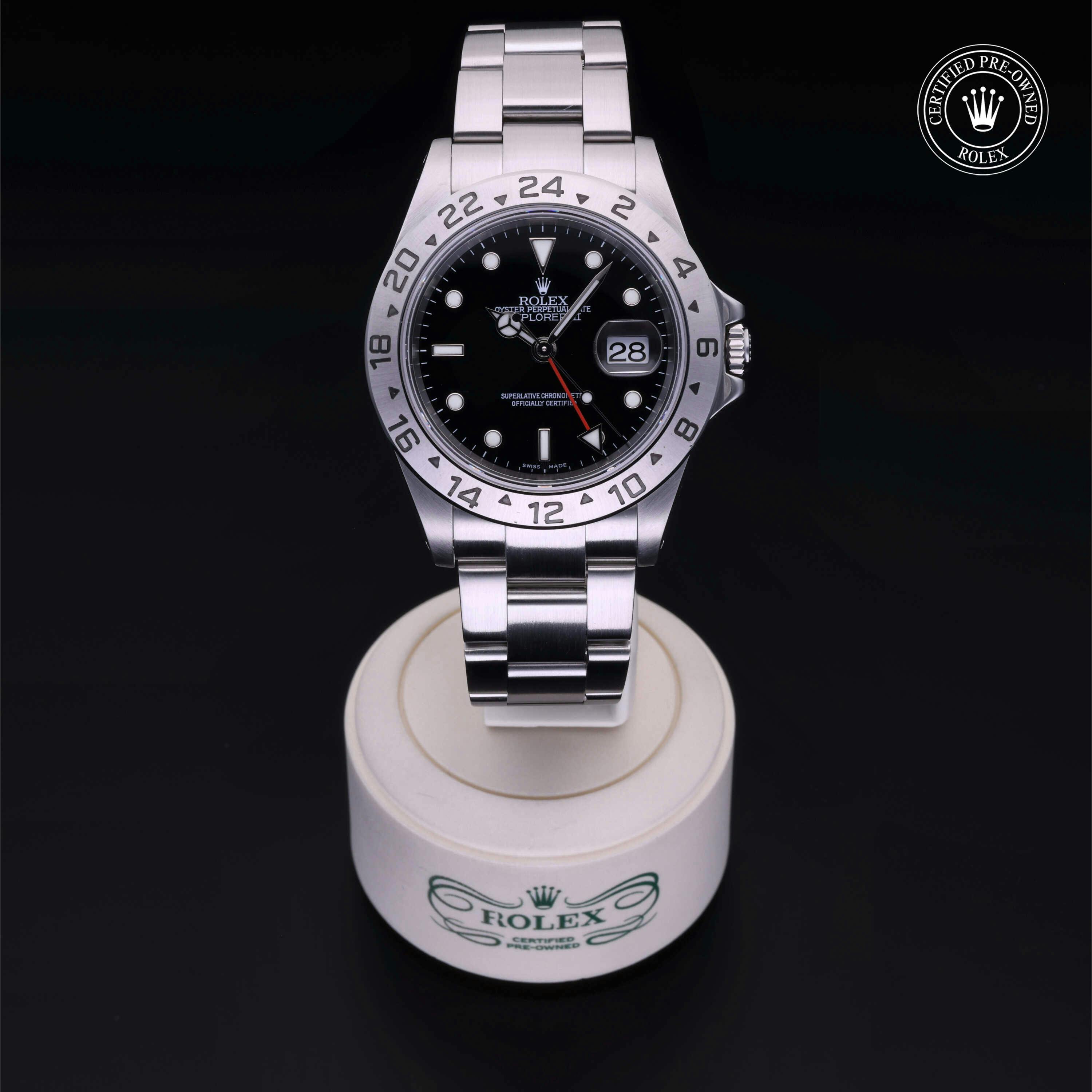 Rolex Certified Pre-Owned Explorer II (16570) self - winding automatic watch, features a 40mm stainless steel case and fixed bezel surrounding a black dial on a stainless steel oyster bracelet. Functions include hours, minutes, seconds, date and gmt/world time. This watch has received Rolex-authorized service and certification. It does not come with the original box or papers, but includes a custom Rolex Certified Pre-Owned hang tag, travel pouch and RCPO international warranty card.
