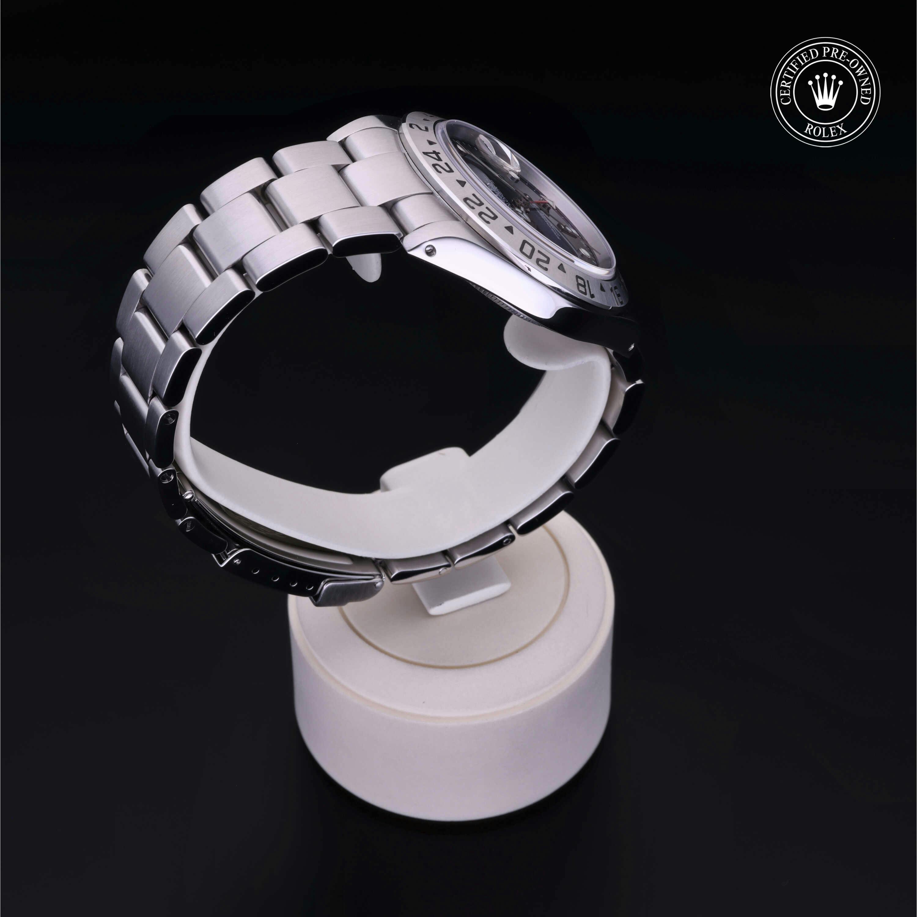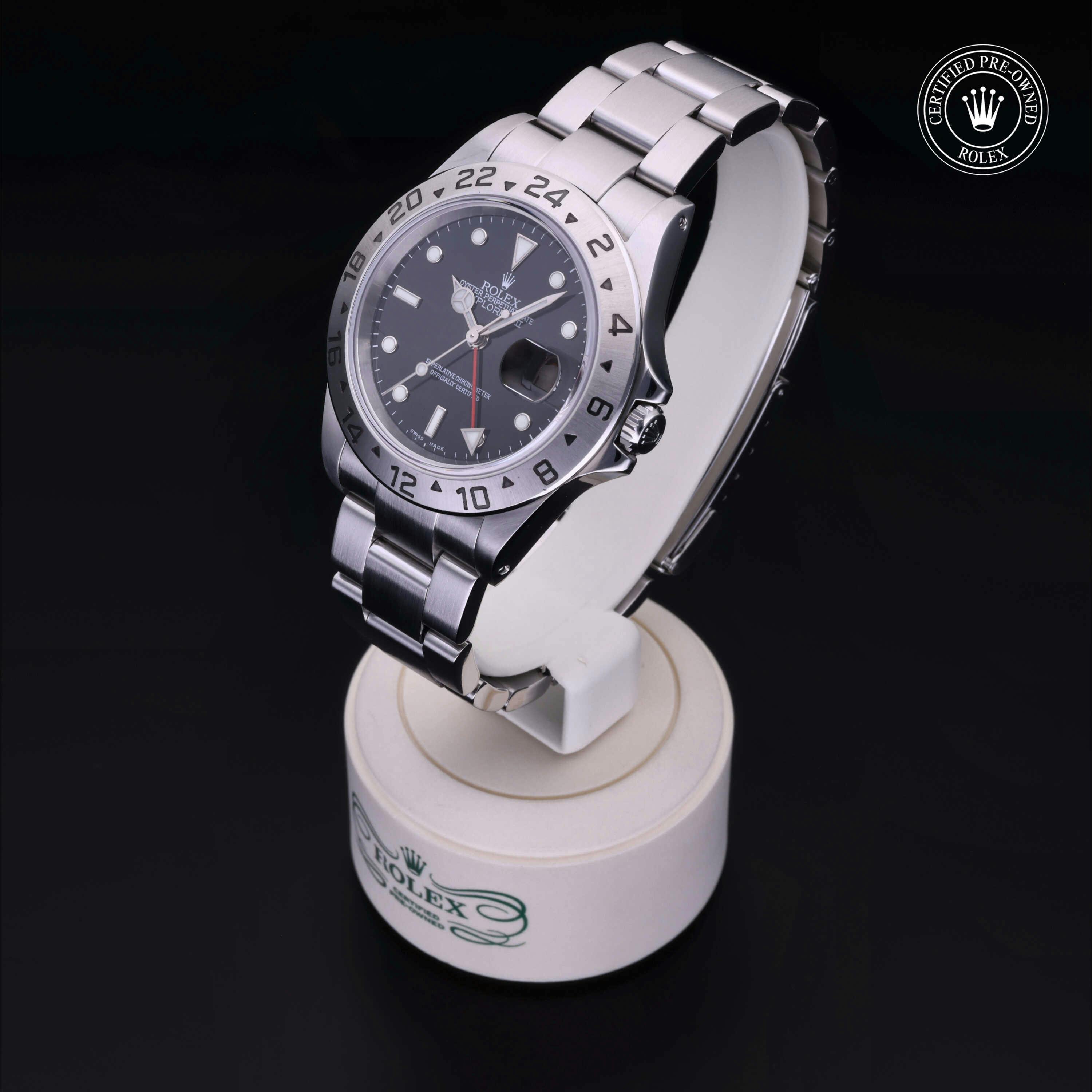Rolex Certified Pre-Owned Explorer II (16570) self - winding automatic watch, features a 40mm stainless steel case and fixed bezel surrounding a black dial on a stainless steel oyster bracelet. Functions include hours, minutes, seconds, date and gmt/world time. This watch has received Rolex-authorized service and certification. It does not come with the original box or papers, but includes a custom Rolex Certified Pre-Owned hang tag, travel pouch and RCPO international warranty card.