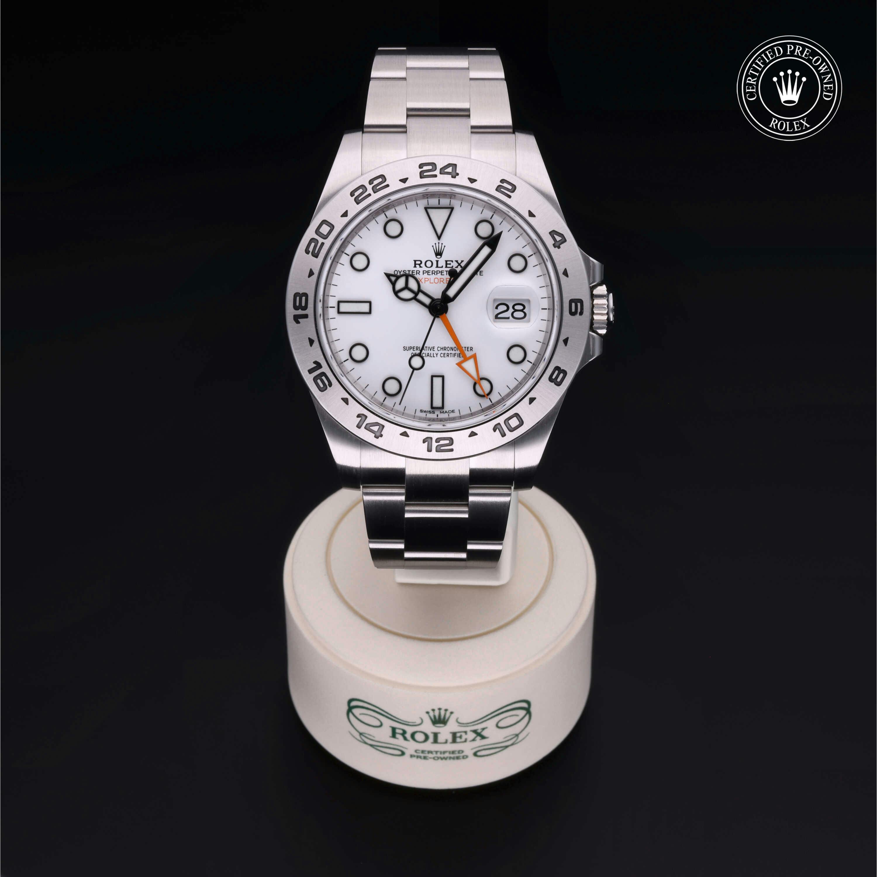 Rolex Certified Pre-Owned Explorer II (216570) self - winding automatic watch, features a 42mm stainless steel case surrounding a white dial on a stainless steel oyster bracelet. Functions include hours, minutes, seconds, date and gmt/world time. This watch has received Rolex-authorized service and certification. It comes with the original box and papers, and includes a custom Rolex Certified Pre-Owned hang tag, travel pouch and RCPO international warranty card.