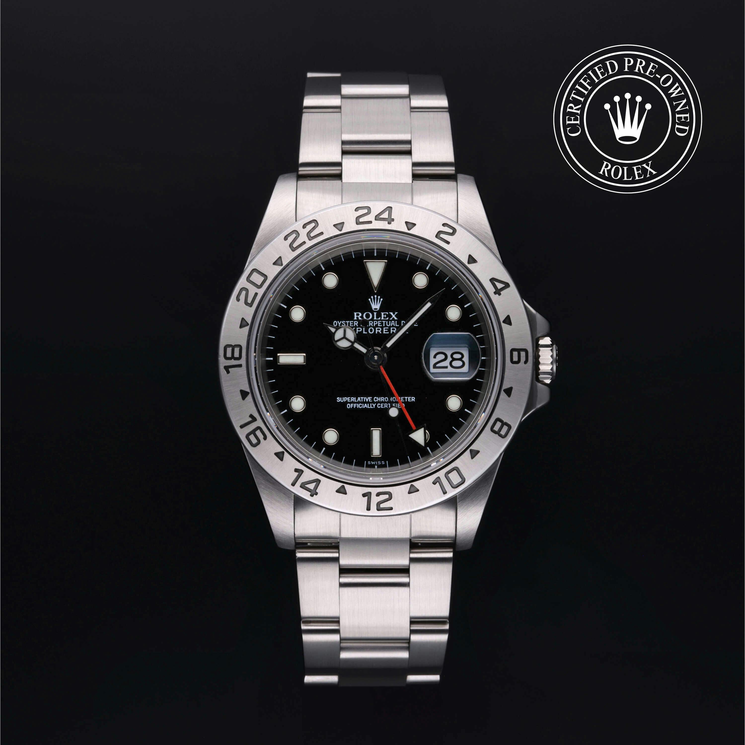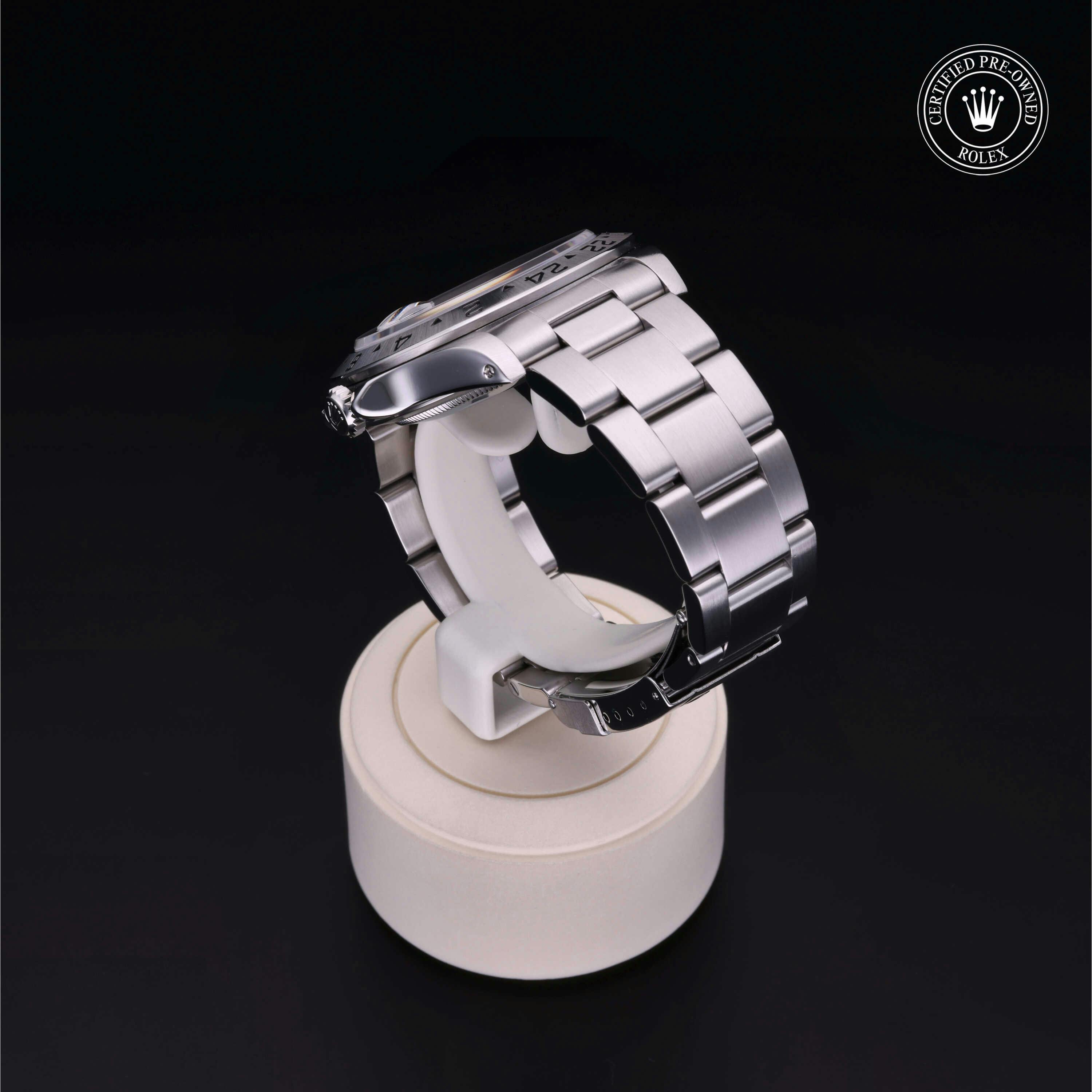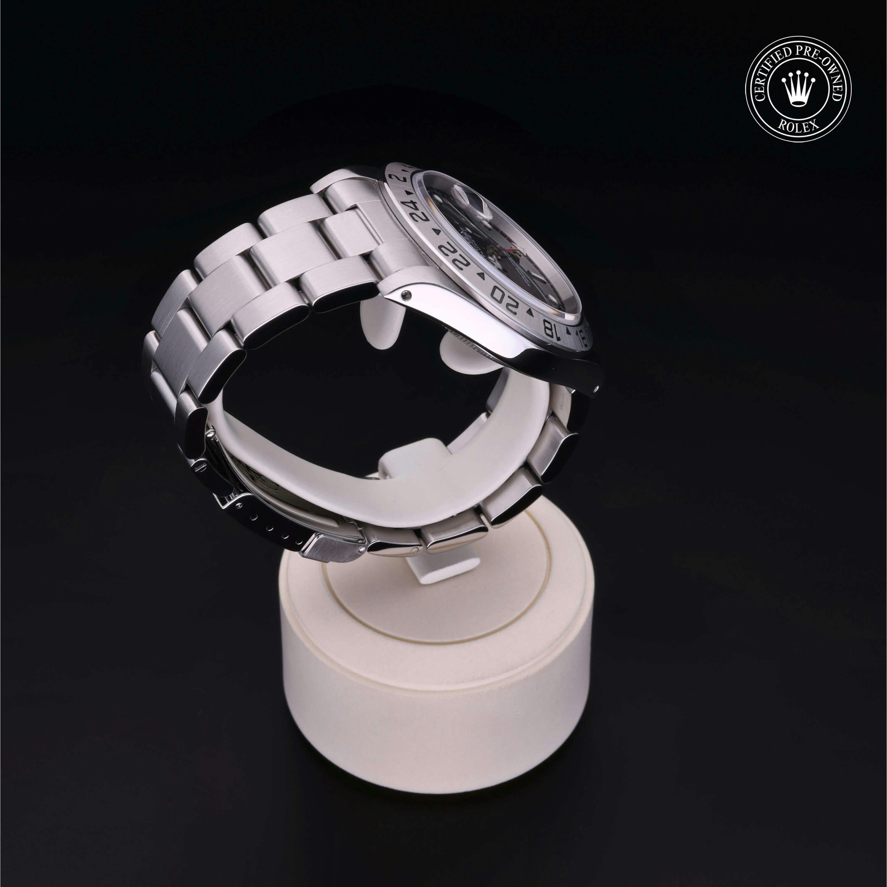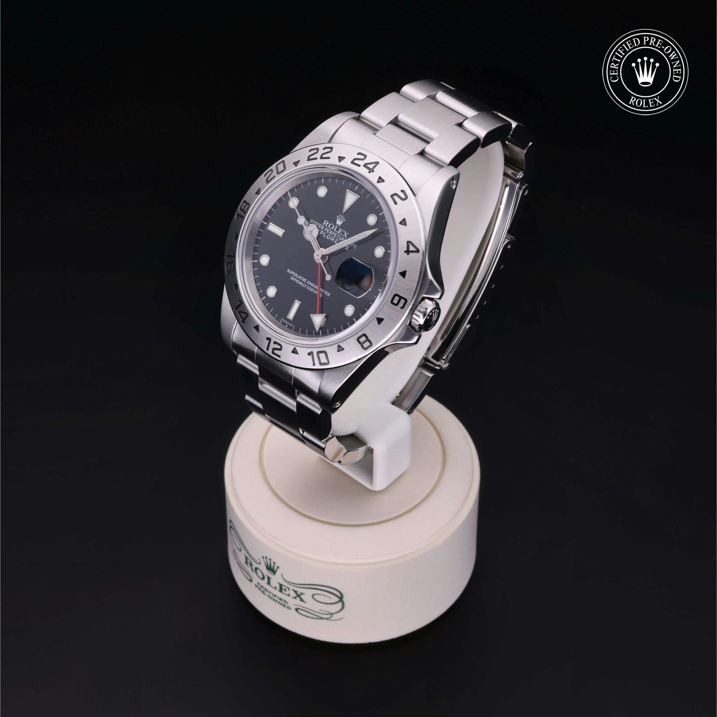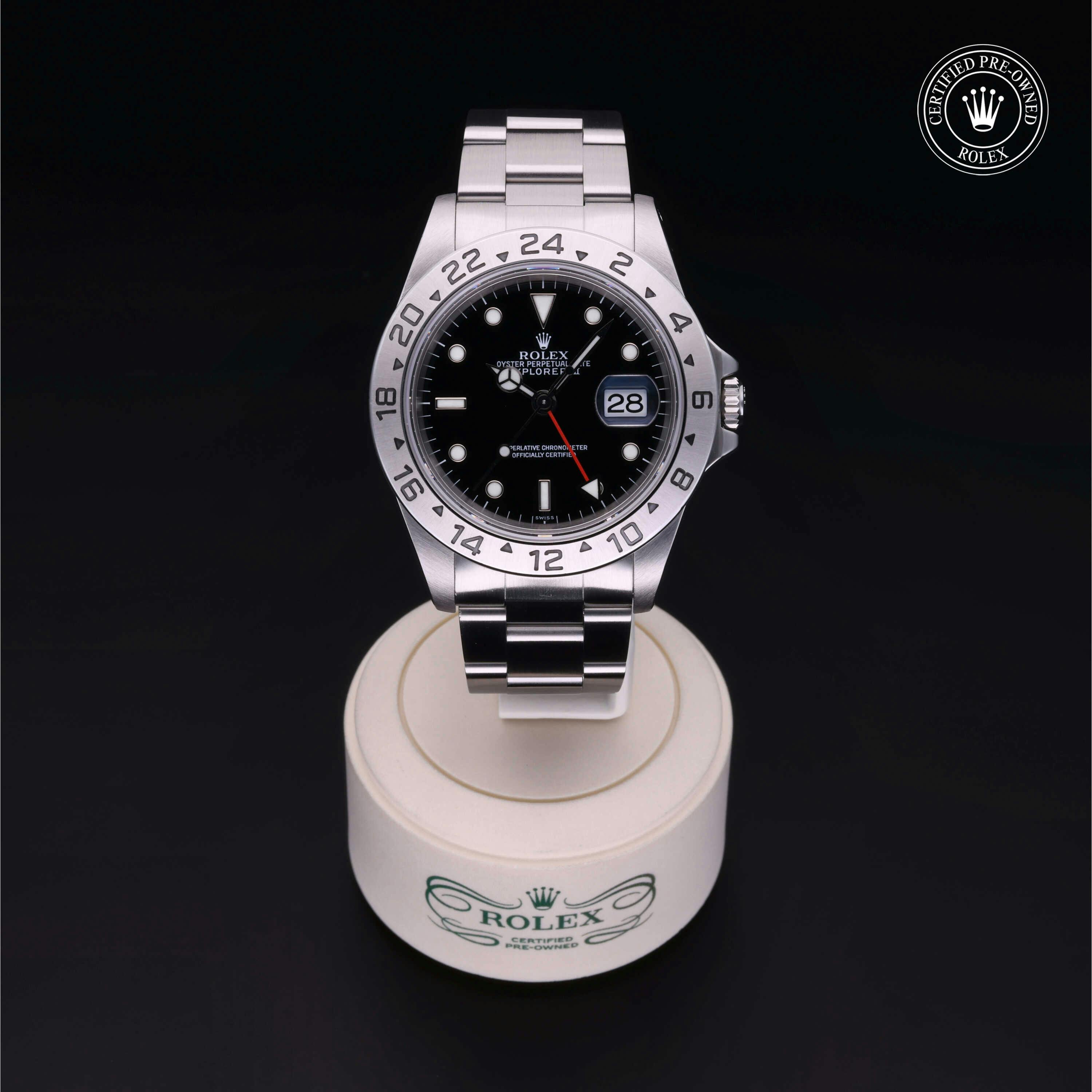 Rolex Certified Pre-Owned Explorer II (16570) self - winding automatic watch, features a 40mm stainless steel case and fixed bezel surrounding a black dial on a stainless steel oyster bracelet. Functions include hours, minutes, seconds, date and gmt/world time. This watch has received Rolex-authorized service and certification. It does not come with the original box or papers, but includes a custom Rolex Certified Pre-Owned hang tag, travel pouch and RCPO international warranty card.