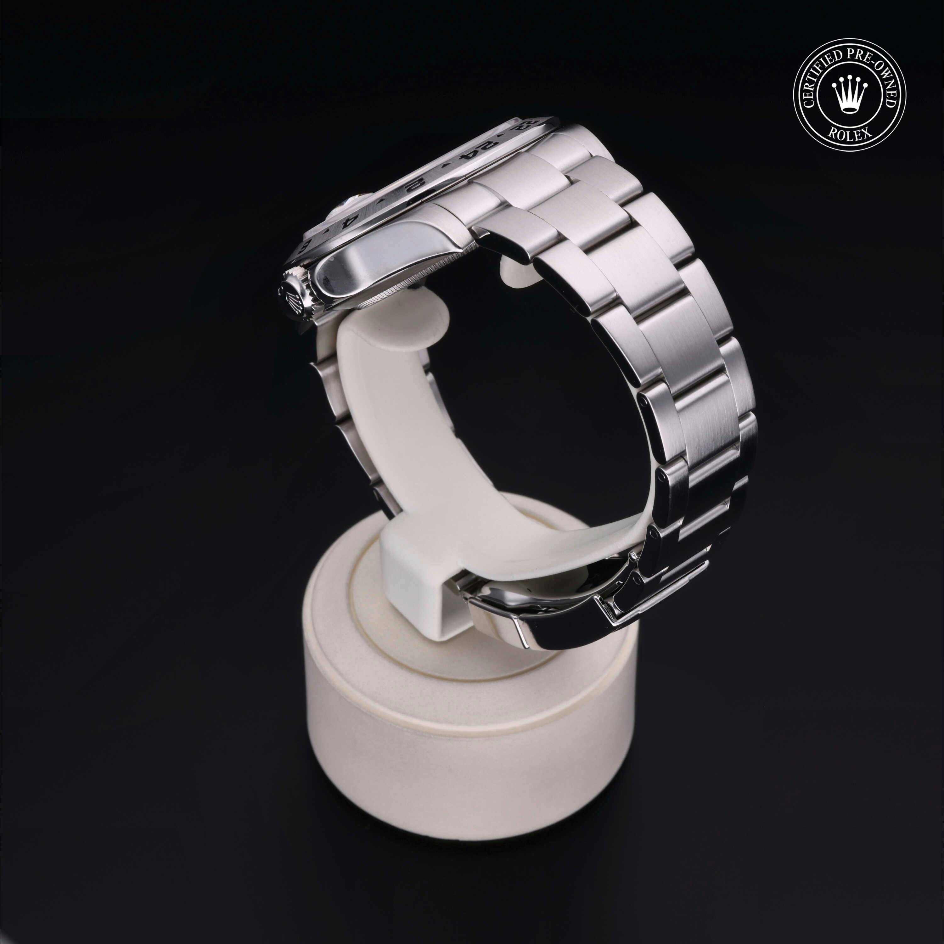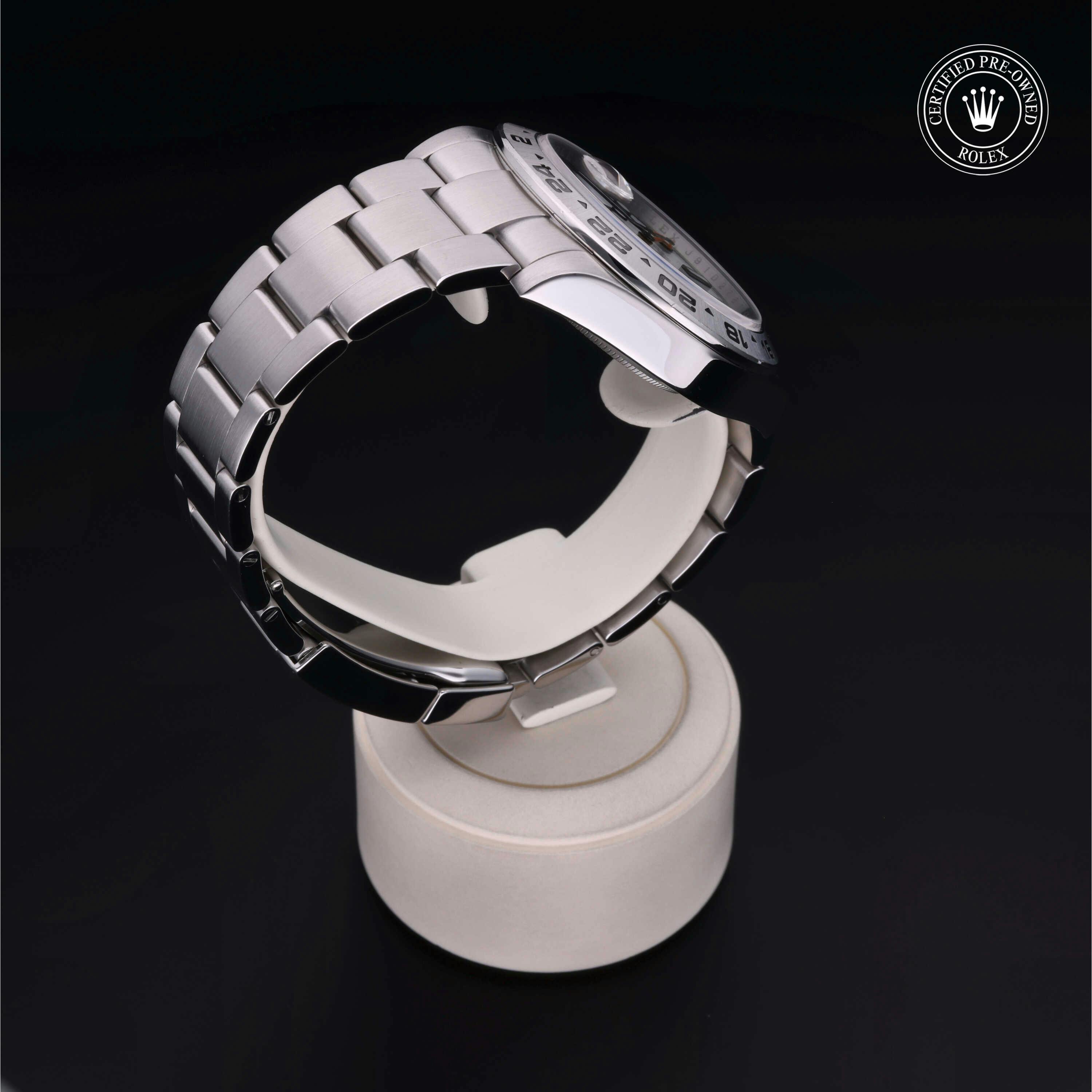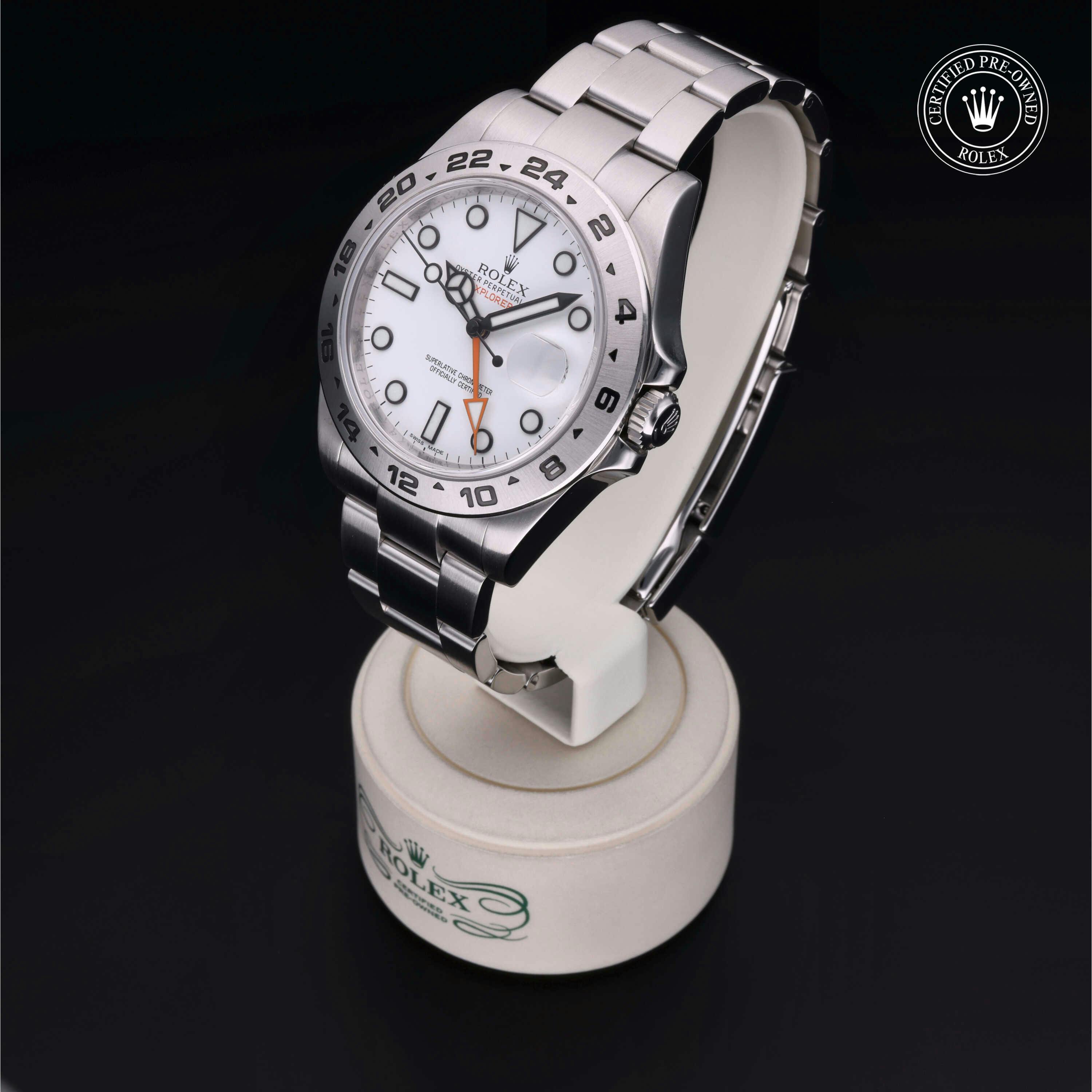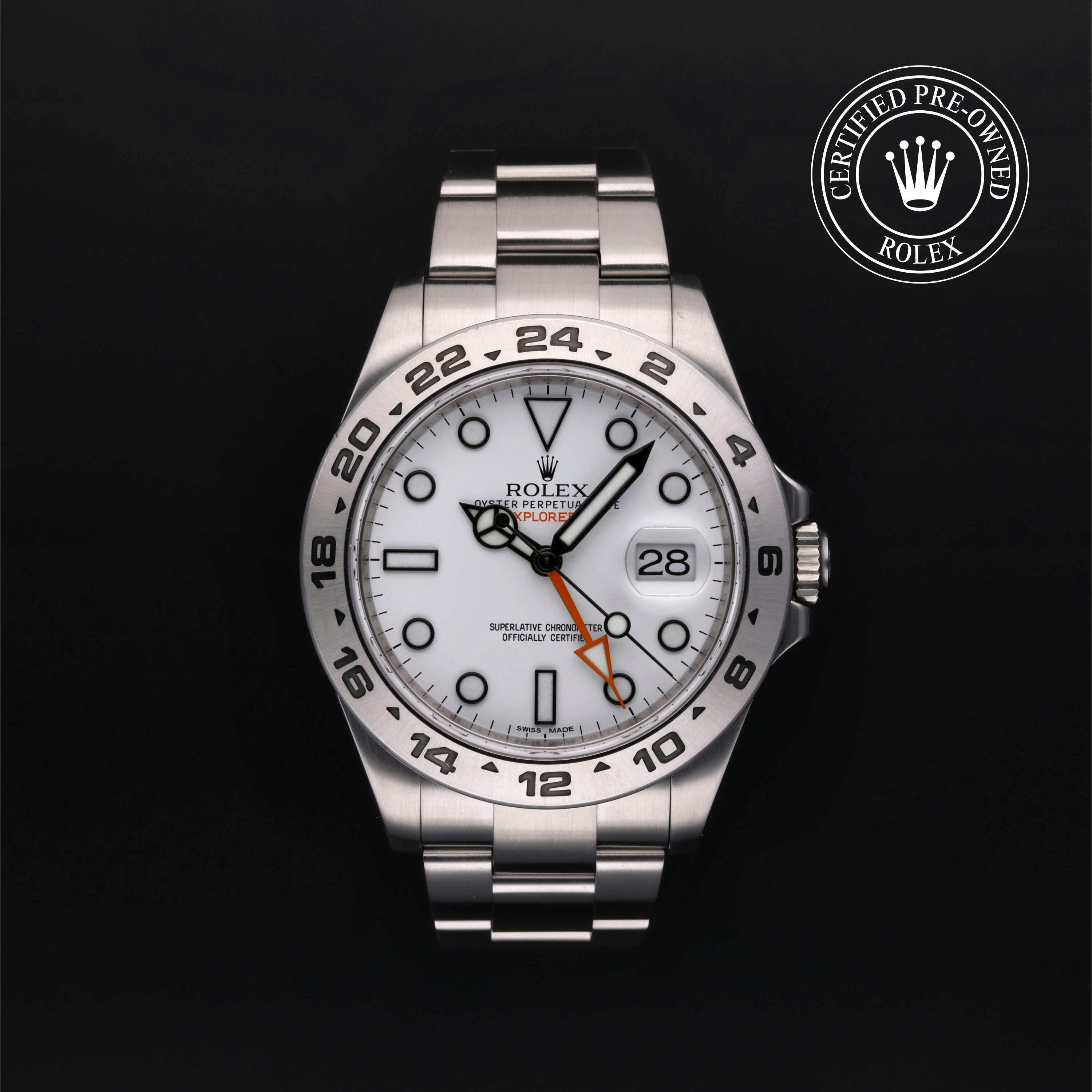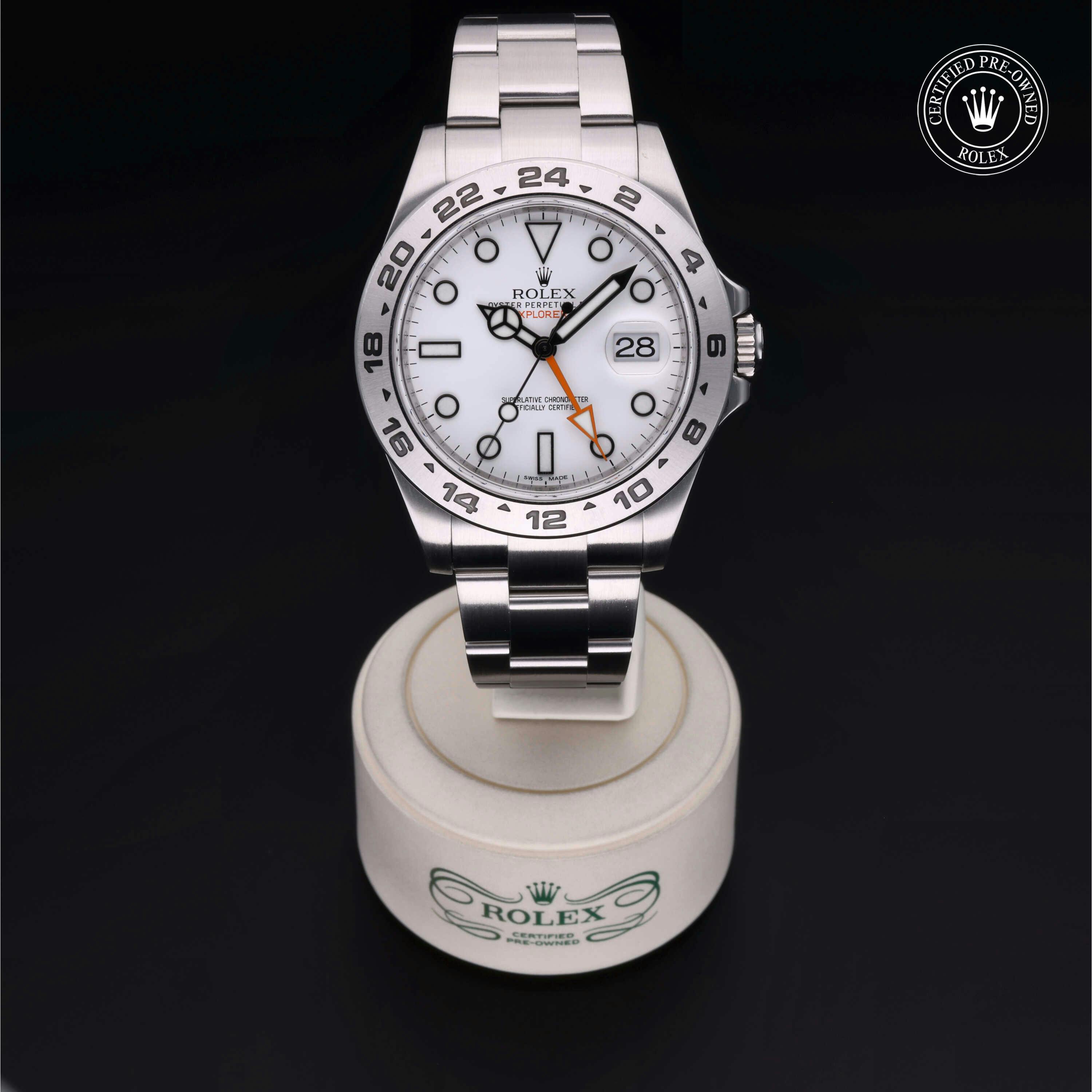 Rolex Certified Pre-Owned Explorer II (216570) self - winding automatic watch, features a 42mm stainless steel case and fixed bezel surrounding a white dial on a stainless steel oyster bracelet. Functions include hours, minutes, seconds, date and gmt/world time. This watch has received Rolex-authorized service and certification. It comes with the original box and papers, and includes a custom Rolex Certified Pre-Owned hang tang, travel pouch and RCPO international warranty card.