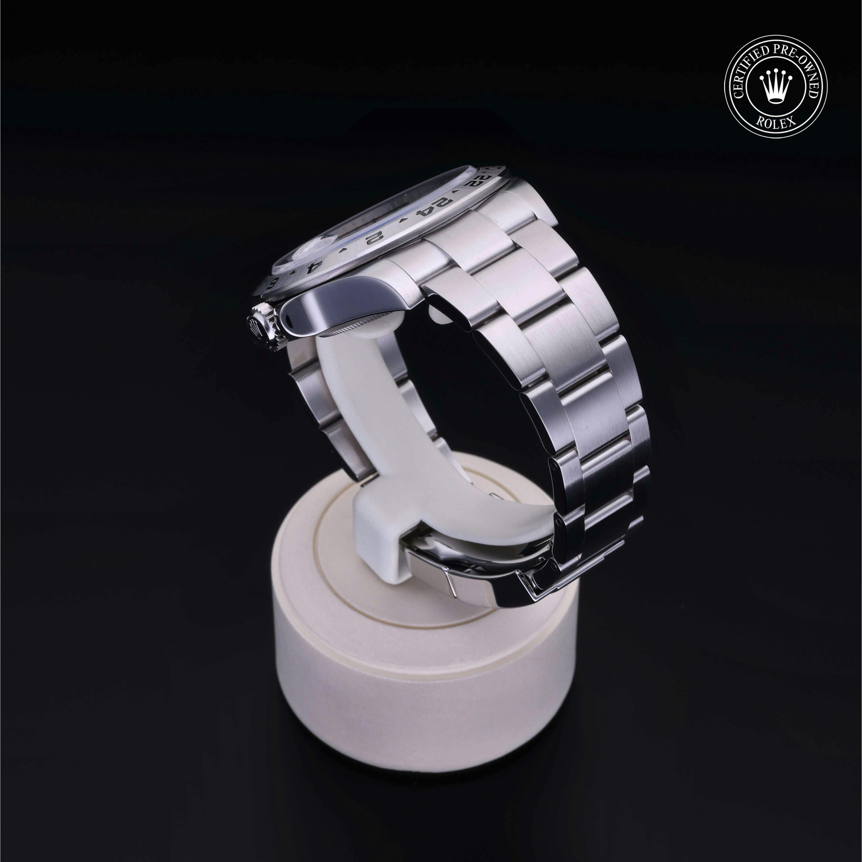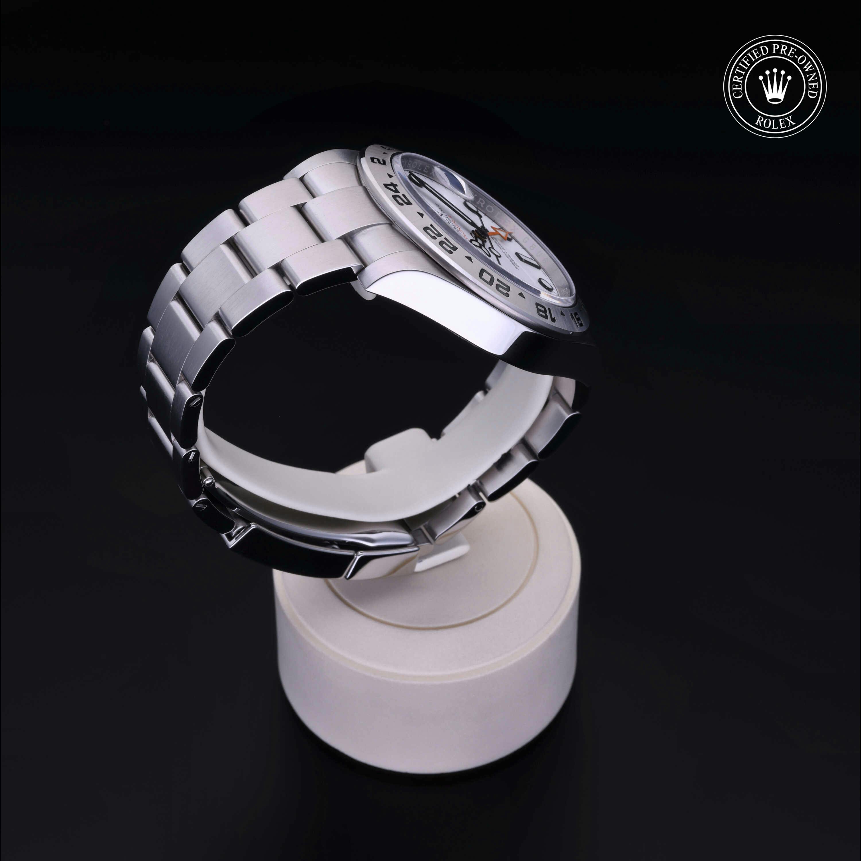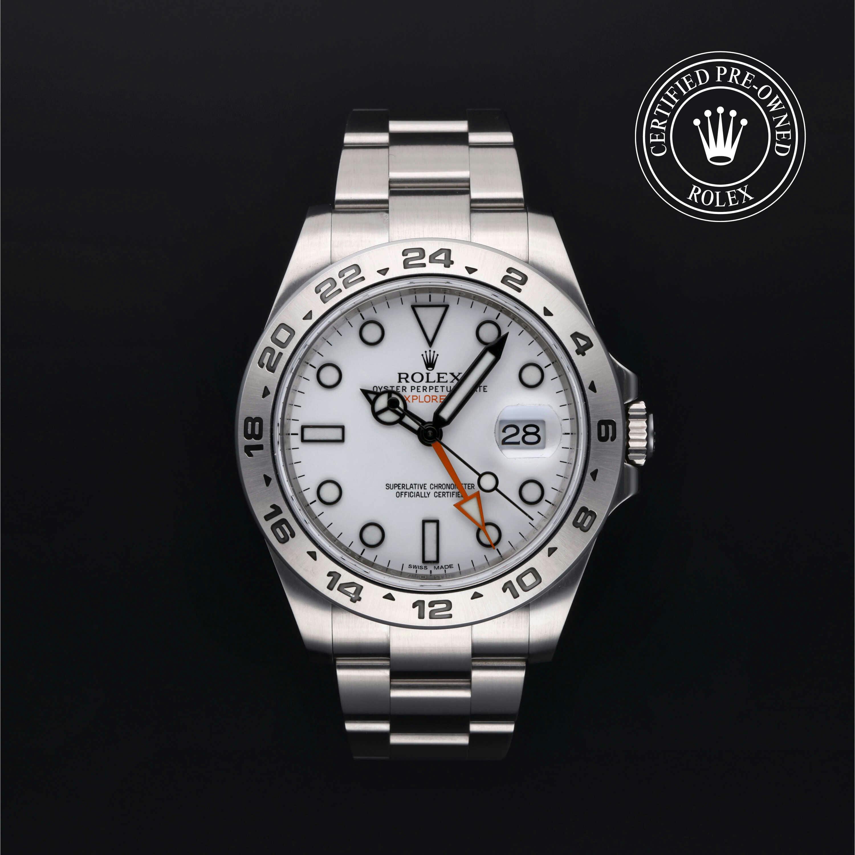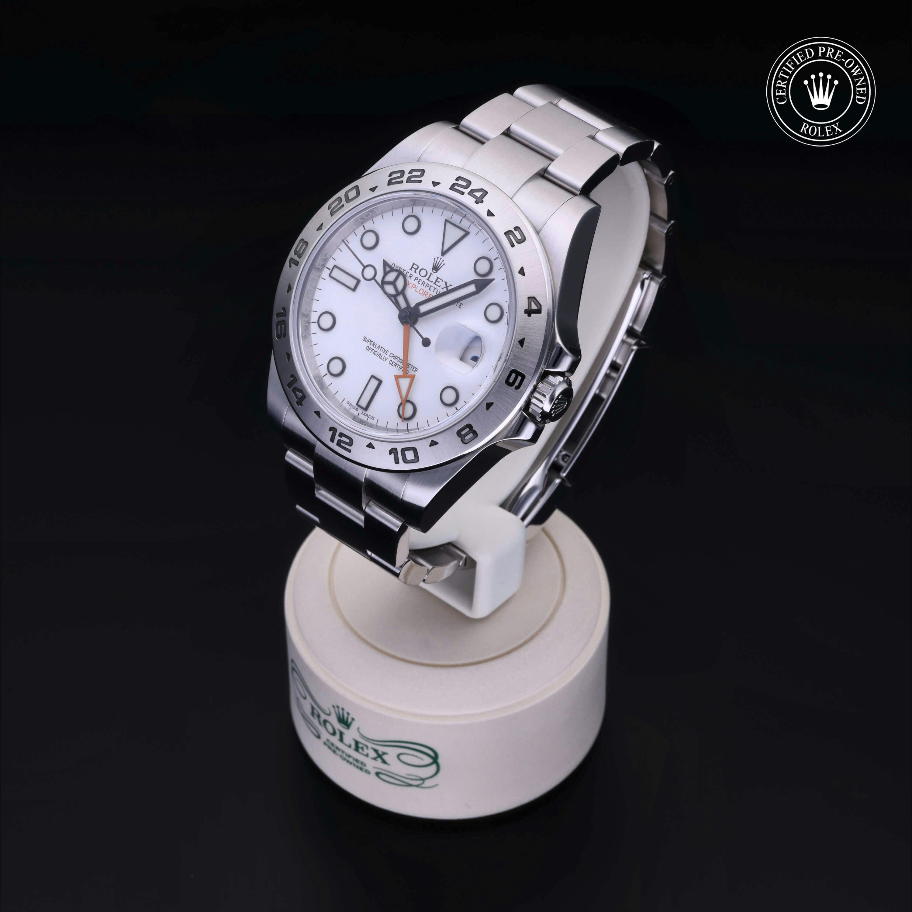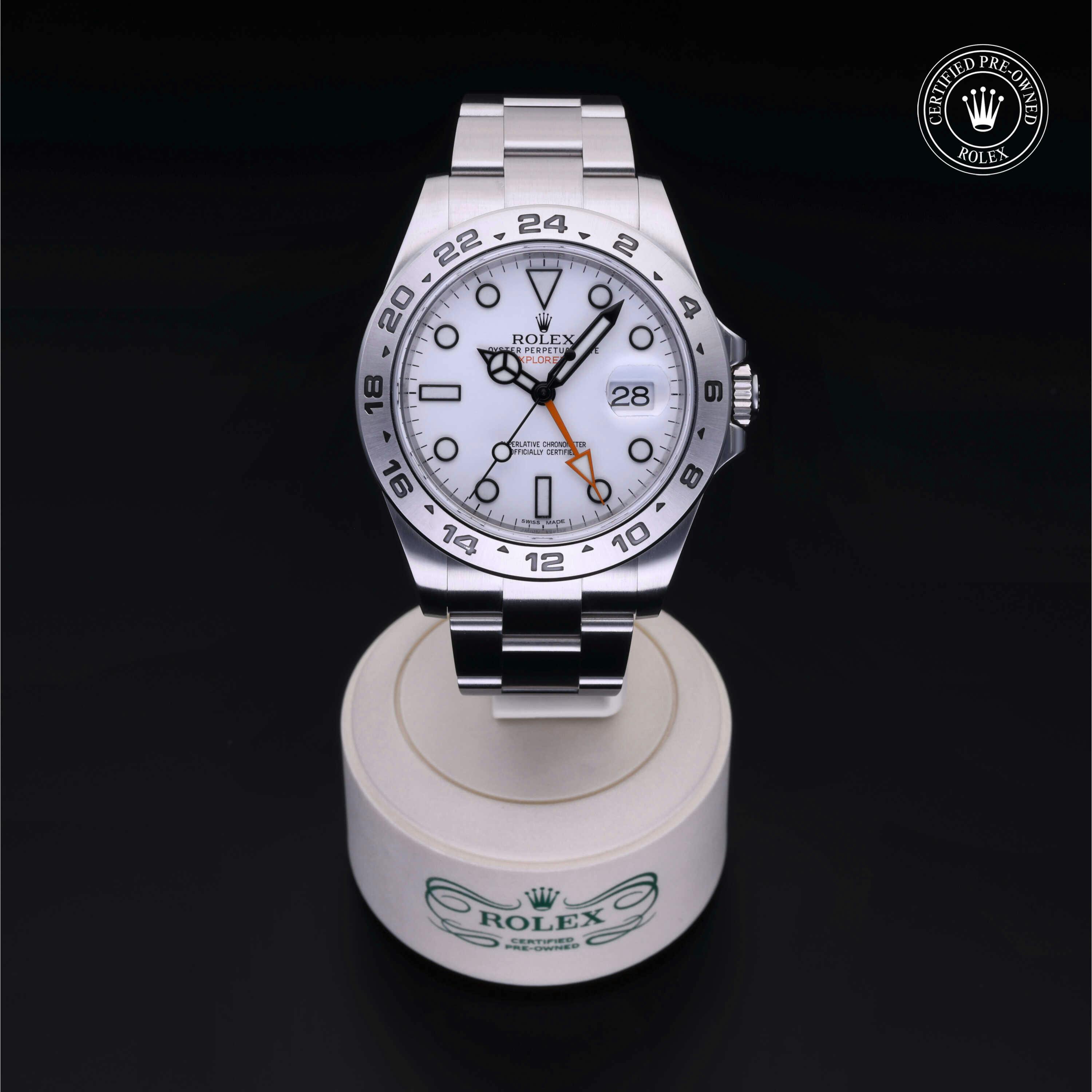 Rolex Certified Pre-Owned Explorer II (216570) self - winding automatic watch, features a 42mm stainless steel case and fixed bezel surrounding a white dial on a stainless steel oyster bracelet. Functions include hours, minutes, seconds, date and gmt/world time. This watch has received Rolex-authorized service and certification. It does not come with the original box or papers, but includes a custom Rolex Certified Pre-Owned hang tag, travel pouch and RCPO international warranty card.