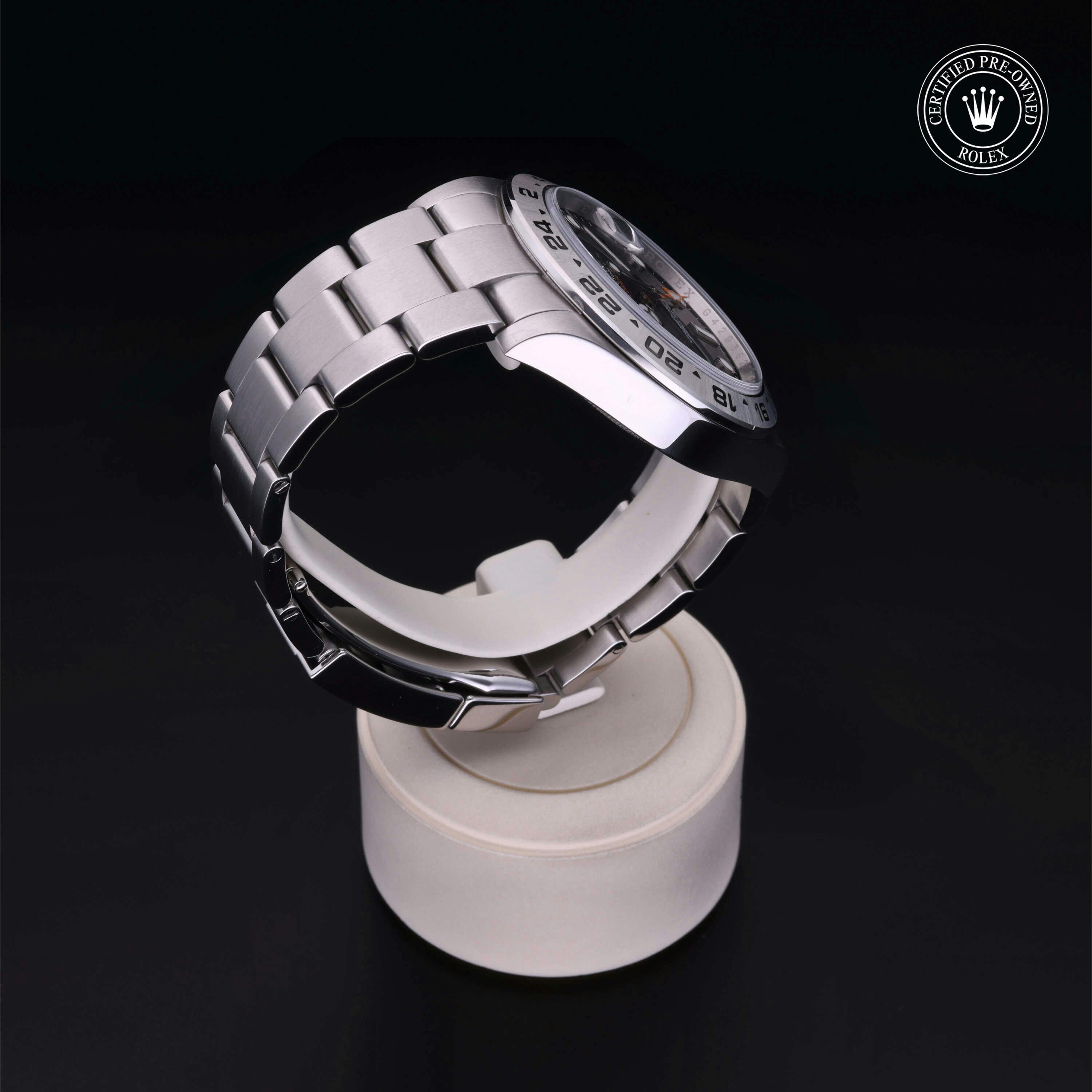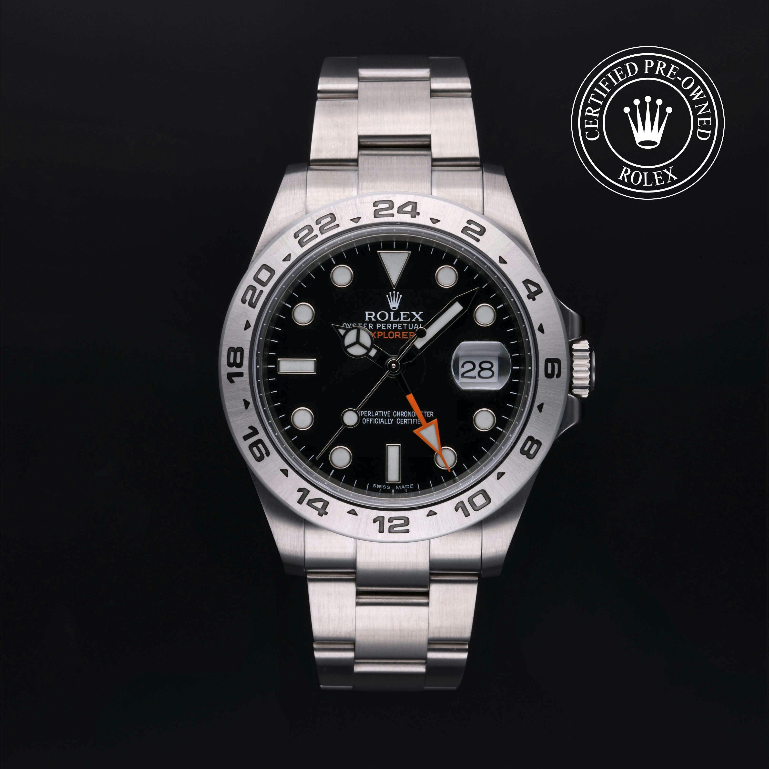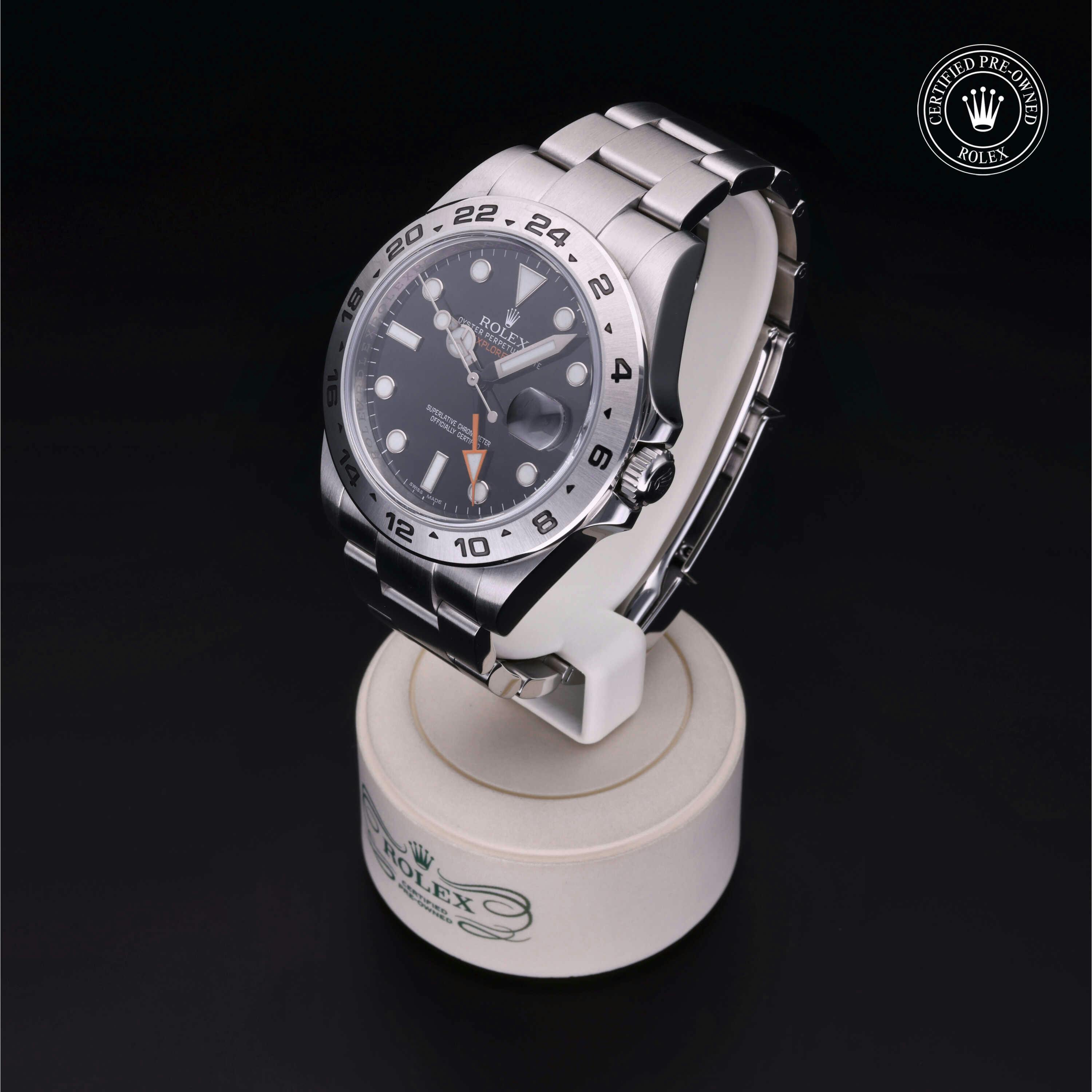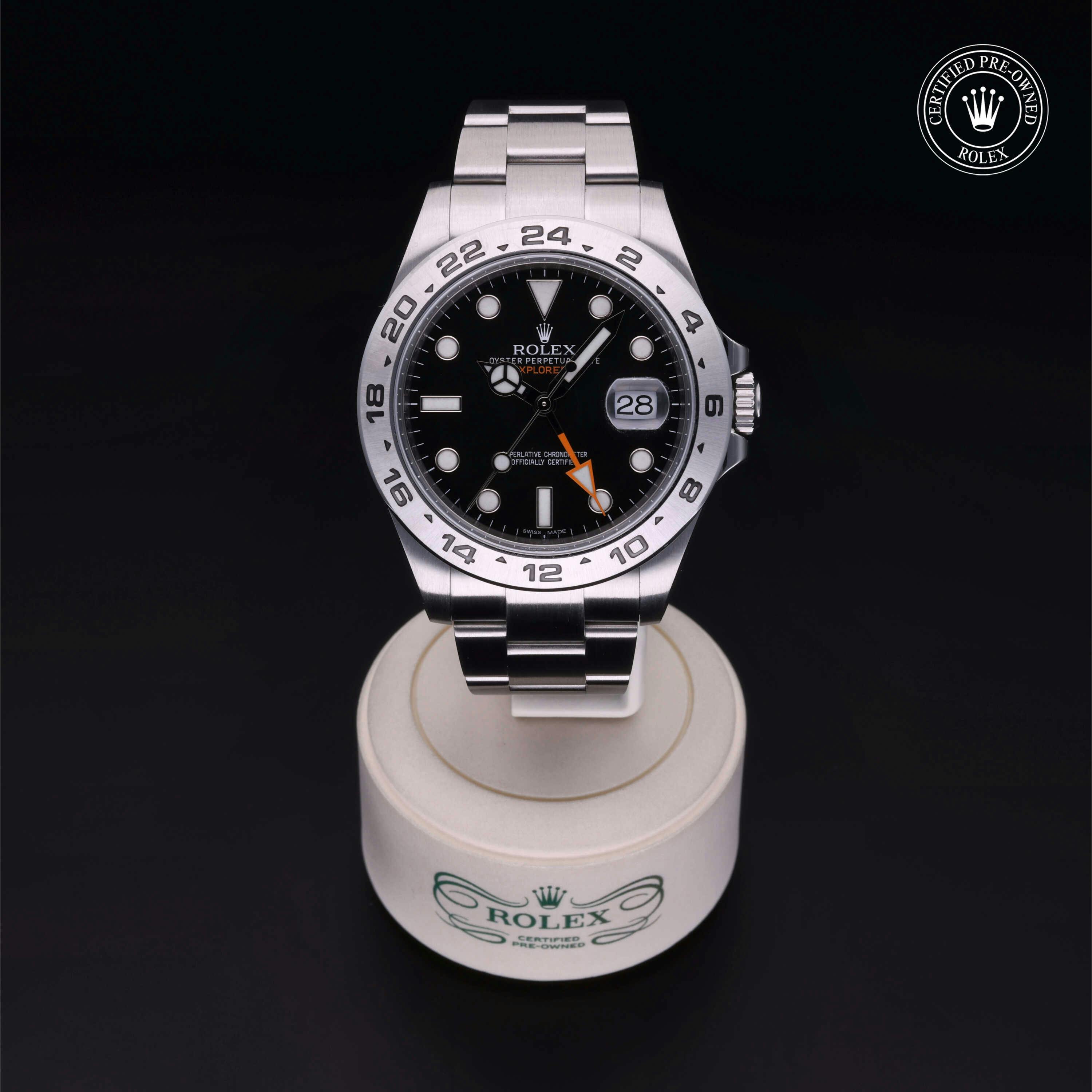Rolex Certified Pre-Owned Explorer II (216570) self - winding automatic watch, features a 42mm stainless steel case surrounding a black dial on a stainless steel oyster bracelet. Functions include hours, minutes, seconds, date and gmt/world time. This watch has received Rolex-authorized service and certification. It does not come with the original box or papers, but includes a custom Rolex Certified Pre-Owned hang tag, travel pouch and RCPO international warranty card.