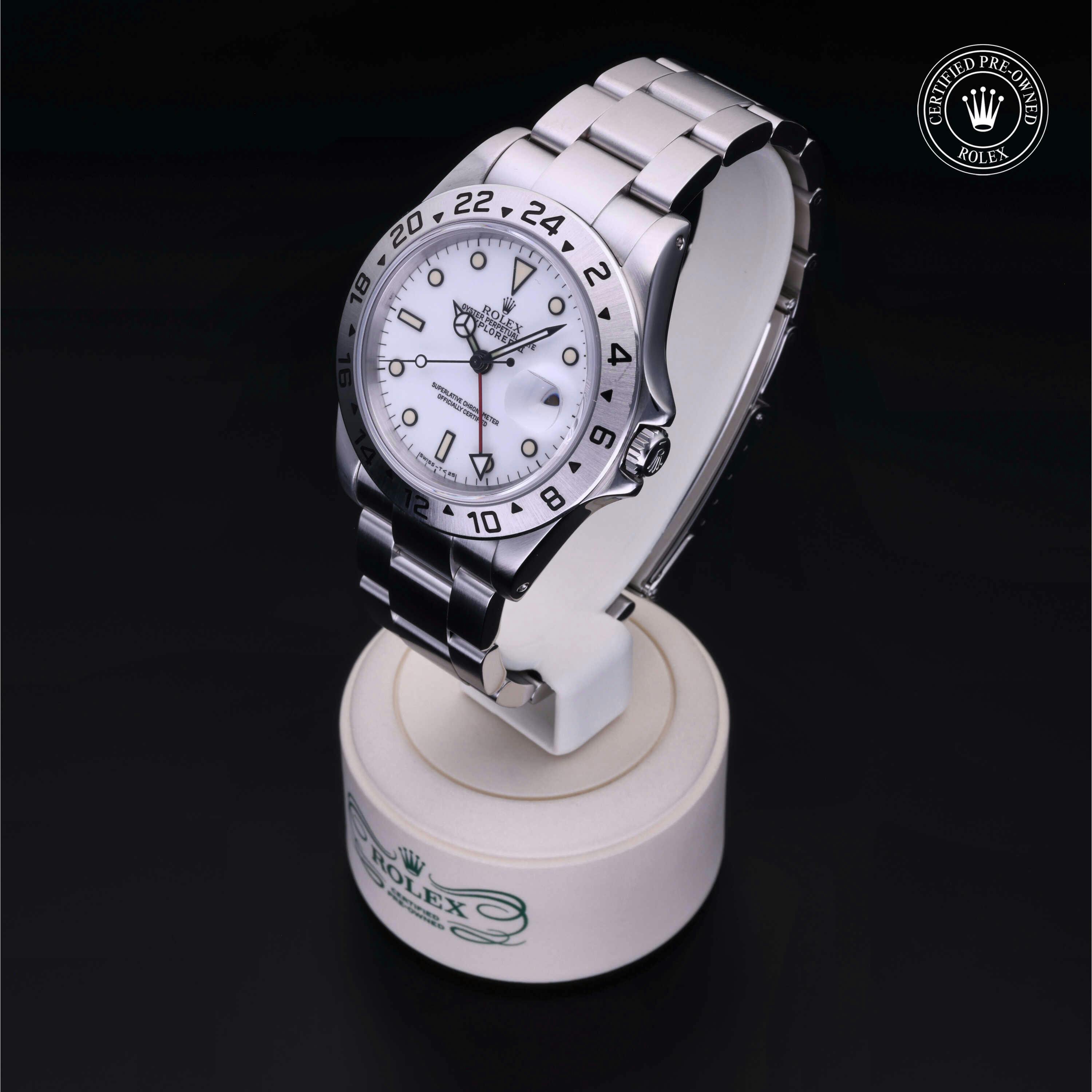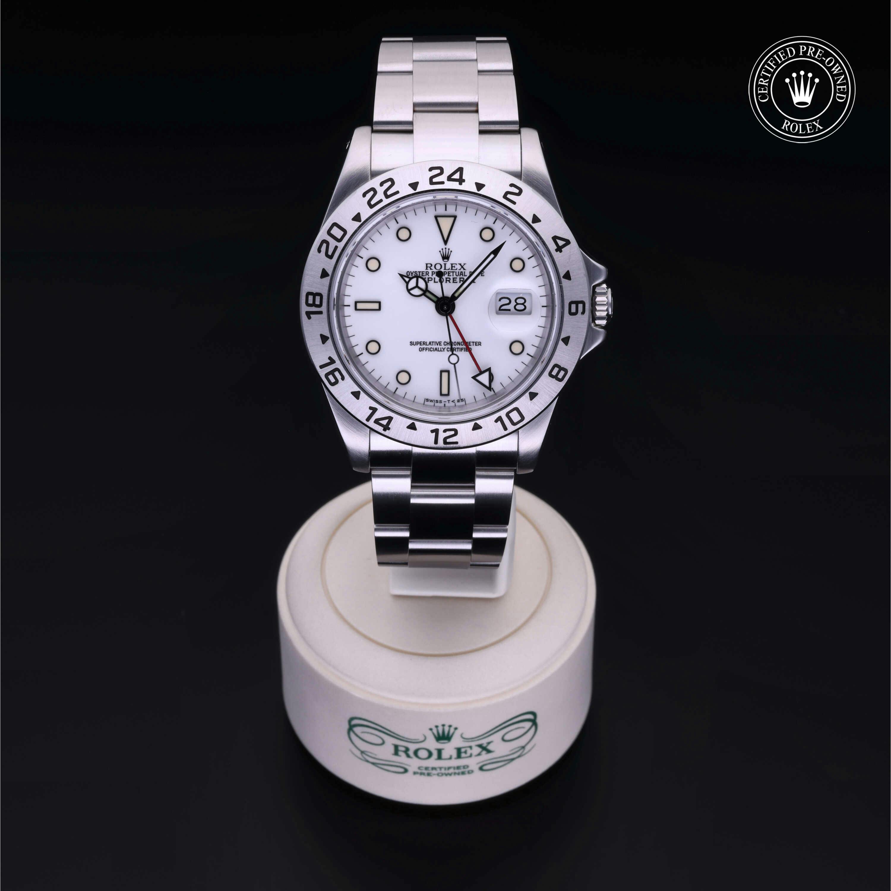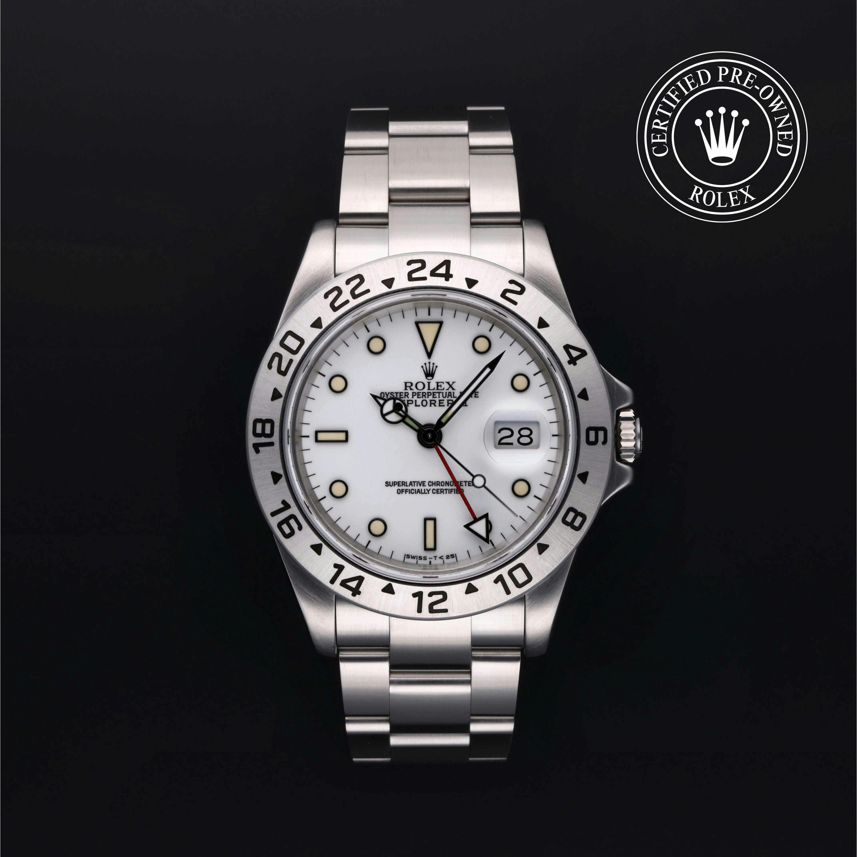 Rolex Certified Pre-Owned Explorer II (16570) self - winding automatic watch, features a 40mm stainless steel case surrounding a white dial on a stainless steel oyster bracelet. Functions include hours, minutes, seconds, date and gmt/world time. This watch has received Rolex-authorized service and certification. It does not come with the original box or papers, but includes a custom Rolex Certified Pre-Owned hang tag, travel pouch and RCPO international warranty card.