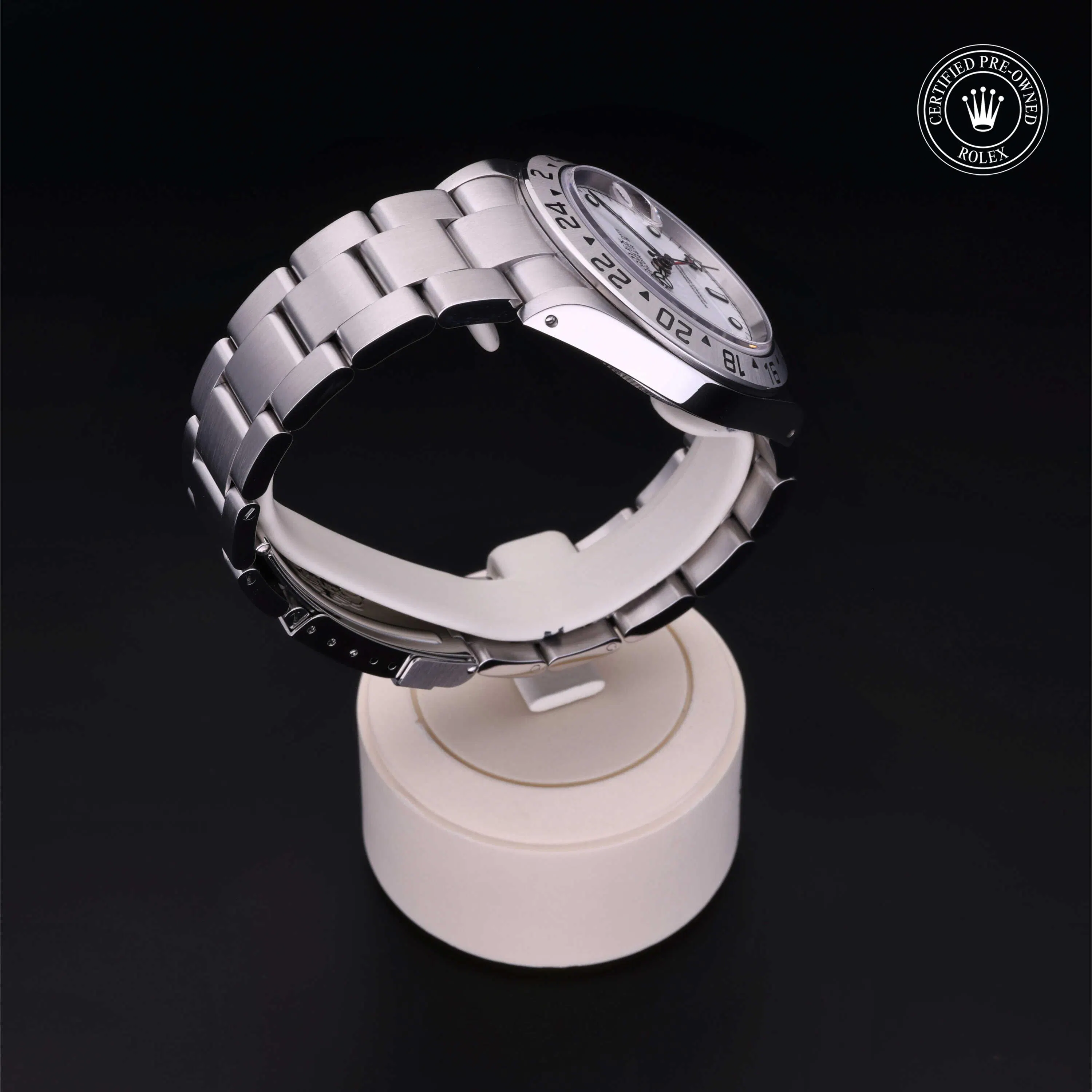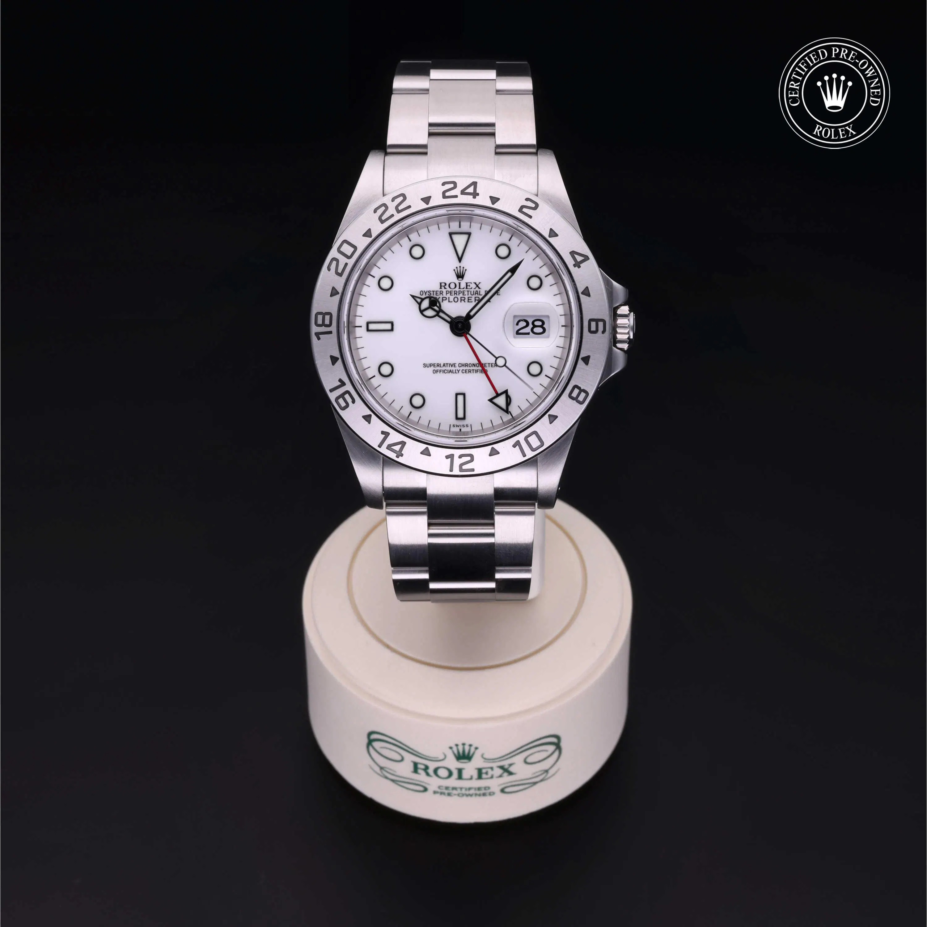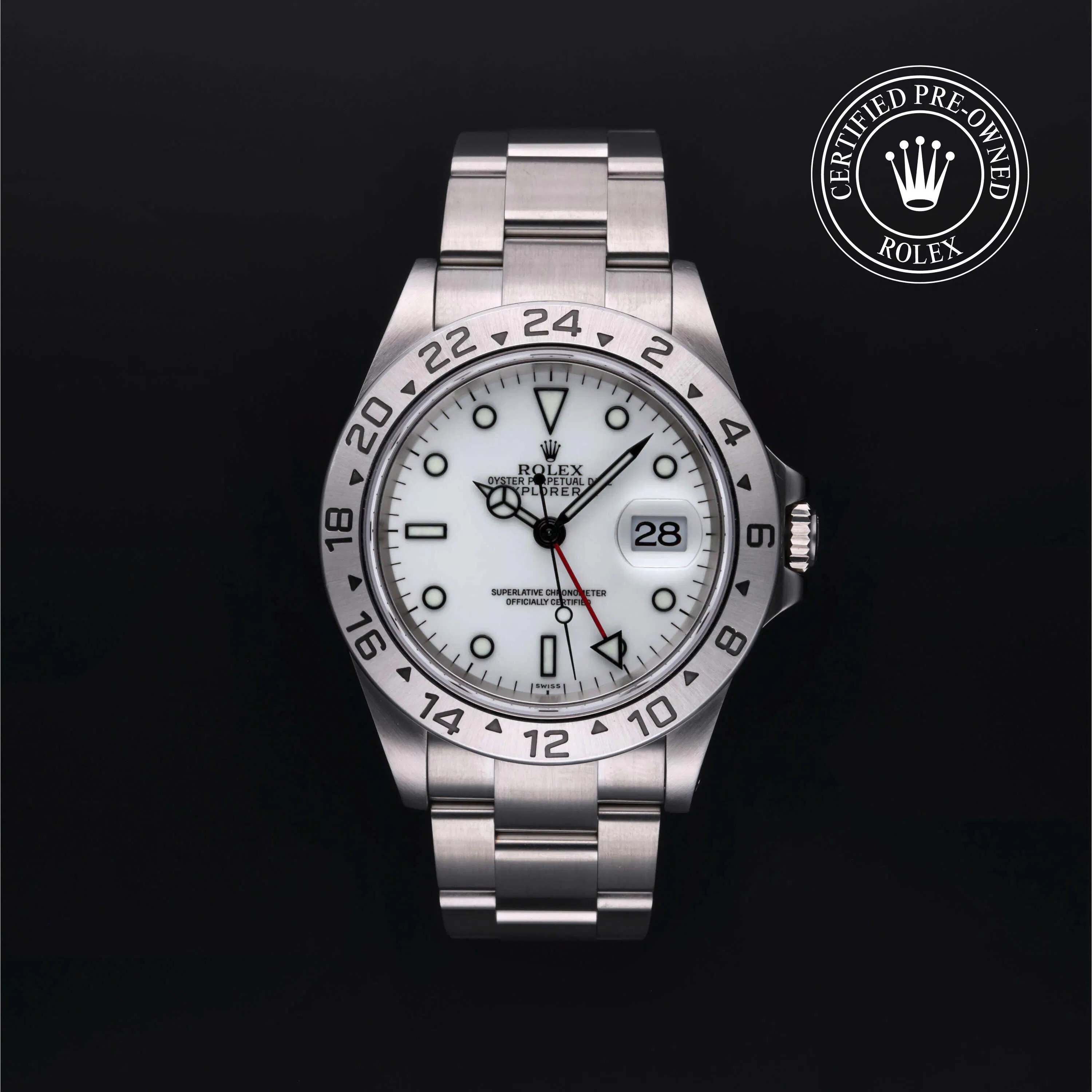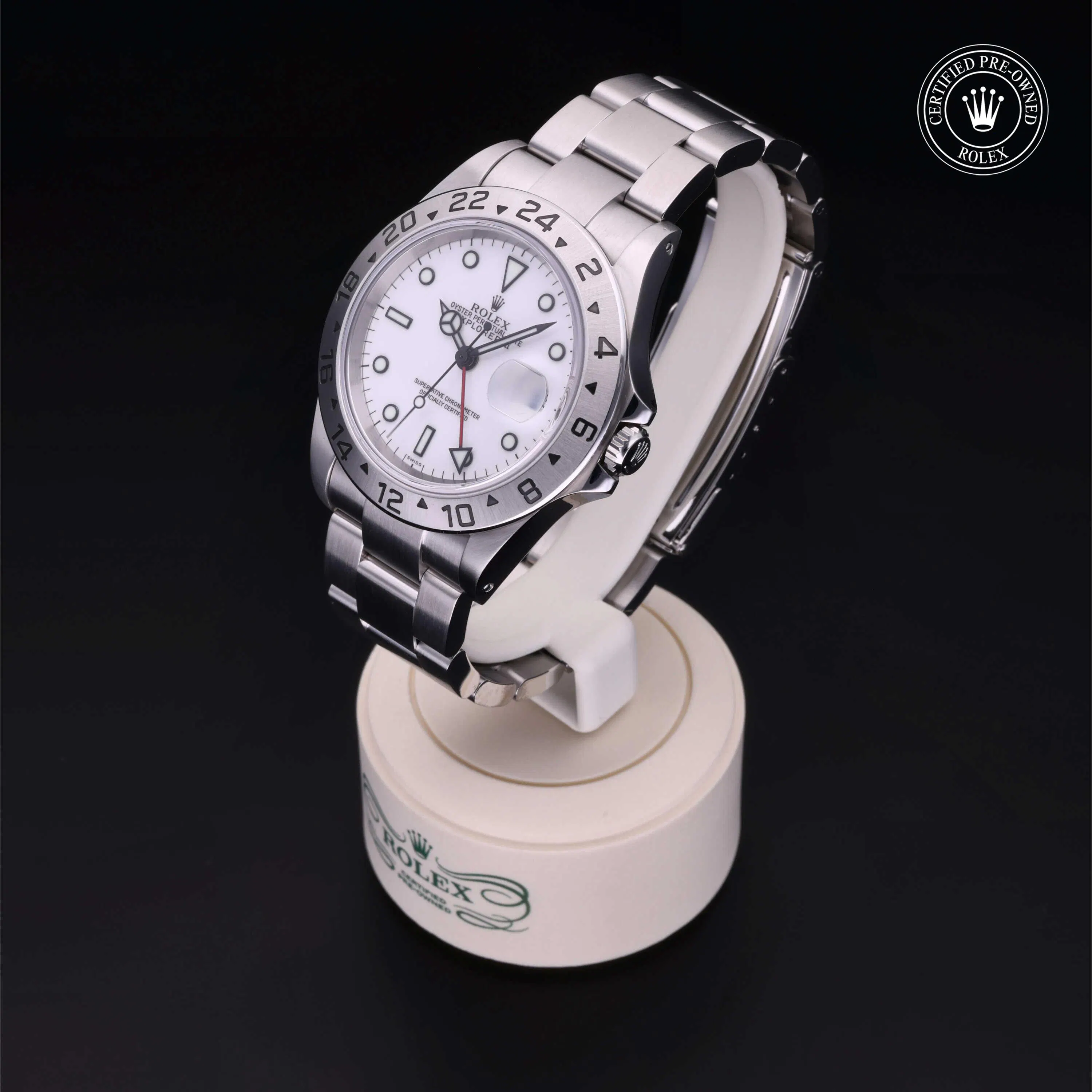 Rolex Certified Pre-Owned Explorer II (16570) self - winding automatic watch, features a 40mm stainless steel case with a fixed 24-hour bezel surrounding a white dial. The watch is secured on a stainless steel oyster bracelet complete with a folding buckle. Functions include hours, minutes, seconds, date and gmt/world time. This watch has received Rolex-authorized service and certification. It does not come with the original box or papers, but includes a custom Rolex Certified Pre-Owned hang tag, travel pouch and RCPO international warranty card.