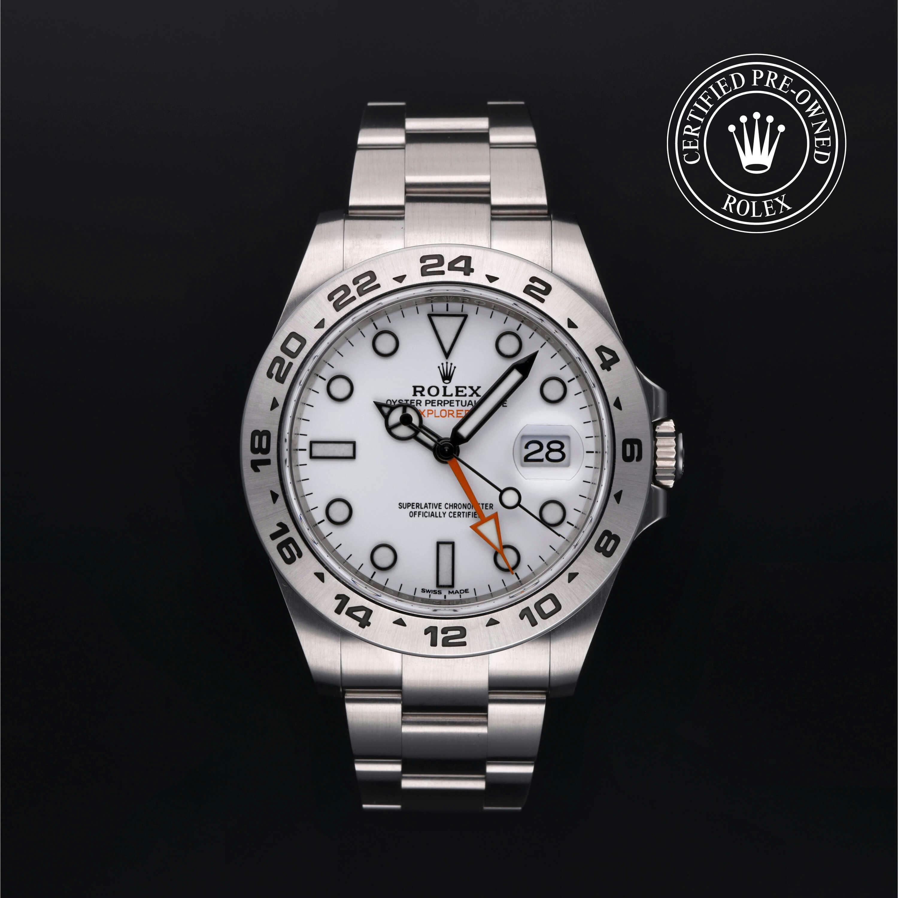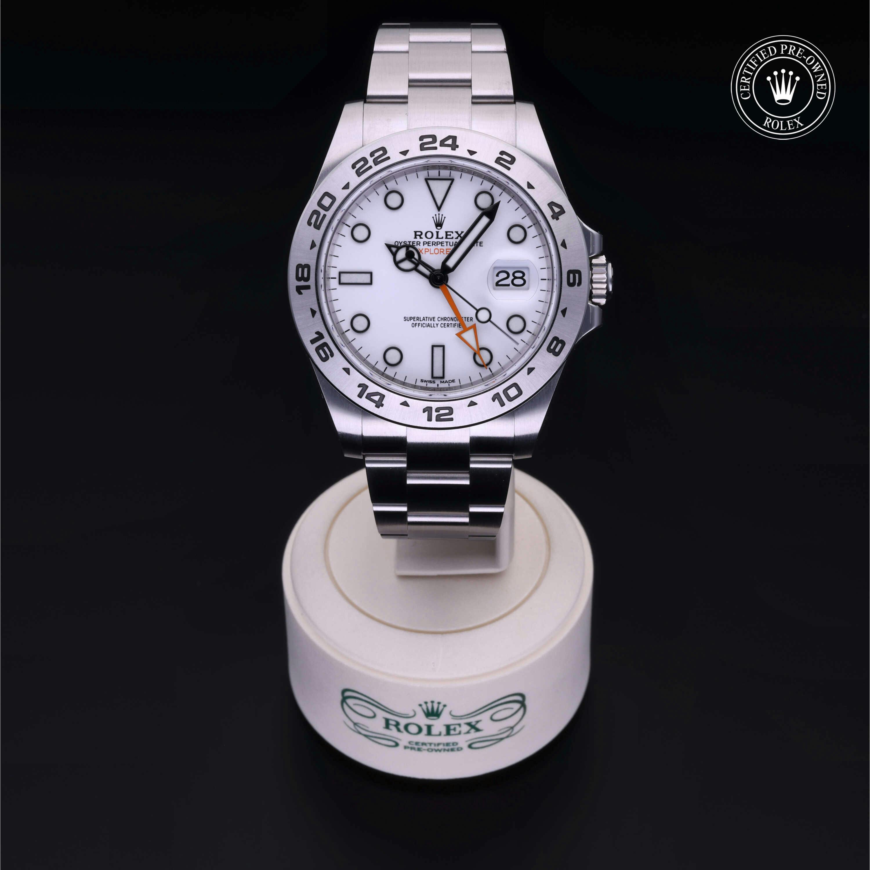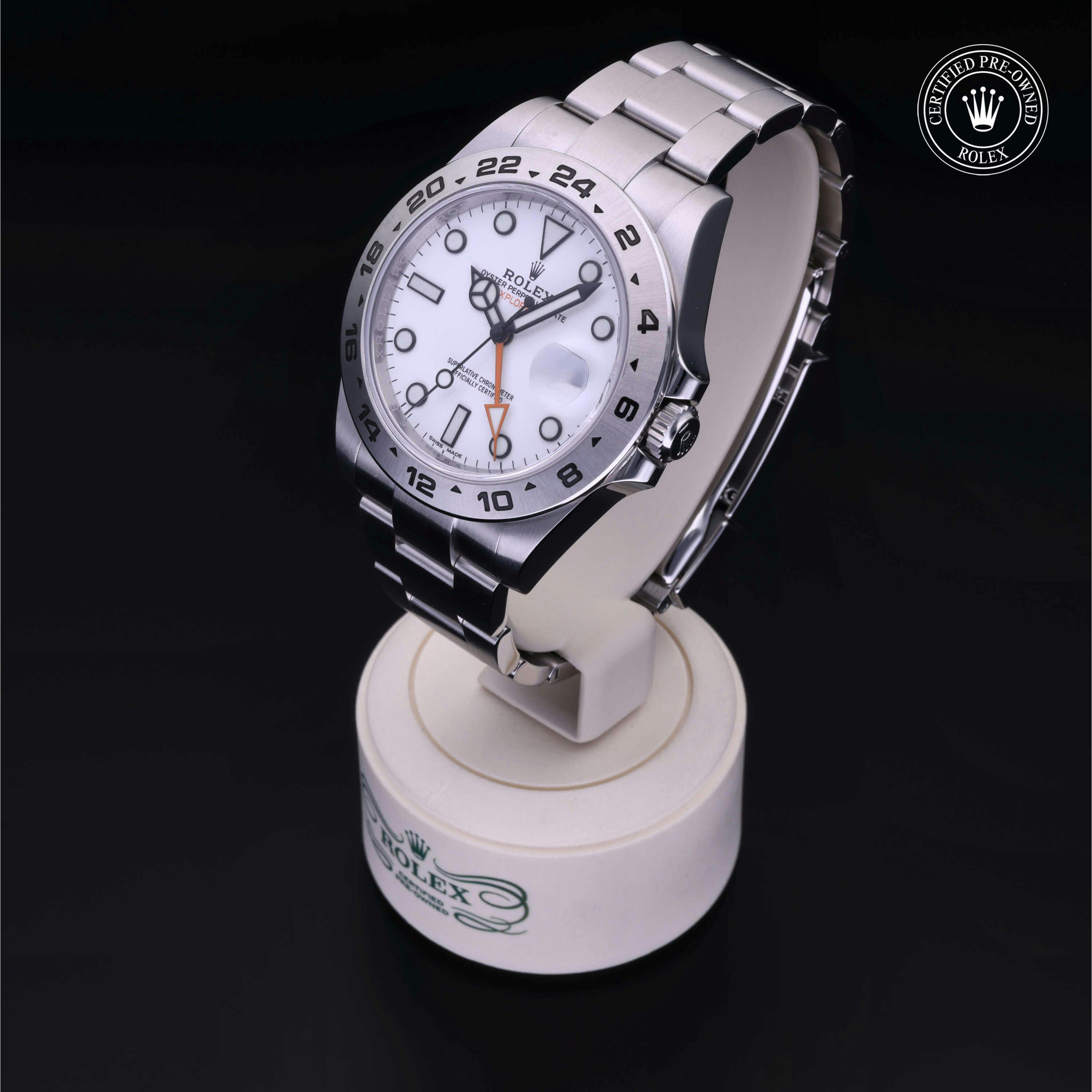 Rolex Certified Pre-Owned Explorer II (216570) self - winding automatic watch, features a 42mm stainless steel case and fixed bezel surrounding a white dial on a stainless steel oyster bracelet. Functions include hours, minutes, seconds, date and gmt/world time. This watch has received Rolex-authorized service and certification. It comes with the original box and papers, and includes a custom Rolex Certified Pre-Owned hang tag, travel pouch and RCPO international warranty card.